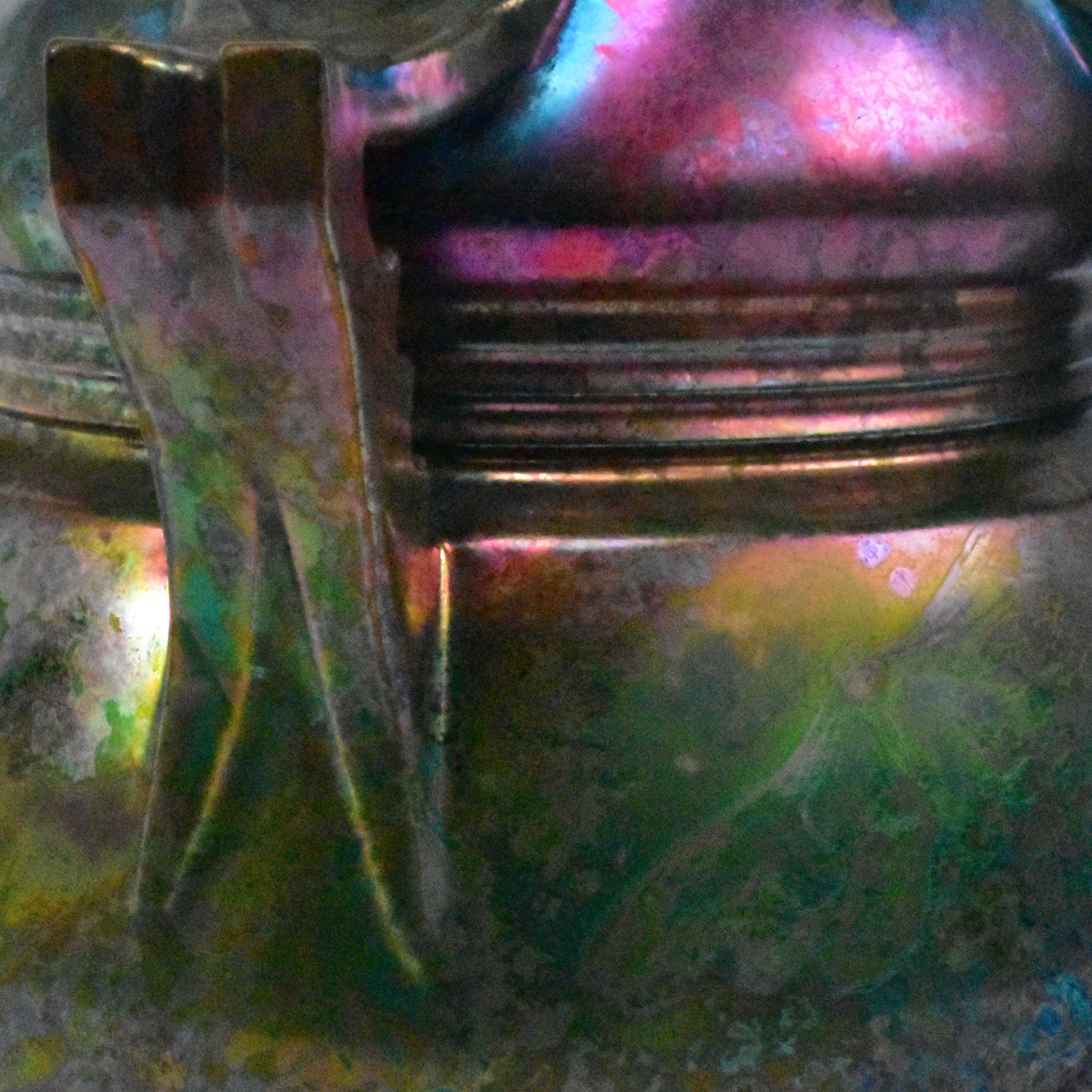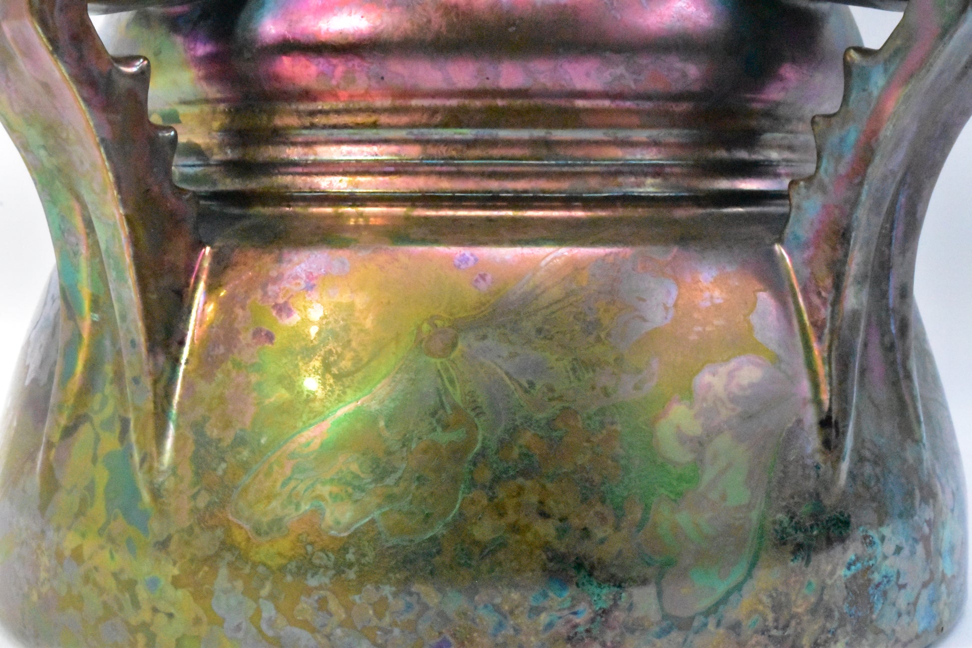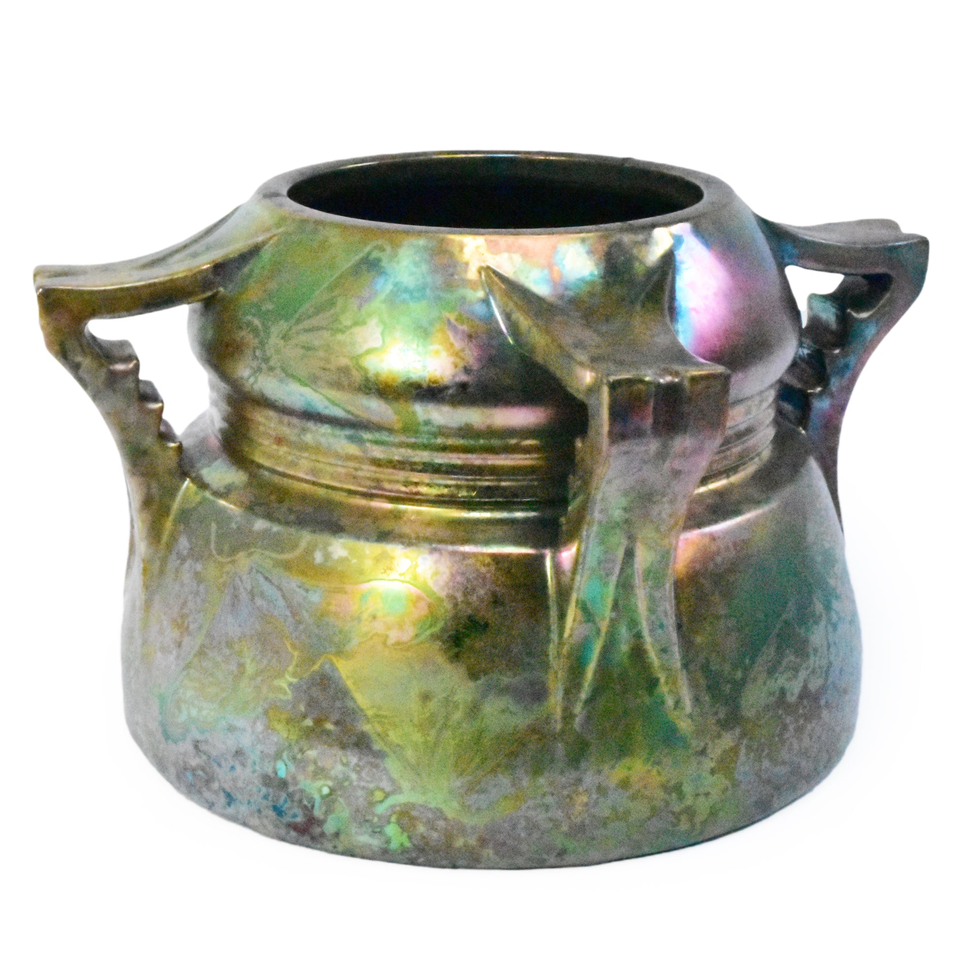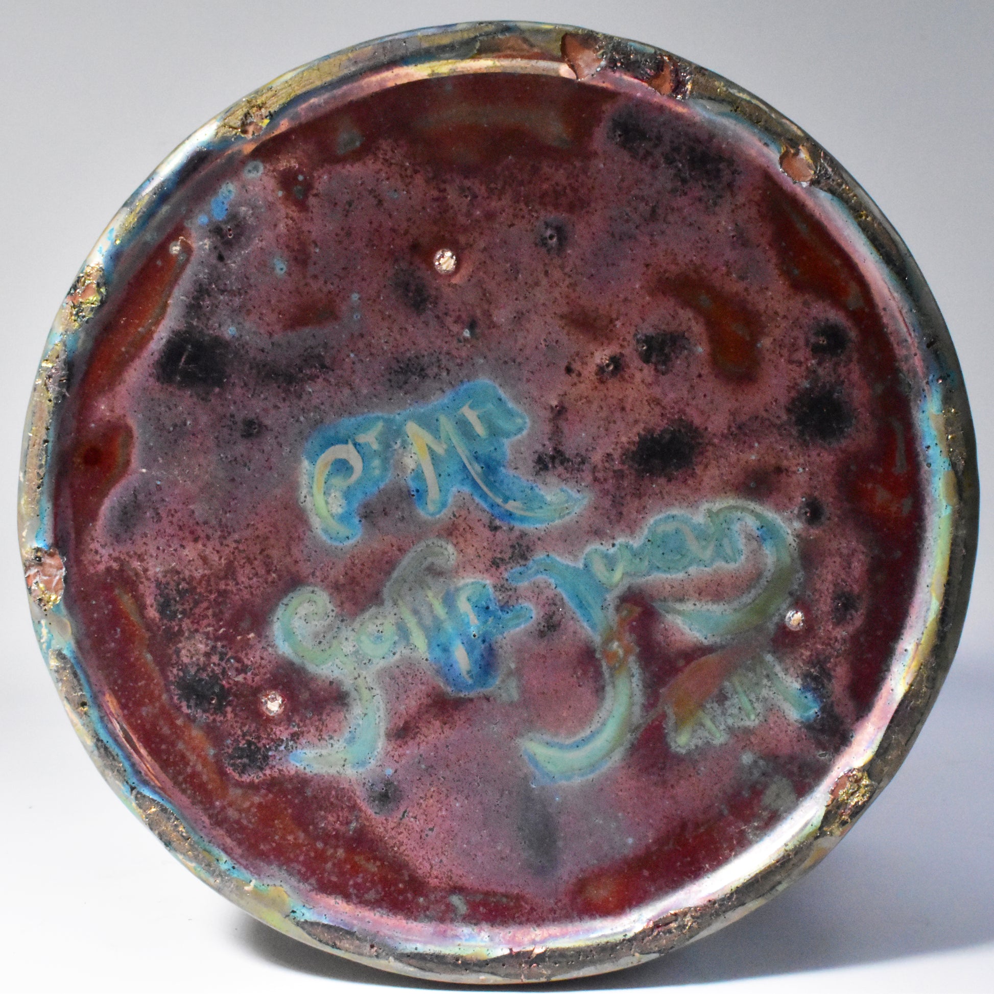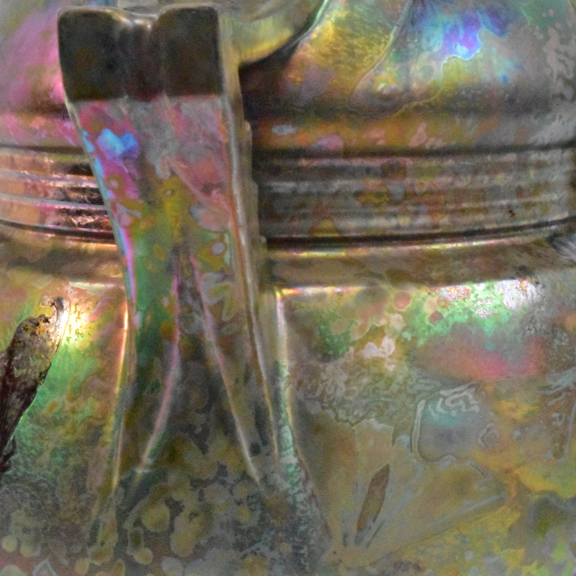 Exceptionele vorm pot van Clement Massier uit 1900. Prachtig gedecoreerd met nachtvlinders. Mysterieus en veelkleurig. De bijzondere reflets metallique glazuren vragen om inspectie van dichtbij. Dan ontdek je de fantastische kleuren en de talloze vliegende nachtvlinders die opdoemen uit de achtergrond. Alle kleuren van de regenboog fladderen mysterieus rond dit kunstwerk. De oplettende beschouwer wordt ik dan ook evenzeer aangetrokken tot dit object als motten naar een brandende kaars in de nacht.