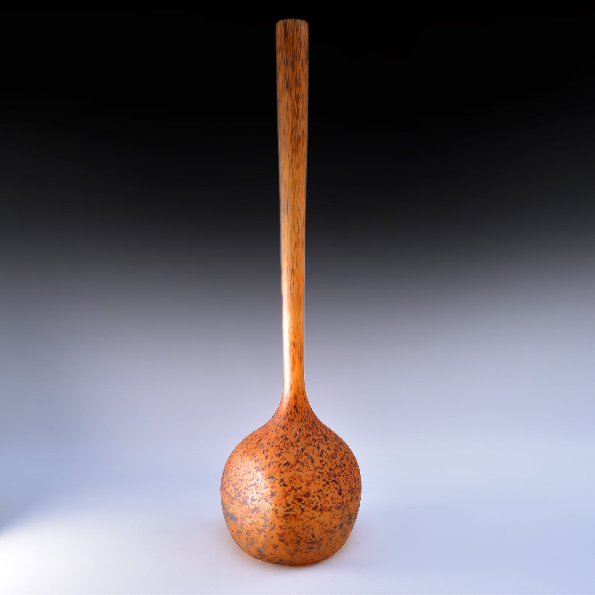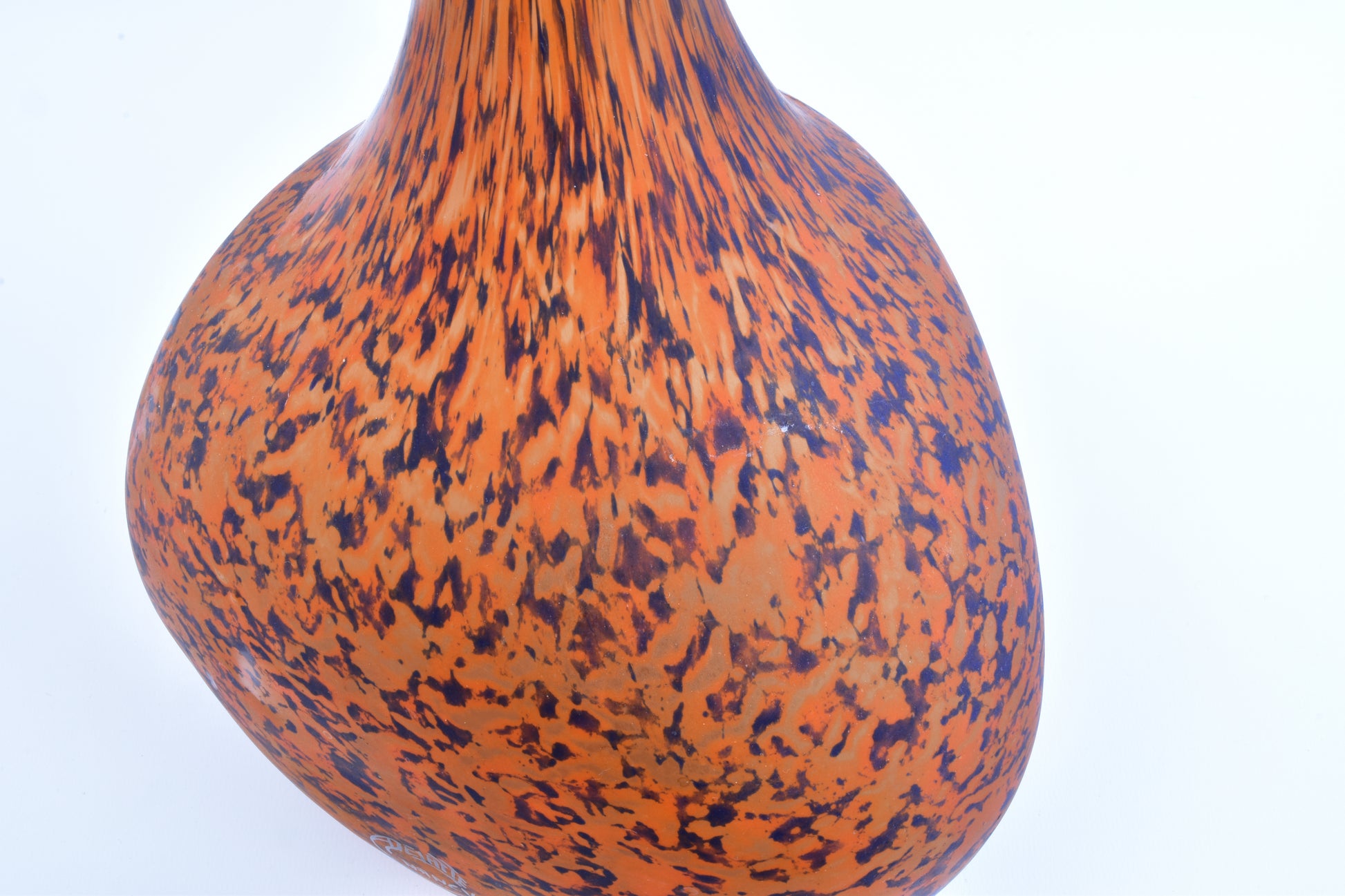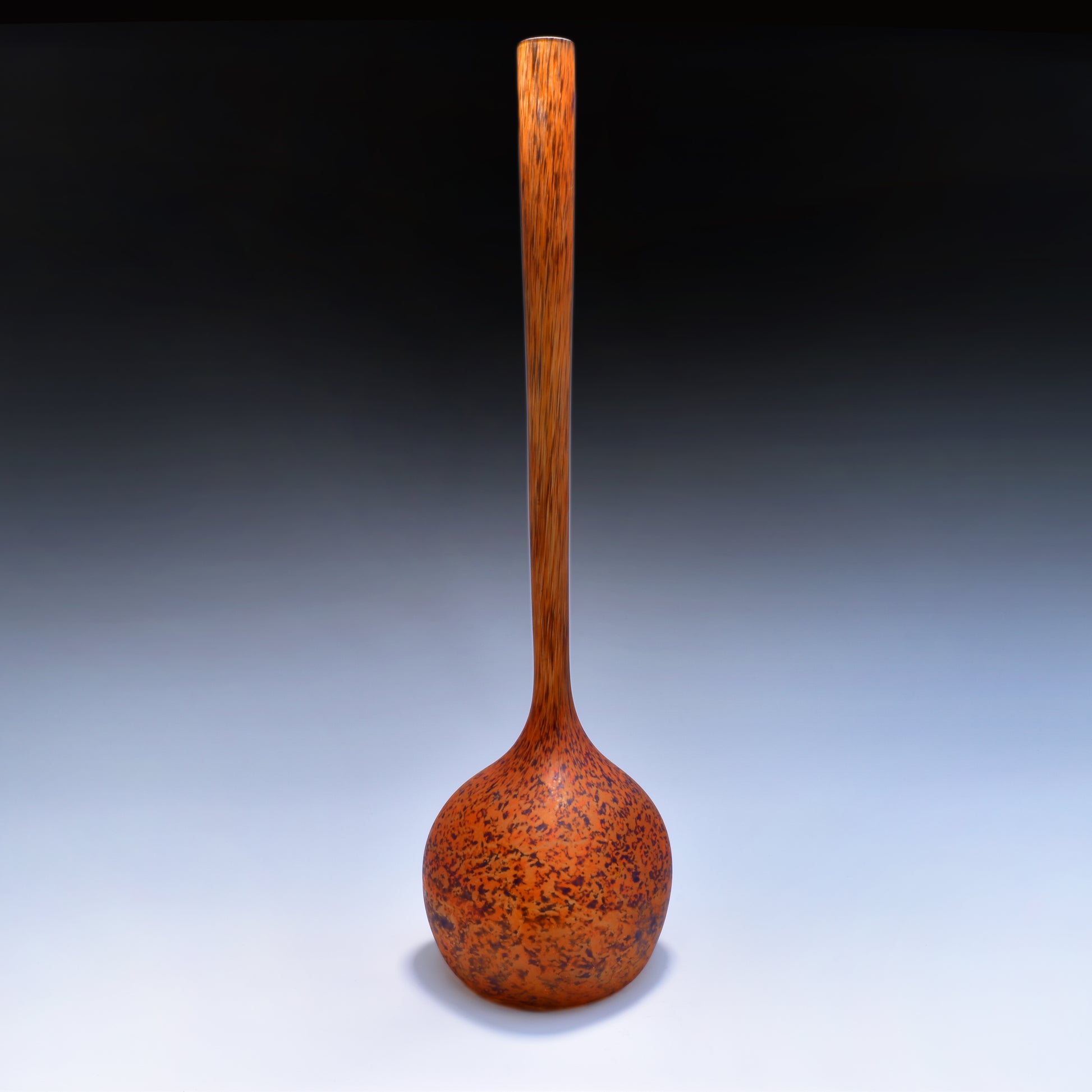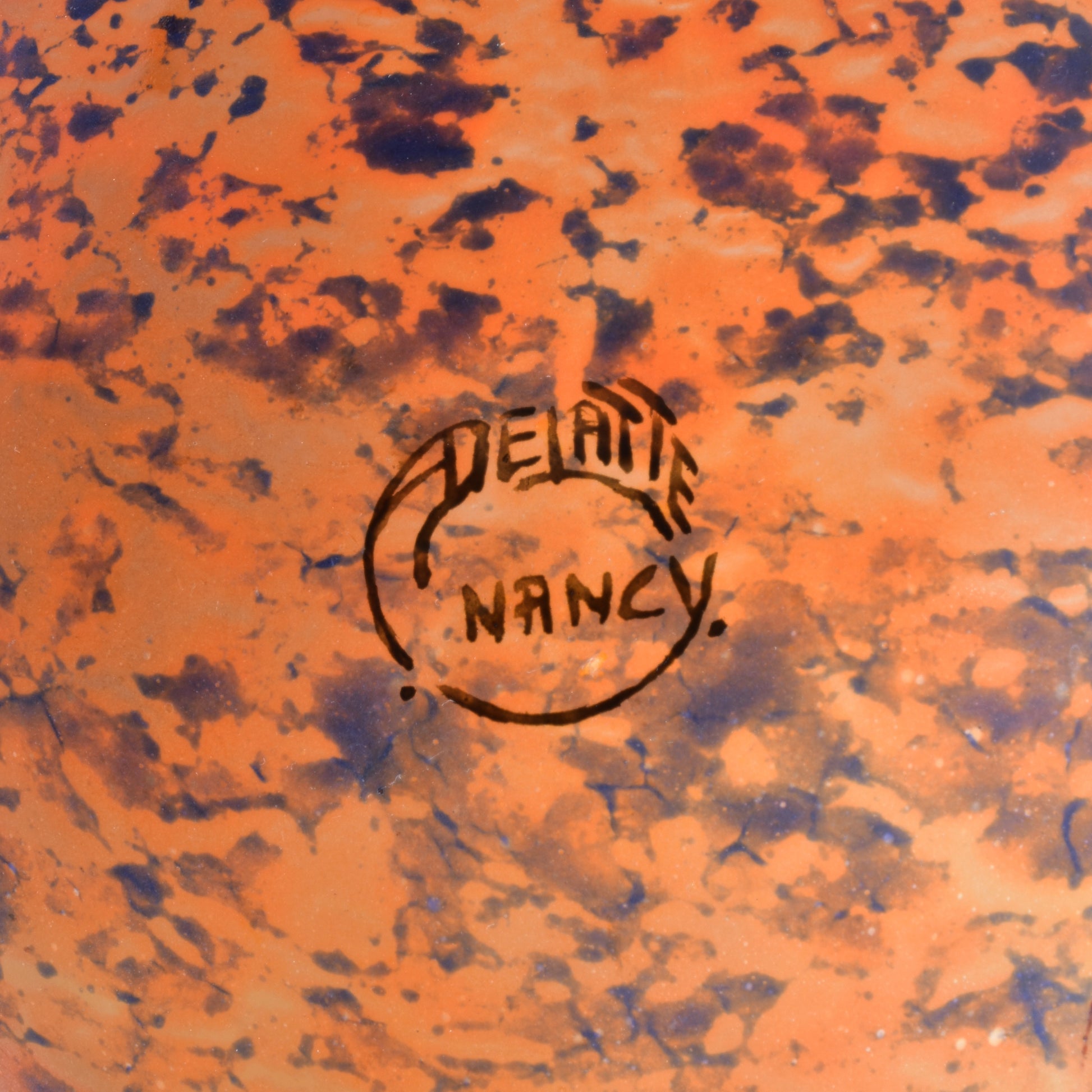 Grote vloervaas, solifleur van André delatte uit Nancy. Deze typische art nouveau vaas is vergelijkbaar met de berluzes van Daum uit Nancy. Het glas bevat meer diverse kleuren insluitsels en grotere contrasten. De glaspoeders werden bij Delatte tijdens het maakproces later opgebracht dan bij Daum. daardoor zijn de vlekken kleiner en veel minder met de vorm uitgeblazen. Deze vazen zijn nog steeds modern en zijn ook erg decoratief in een hedendaags interieur.