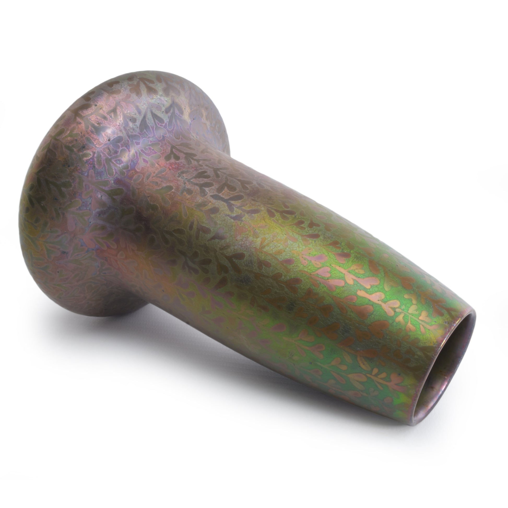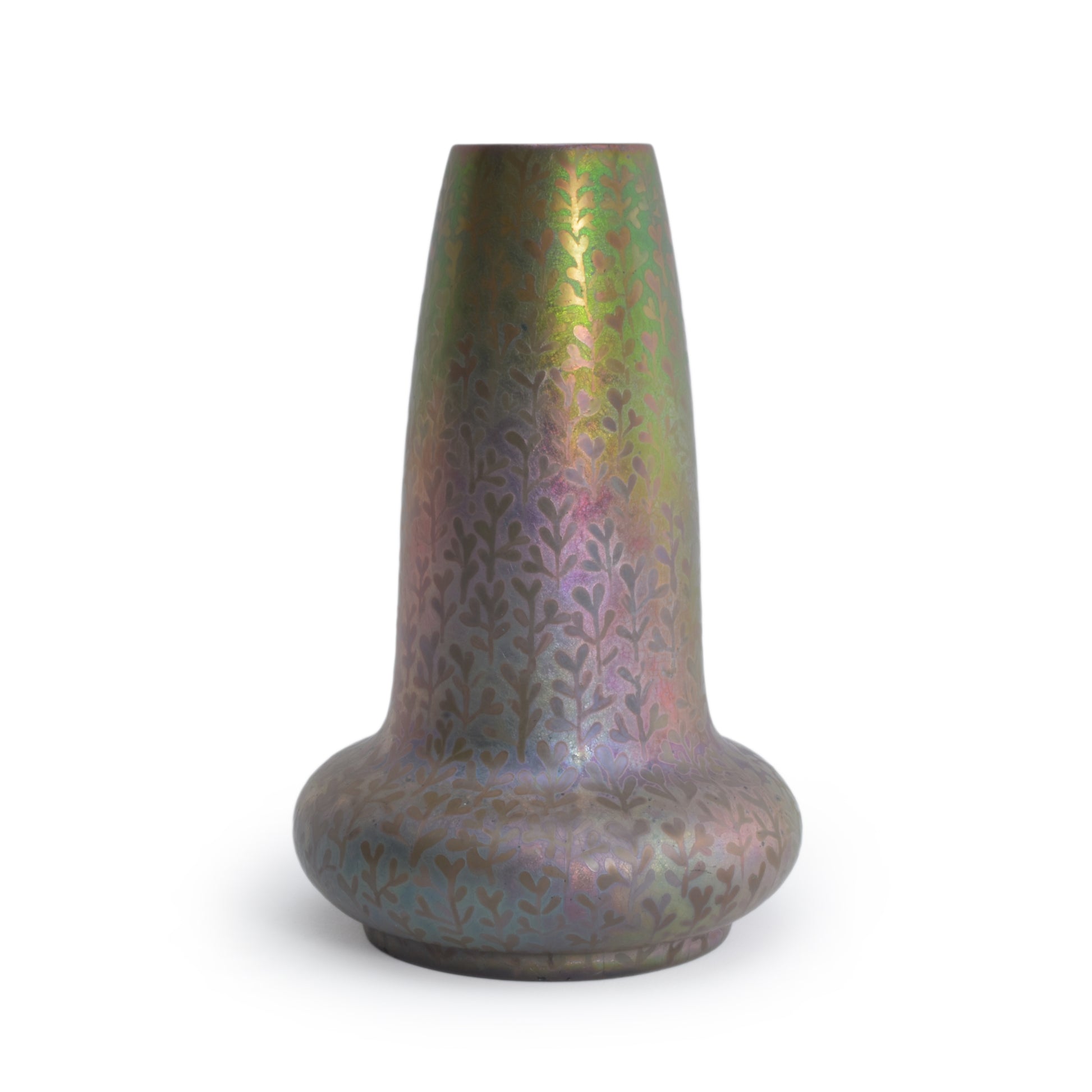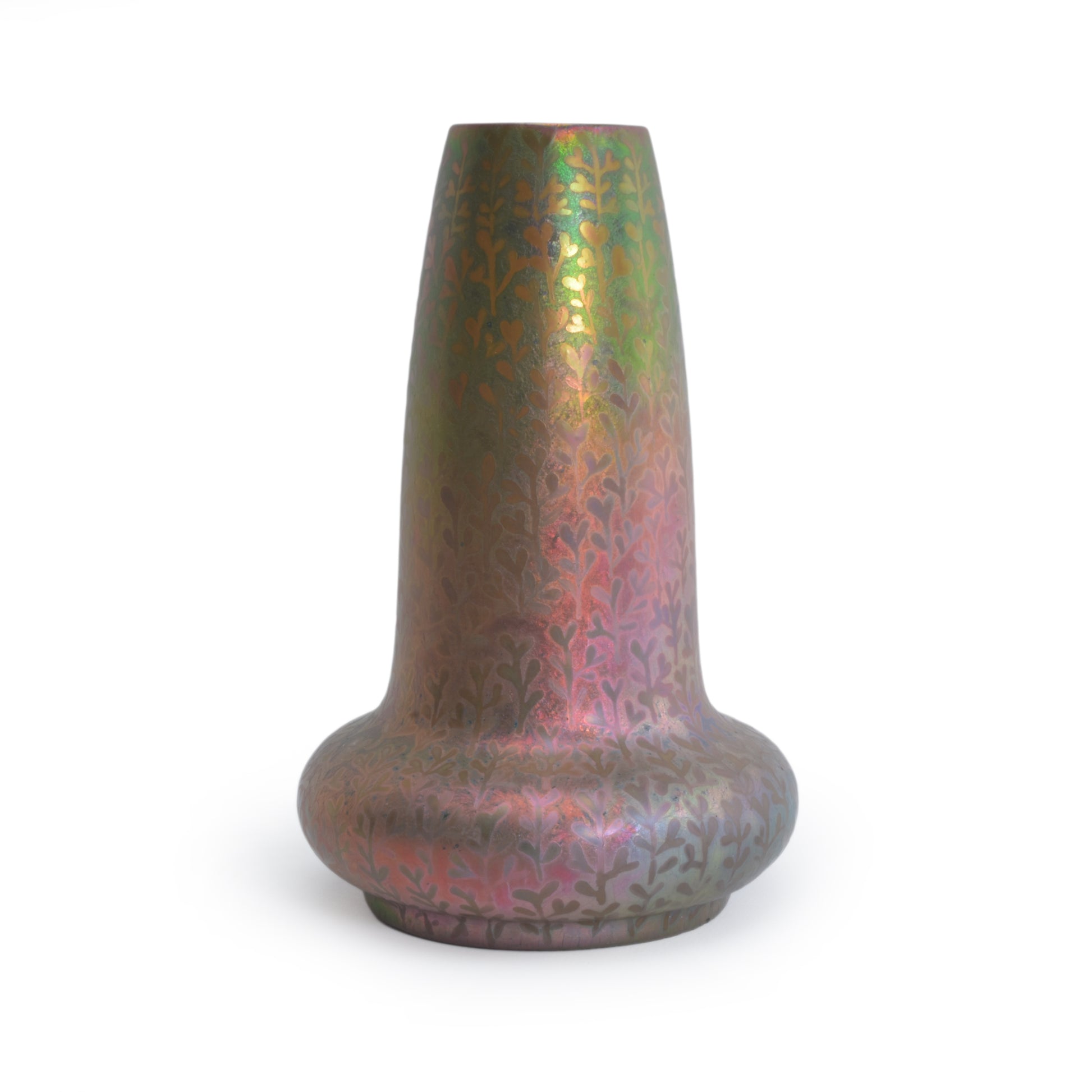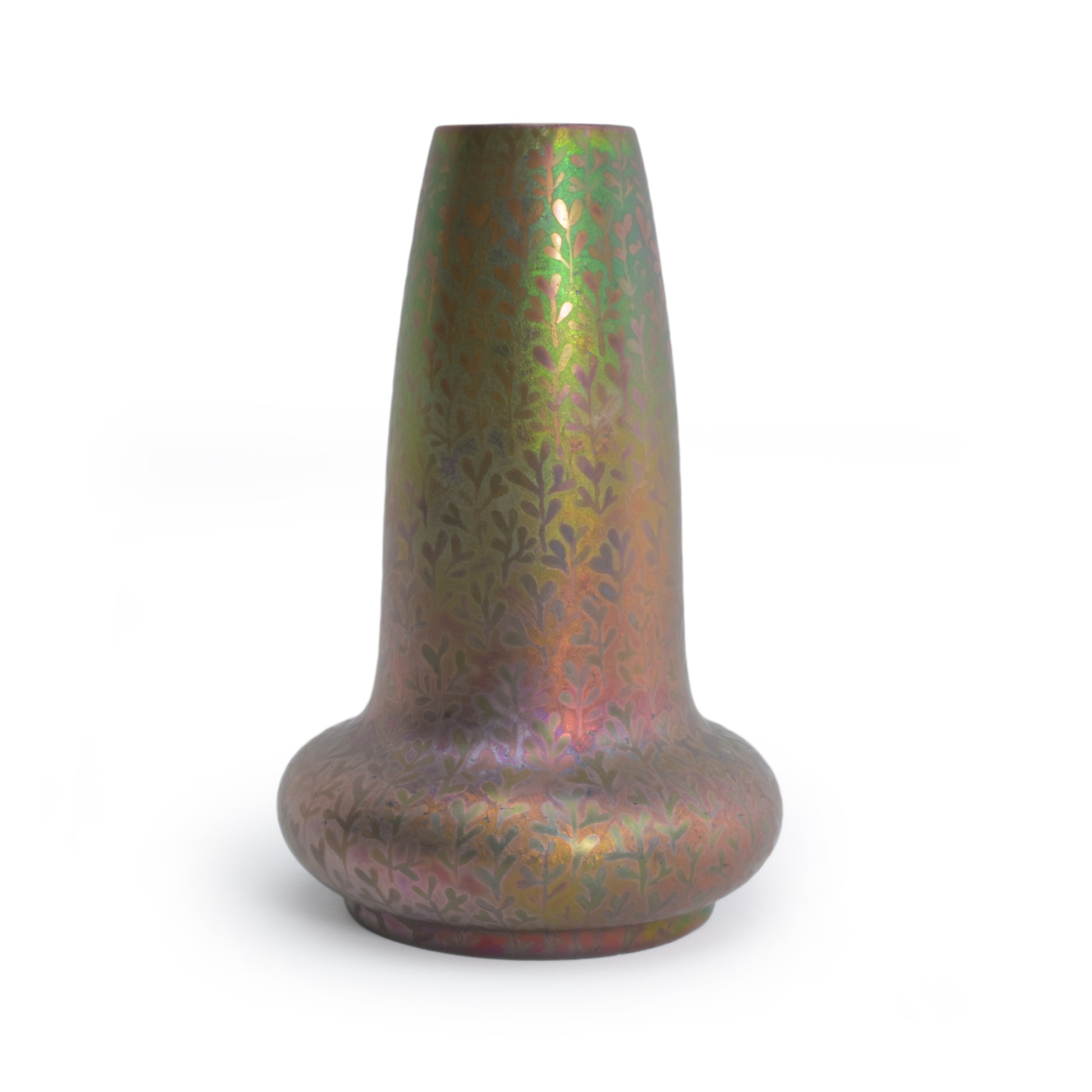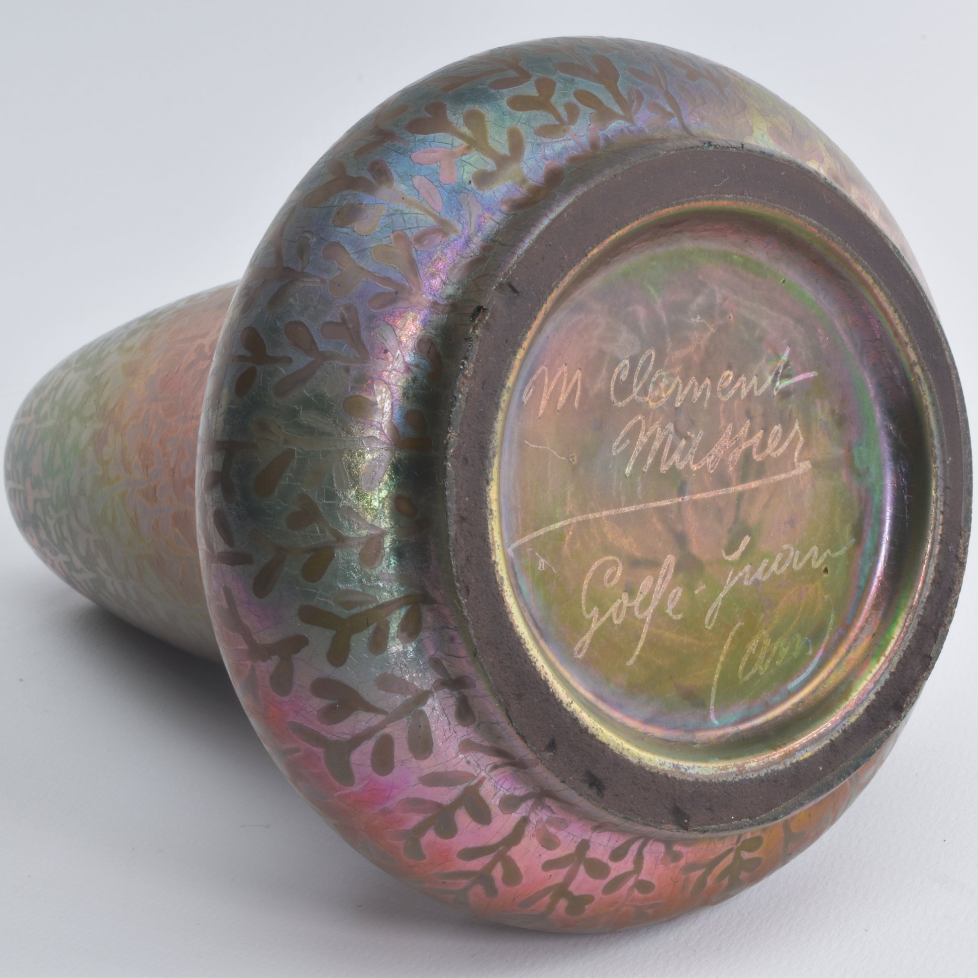 Deze lustre glazuur vaas van Clemens Massier is gedecoreerd met een doorlopend patroon van zaailingen. Het symboliseert de kreatieve kracht van de natuur die voor Clement Massier, en voor de Art Nouveau van grote betekenis was. De verdienste van Massier is dat hij, om uitdrukking te kunnen geven aan deze magische krachten van de natuur speciaal alles heeft ingezet om metaal-reflectie glazuren te ontwikkelen. Daar is hij tientallen jaren mee bezig geweest en dankzij het gebruik van metaaloxiden en reducerend stoken lukte het in het laatste decennium van de 19e eeuw, en werd zijn keramiek met deze reflecterende glazuur direct wereldberoemd. Musea over de hele wereld die de toen hedendaagse vormgeving tentoonstelden, kochten zijn werk. Ook in het rijksmuseum in Amsterdam is zijn keramiek te vinden. De keramiek die hij maakte met deze glazuren is wereldwijd gezocht en zeldzaam. Daarbij worden de stukken met alle kleuren van de regenboog het hoogst gewaardeerd. Deze vaas kunnen we precies dateren omdat hij een M voor zijn naam geplaatst heeft. Dat gebeurde in 1900, te ere van zijn overleden vrouw Marie.