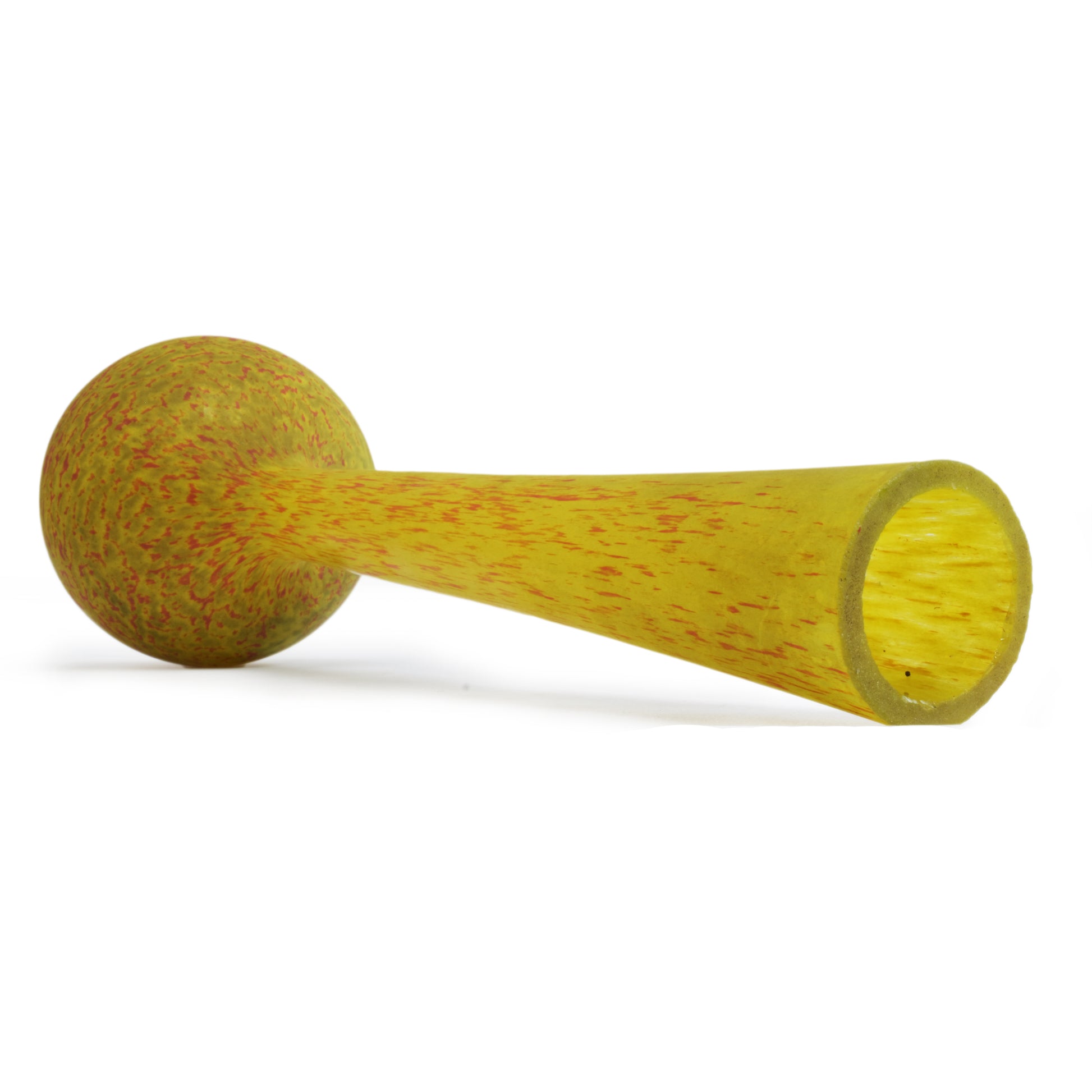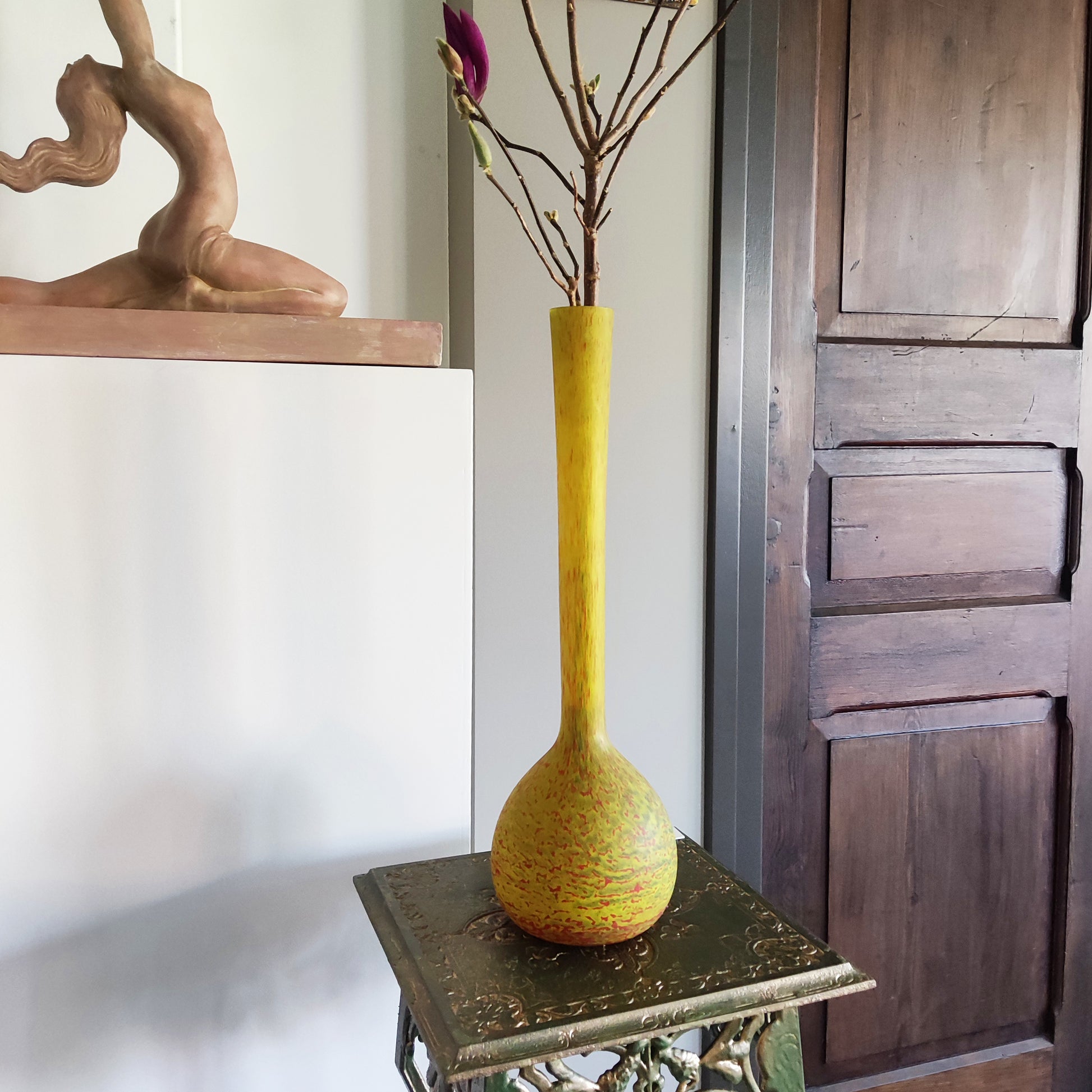Solifleur van André delatte uit Nancy. Deze typische art nouveau vaas is vergelijkbaar met de berluzes van Daum uit Nancy. Het glas bevat meer diverse kleuren insluitsels en grotere contrasten. De glaspoeders werden bij Delatte tijdens het maakproces later opgebracht dan bij Daum. daardoor zijn de vlekken kleiner en veel minder met de vorm uitgeblazen. Deze vazen zijn nog steeds modern en zijn ook erg decoratief in een hedendaags interieur.