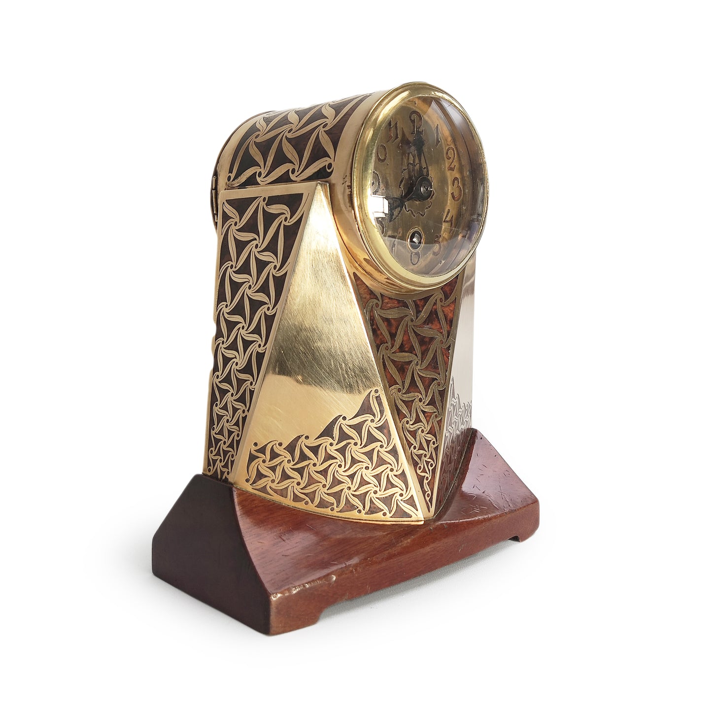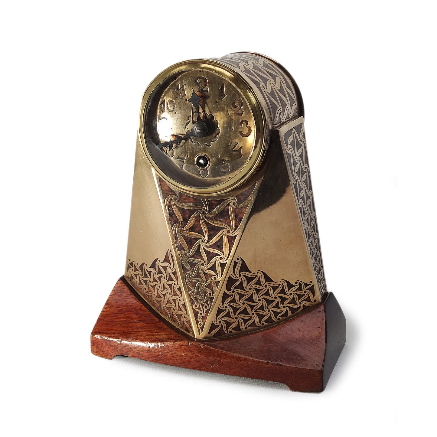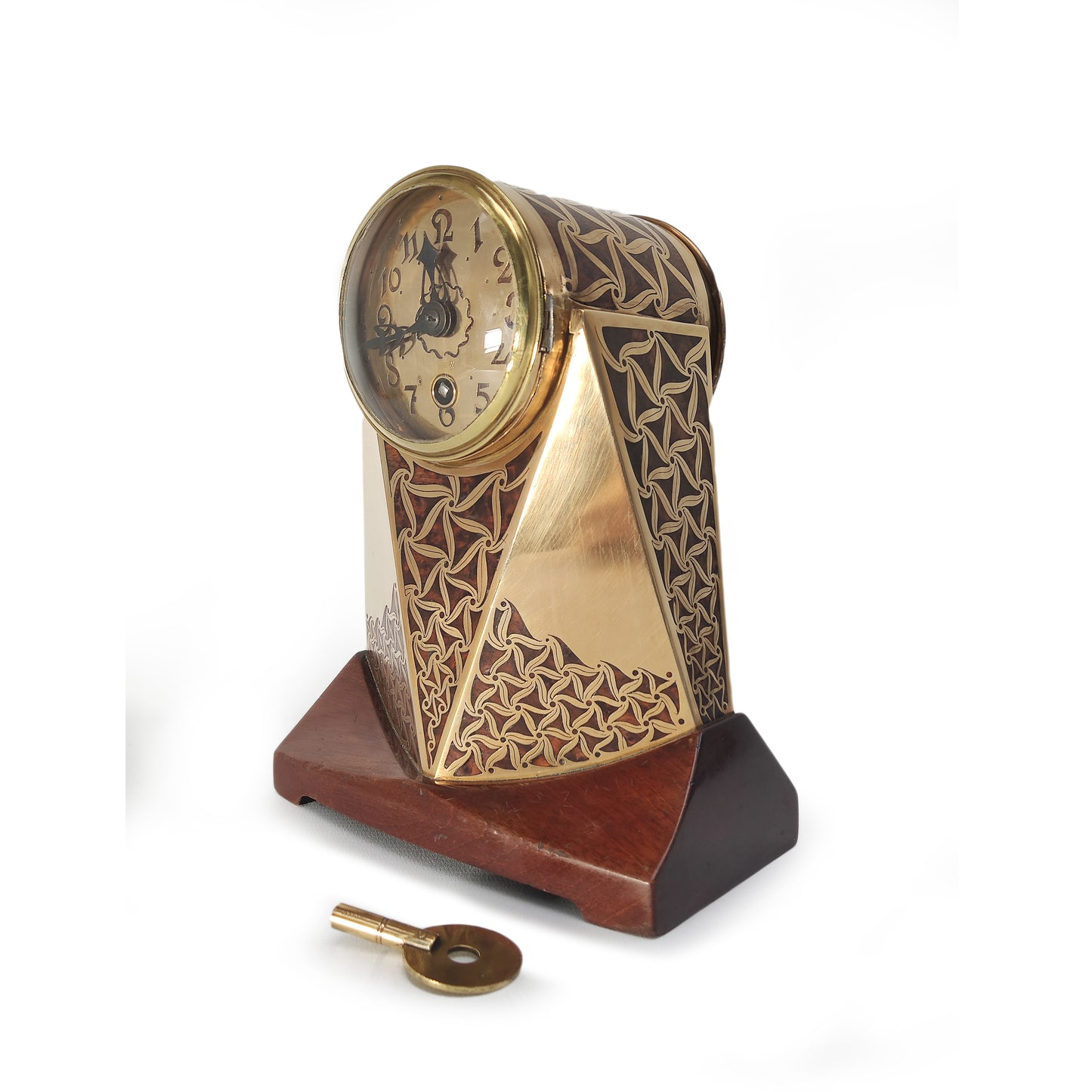Zeer bijzondere klok uit Praag. Artêl is de Tjechische tegenhanger van de Wiener Werkstätten. Deze klok staat ook afgebeeld in het standaardwerk over Artêl. Het gaat hier om een zeldzaam kunstwerk van museum niveau. De techniek kennen we van Ehrard und söhne, en het is heel goed mogelijk dat zij deze klok geproduceerd hebben. De verfijnde techniek van messing en hout inlegwerk heeft hier echter een abstrakte vorm gekregen. De vormgeving met de typerende driehoekige vlakken heeft hier een verfijnde invulling gekregen.
