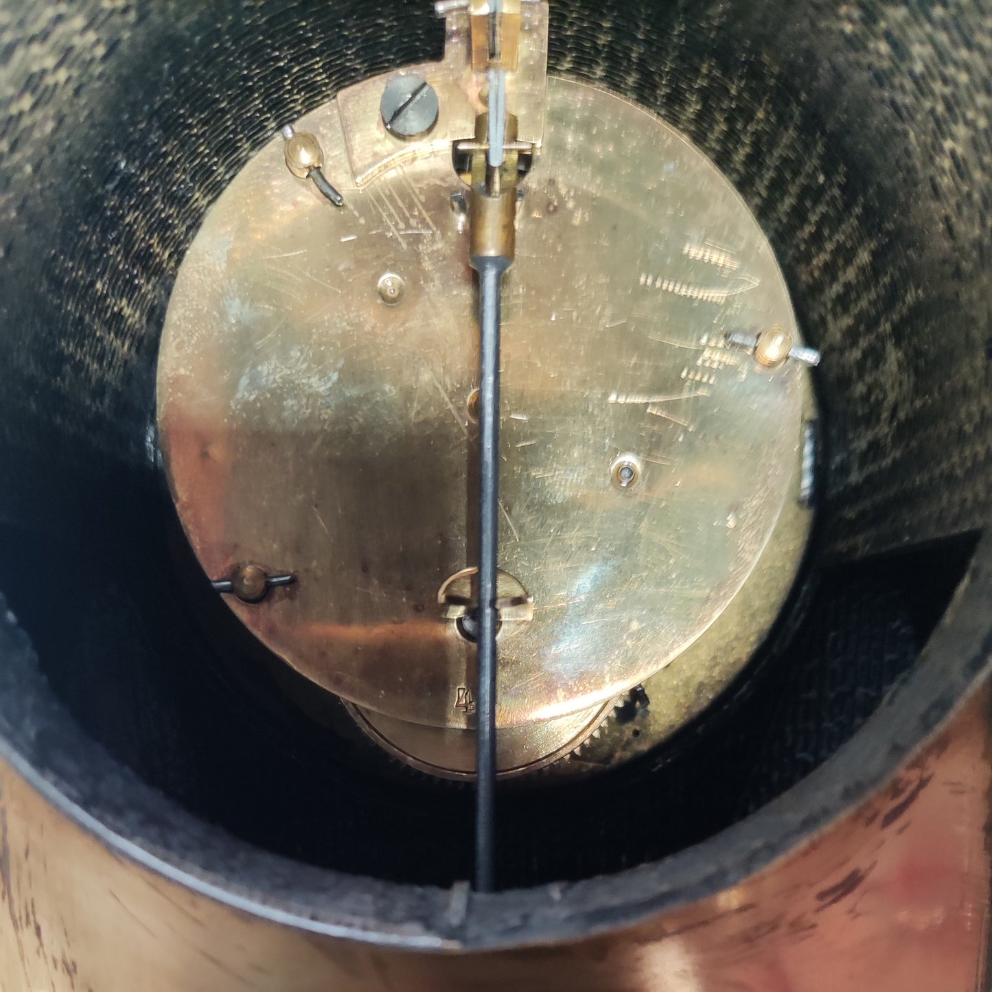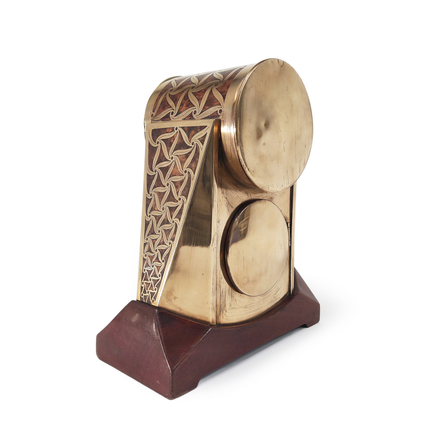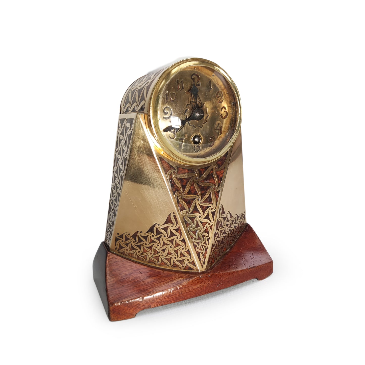 Zeer bijzondere klok uit Praag. Artêl is de Tjechische tegenhanger van de Wiener Werkstätten. Deze klok staat ook afgebeeld in het standaardwerk over Artêl. Het gaat hier om een zeldzaam kunstwerk van museum niveau. De techniek kennen we van Ehrard und söhne, en het is heel goed mogelijk dat zij deze klok geproduceerd hebben. De verfijnde techniek van messing en hout inlegwerk heeft hier echter een abstrakte vorm gekregen. De vormgeving met de typerende driehoekige vlakken heeft hier een verfijnde invulling gekregen.