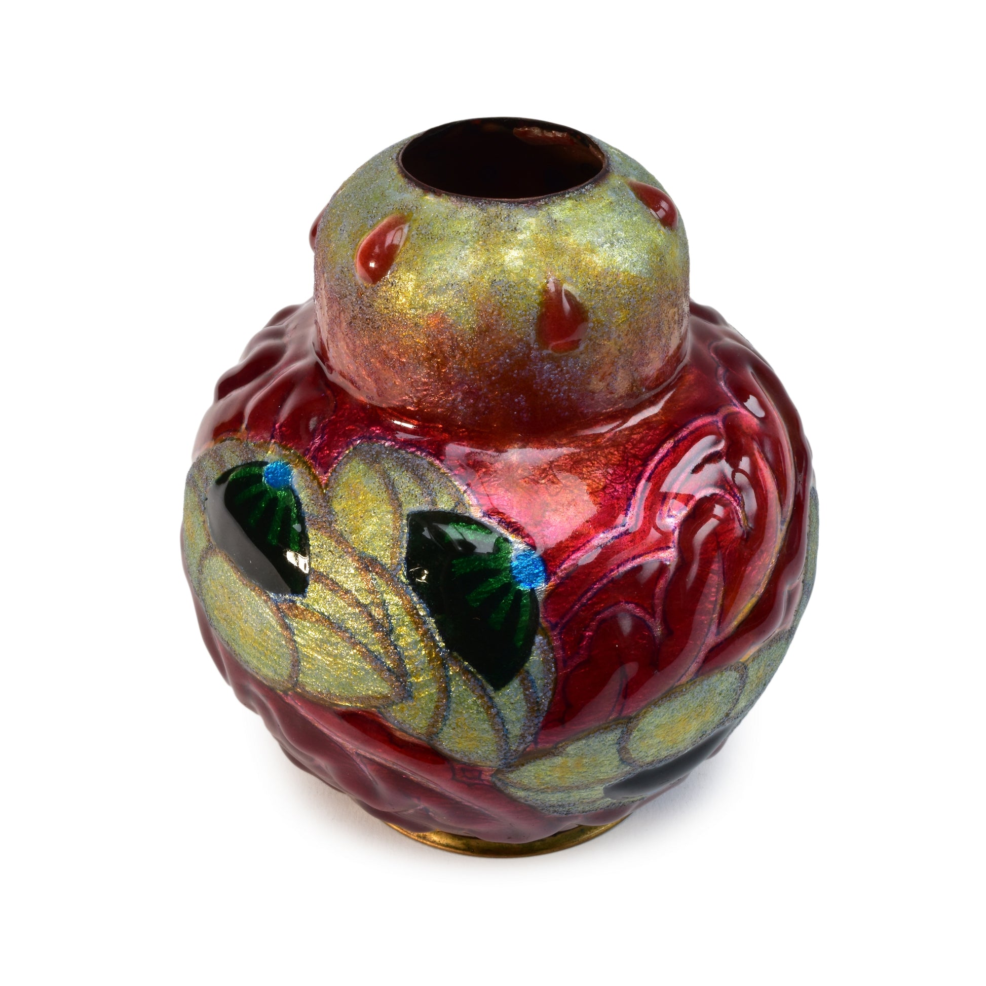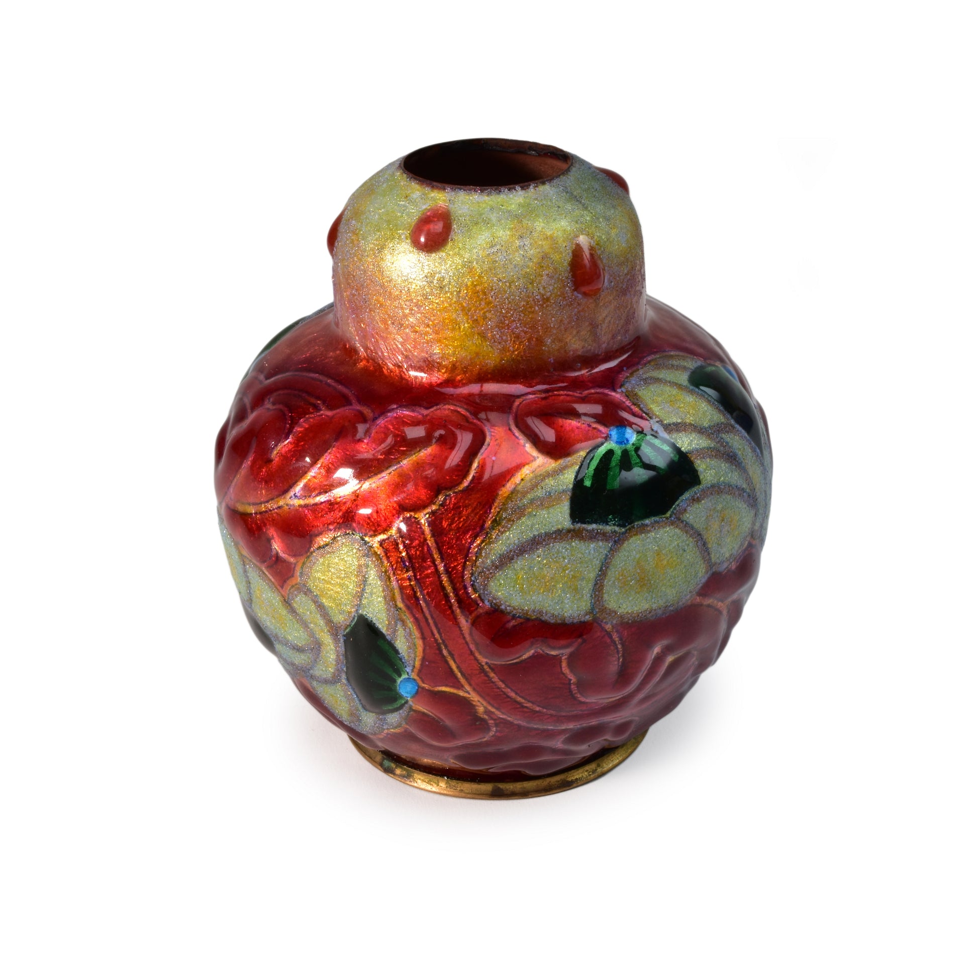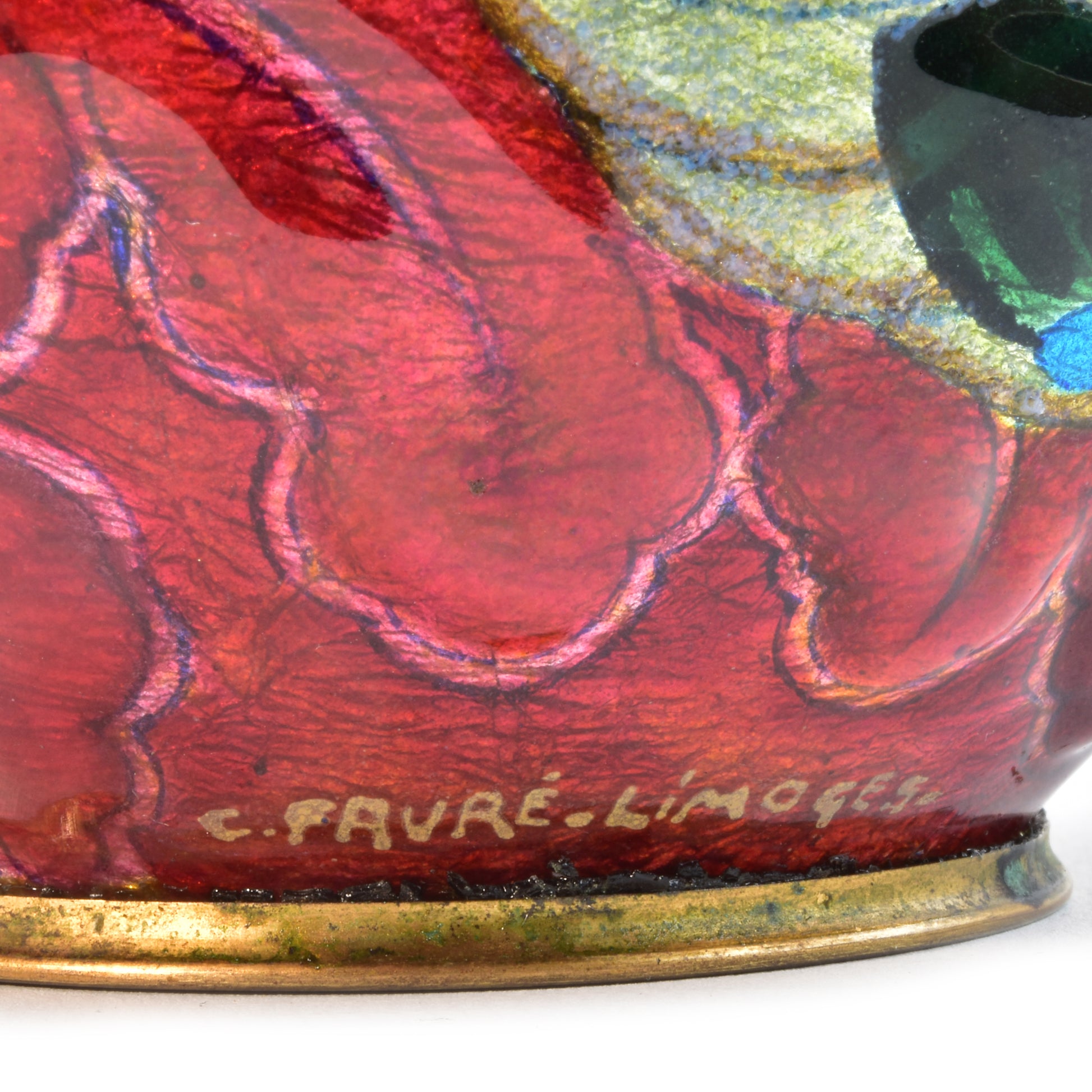 Ce vase de Camille Fauré présente un rare décor d'anémones très très stylisées. C'est un ensemble qui se situe entre la phase initiale réaliste et les ensembles abstraits ultérieurs. Le modèle de ce vase est "188" et est également très rare. Quelle belle couleur ce rouge intense. Signé C.Fauré.Limoges.
