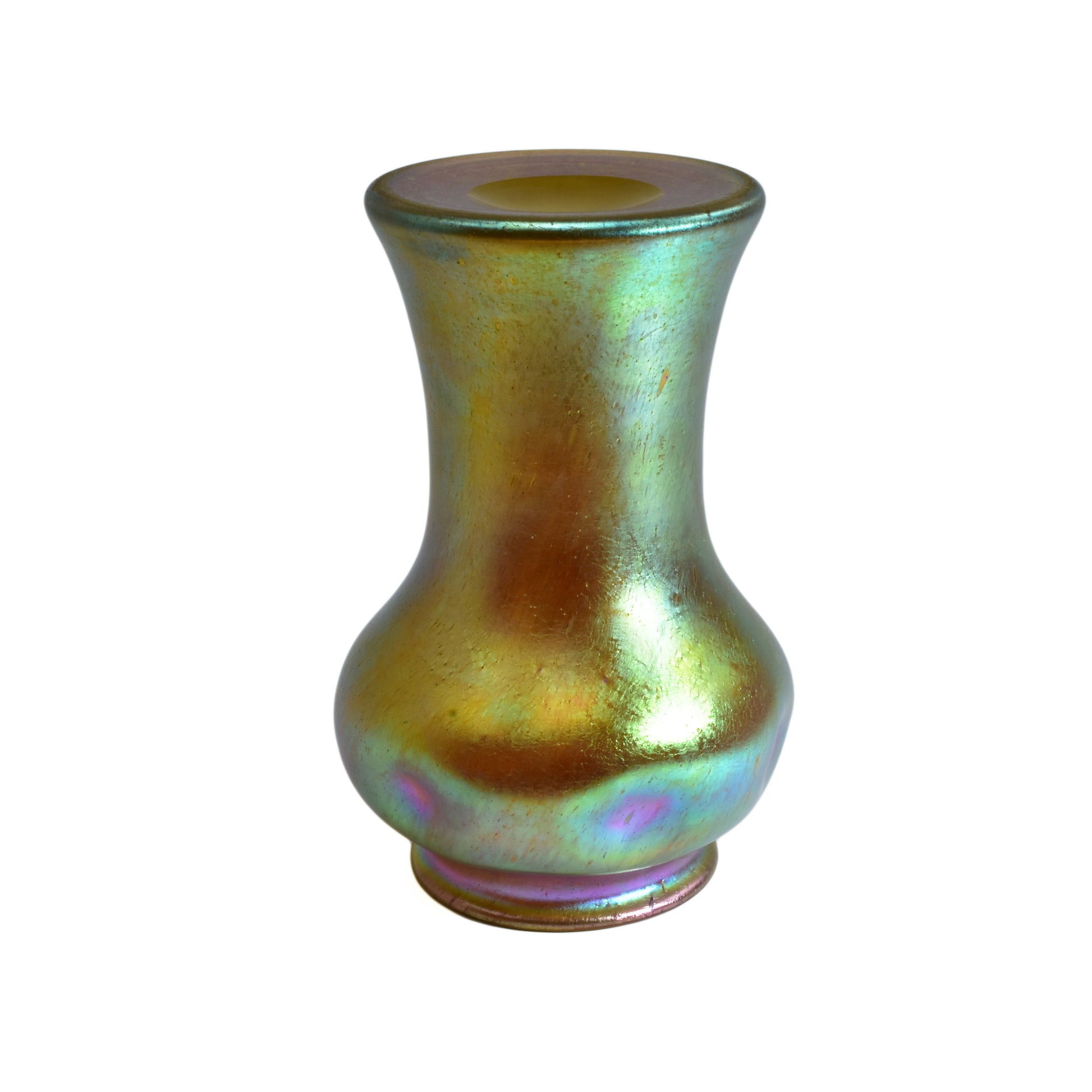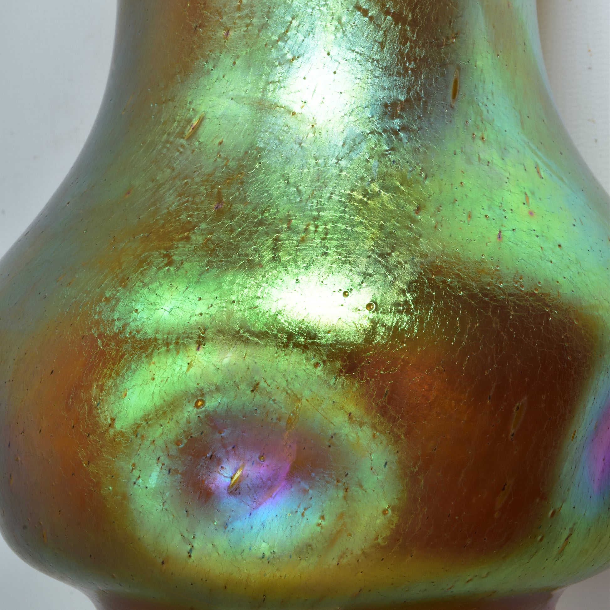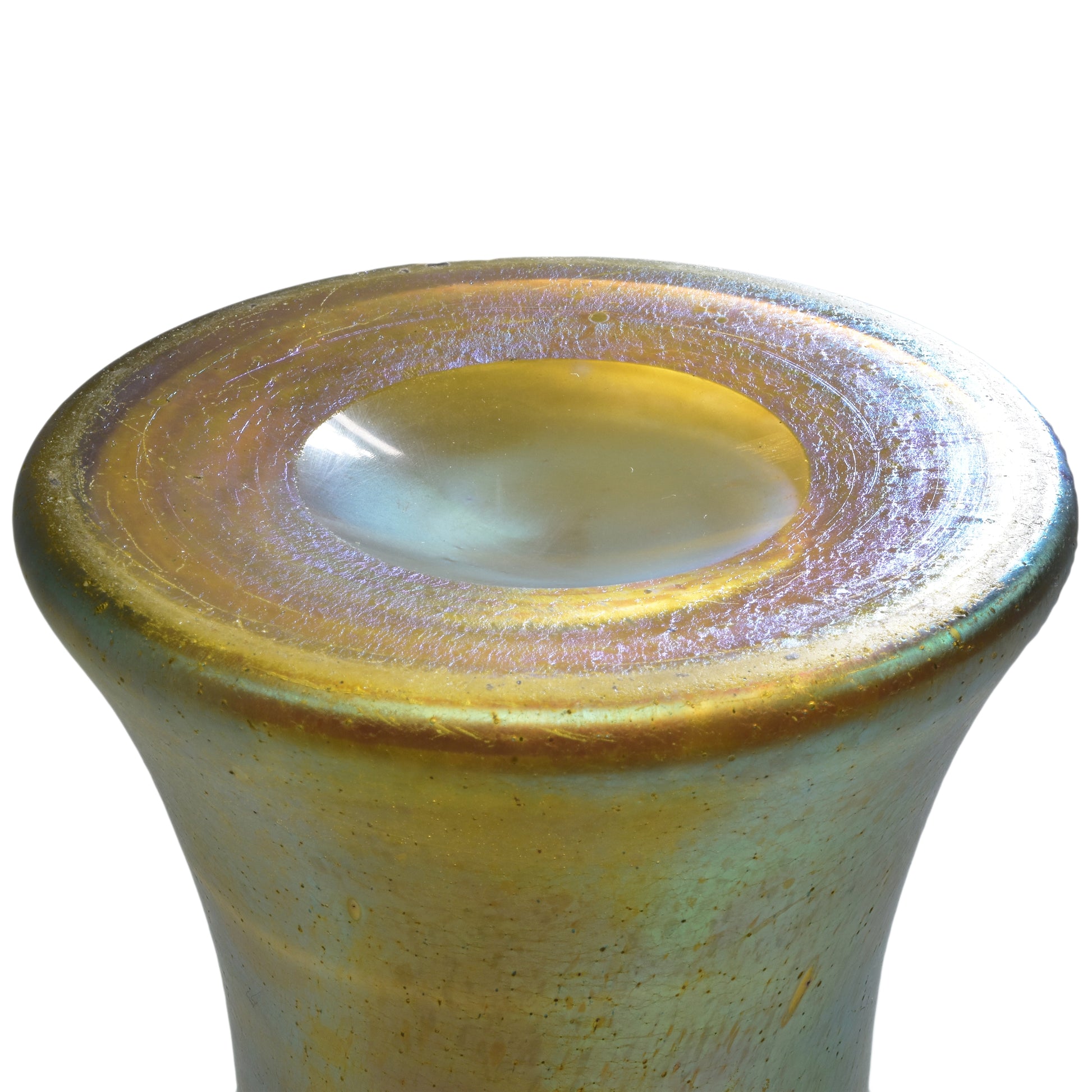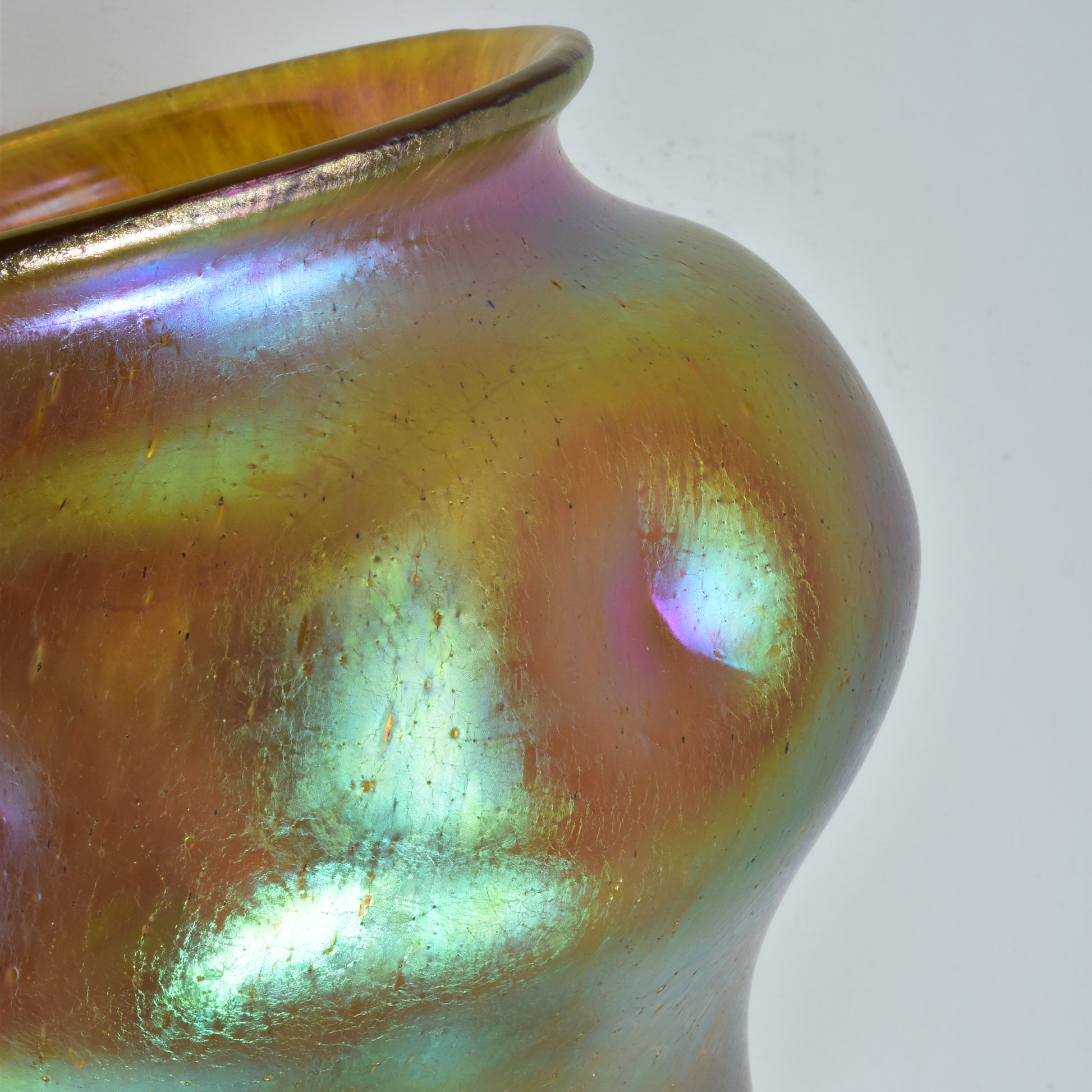 Bon vase candia silberiris irisé. Au-dessus du verre de couleur ambre se trouve une couche d'iris argentée réfléchissante qui reflète toutes les couleurs de l'arc-en-ciel à la manière d'une nacre. Le verre contient des fils troubles de verre ambré. L’un de ces fils ressemble un peu à une longue fissure dans le verre, mais ce n’est certainement pas le cas. Le vase est en parfait état.
