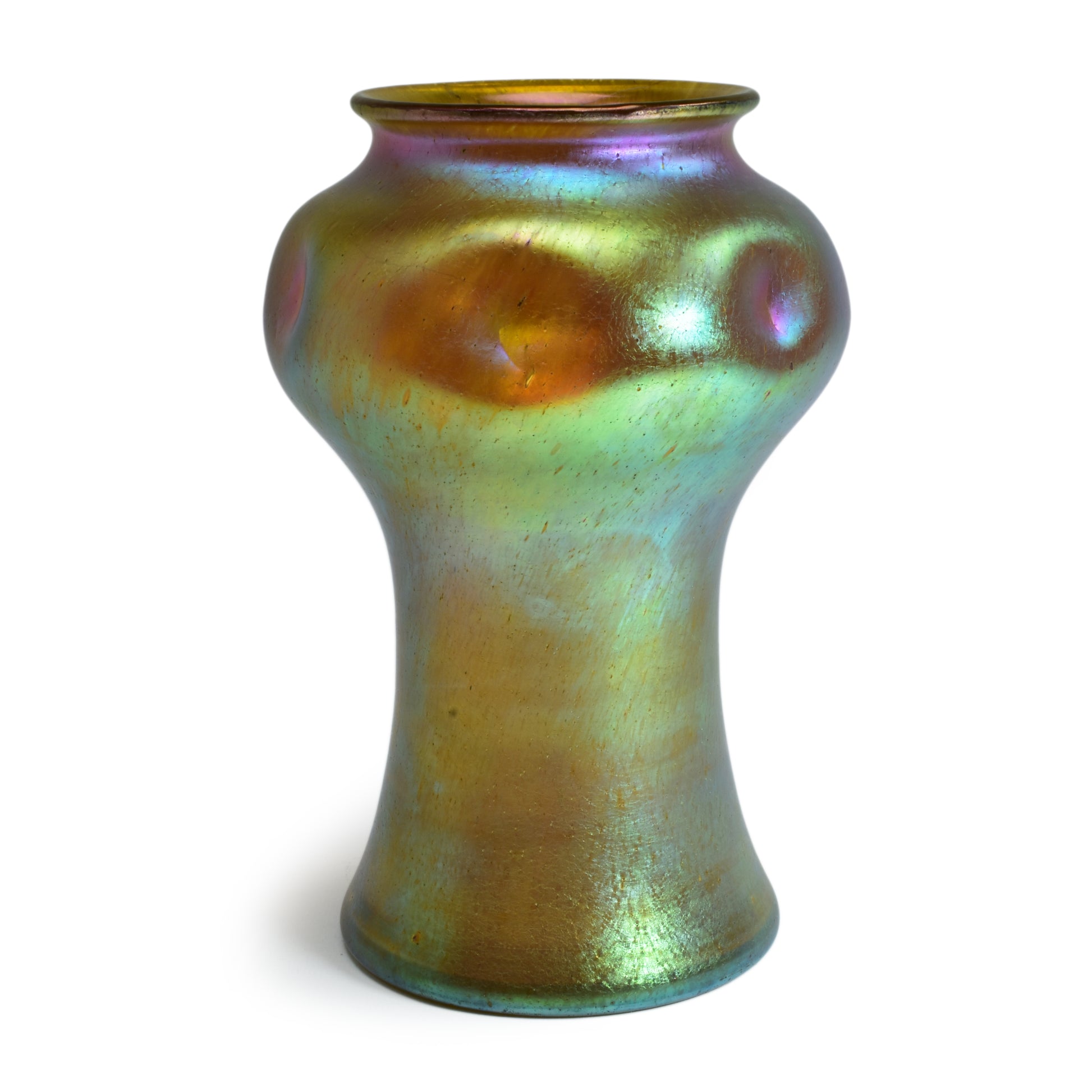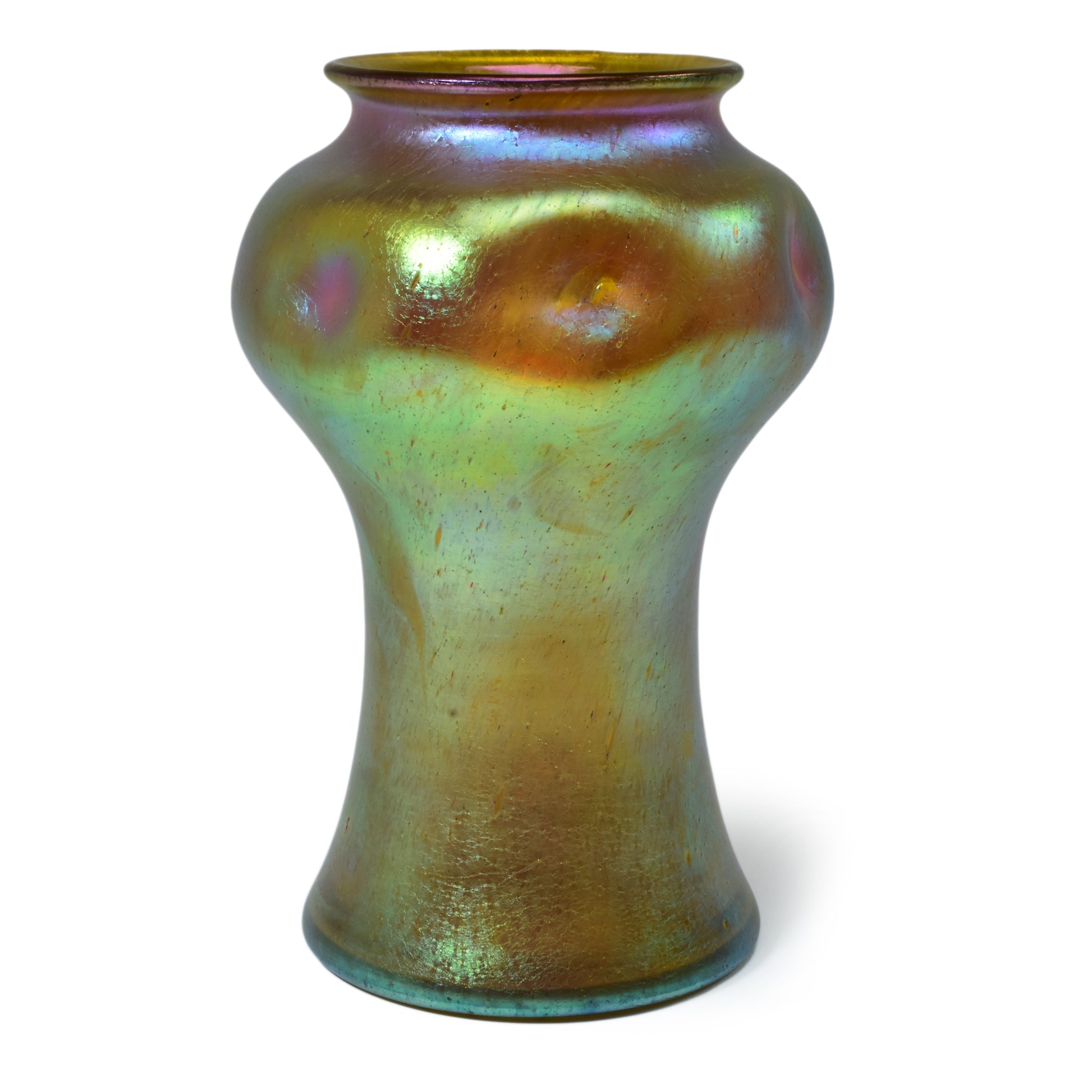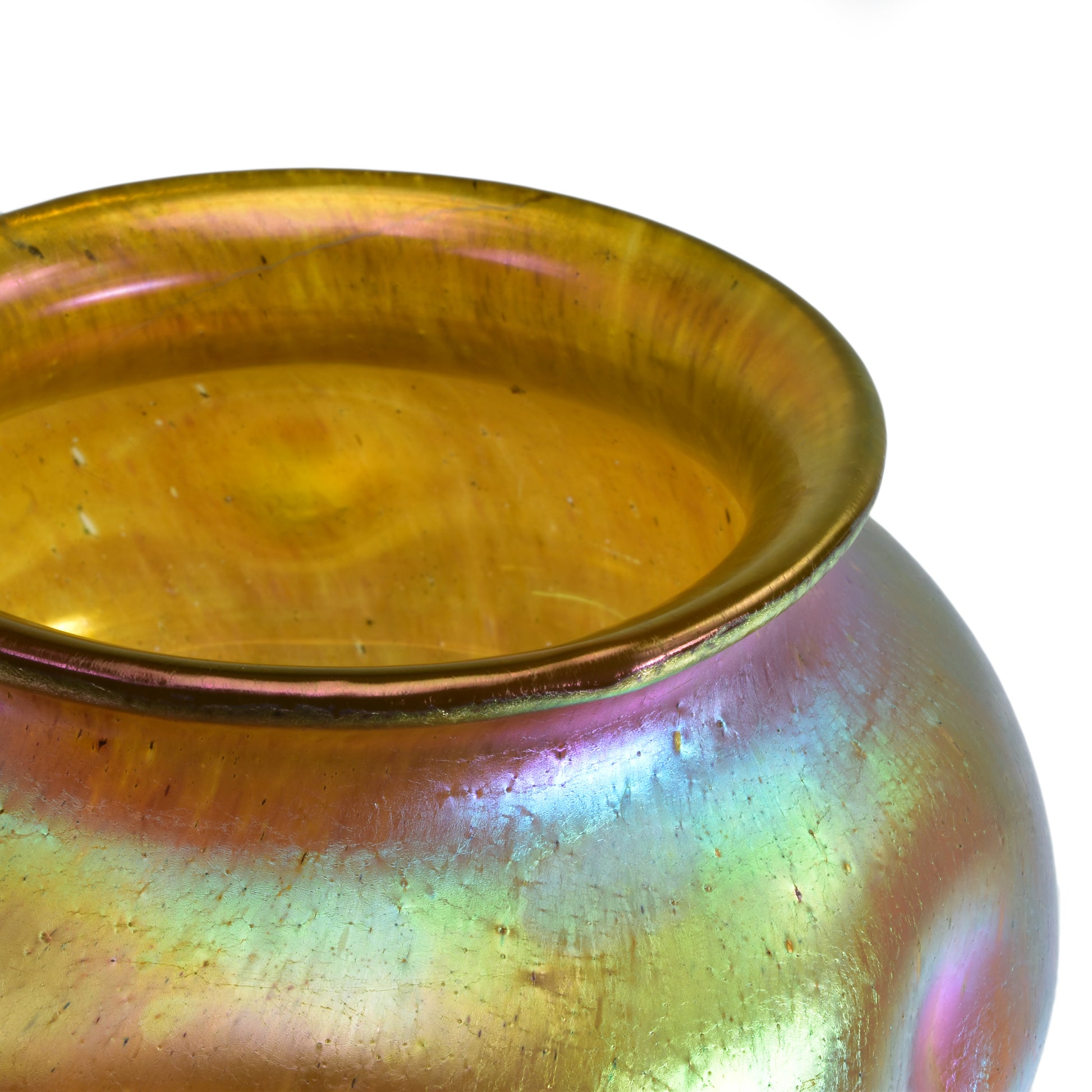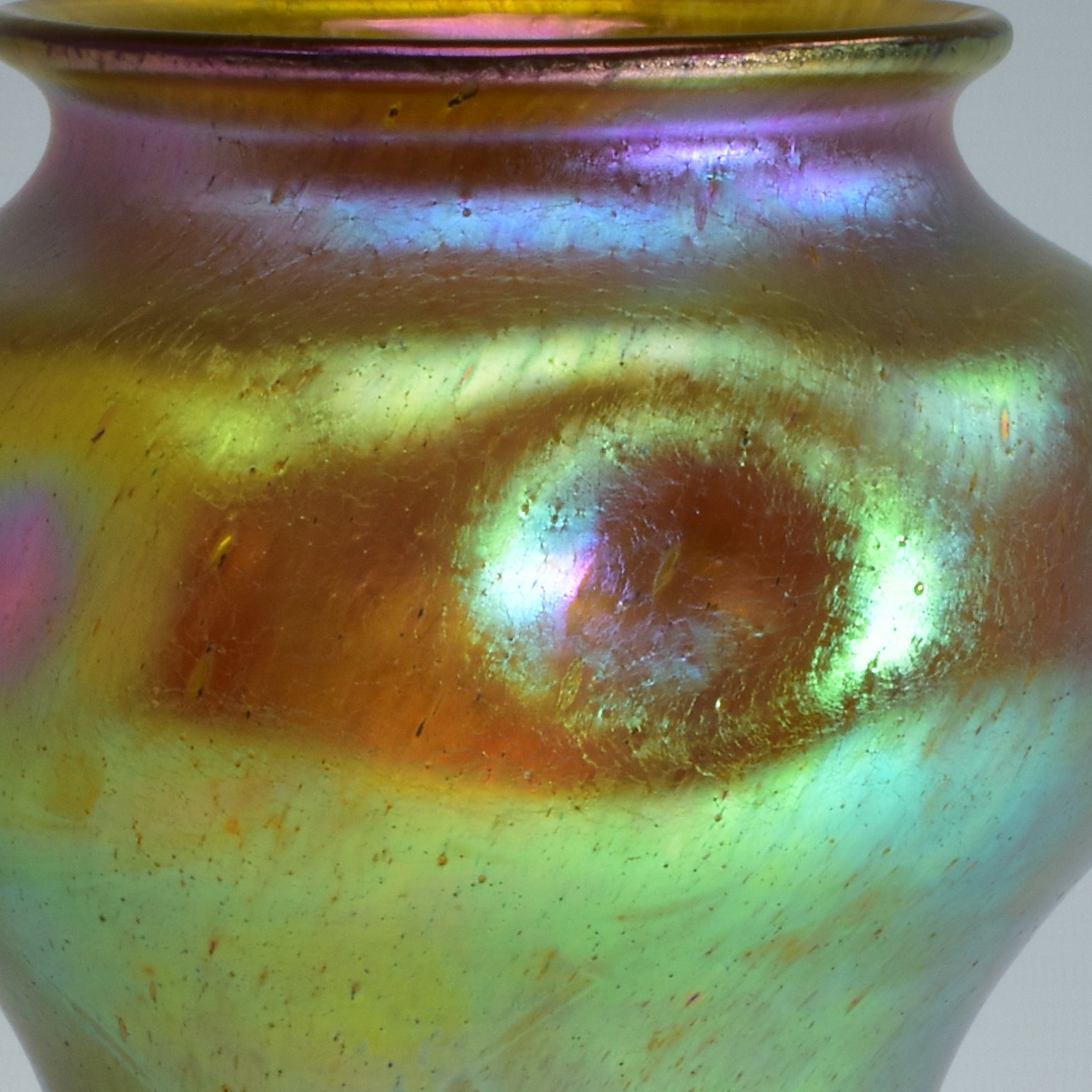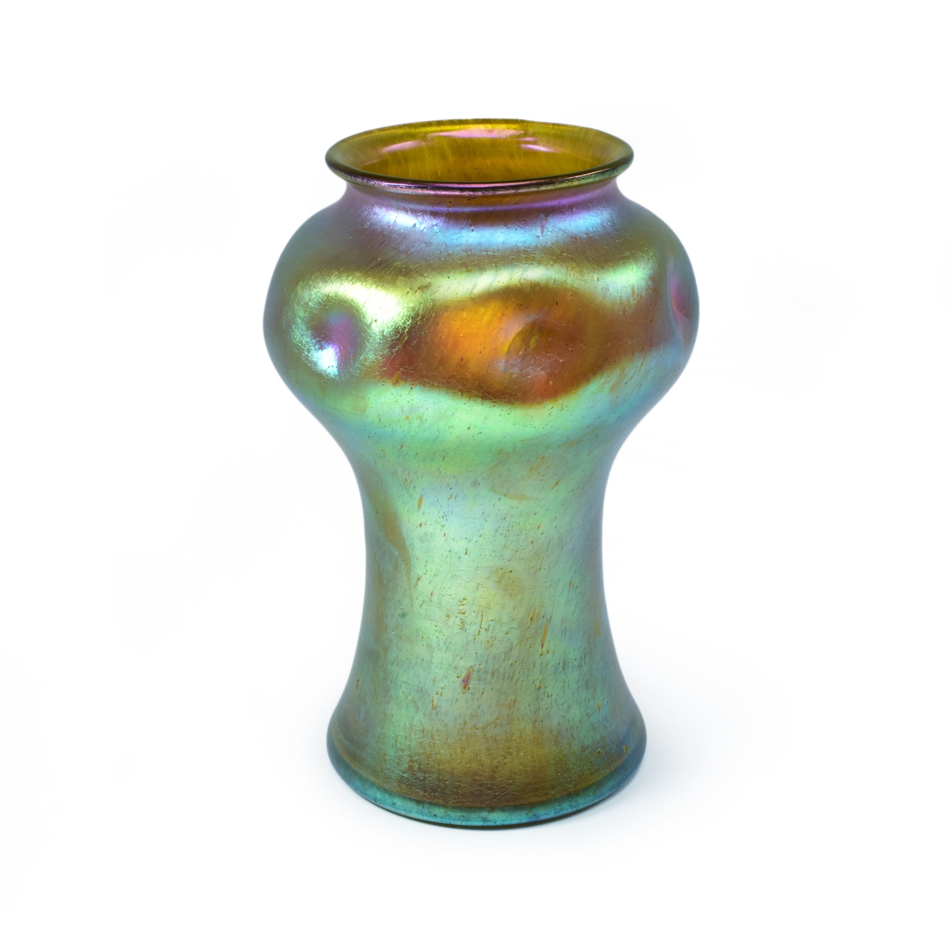 Bon vase candia silberiris irisé. Au-dessus du verre de couleur ambre se trouve une couche d'iris argentée réfléchissante qui reflète toutes les couleurs de l'arc-en-ciel à la manière d'une nacre. Le verre contient des fils troubles de verre ambré. L’un de ces fils ressemble un peu à une longue fissure dans le verre, mais ce n’est certainement pas le cas. Le vase est en parfait état.
