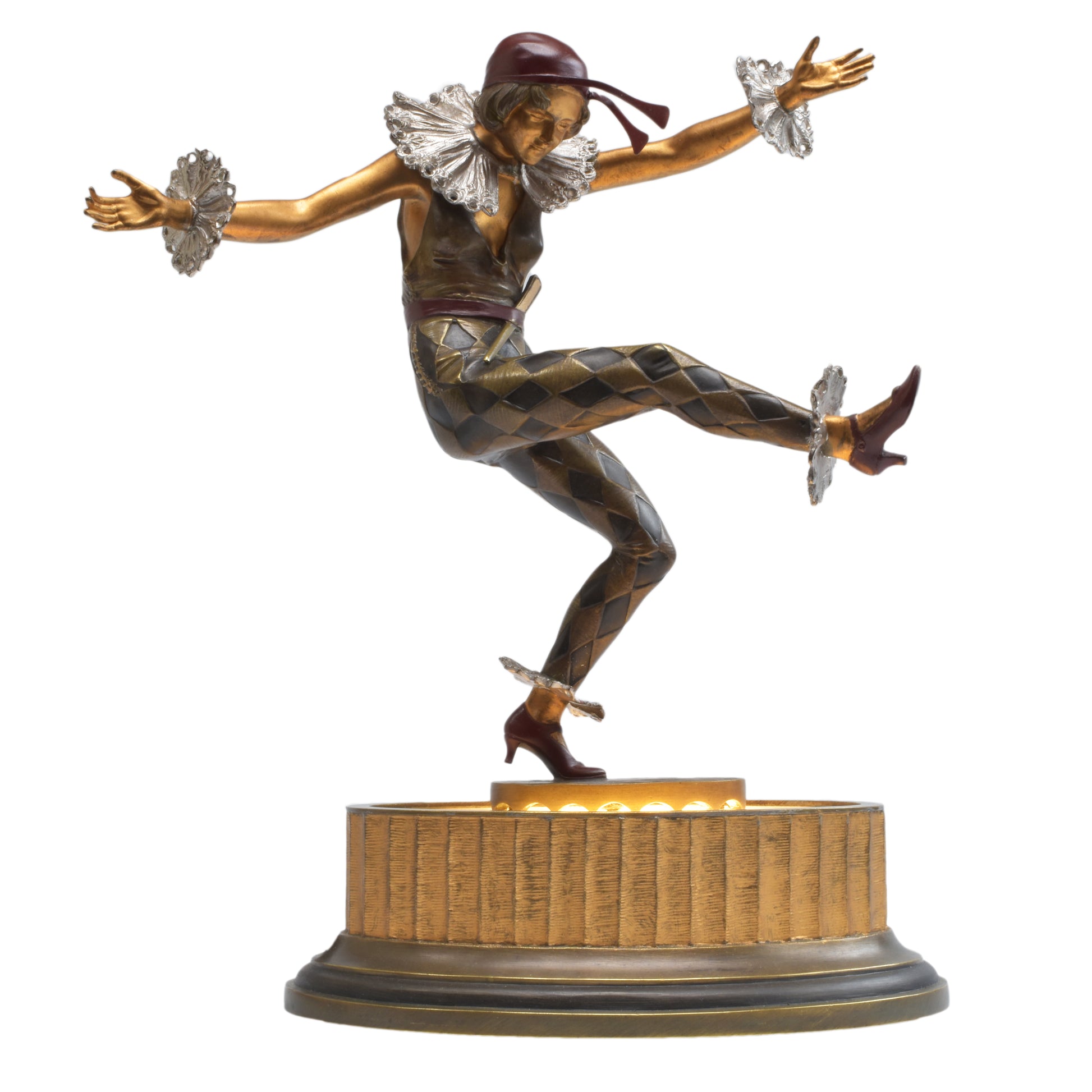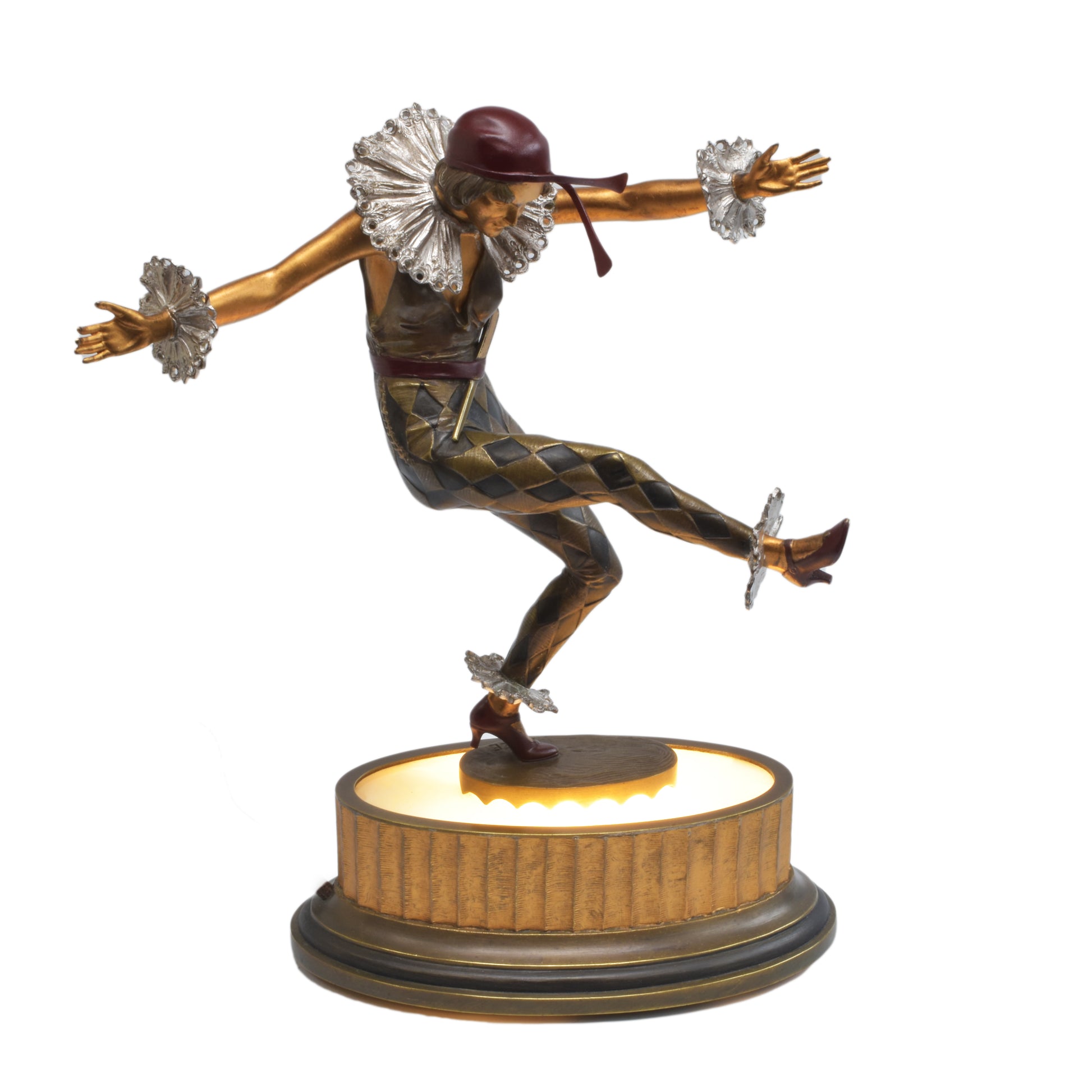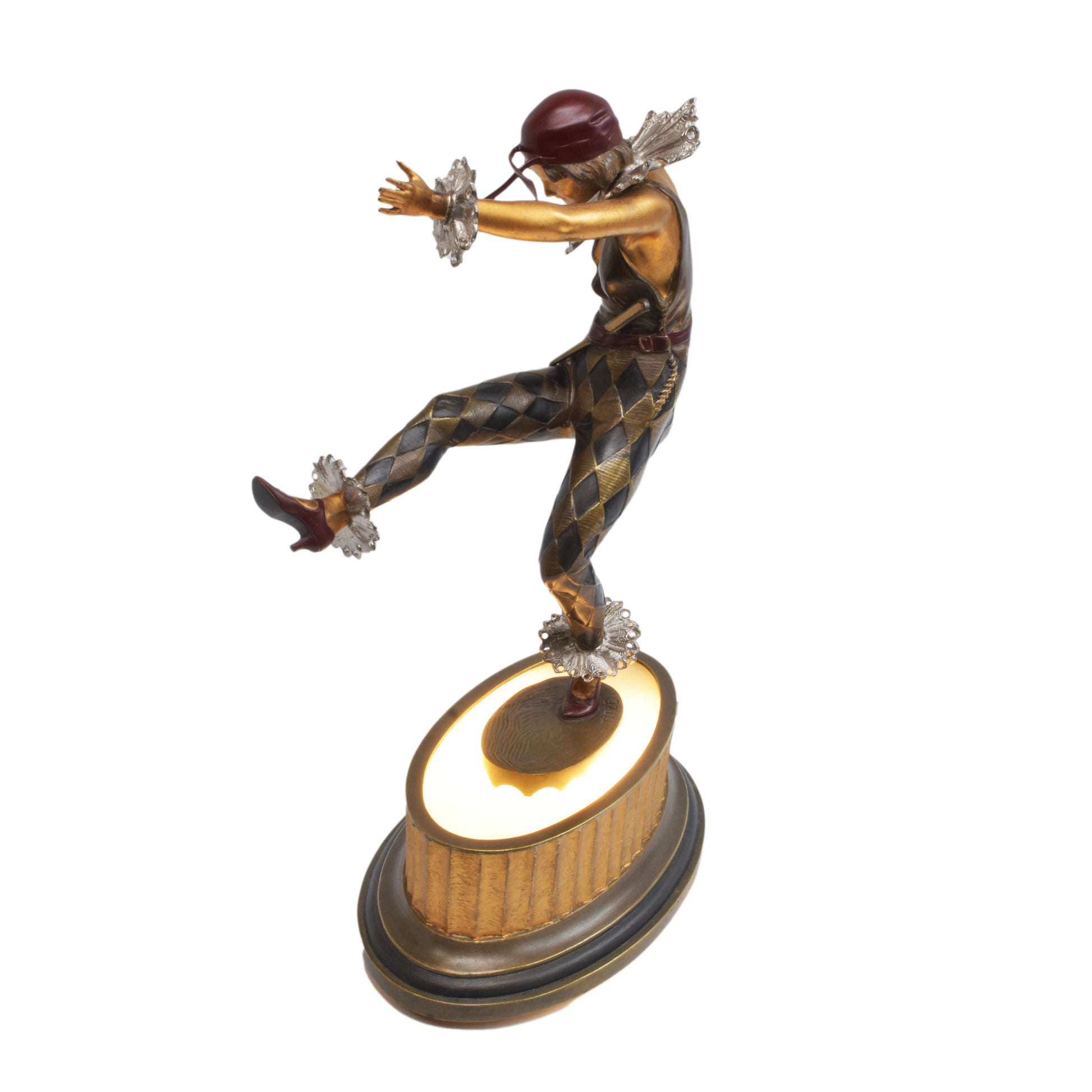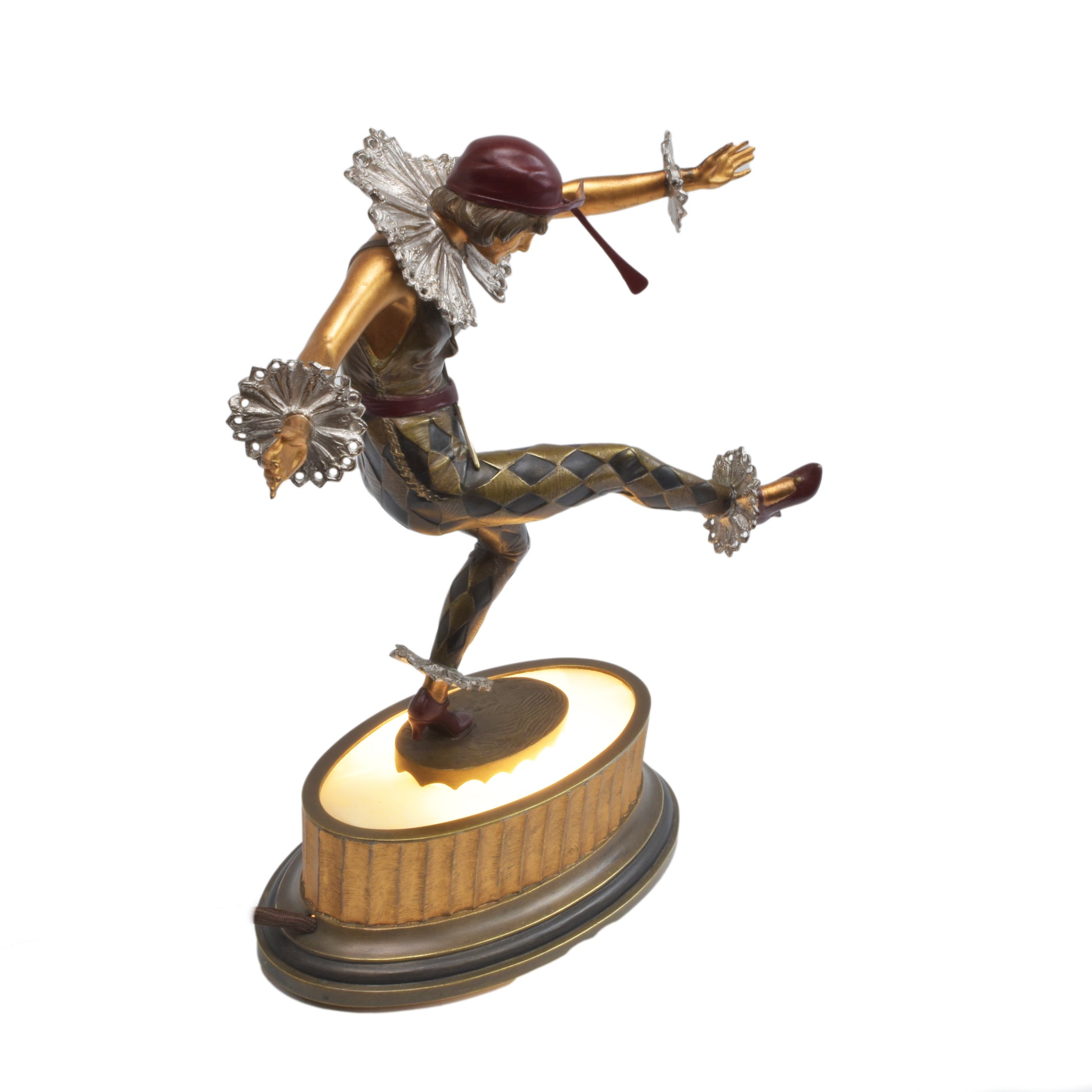 Statue raffinée en bronze sur socle avec plateau et éclairage en albâtre. Le battacio de la Commedia dell'arte est appelé slap stick en anglais . elle porte un bâton sur une ceinture autour de sa taille. C'est un instrument de percussion avec lequel on peut faire des coups forts. Elle est habillée comme l'arlequino de la comedia dell'arte.