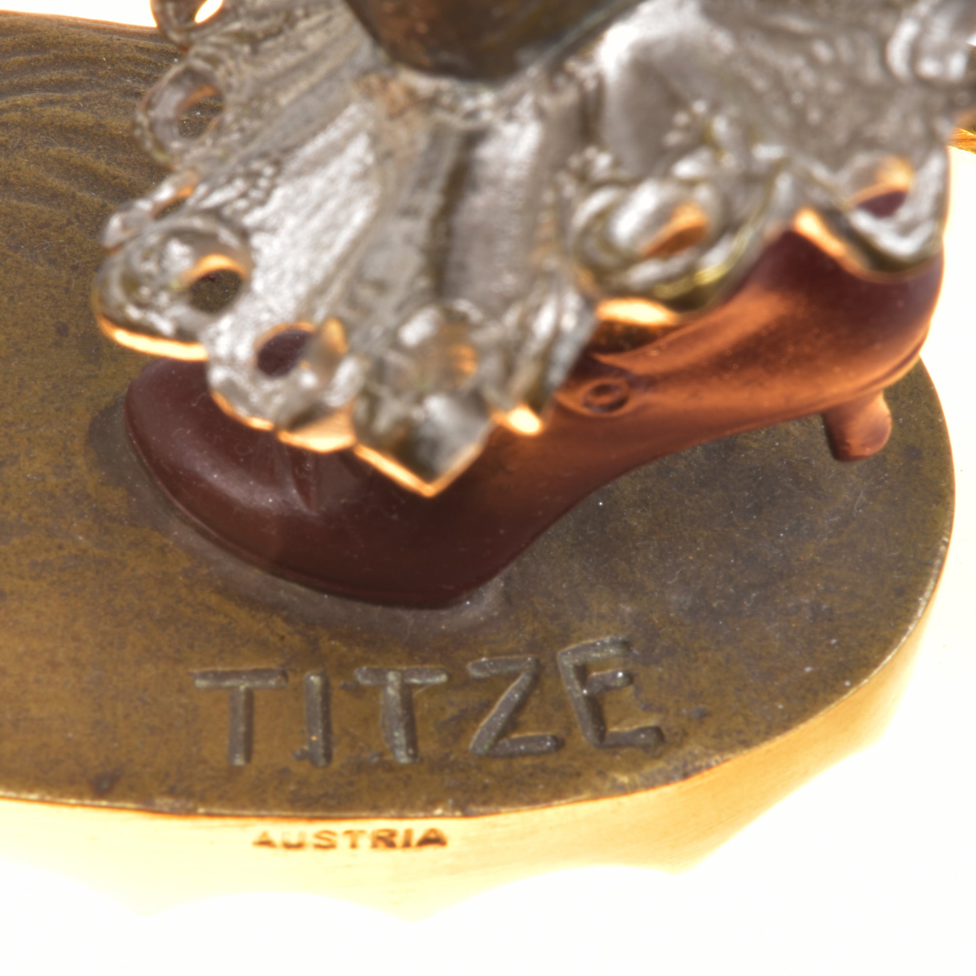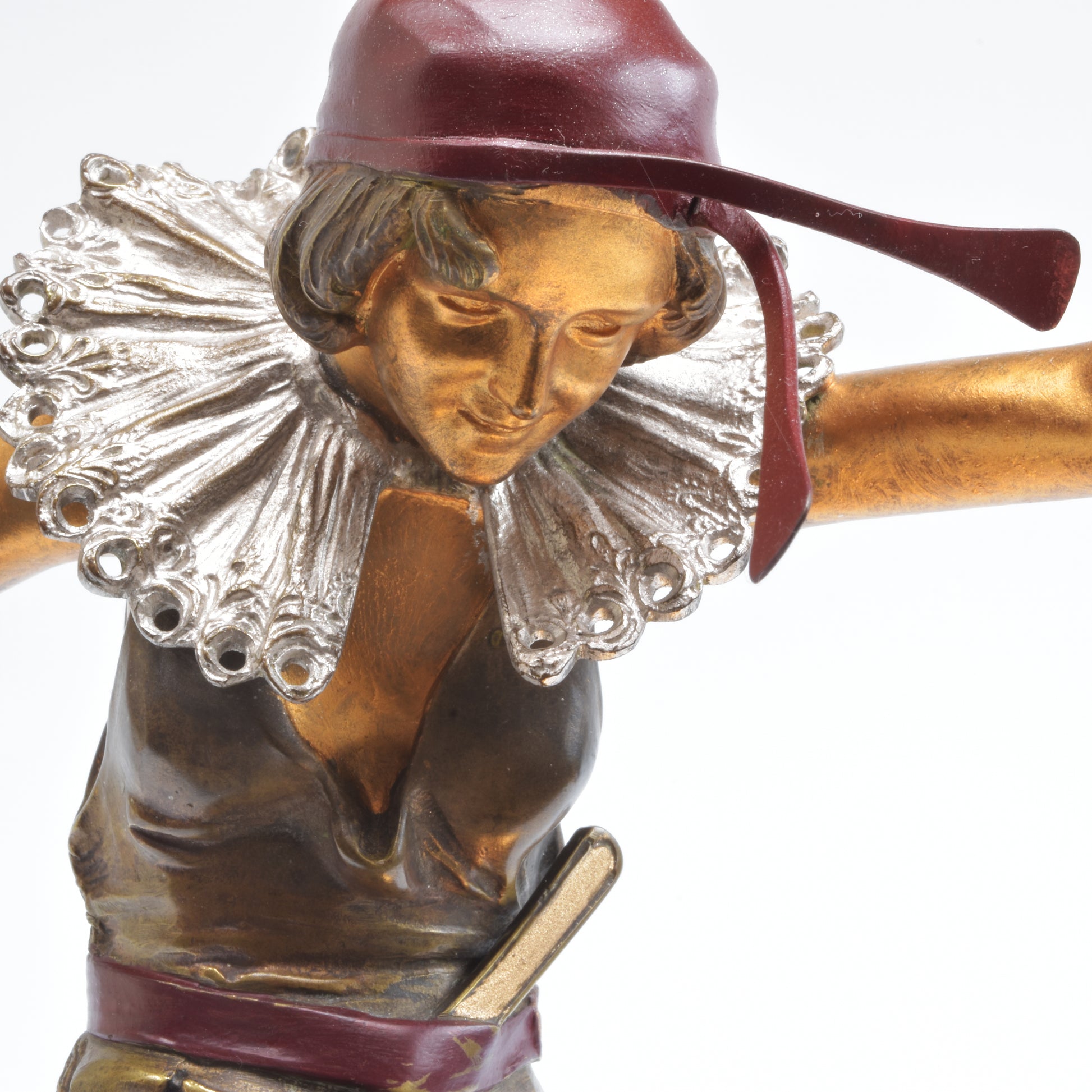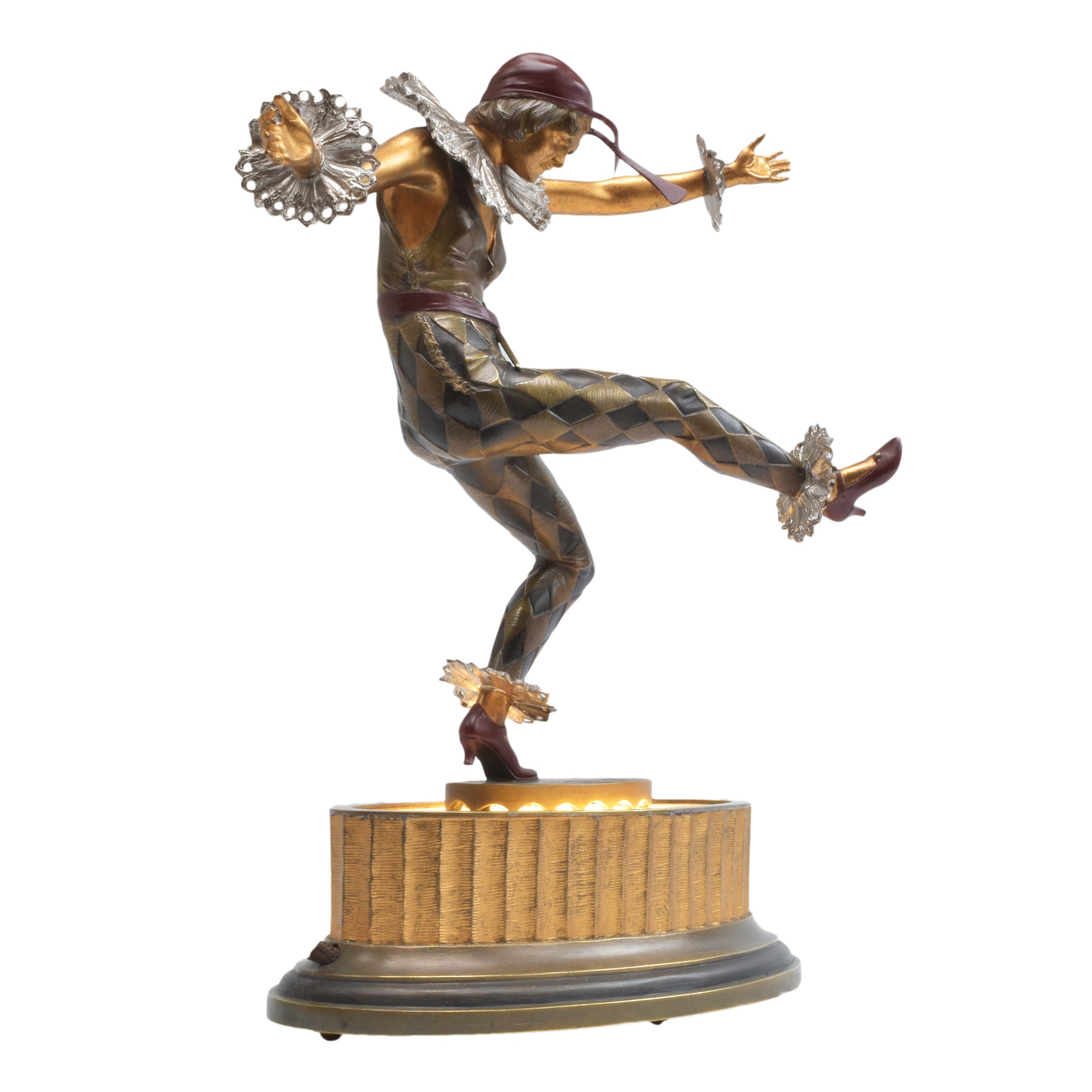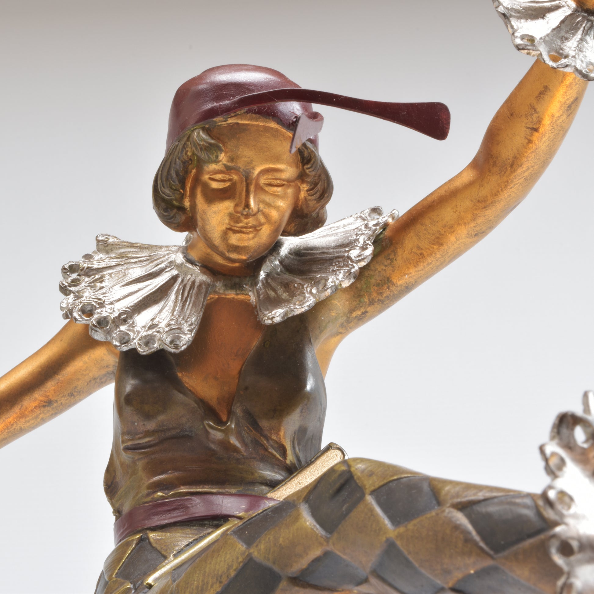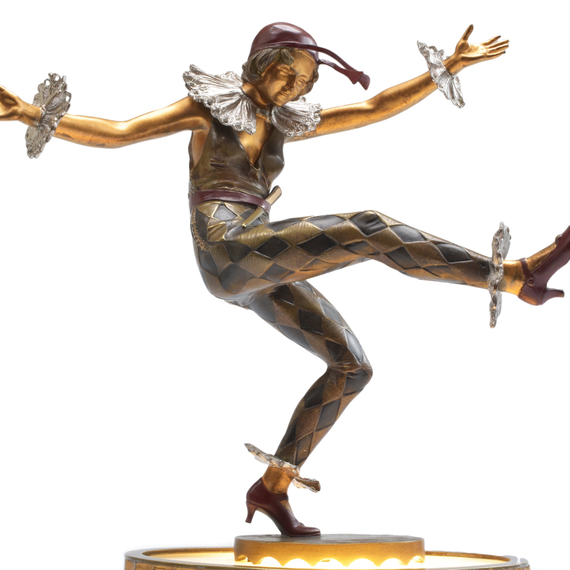 Statue raffinée en bronze sur socle avec plateau et éclairage en albâtre. Le battacio de la Commedia dell'arte est appelé slap stick en anglais . elle porte un bâton sur une ceinture autour de sa taille. C'est un instrument de percussion avec lequel on peut faire des coups forts. Elle est habillée comme l'arlequino de la comedia dell'arte.