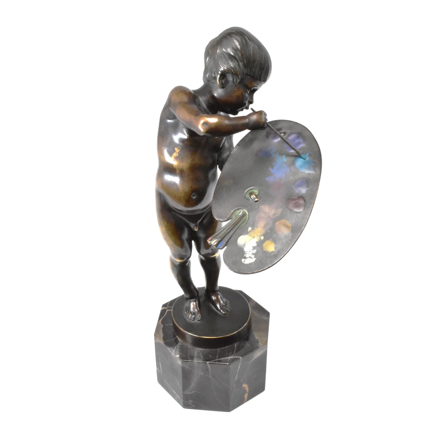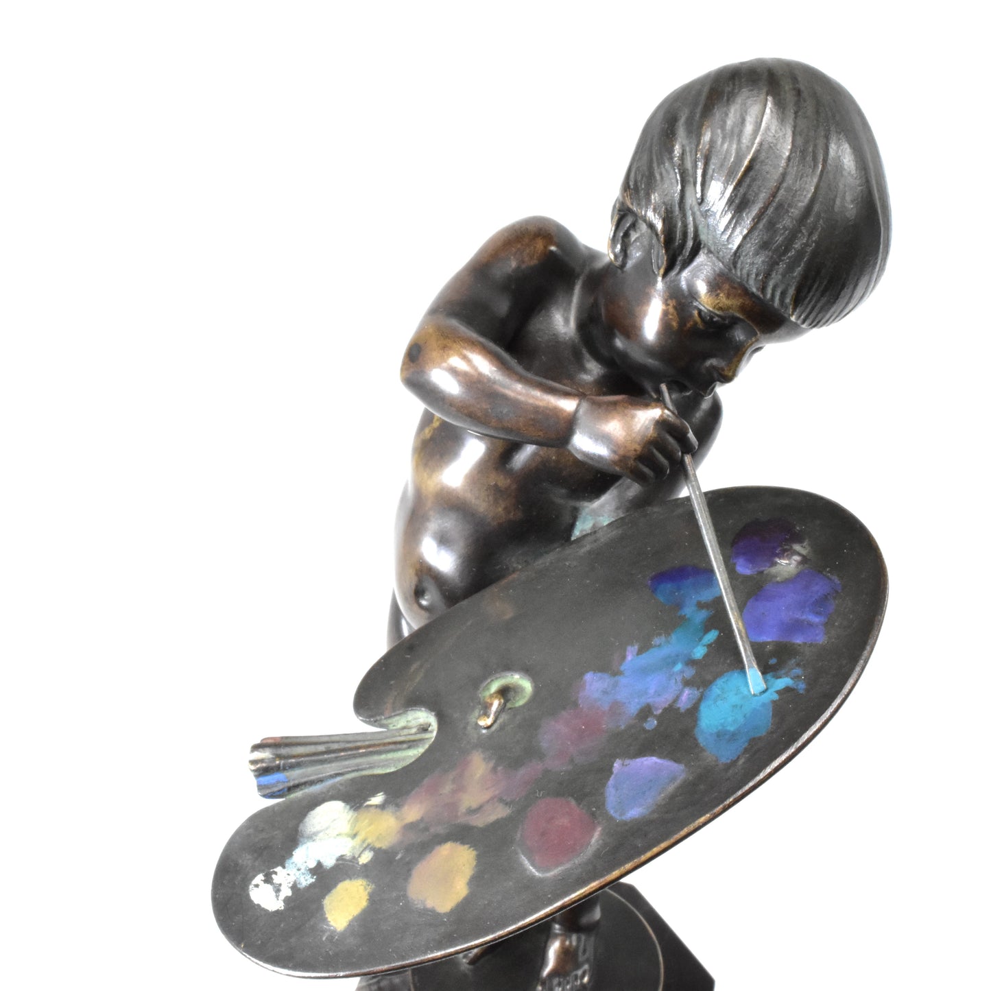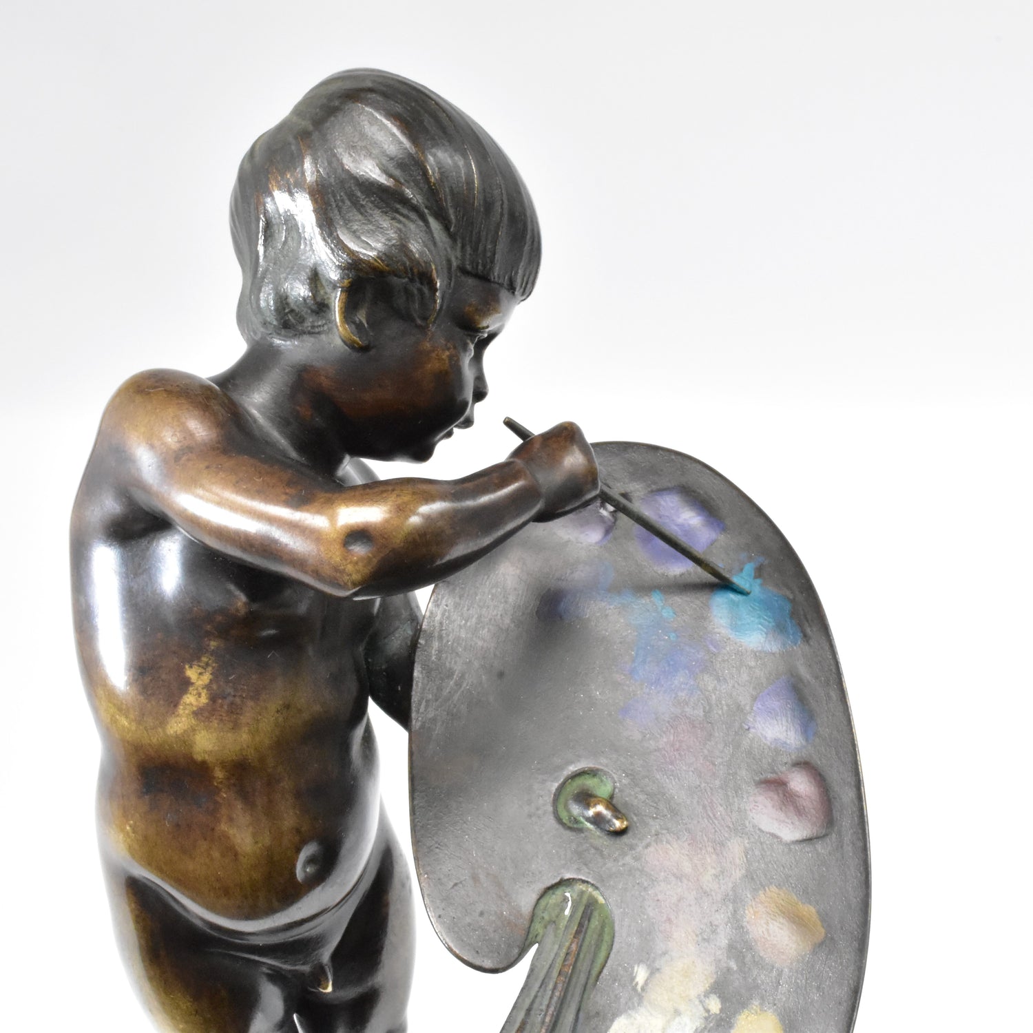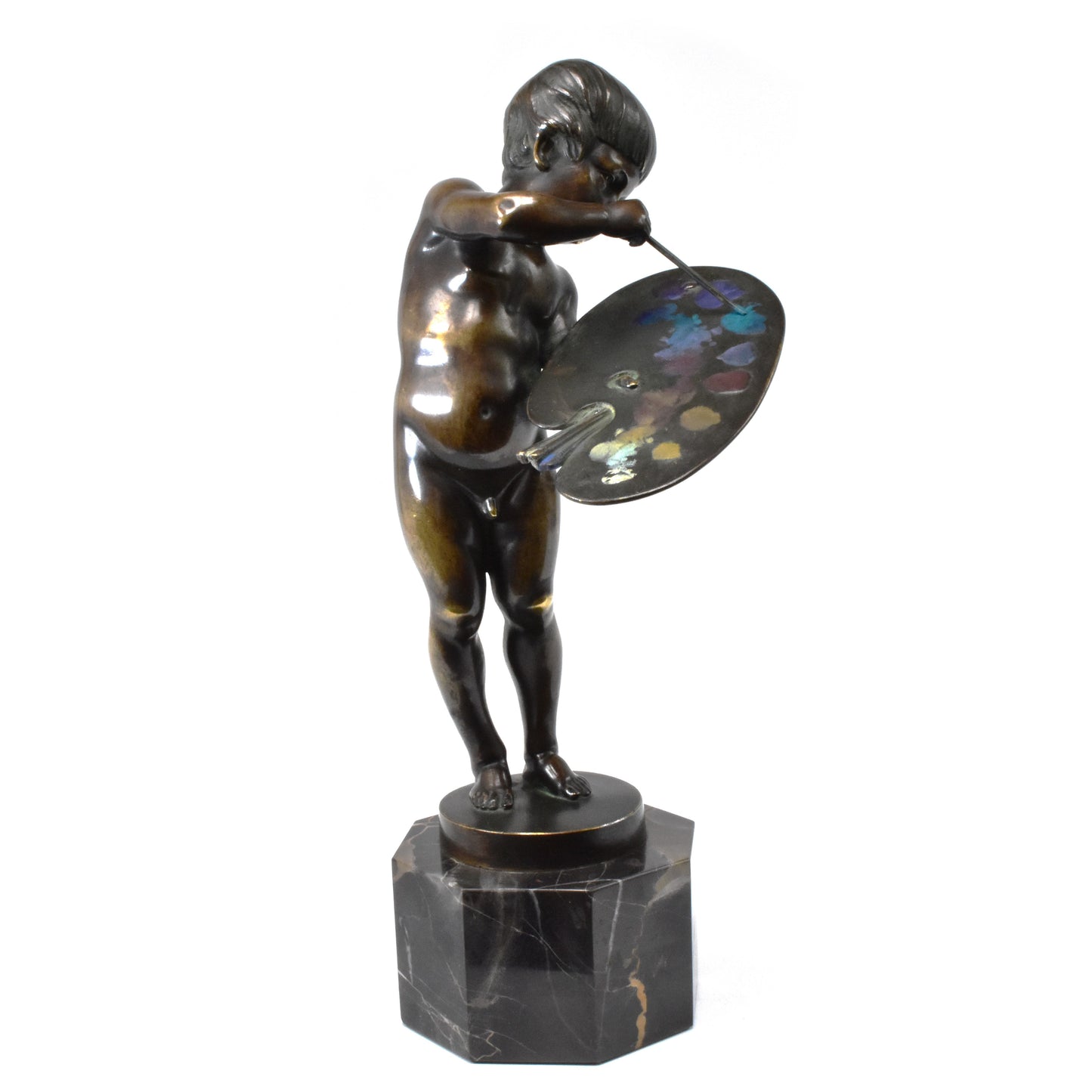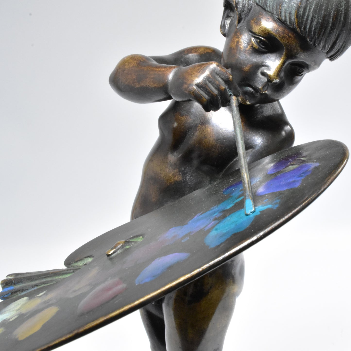 Bronzen beeld van een jongetje dat zich niet laat afleiden van zijn intensieve artistieke bezigheden. Met verve mengt hij zijn palet. De houding is typisch voor de kunstenaar die met een draai in zijn hele lichaam zich van het doek op zijn ezel wendt naar de verf die bovenaan op het palet gemengd moet worden. Geloof me ik kan het weten. Ongelofelijk dat dit prachtige beeldje niet gesigneerd is. We kunnen het wel plaatsen eind 19e eeuw in zuid Duitsland of Oostenrijk.