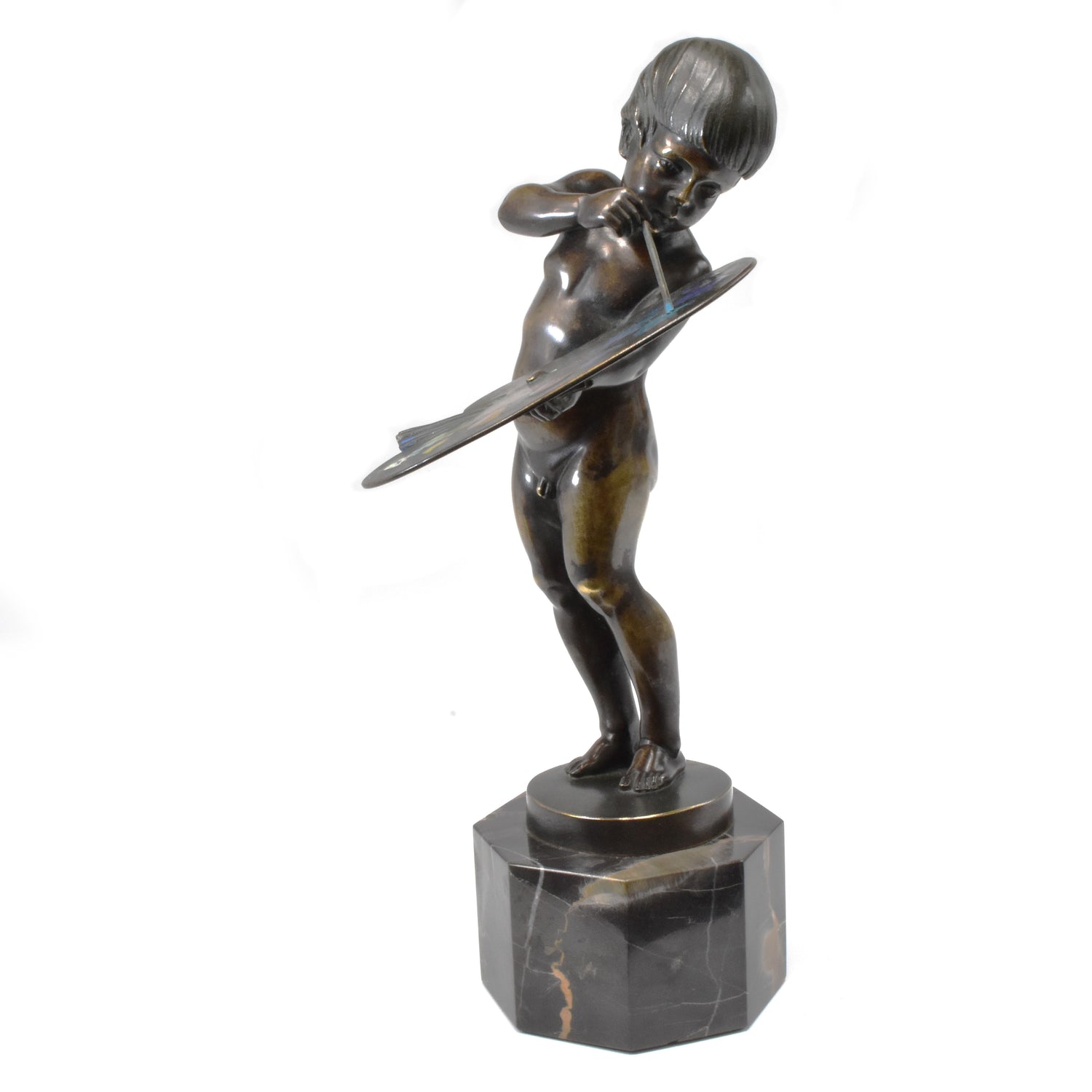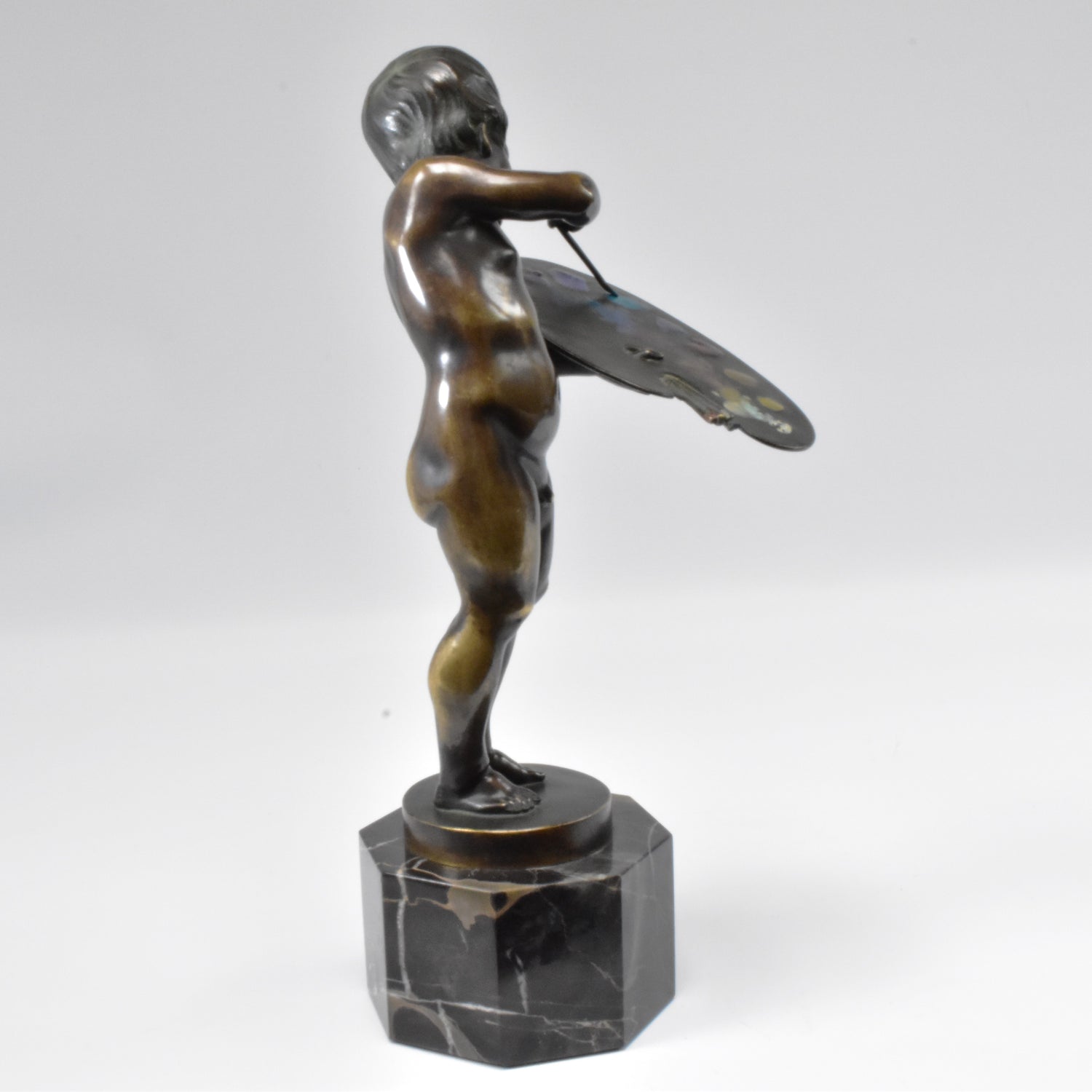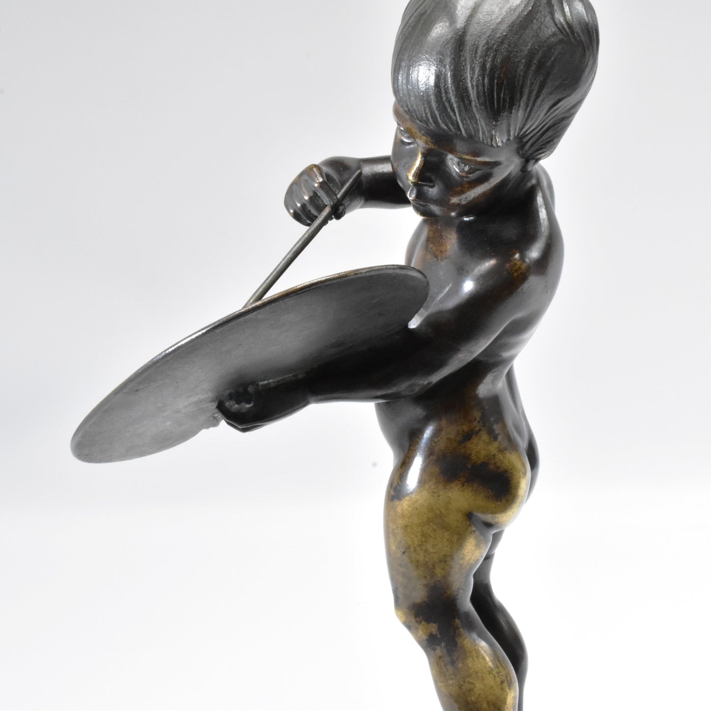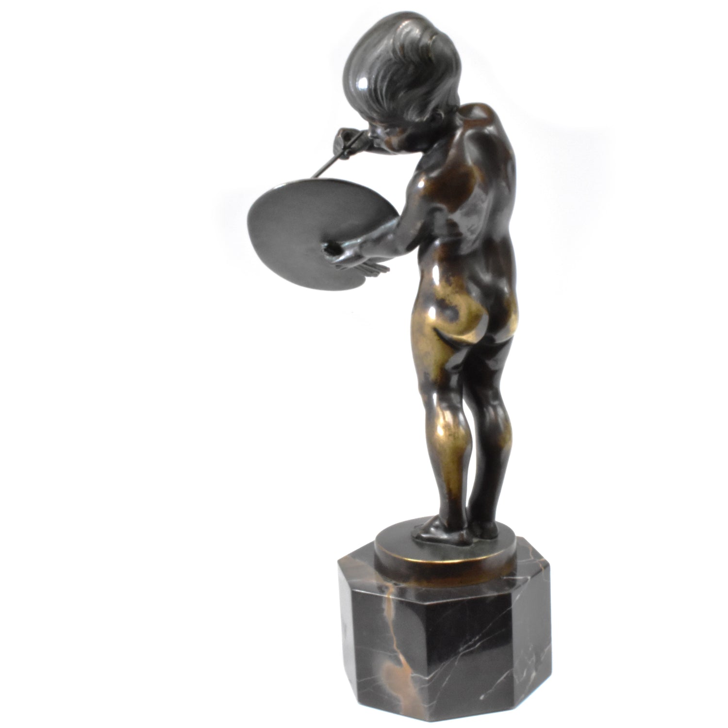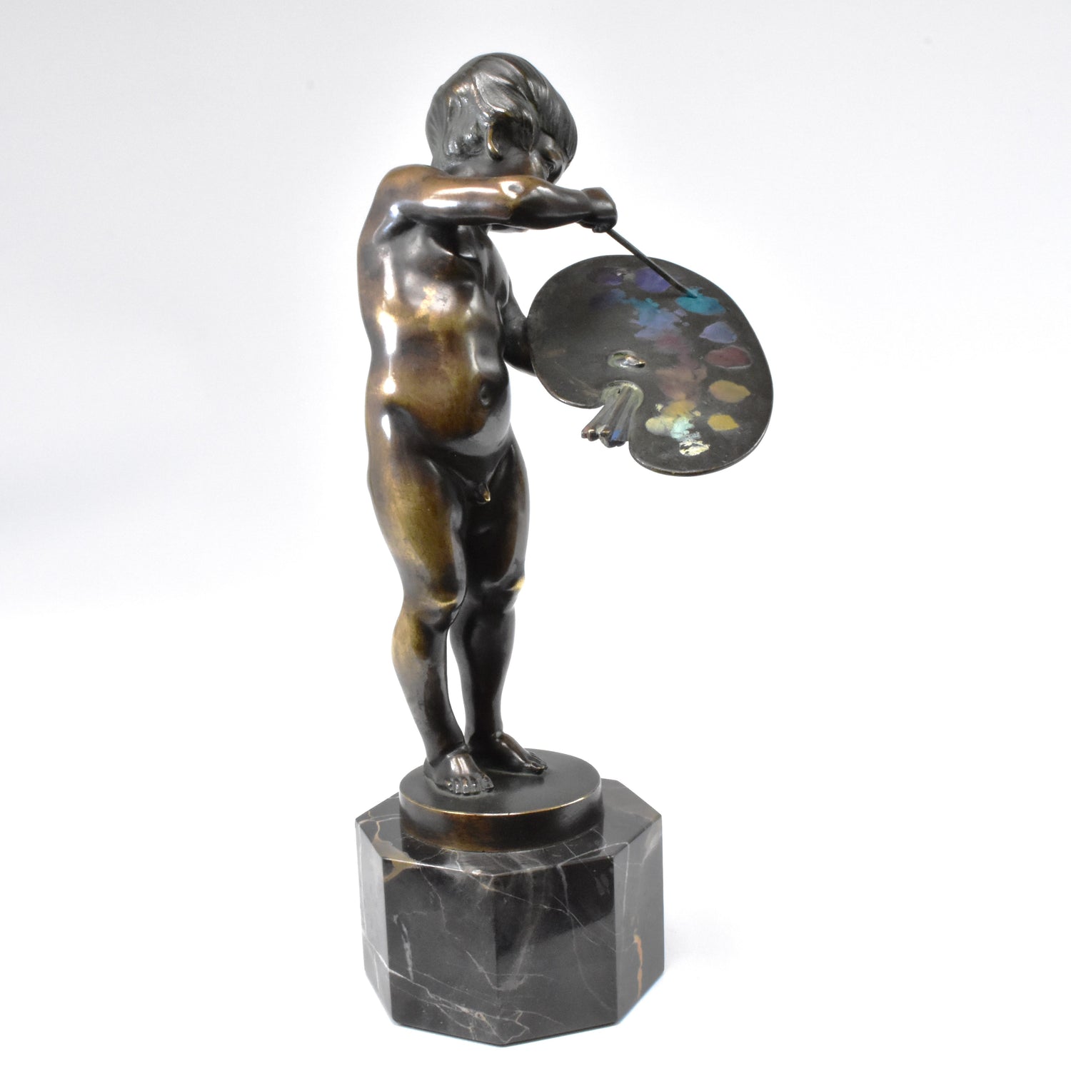 Bronzen beeld van een jongetje dat zich niet laat afleiden van zijn intensieve artistieke bezigheden. Met verve mengt hij zijn palet. De houding is typisch voor de kunstenaar die met een draai in zijn hele lichaam zich van het doek op zijn ezel wendt naar de verf die bovenaan op het palet gemengd moet worden. Geloof me ik kan het weten. Ongelofelijk dat dit prachtige beeldje niet gesigneerd is. We kunnen het wel plaatsen eind 19e eeuw in zuid Duitsland of Oostenrijk.
