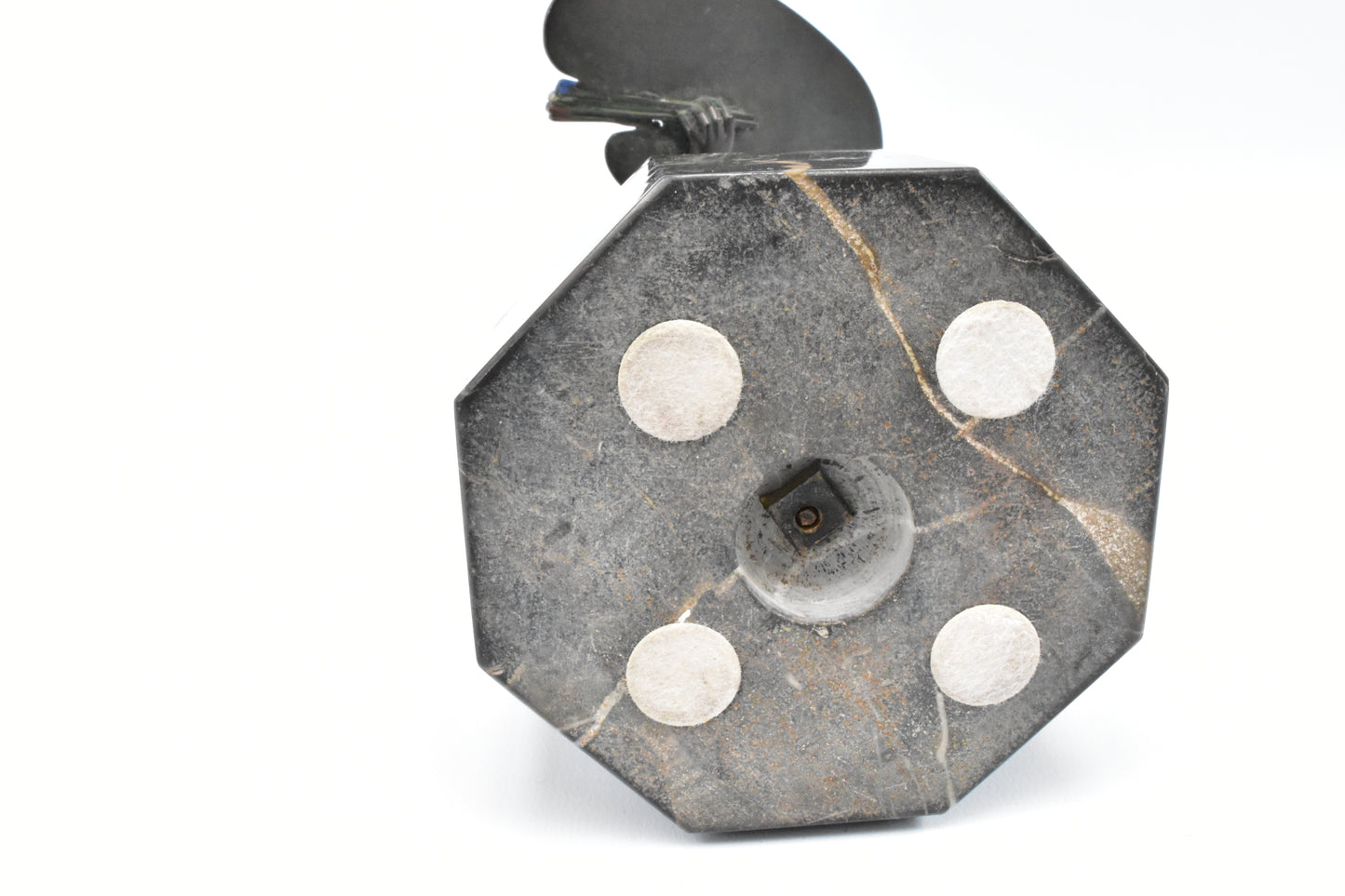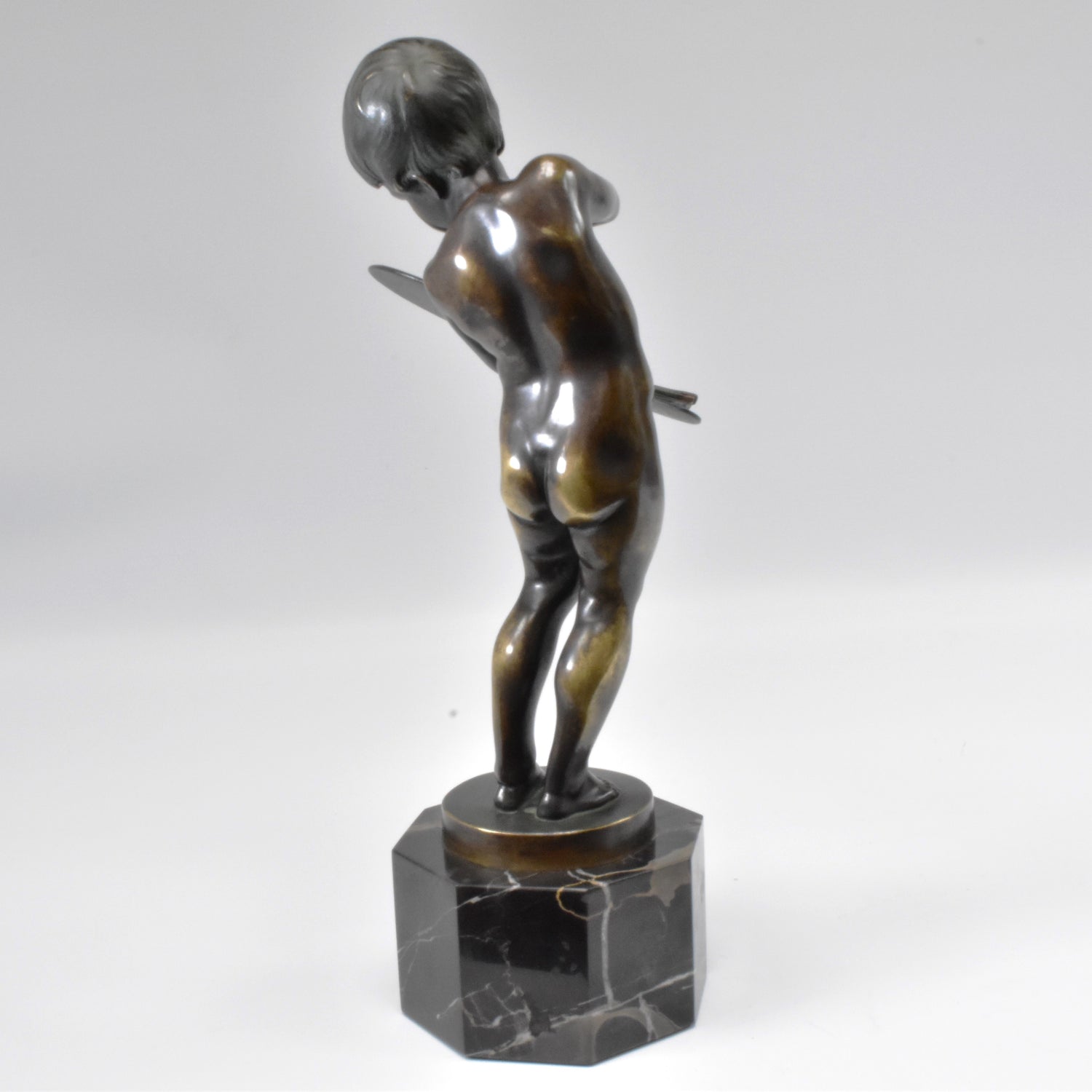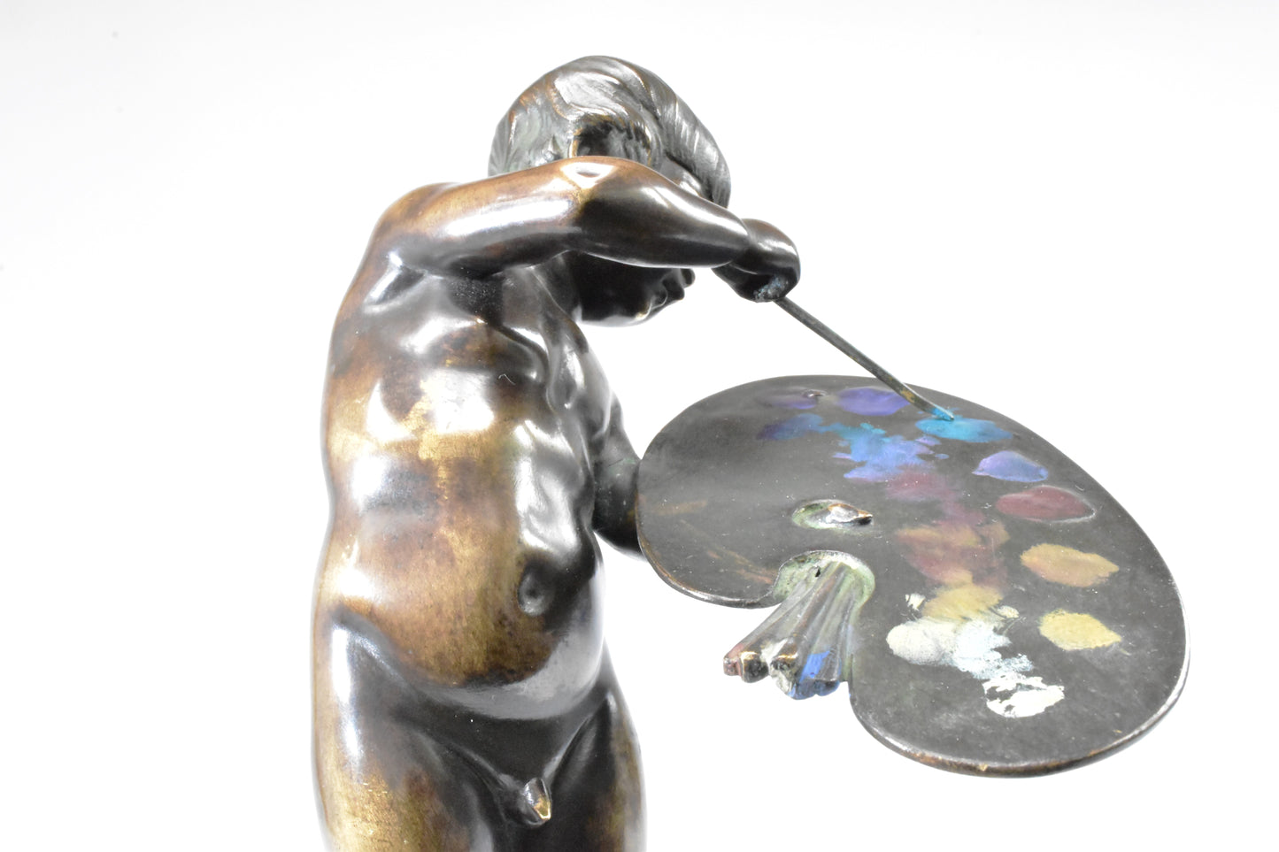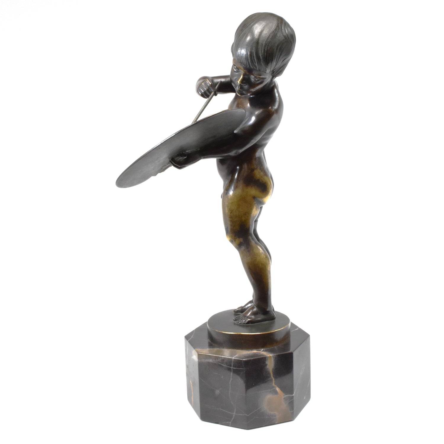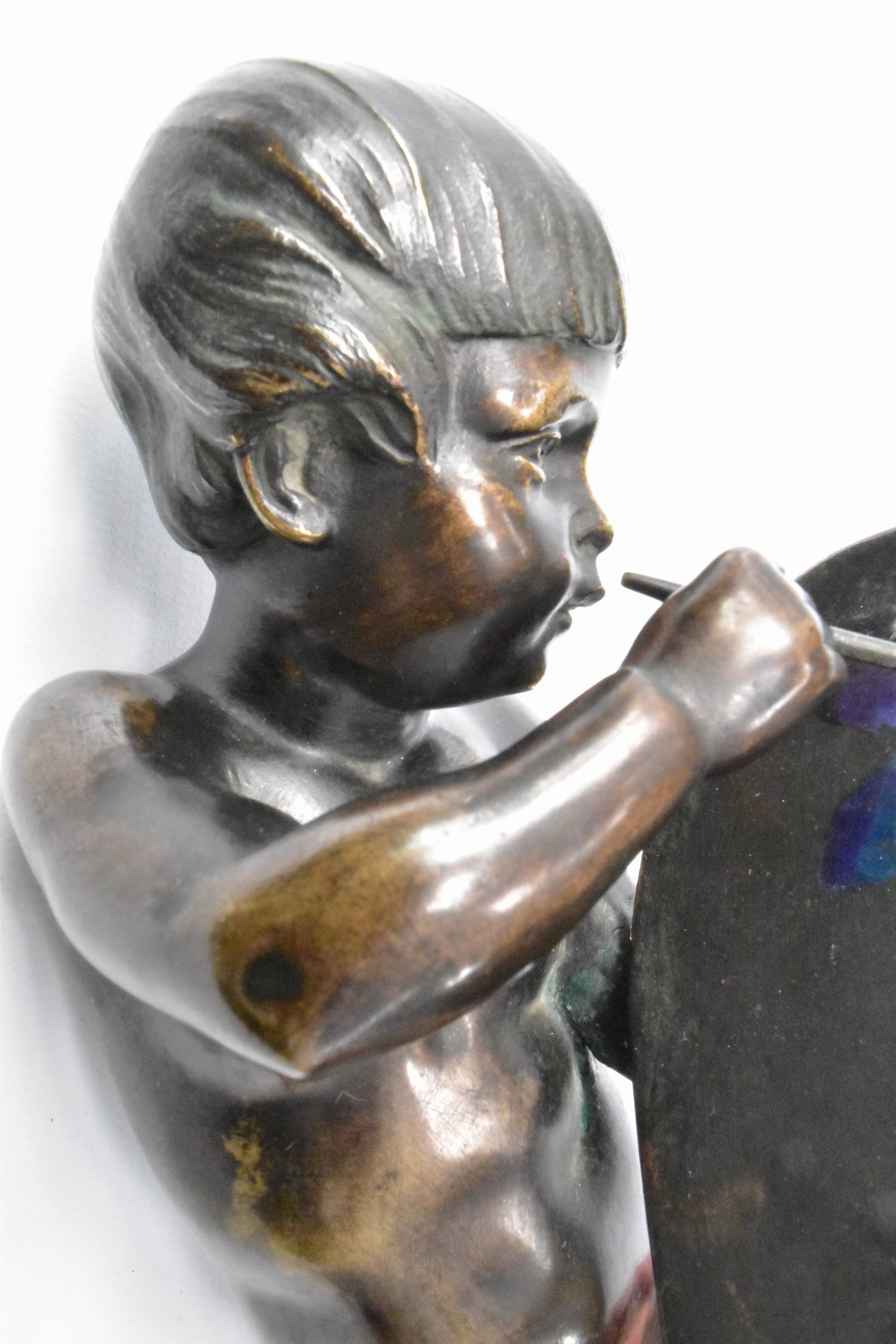 Bronzen beeld van een jongetje dat zich niet laat afleiden van zijn intensieve artistieke bezigheden. Met verve mengt hij zijn palet. De houding is typisch voor de kunstenaar die met een draai in zijn hele lichaam zich van het doek op zijn ezel wendt naar de verf die bovenaan op het palet gemengd moet worden. Geloof me ik kan het weten. Ongelofelijk dat dit prachtige beeldje niet gesigneerd is. We kunnen het wel plaatsen eind 19e eeuw in zuid Duitsland of Oostenrijk.