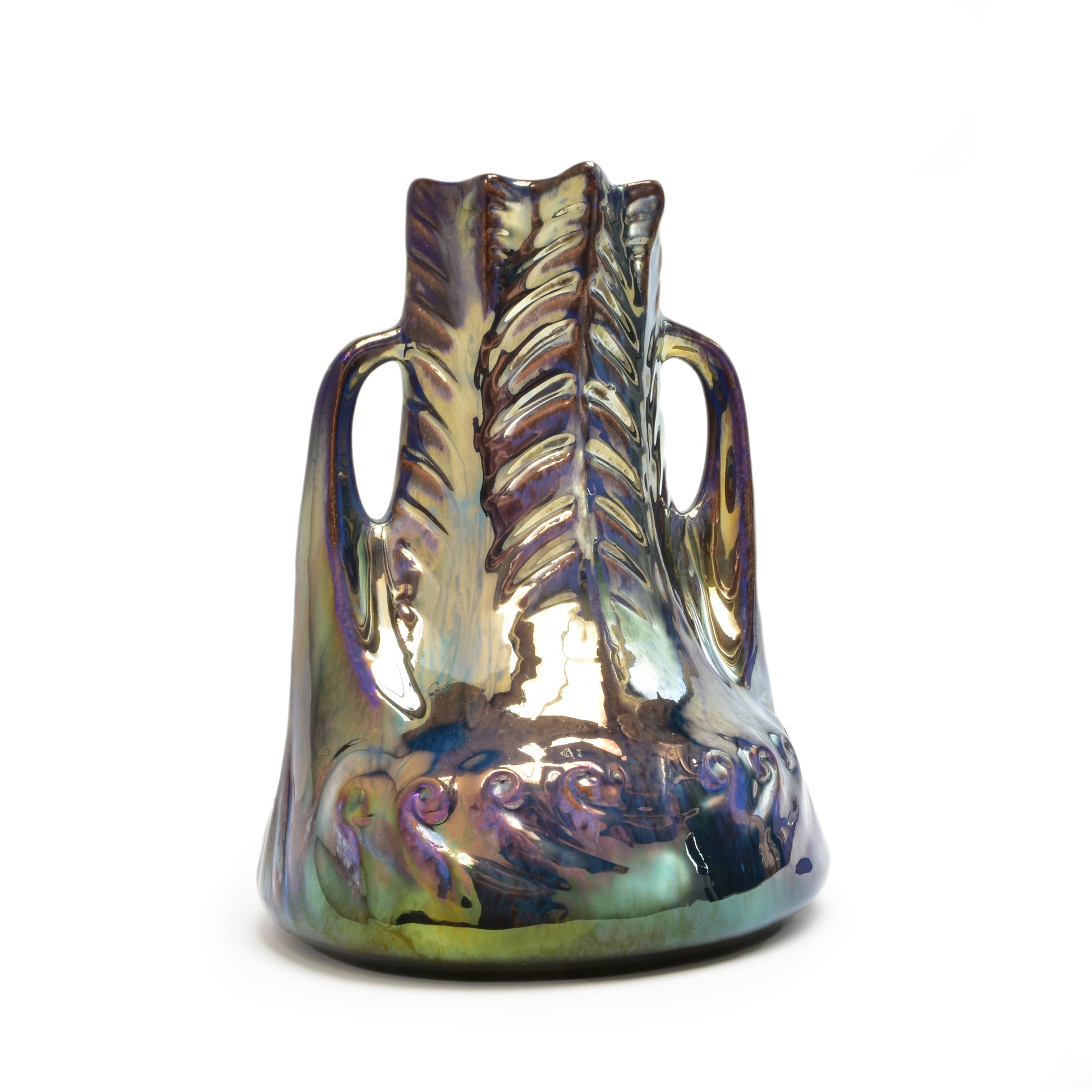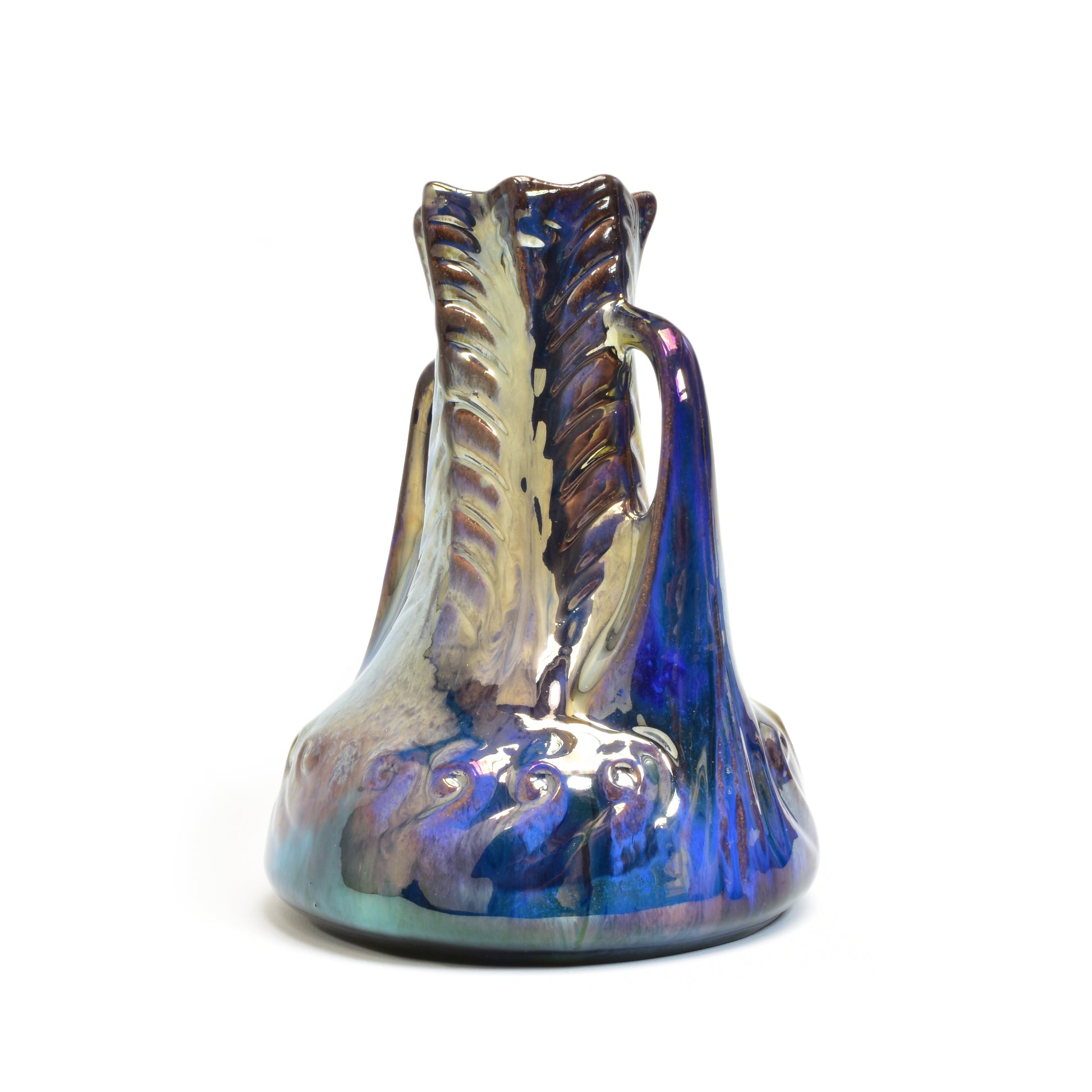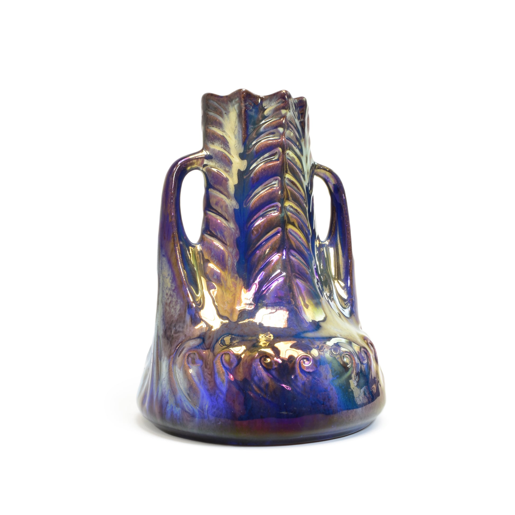 A Rambervillers dans les Vosges, on fabriquait des céramiques à glaçure lustrée à effet métallique. Cela produit de magnifiques effets de couleurs et de reflets de lumière. Ce modèle a été conçu et signé par Louis Majorelle, ce qui rend ce vase très spécial. Le décor est des fougères. Mais pas une image réaliste des fougères, mais plutôt la structure organique et l'inflorescence de la fougère. C'est comme si Majorelle voulait capturer le caractère et l'âme de la fougère, au-delà de son apparence extérieure.