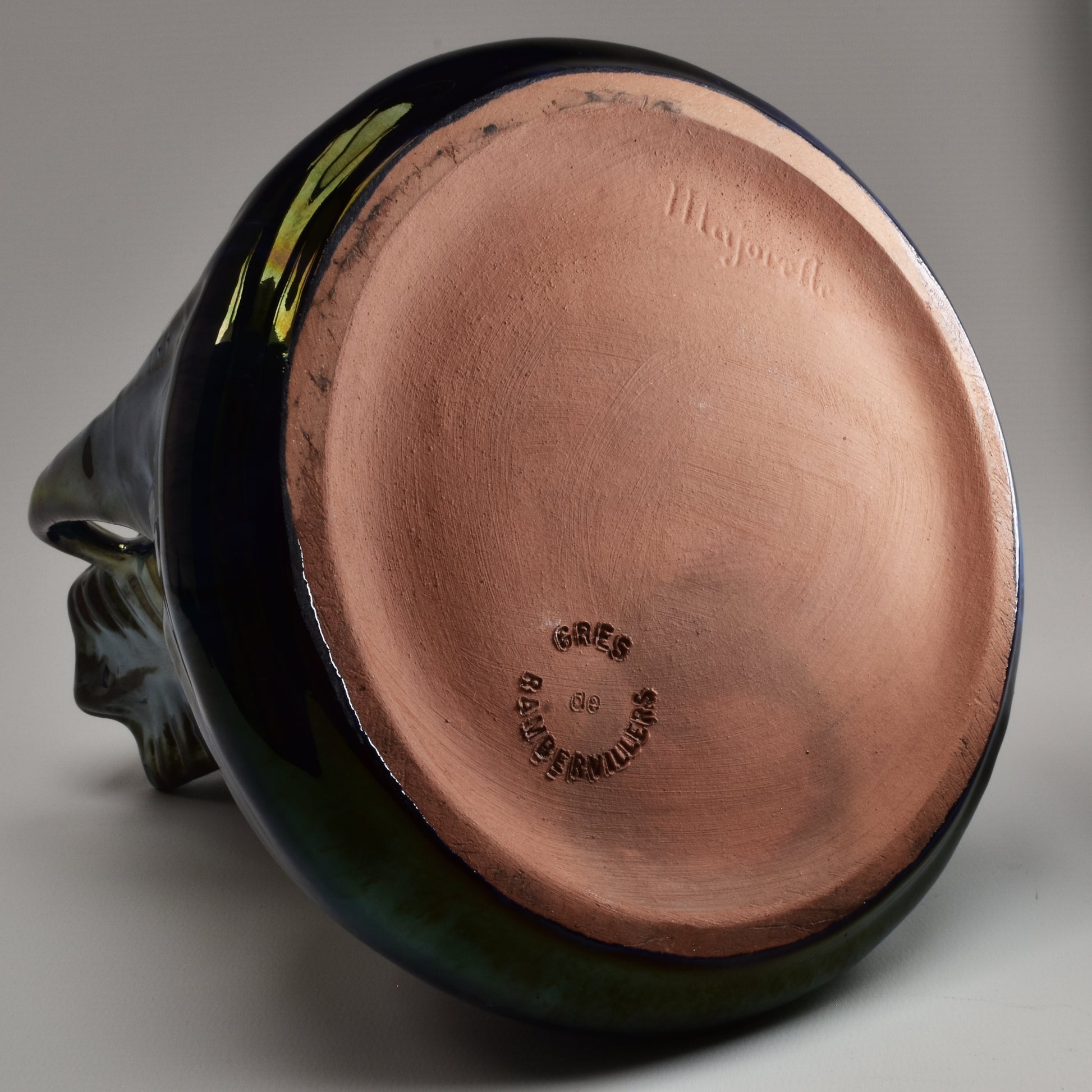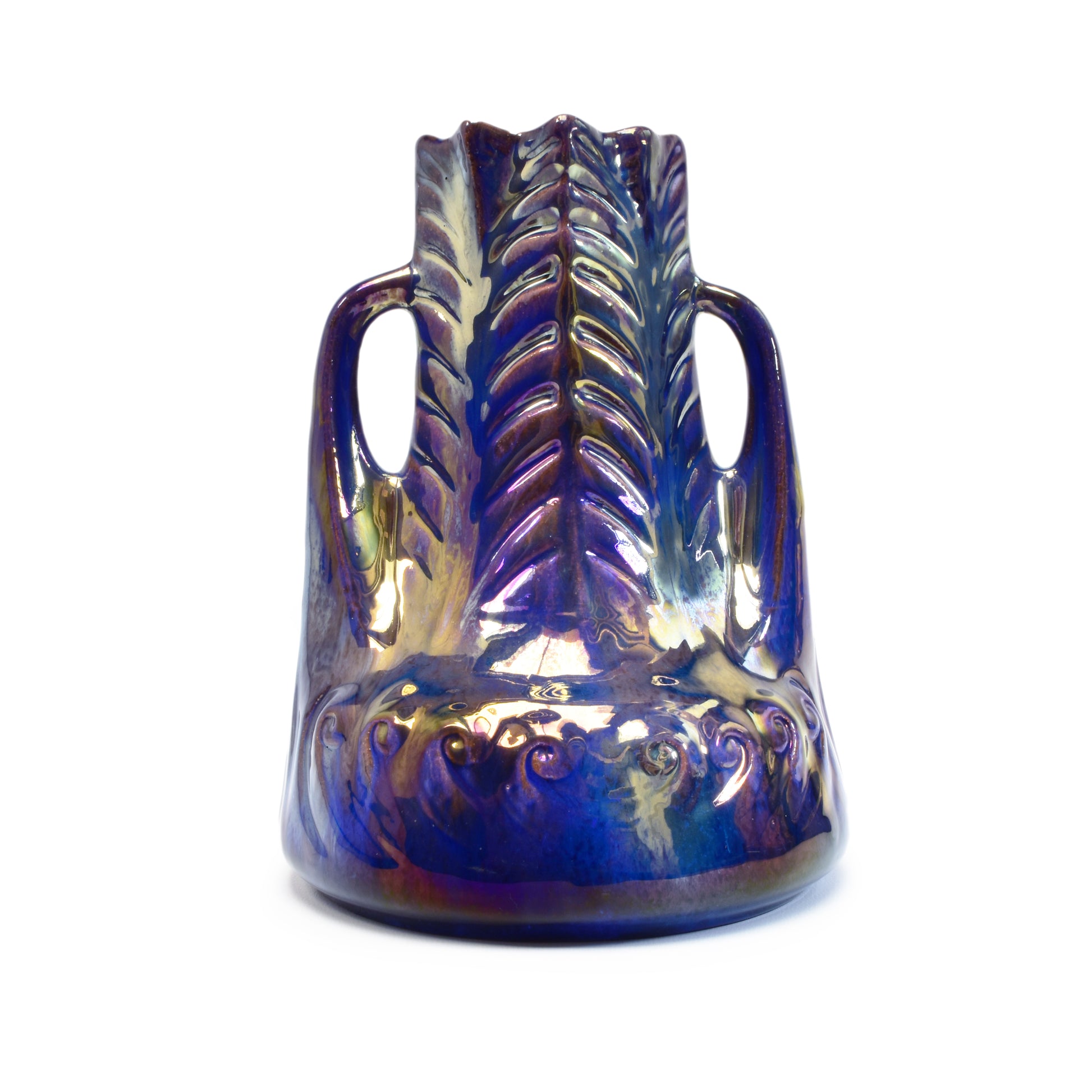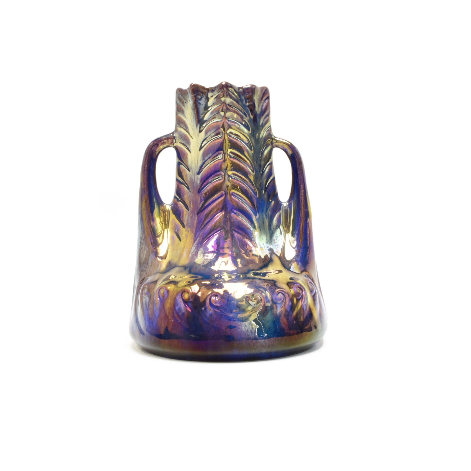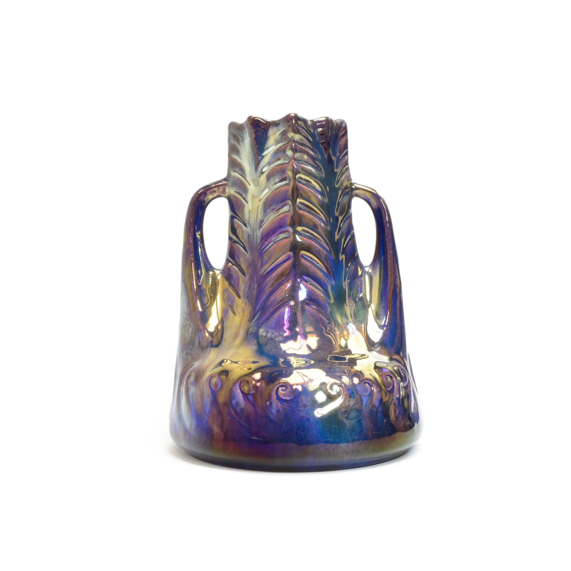 A Rambervillers dans les Vosges, on fabriquait des céramiques à glaçure lustrée à effet métallique. Cela produit de magnifiques effets de couleurs et de reflets de lumière. Ce modèle a été conçu et signé par Louis Majorelle, ce qui rend ce vase très spécial. Le décor est des fougères. Mais pas une image réaliste des fougères, mais plutôt la structure organique et l'inflorescence de la fougère. C'est comme si Majorelle voulait capturer le caractère et l'âme de la fougère, au-delà de son apparence extérieure.