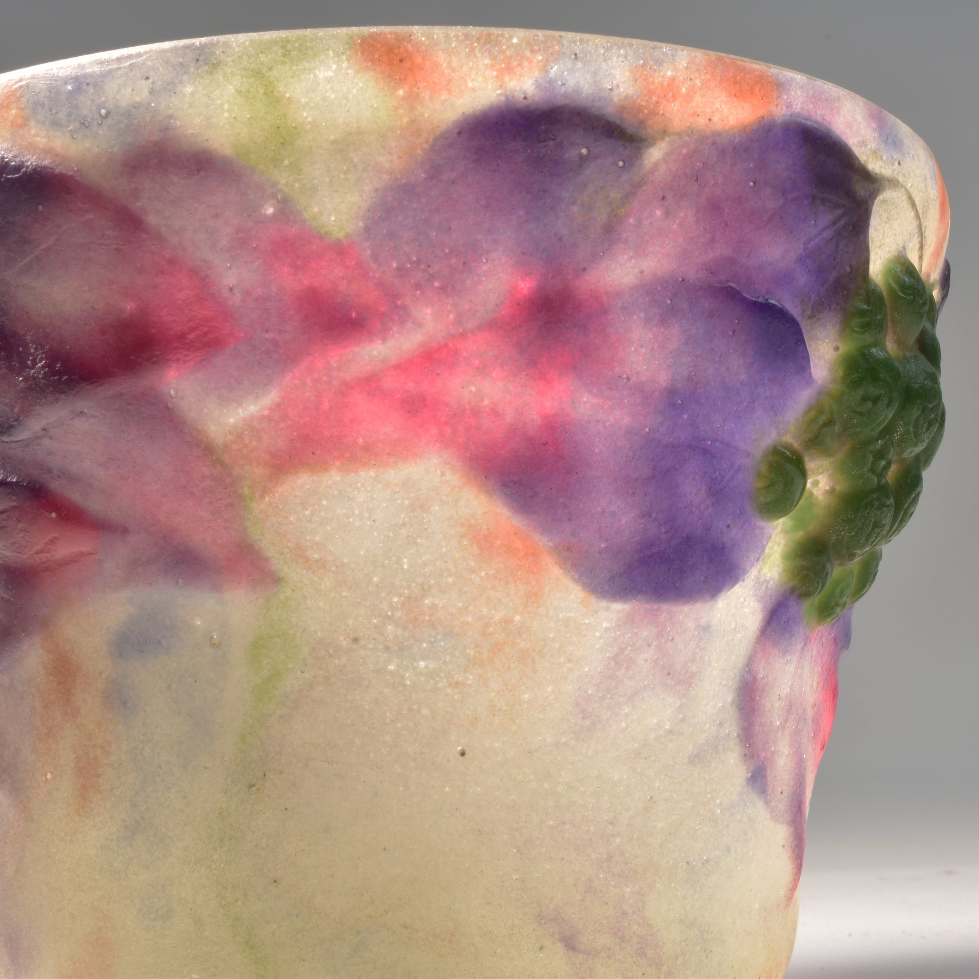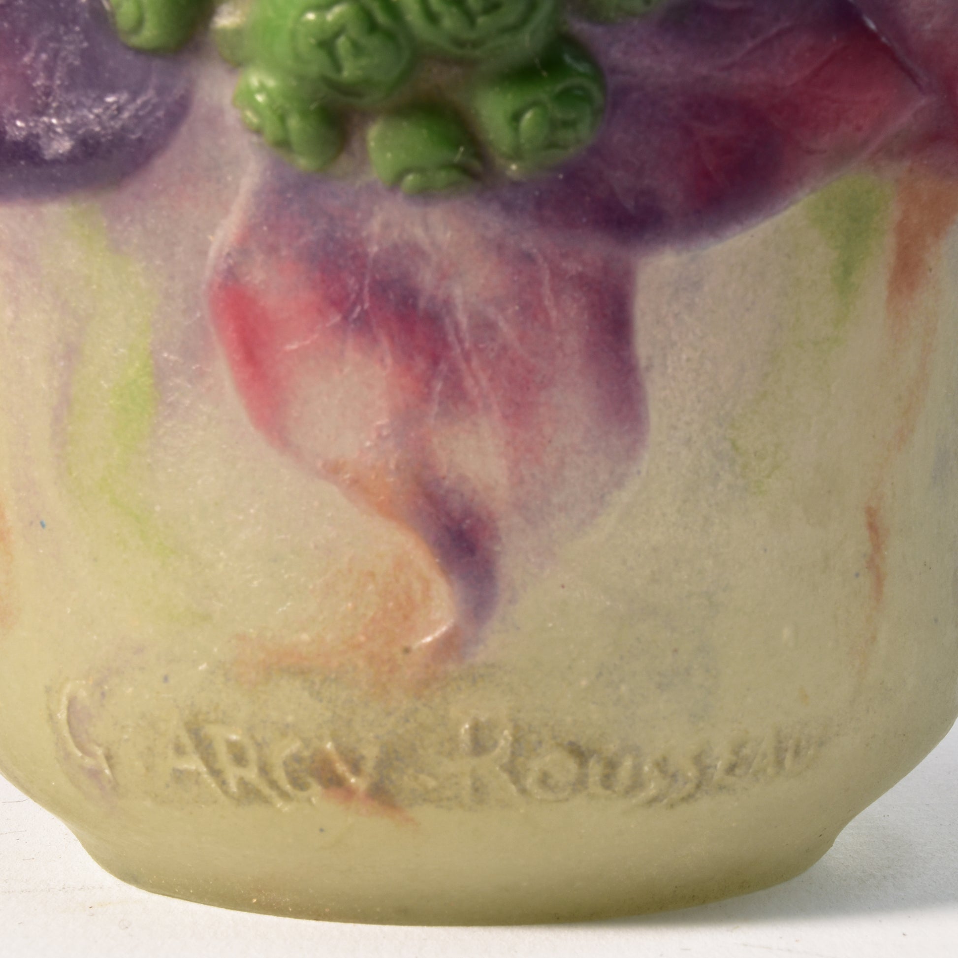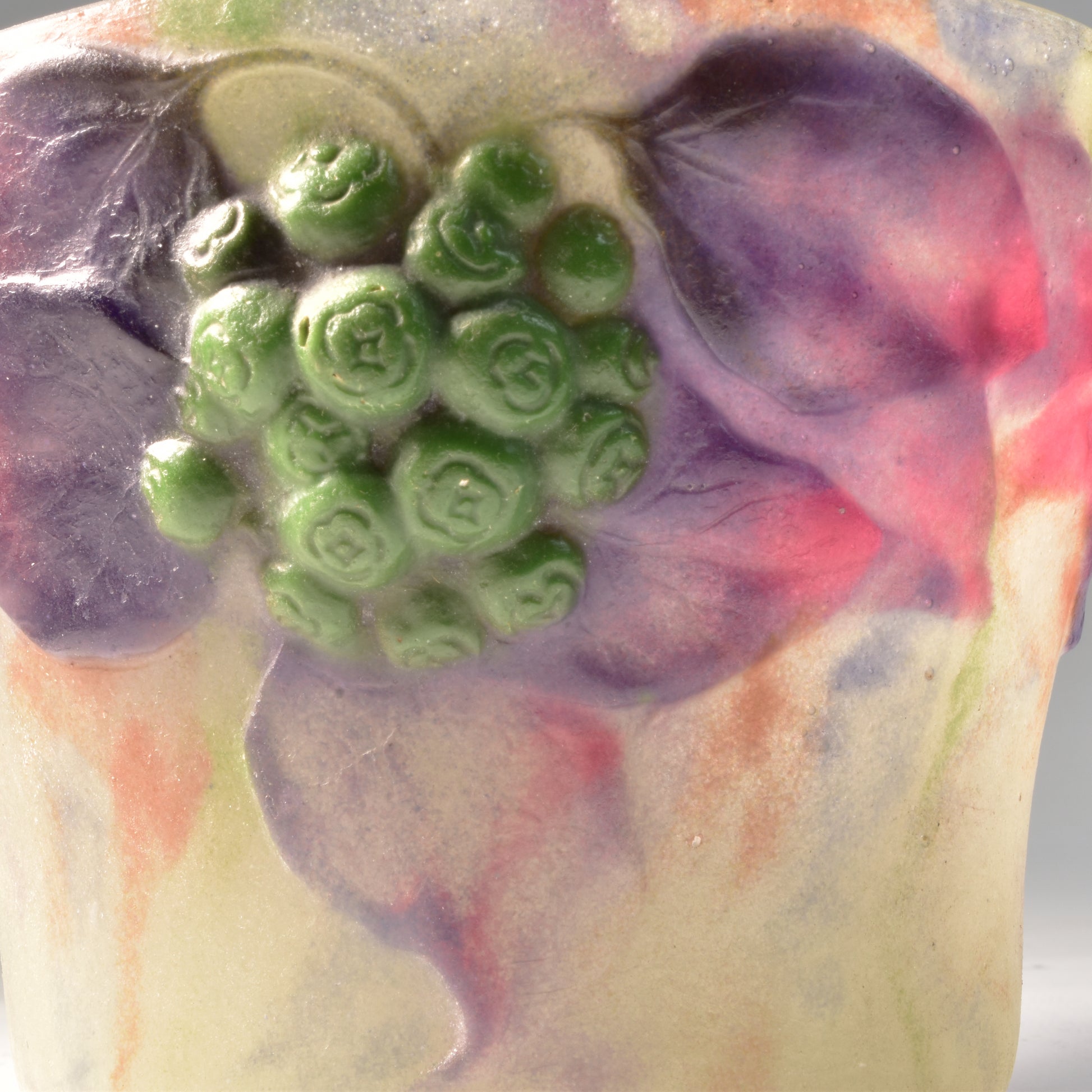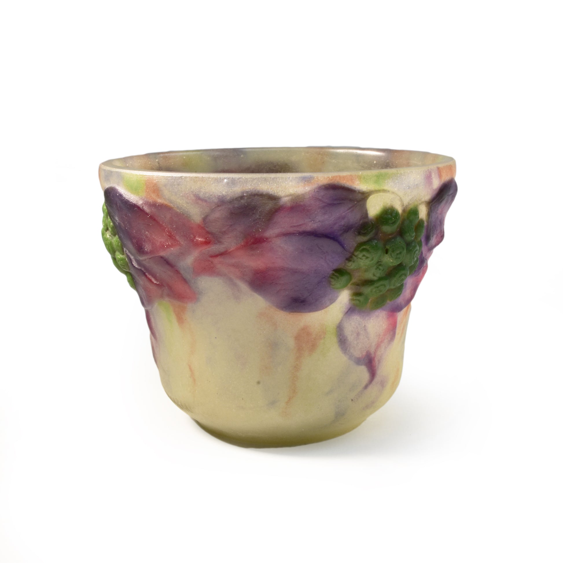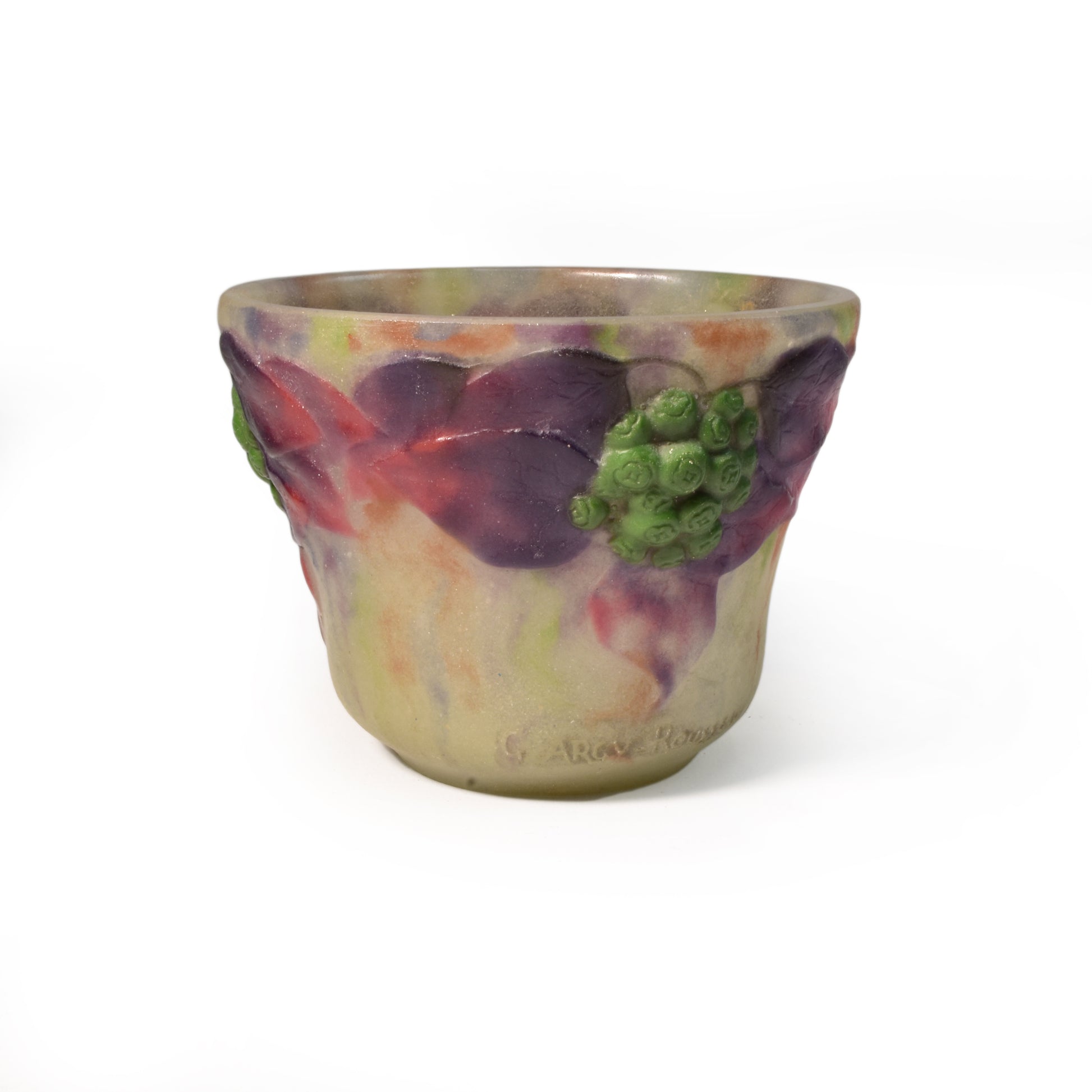 En 1919 Gabriel produit 8 modèles différents. Ce bol en fait partie. Belles couleurs. La Pâte de foute est assez fine, laissant passer beaucoup de lumière. Sauf le vert des chemisiers, car il est opaque, ce qui crée un contraste et une richesse supplémentaire de la matière. Le décor est un lierre en fleurs, toujours stylisé et réaliste, mais le choix des couleurs est purement abstrait.