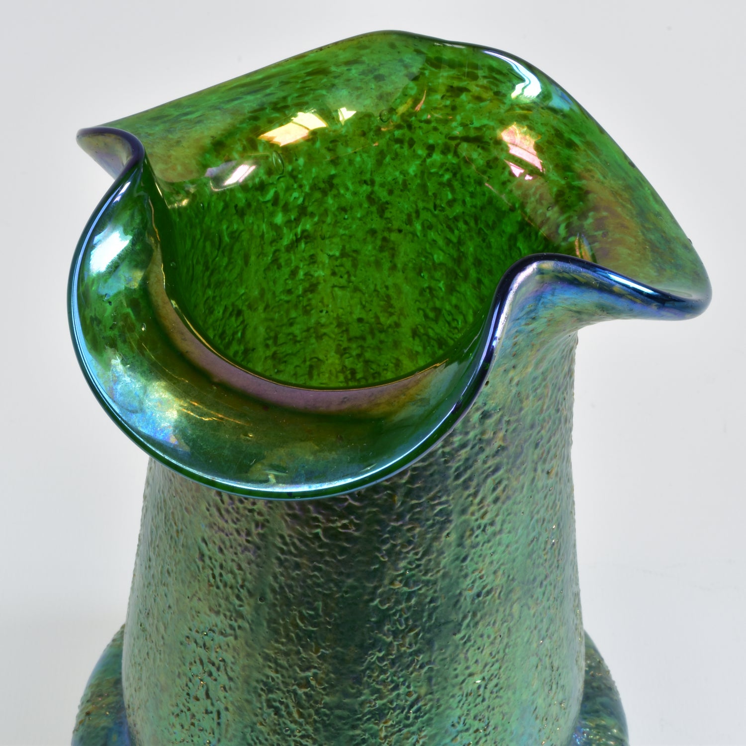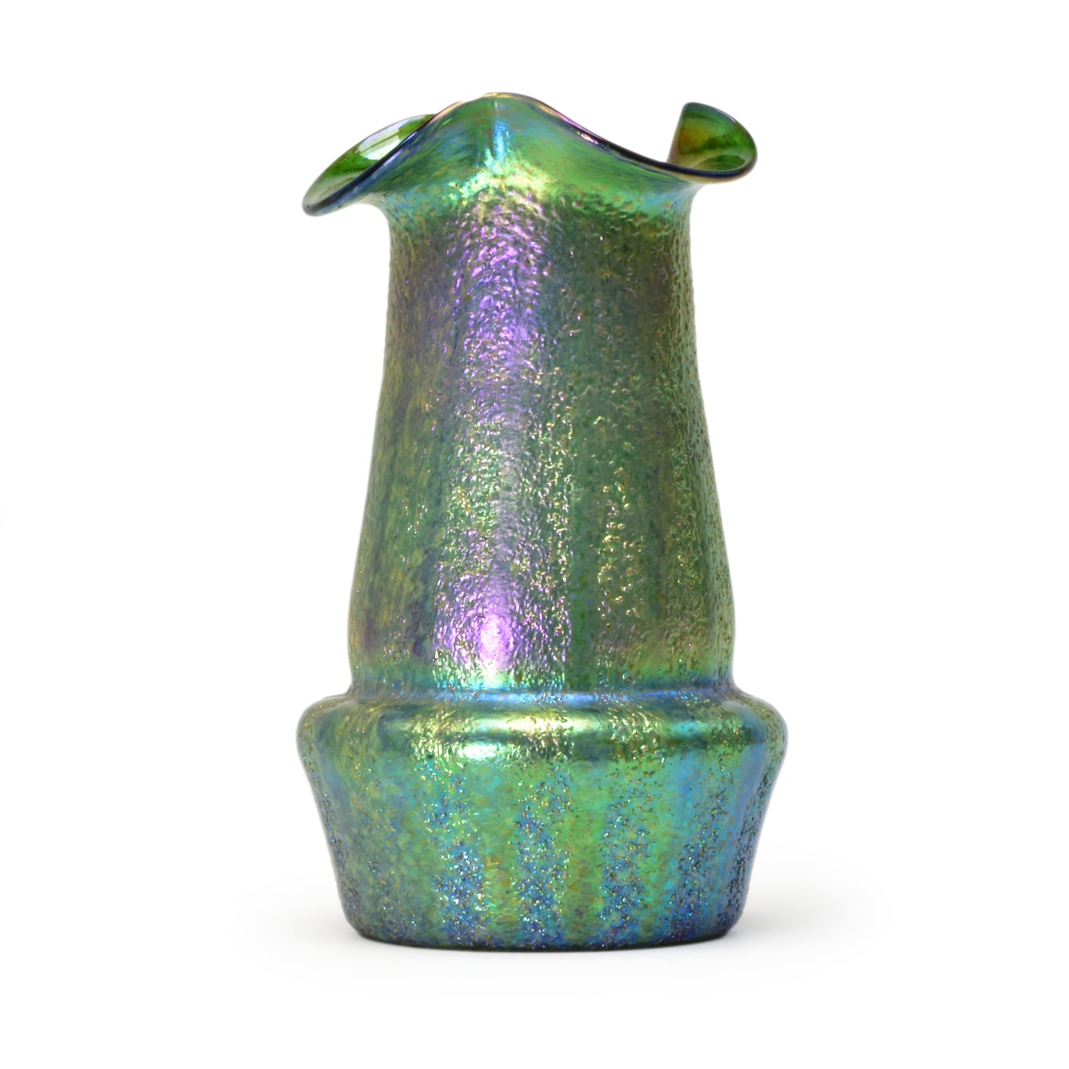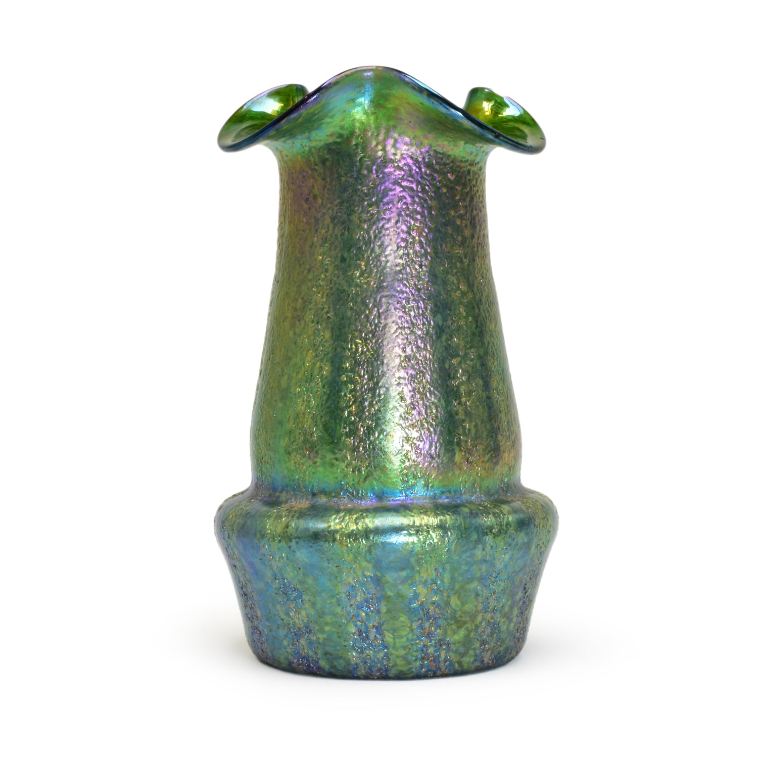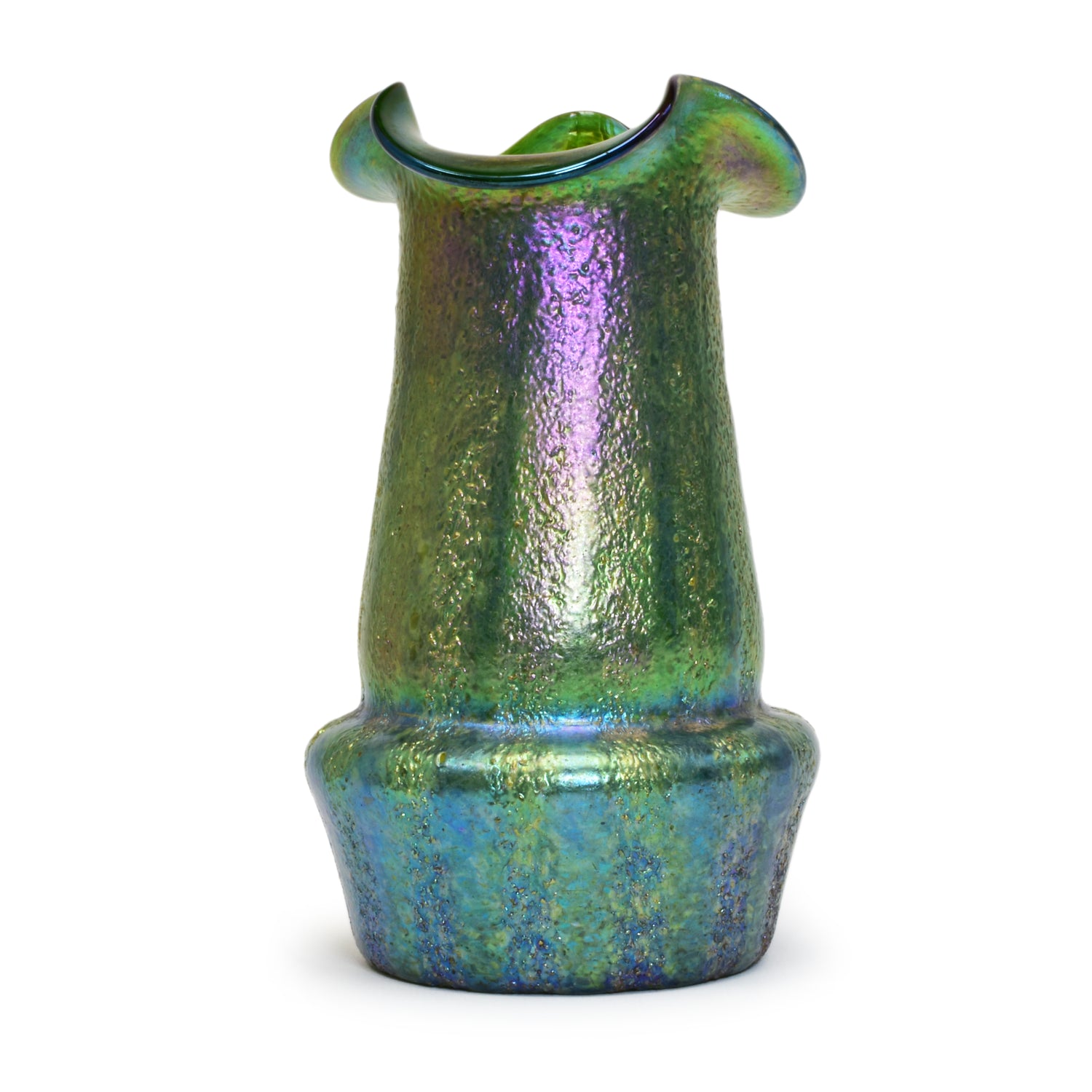 Verre de Bohême de Kralik. Belle technique avec des bandes de silberkrösel roulées. Fort effet irisé, col lobé. La base du vase est principalement bleue et verte, et au-dessus des hanches du vase on voit du violet et de l'or sur du vert.