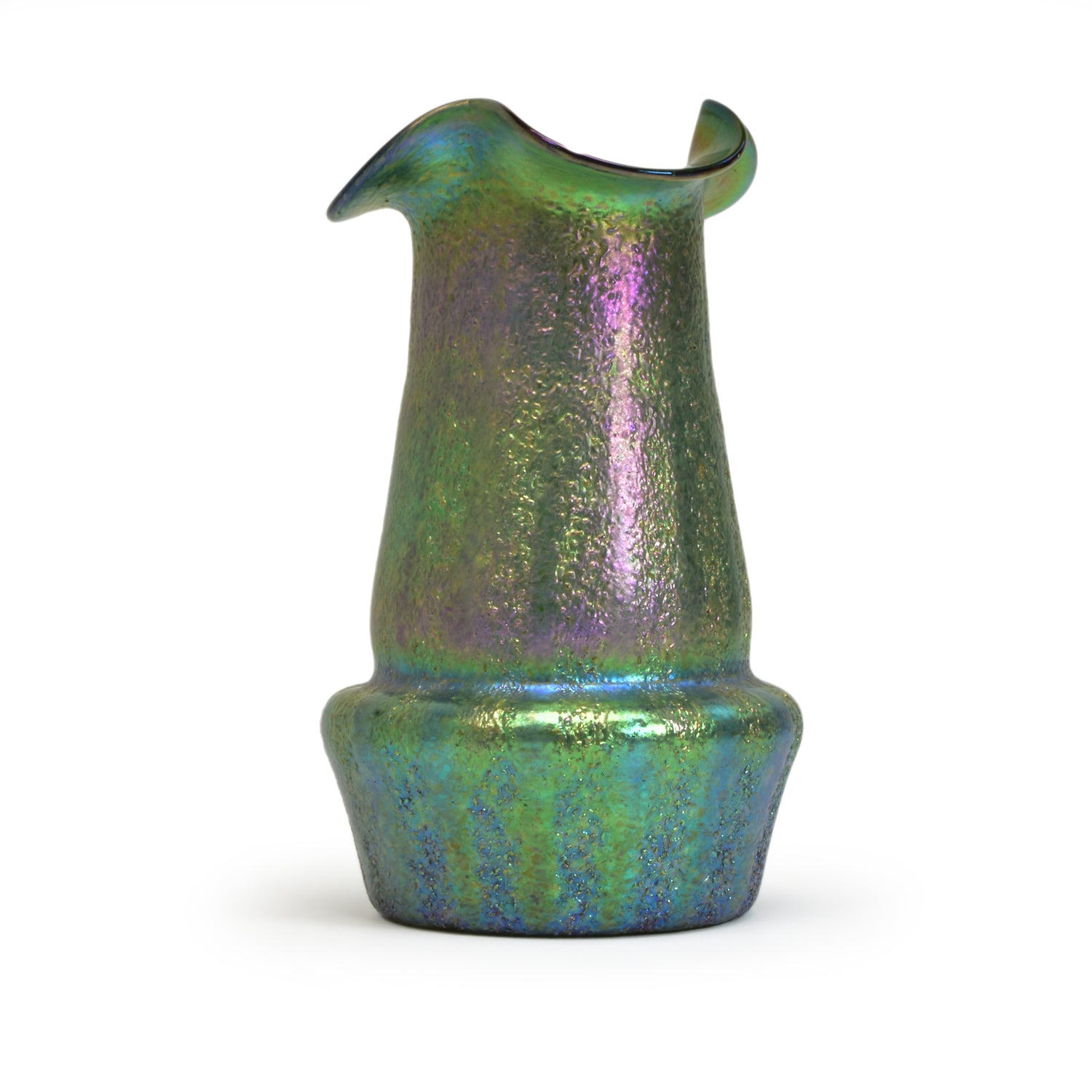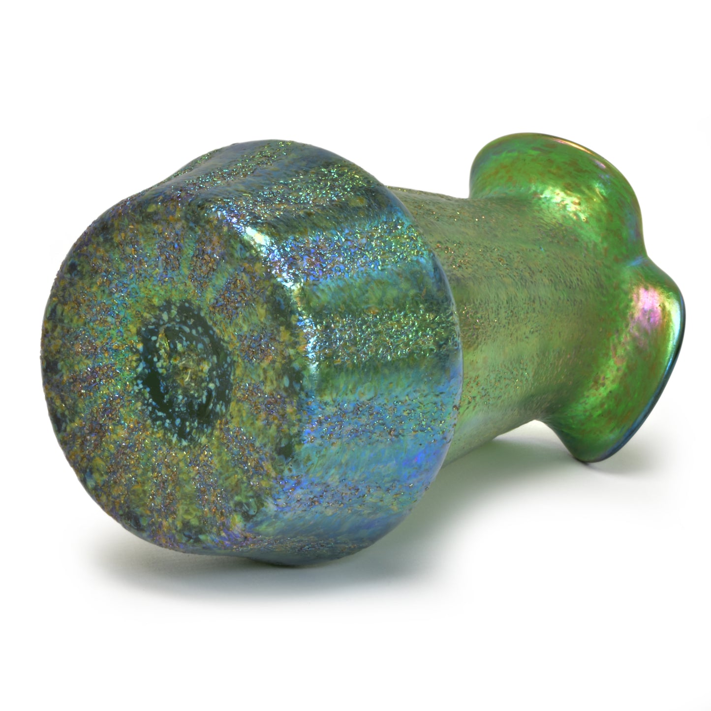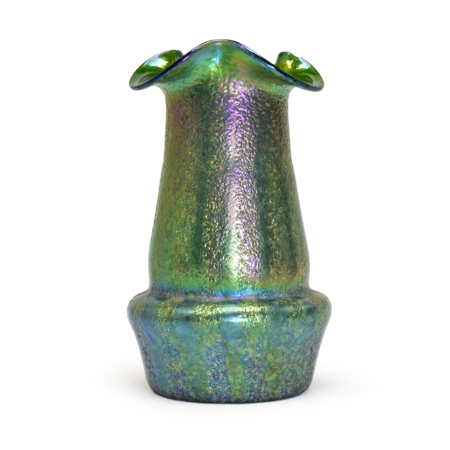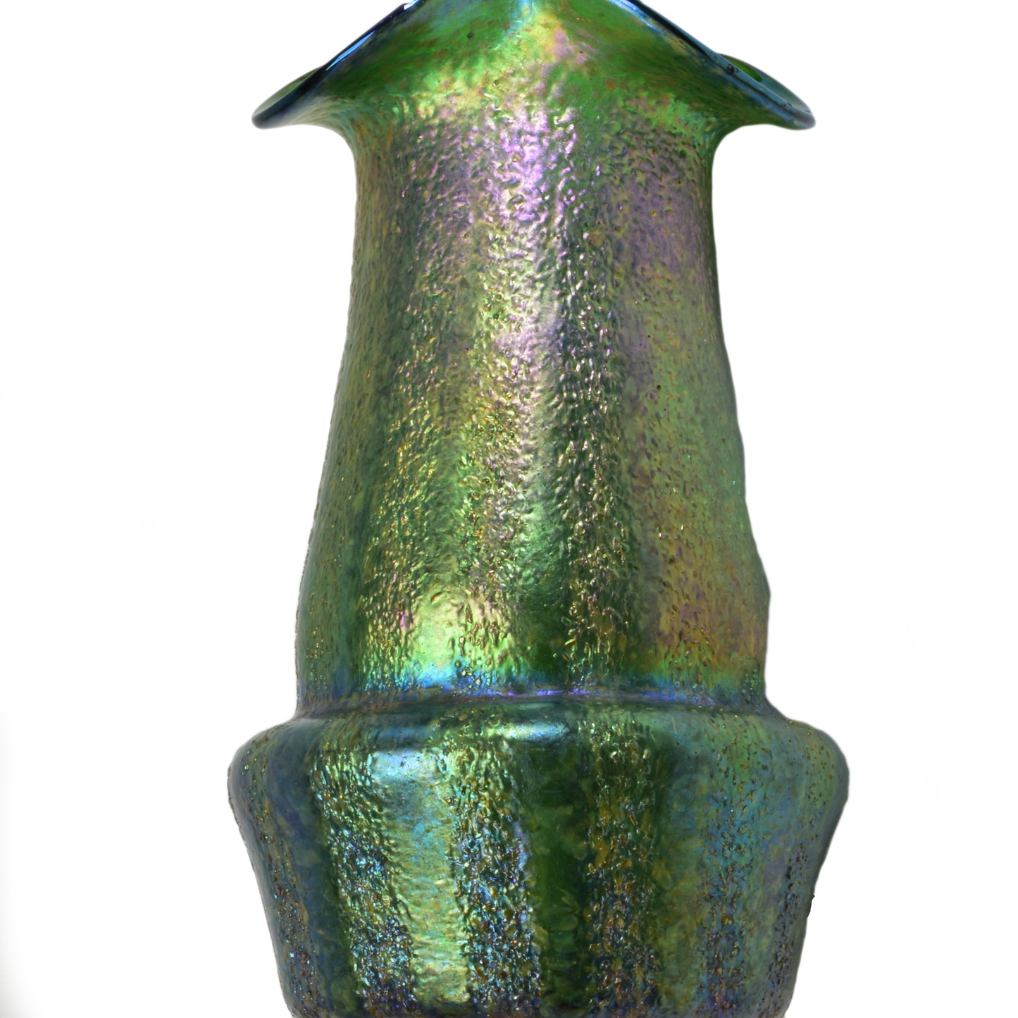 Verre de Bohême de Kralik. Belle technique avec des bandes de silberkrösel roulées. Fort effet irisé, col lobé. La base du vase est principalement bleue et verte, et au-dessus des hanches du vase on voit du violet et de l'or sur du vert.