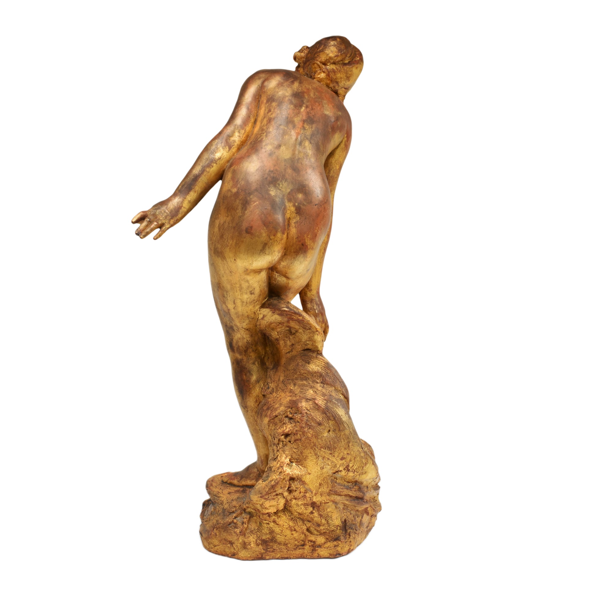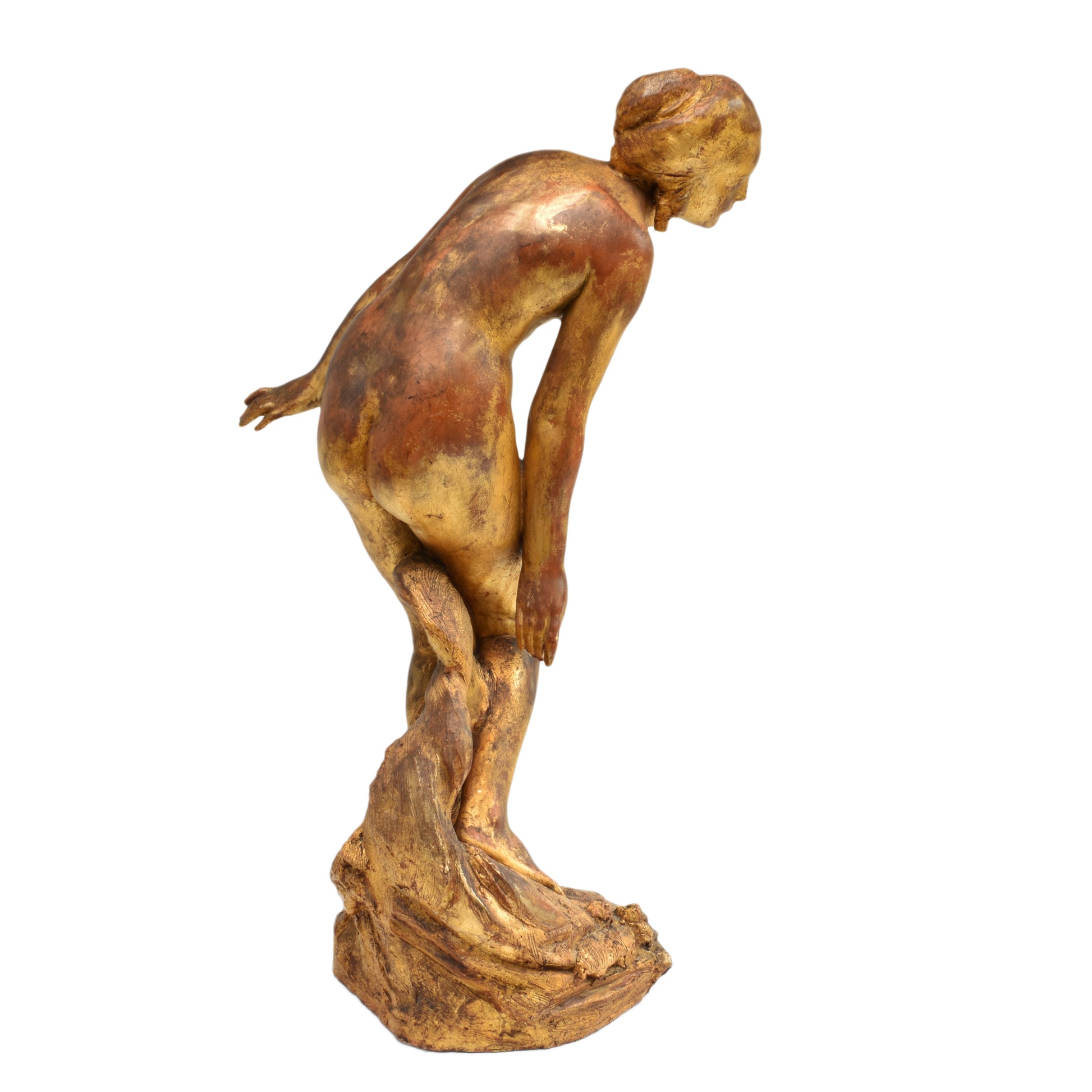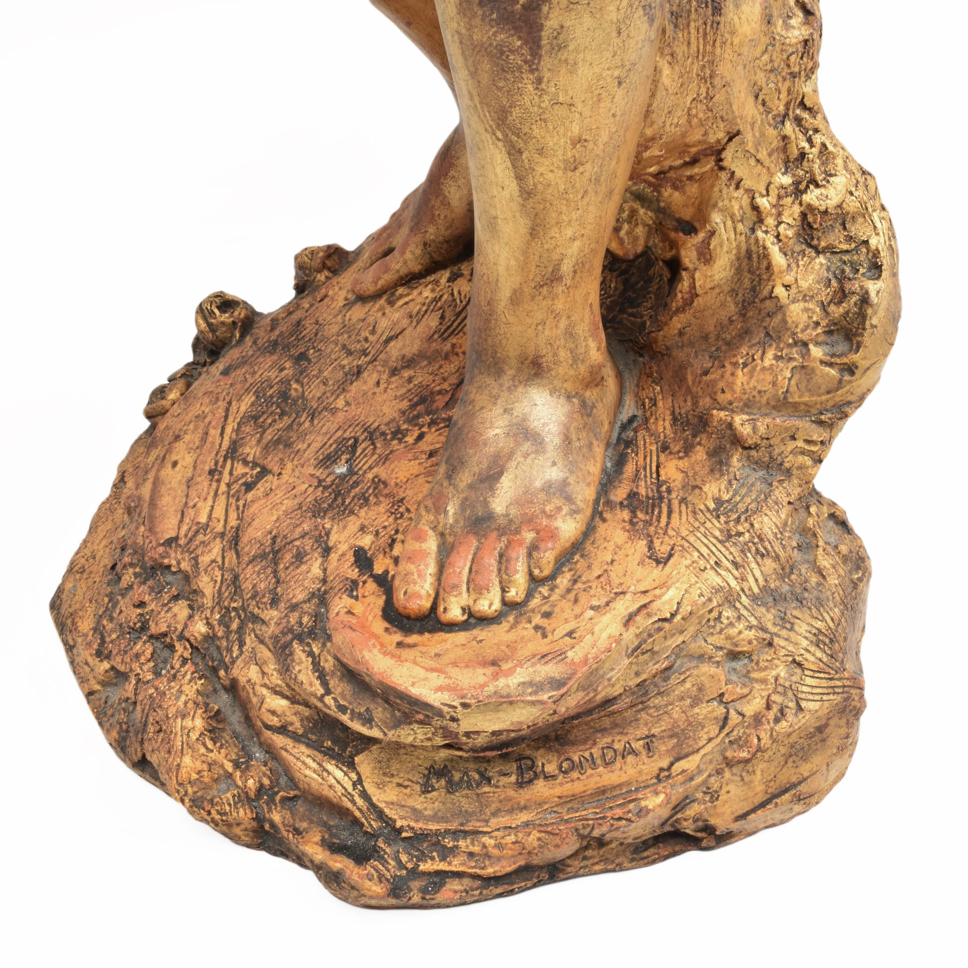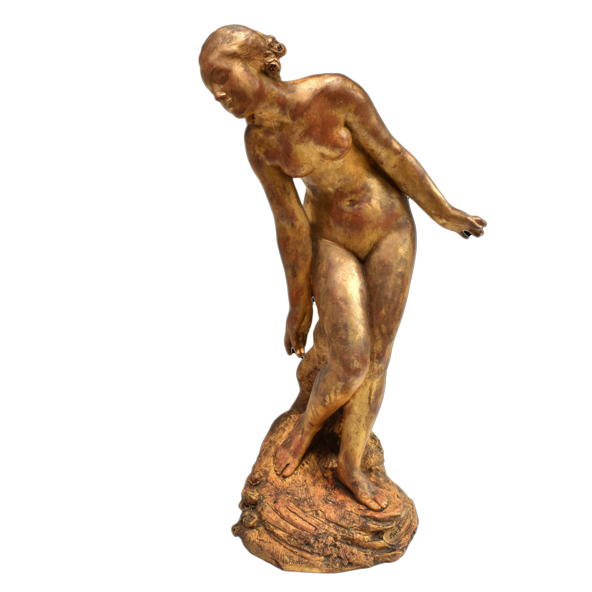 D'un mouvement gracieux, elle attrape une rose qui pousse à son pied. Elle en a déjà mis quelques-uns dans ses cheveux, cette baigneuse fraîchement lavée. Ajoutez à cela l'odeur des roses et vous êtes là où elle se trouve, au paradis. Statue en terre cuite dorée et patinée par l'âge du célèbre artiste Max Blondat.