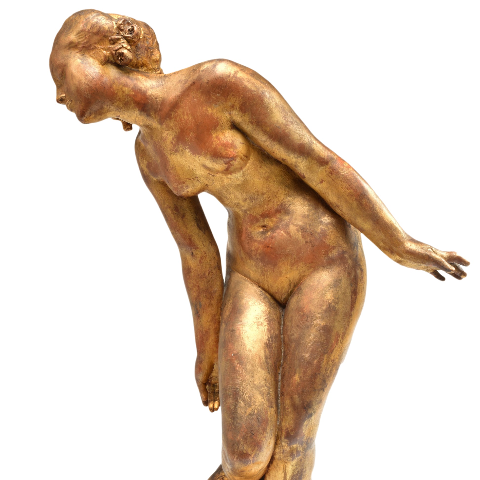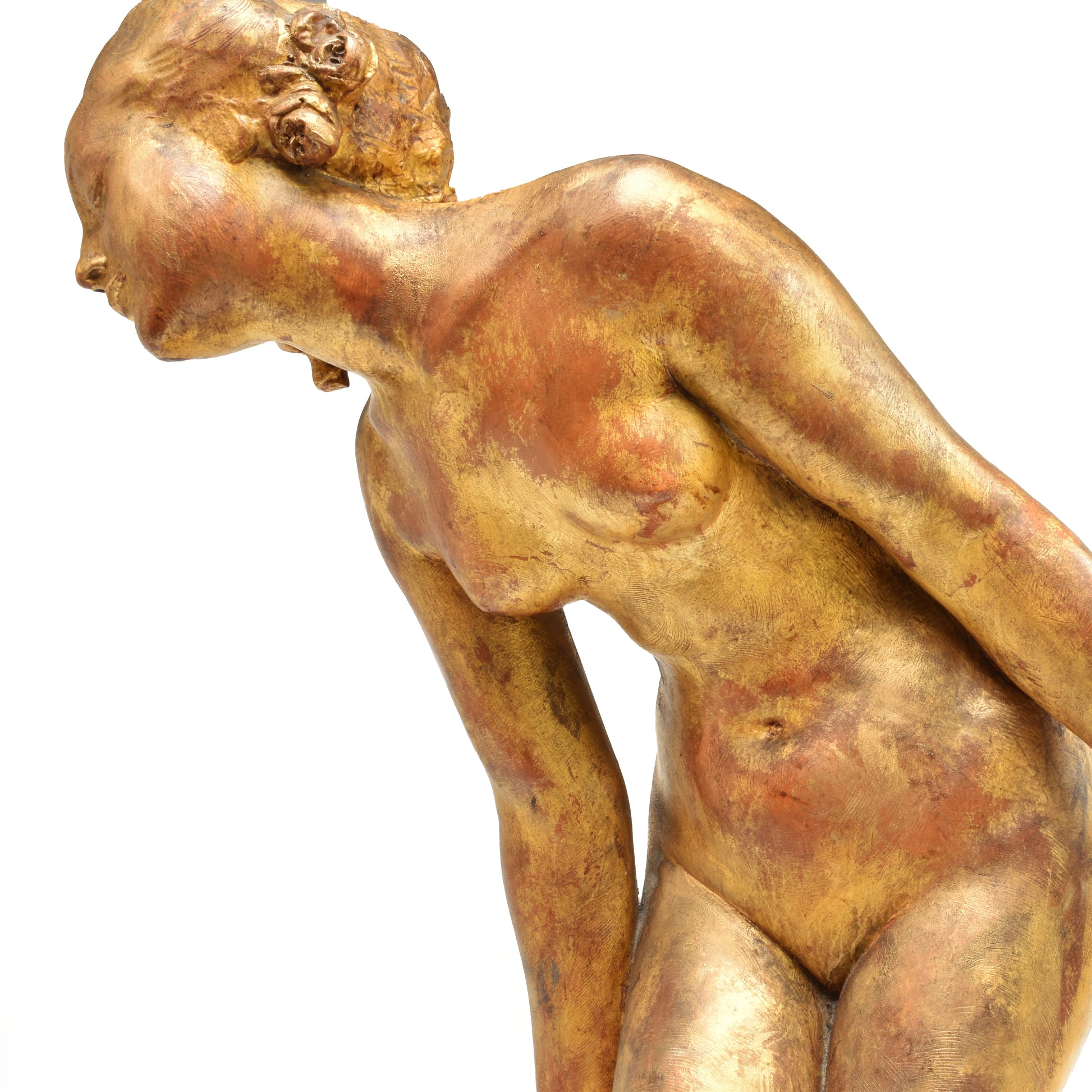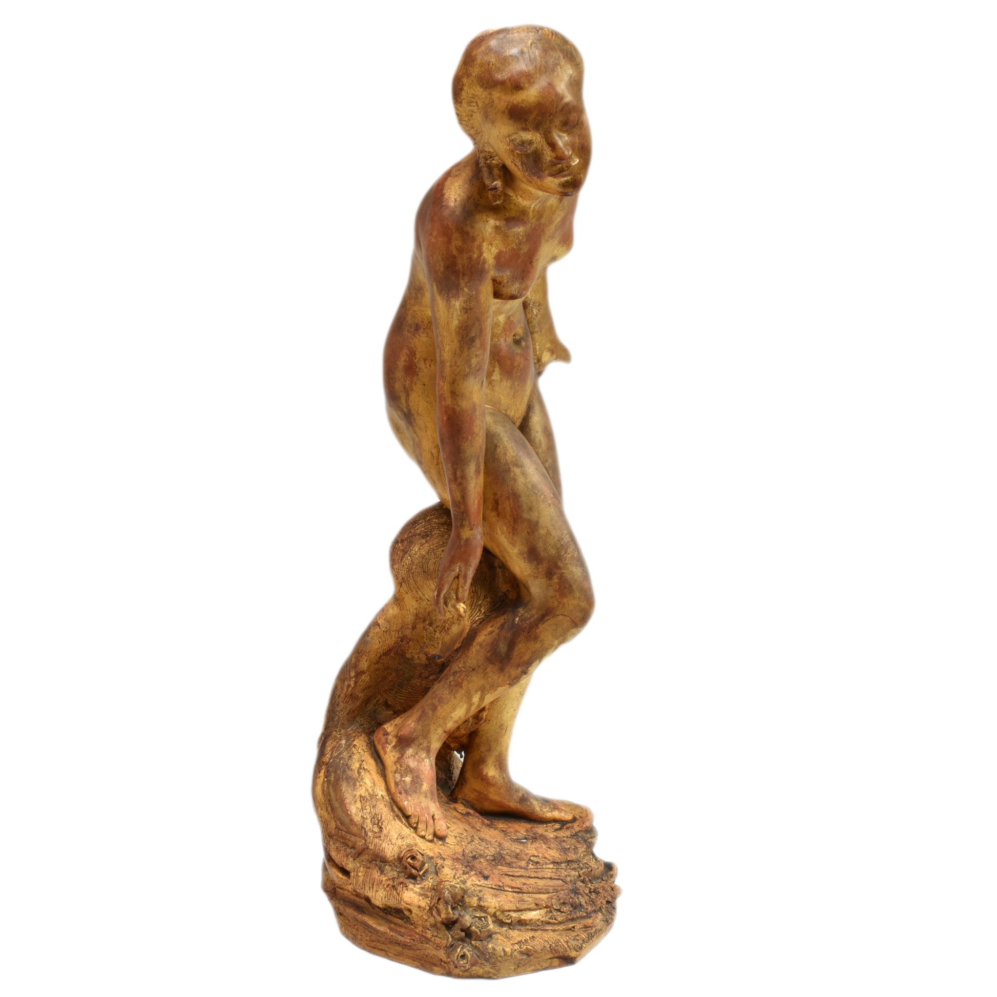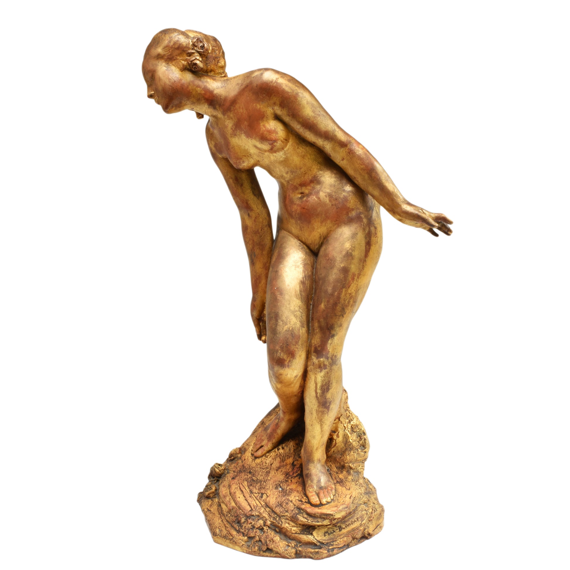 D'un mouvement gracieux, elle attrape une rose qui pousse à son pied. Elle en a déjà mis quelques-uns dans ses cheveux, cette baigneuse fraîchement lavée. Ajoutez à cela l'odeur des roses et vous êtes là où elle se trouve, au paradis. Statue en terre cuite dorée et patinée par l'âge du célèbre artiste Max Blondat.