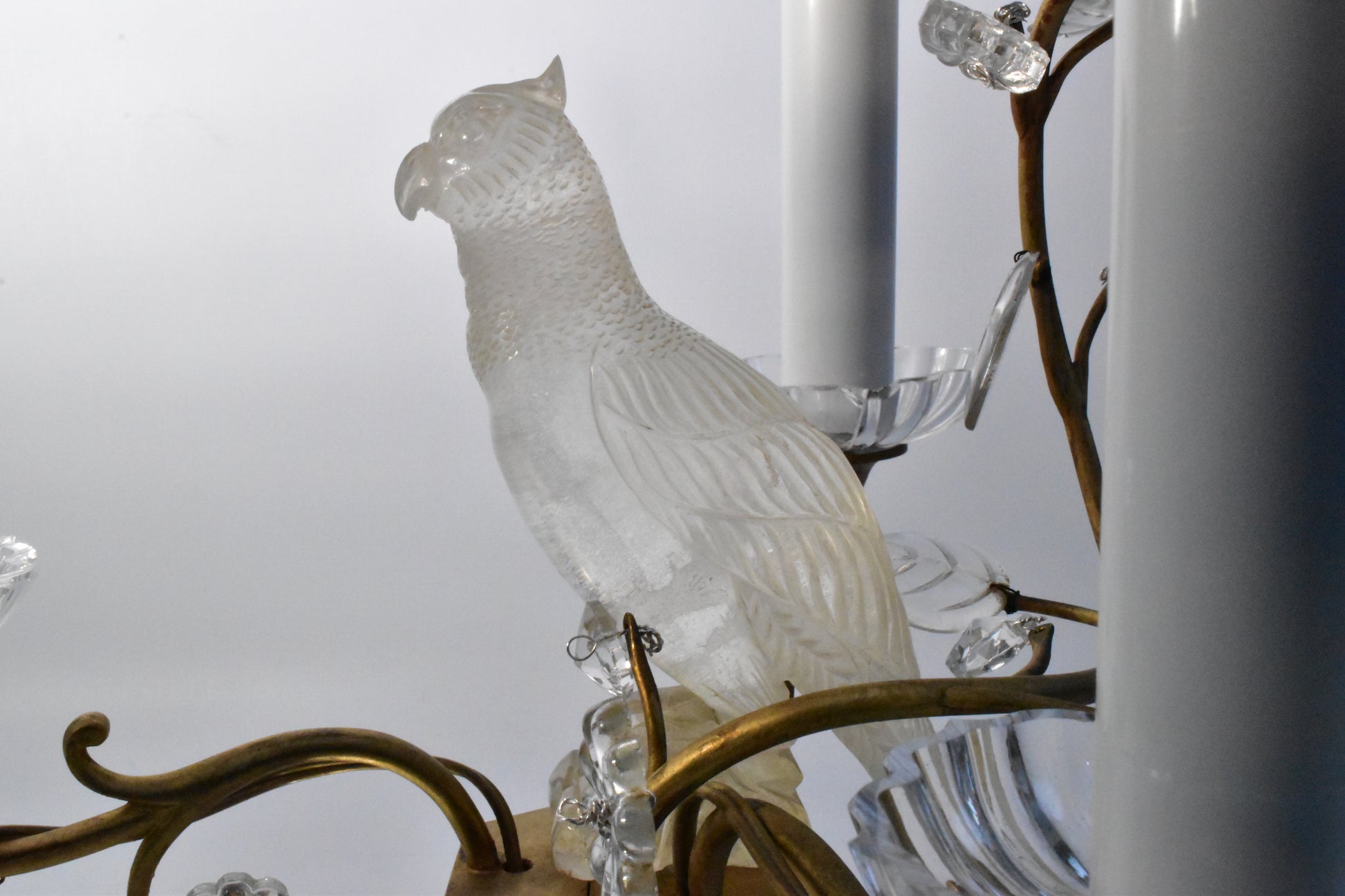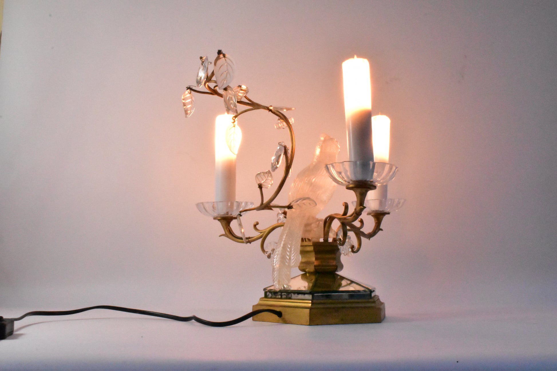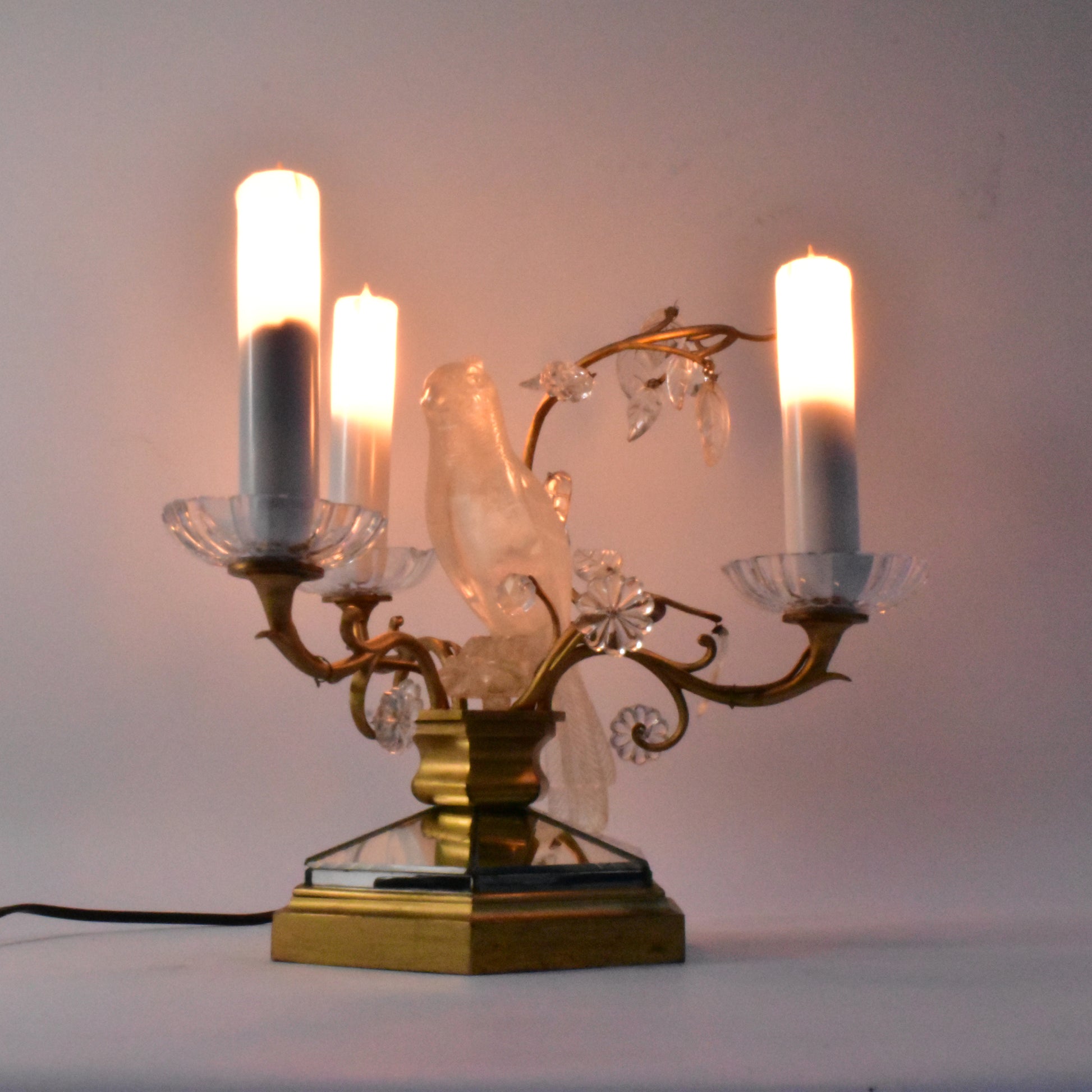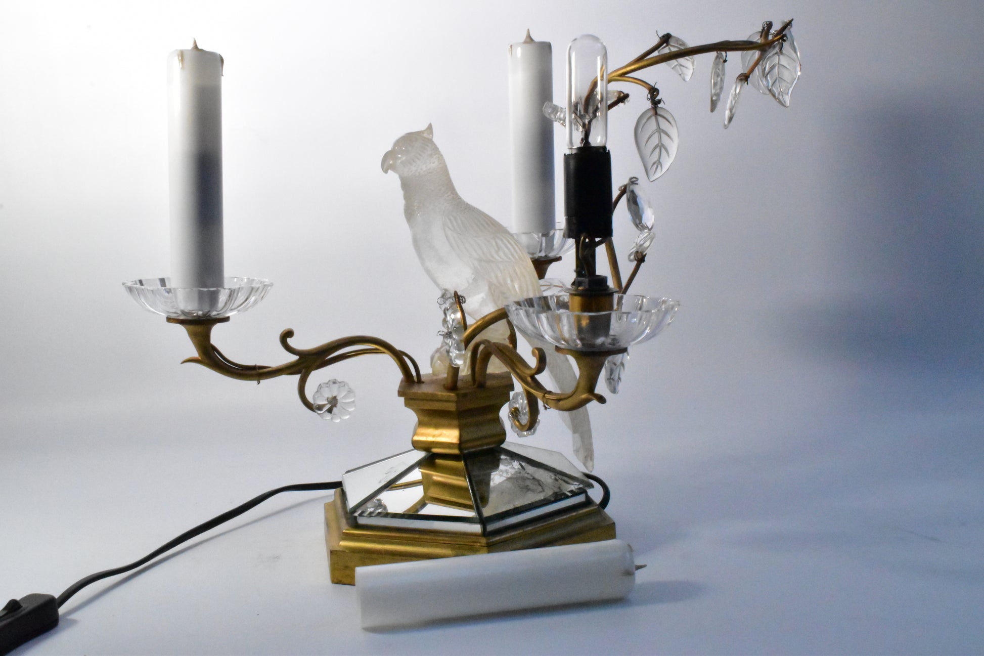 De glazen papagaai wordt verlicht door drie glazen electrische lampen in kaarsvorm. De vogel zit op een sierlijke tak met kristallen pegels versierd. De basis is van verguld messing gedeeltelijk bekleed met spiegelglas. Een zeer speels en vrolijk geheel dat typerend is voor de verlichtings objecten van Maison Bagues uit Parijs. Het huis bestaat nog steeds en over het motief papagaai schrijven ze op hun website; The parrot, symbol of Baguès, appeared in creations in the 1920s and quickly became a timeless icon of the brand. ( zie https://www.bagues-paris.com/product/lu-fe-20031-03/ )