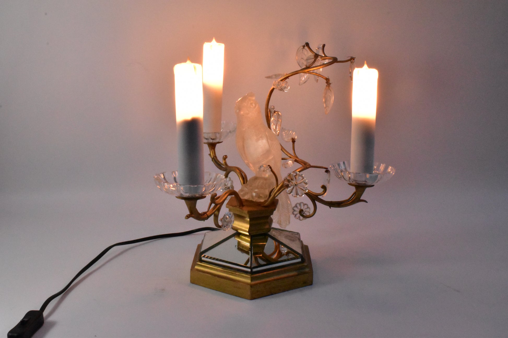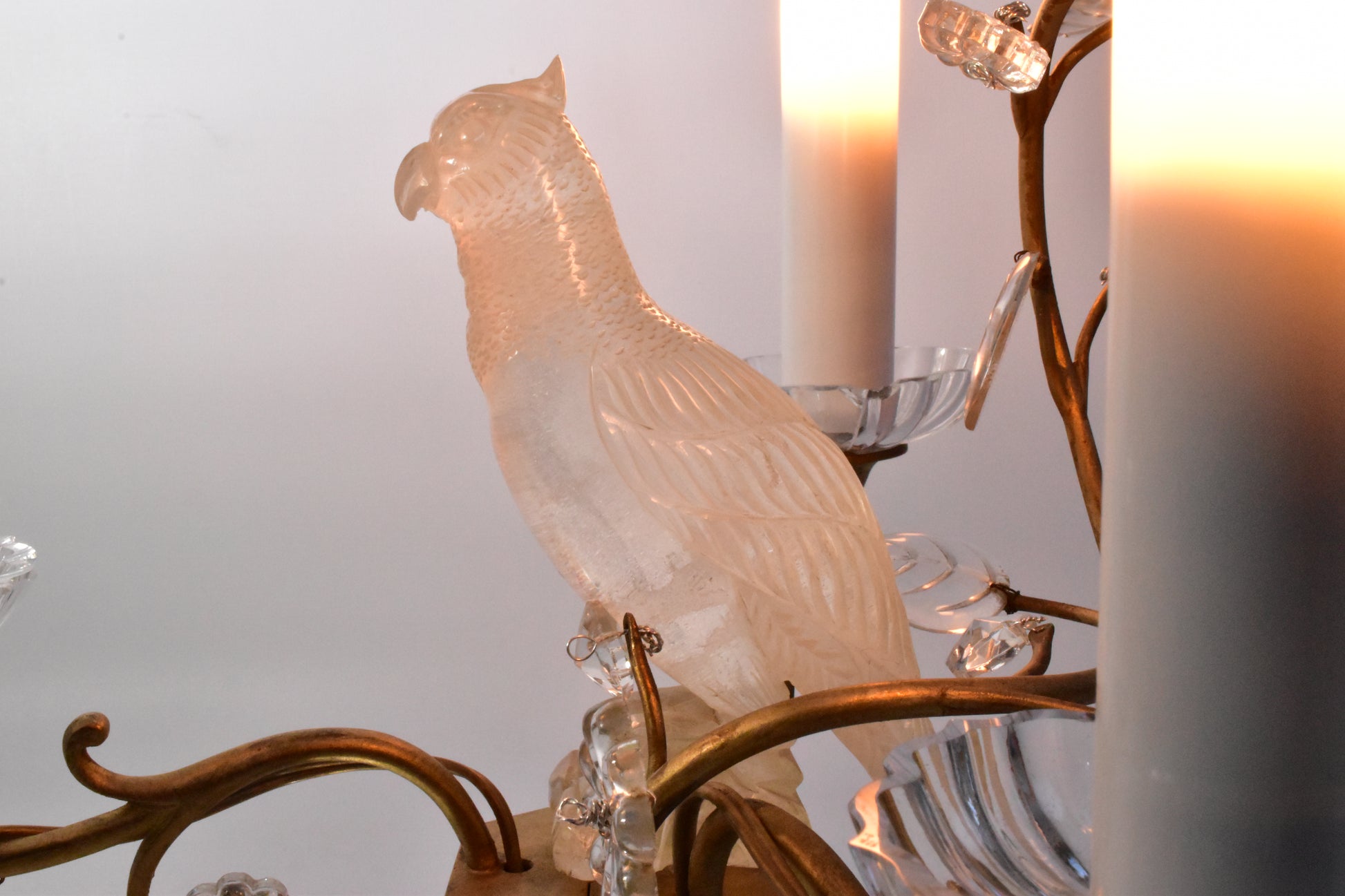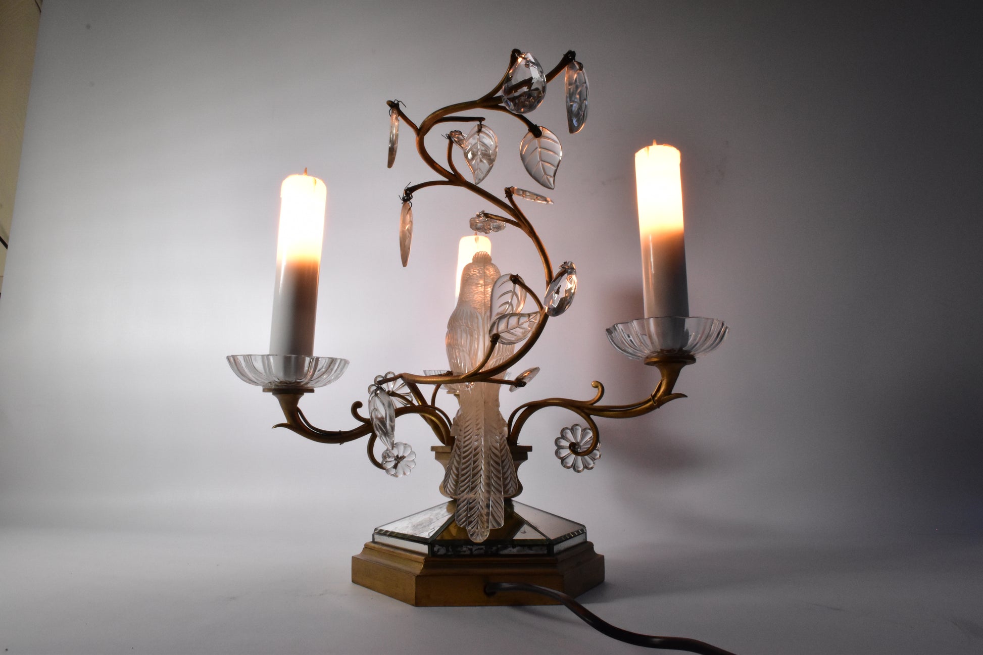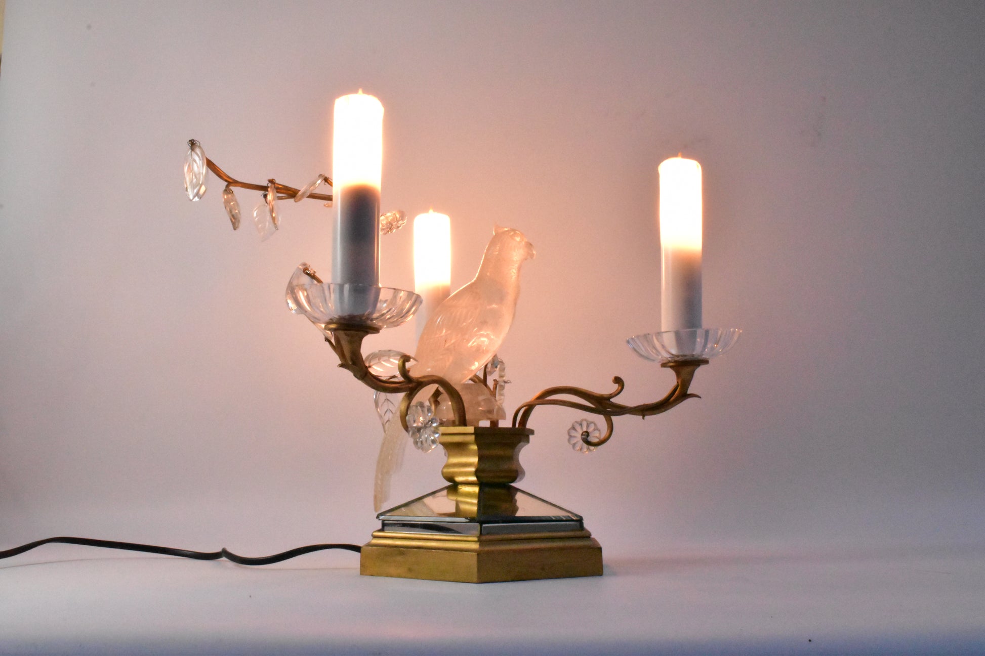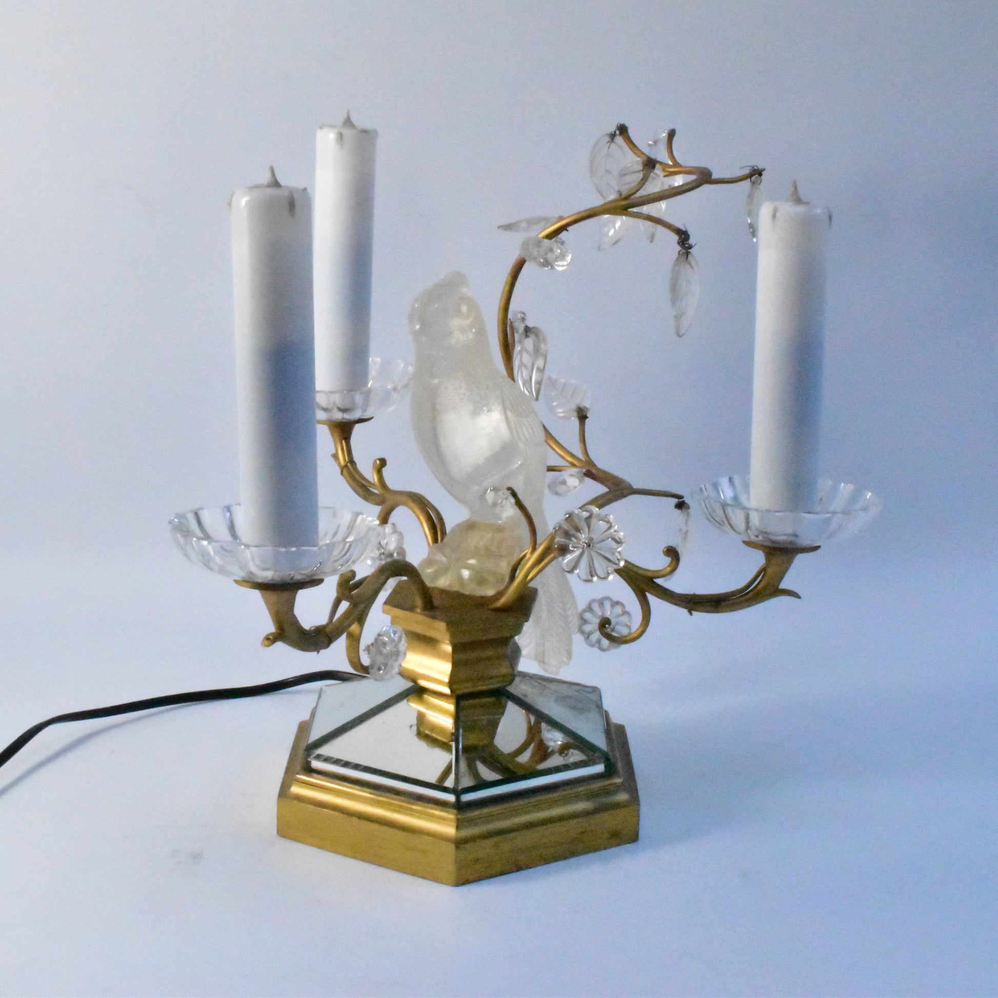 De glazen papagaai wordt verlicht door drie glazen electrische lampen in kaarsvorm. De vogel zit op een sierlijke tak met kristallen pegels versierd. De basis is van verguld messing gedeeltelijk bekleed met spiegelglas. Een zeer speels en vrolijk geheel dat typerend is voor de verlichtings objecten van Maison Bagues uit Parijs. Het huis bestaat nog steeds en over het motief papagaai schrijven ze op hun website; The parrot, symbol of Baguès, appeared in creations in the 1920s and quickly became a timeless icon of the brand. ( zie https://www.bagues-paris.com/product/lu-fe-20031-03/ )