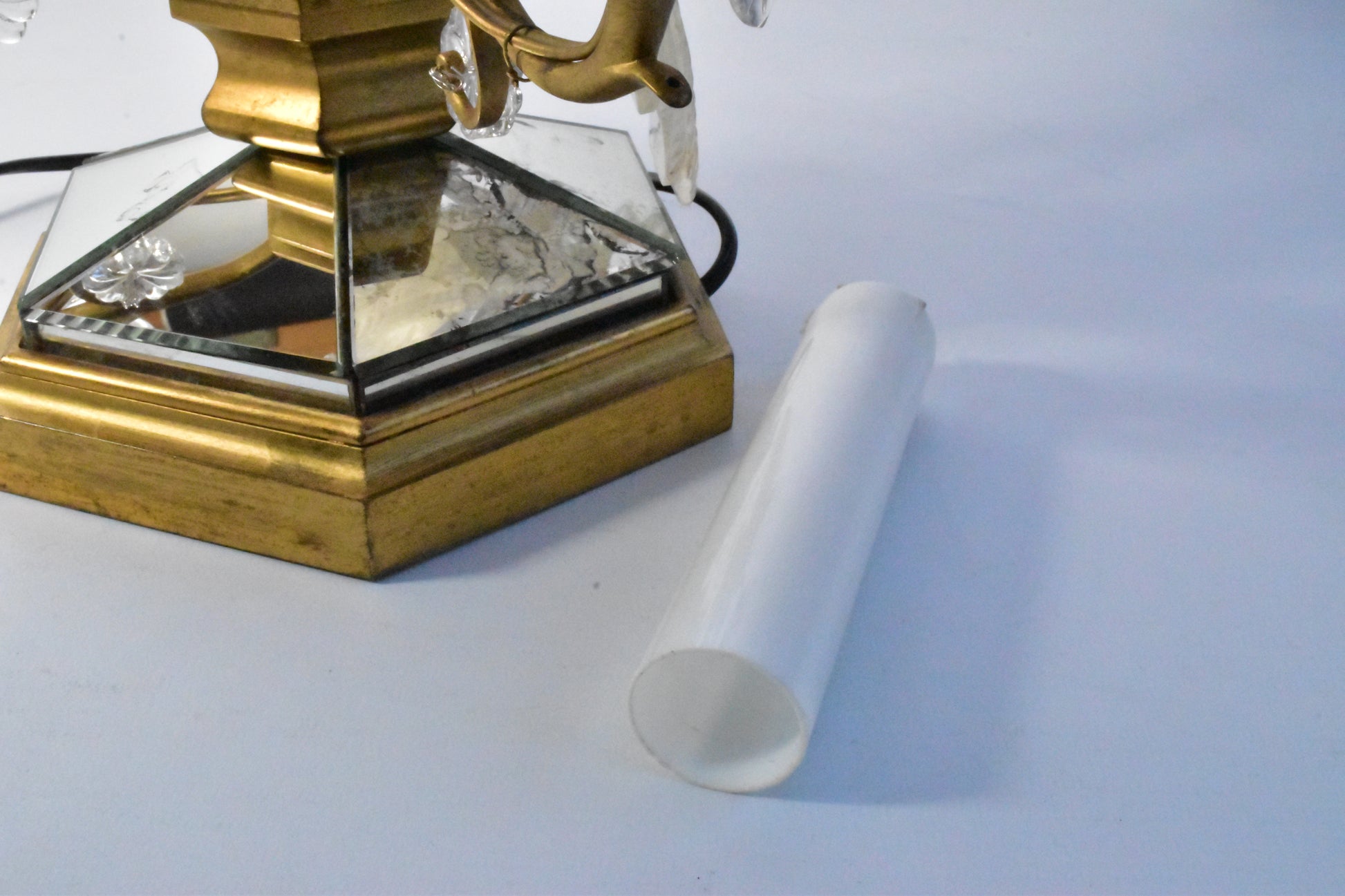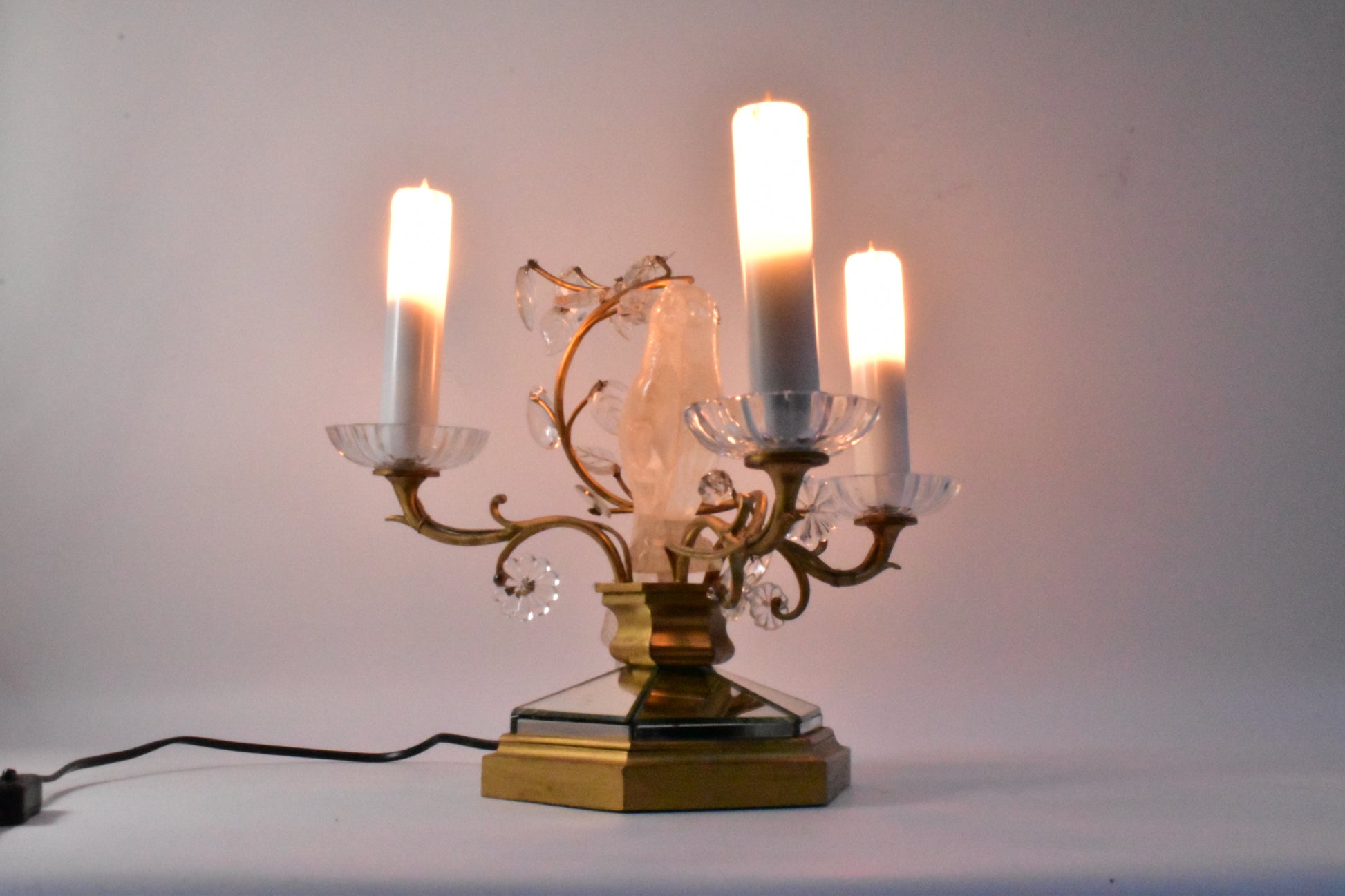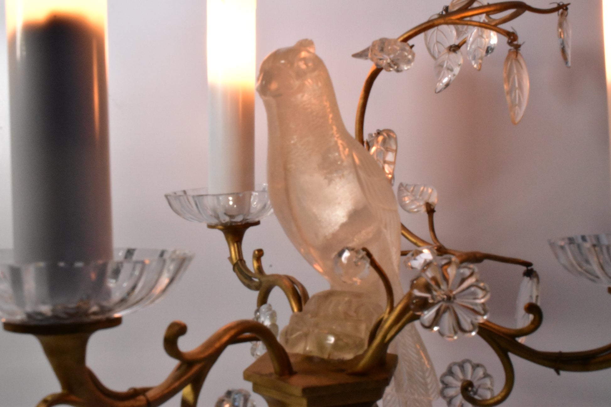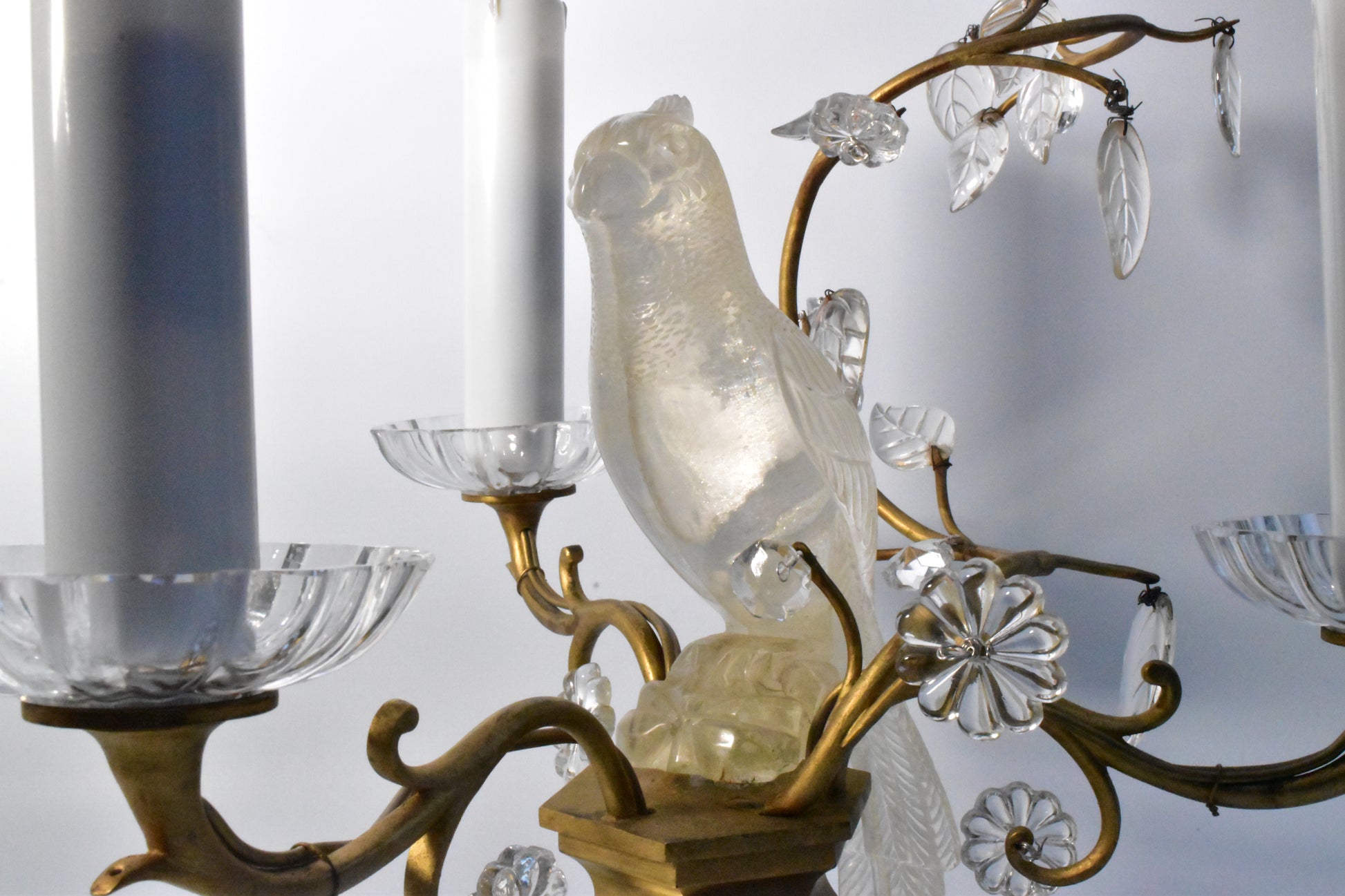 De glazen papagaai wordt verlicht door drie glazen electrische lampen in kaarsvorm. De vogel zit op een sierlijke tak met kristallen pegels versierd. De basis is van verguld messing gedeeltelijk bekleed met spiegelglas. Een zeer speels en vrolijk geheel dat typerend is voor de verlichtings objecten van Maison Bagues uit Parijs. Het huis bestaat nog steeds en over het motief papagaai schrijven ze op hun website; The parrot, symbol of Baguès, appeared in creations in the 1920s and quickly became a timeless icon of the brand. ( zie https://www.bagues-paris.com/product/lu-fe-20031-03/ )
