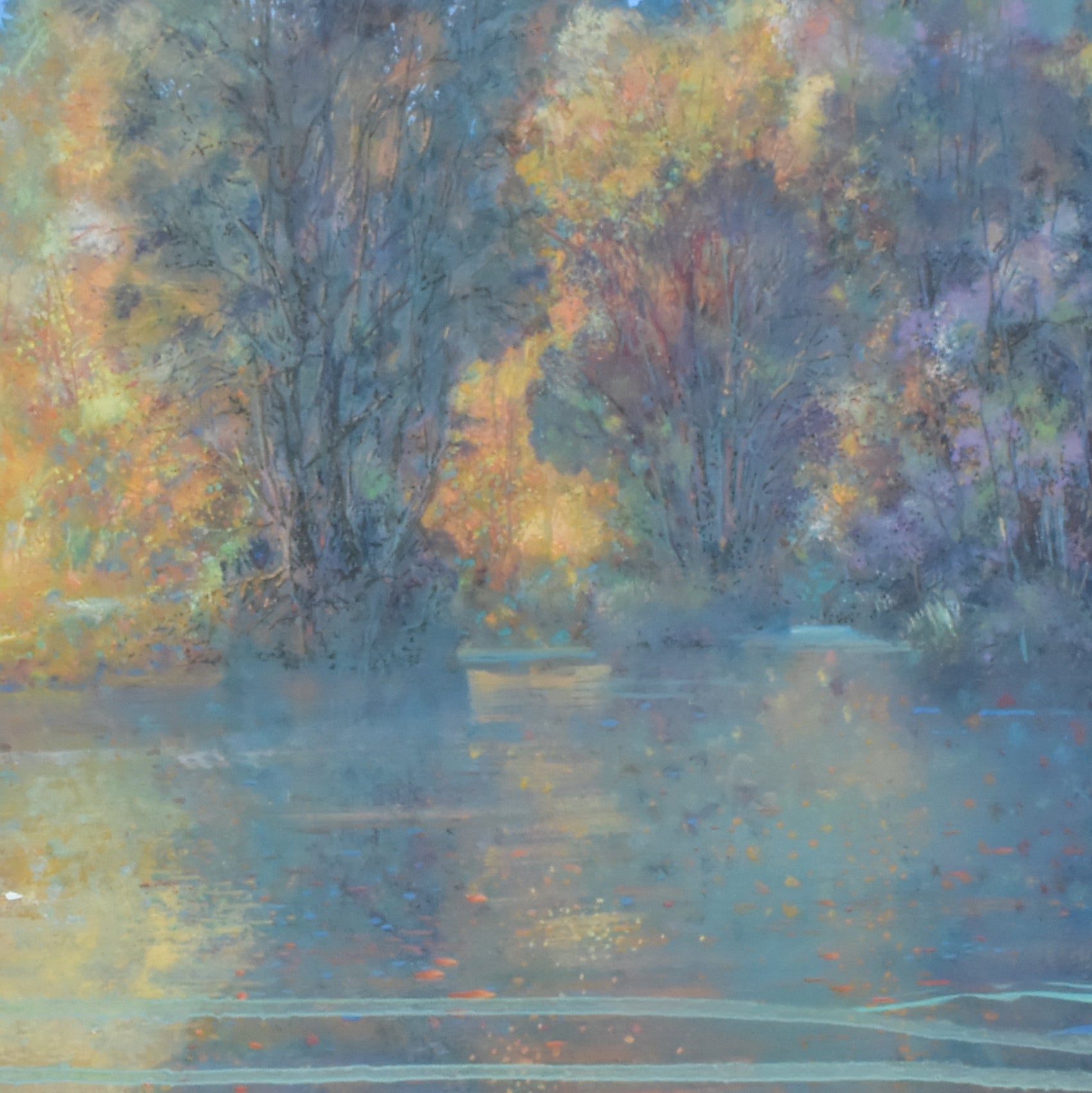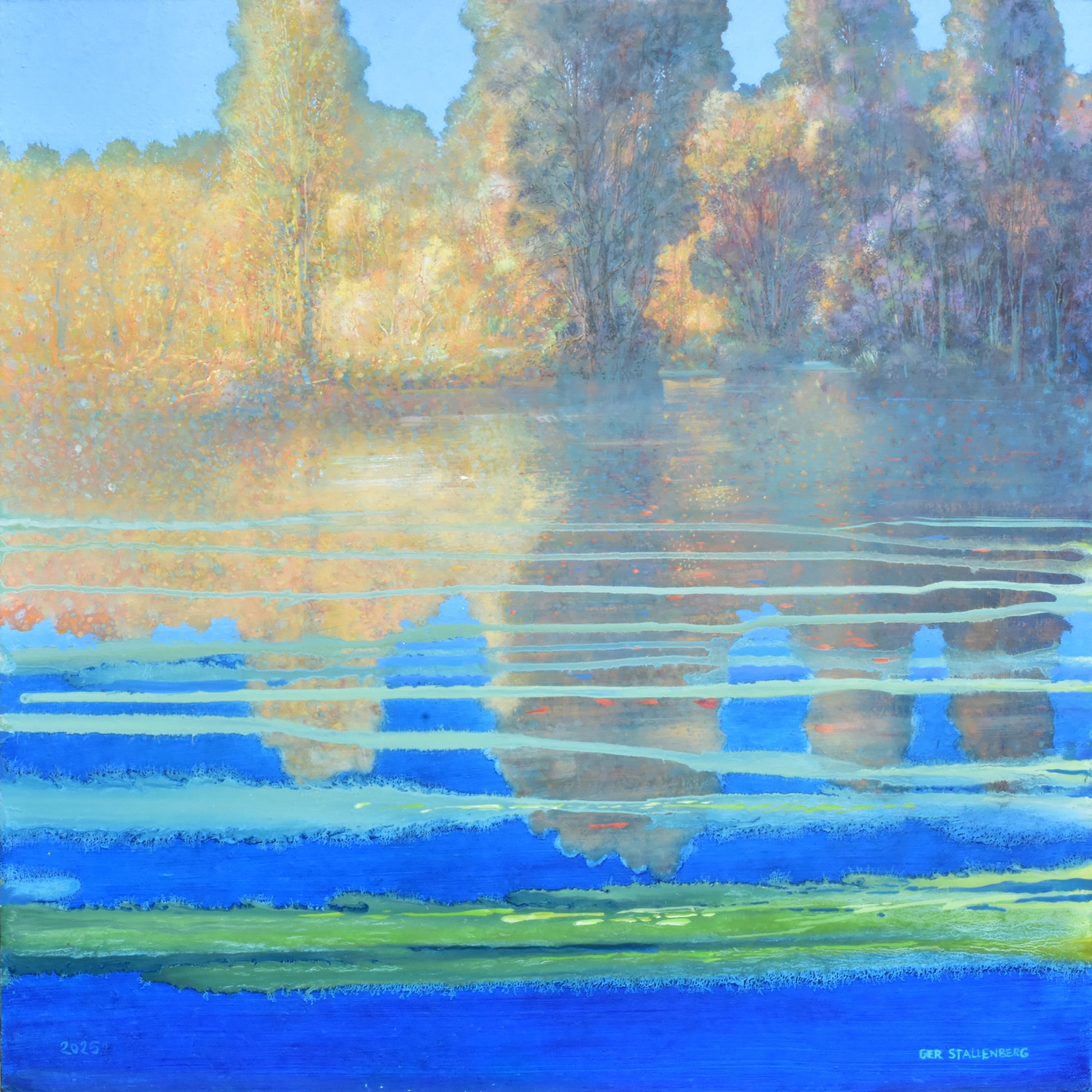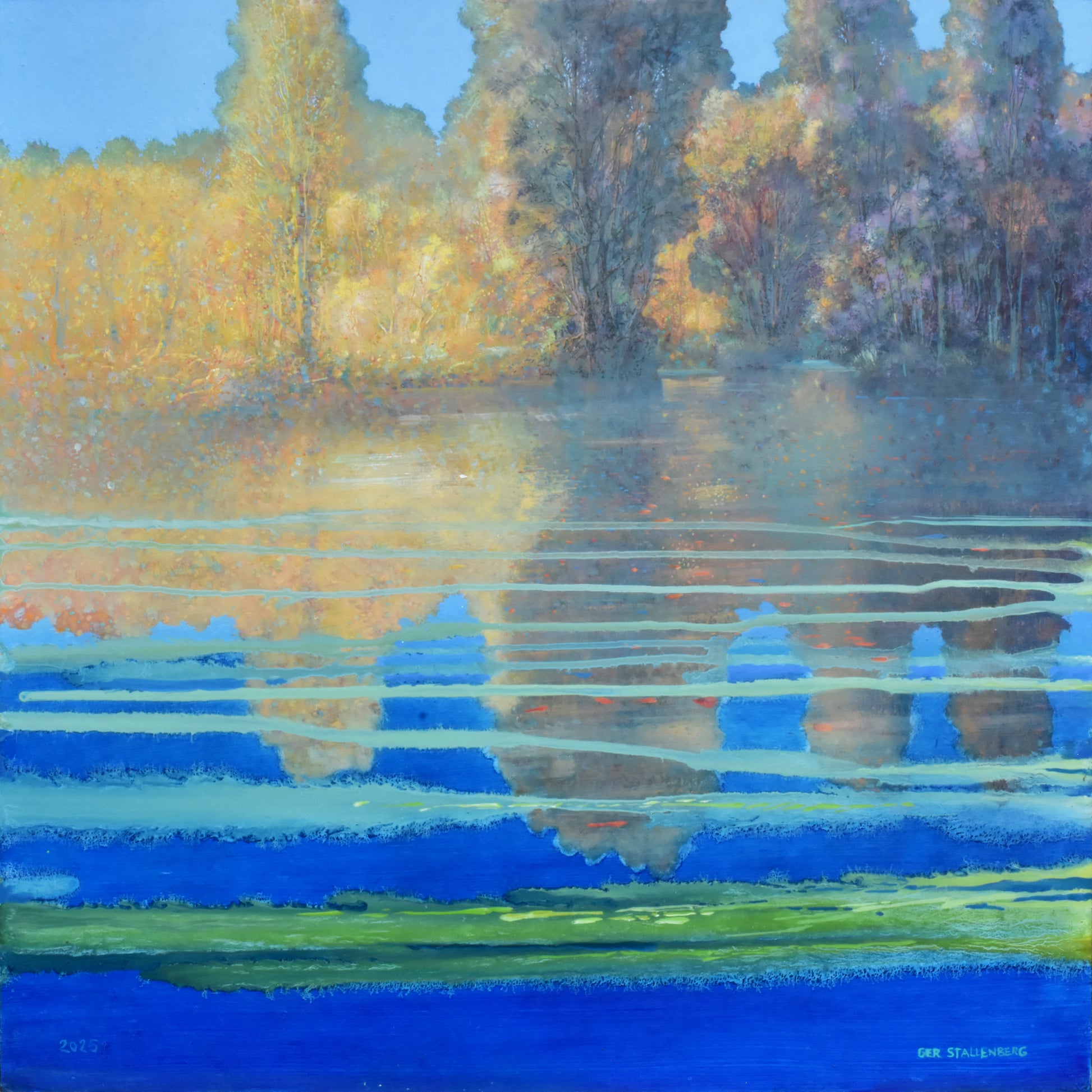 Door de weerspiegeling van de lucht intens blauw te maken, en door horizontale groene verfbanen toe te voegen heb ik aan dit landschap abstractie toegevoegd. De balans tussen het realisme en de abstracte compositie is in dit schilderij heel mooi in evenwicht.
