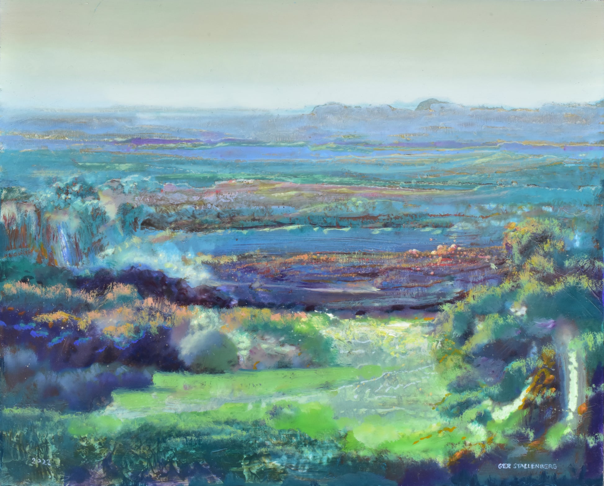 In mijn schilderijen zoek ik naar een tijdloos landschap — een ruimte die niet gebonden is aan plaats of moment, maar eerder aan een innerlijke ervaring. Het beeld roept misschien herinneringen op aan een plek die je ooit hebt gezien, of juist een droomlandschap dat je nog nooit hebt bezocht. Die mystiek is belangrijk voor mij: het landschap als spiegel van iets diepers, iets wat onder de oppervlakte leeft.