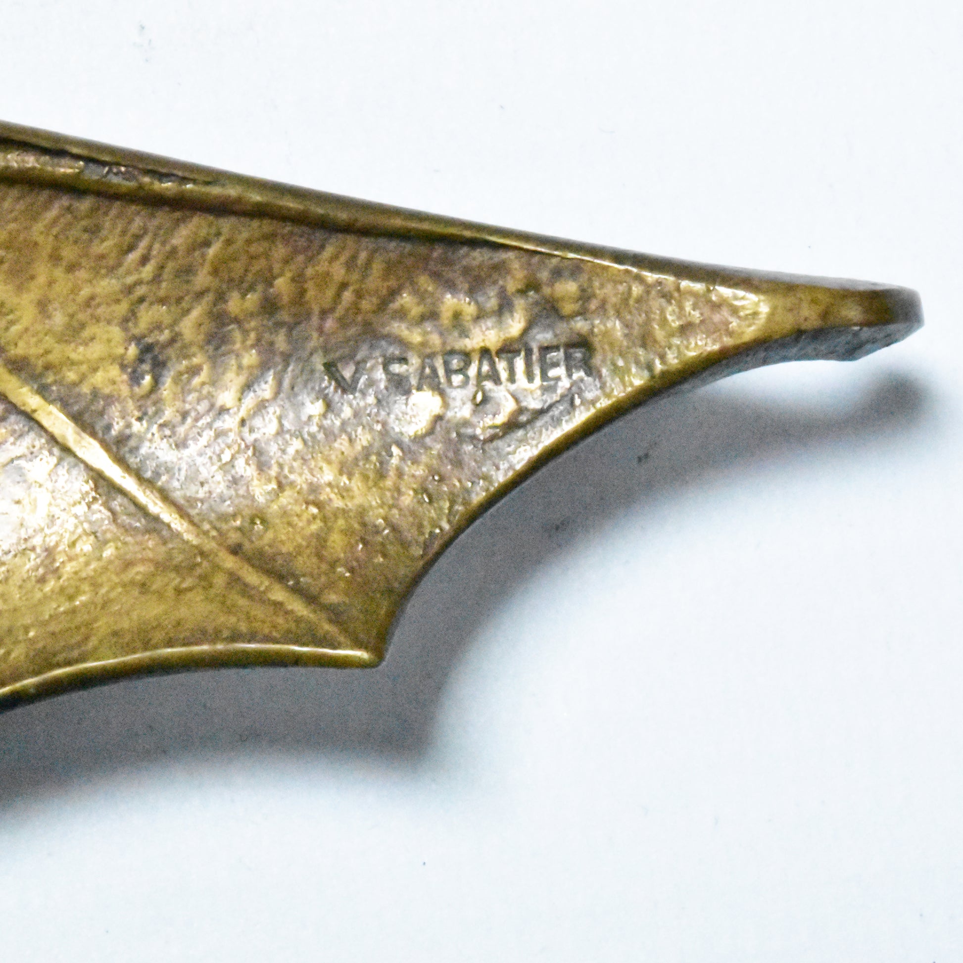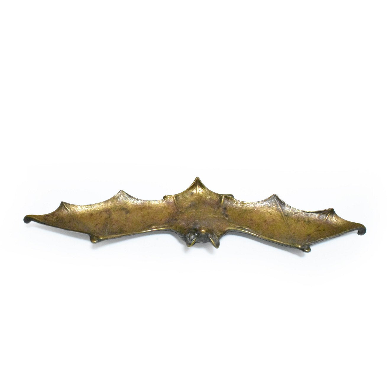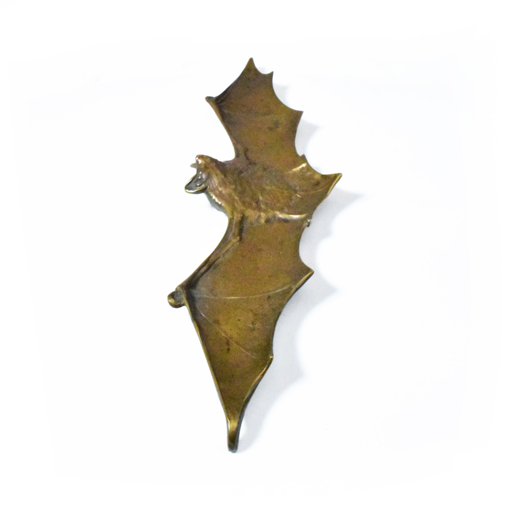 Vide poche van brons in de vorm van een vliegende vleermuis. De vleermuis die tot leven komt tijdens de schemering en met zijn onvoorspelbare bewegingen rondvliegt, past perfect bij de sfeer van het fin du siecle. Het mysterie en de symboliek sprak de kunstenaars en het publiek van rond 1900 bijzonder aan. Fraai gedetailleerde vleermuis in gegoten brons.