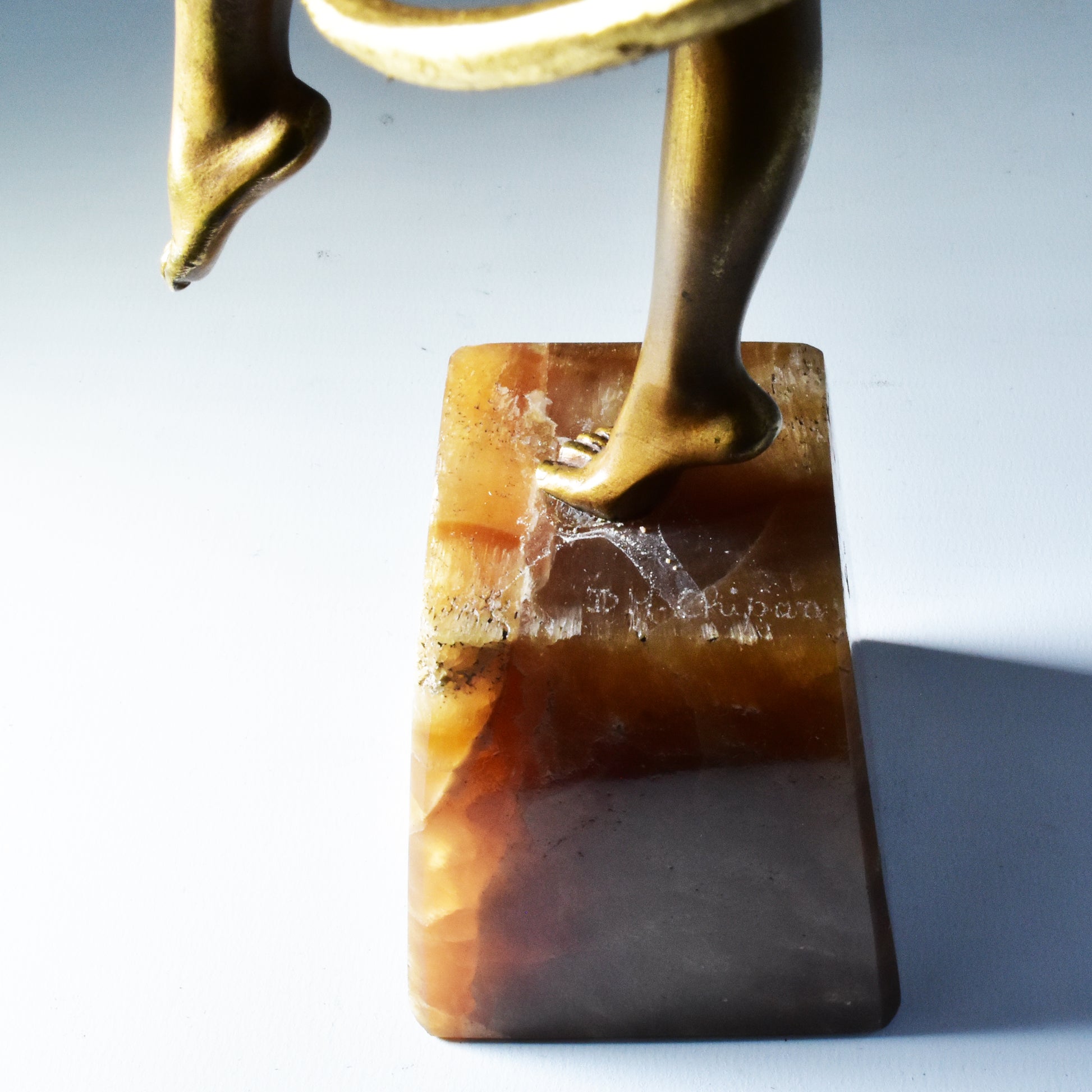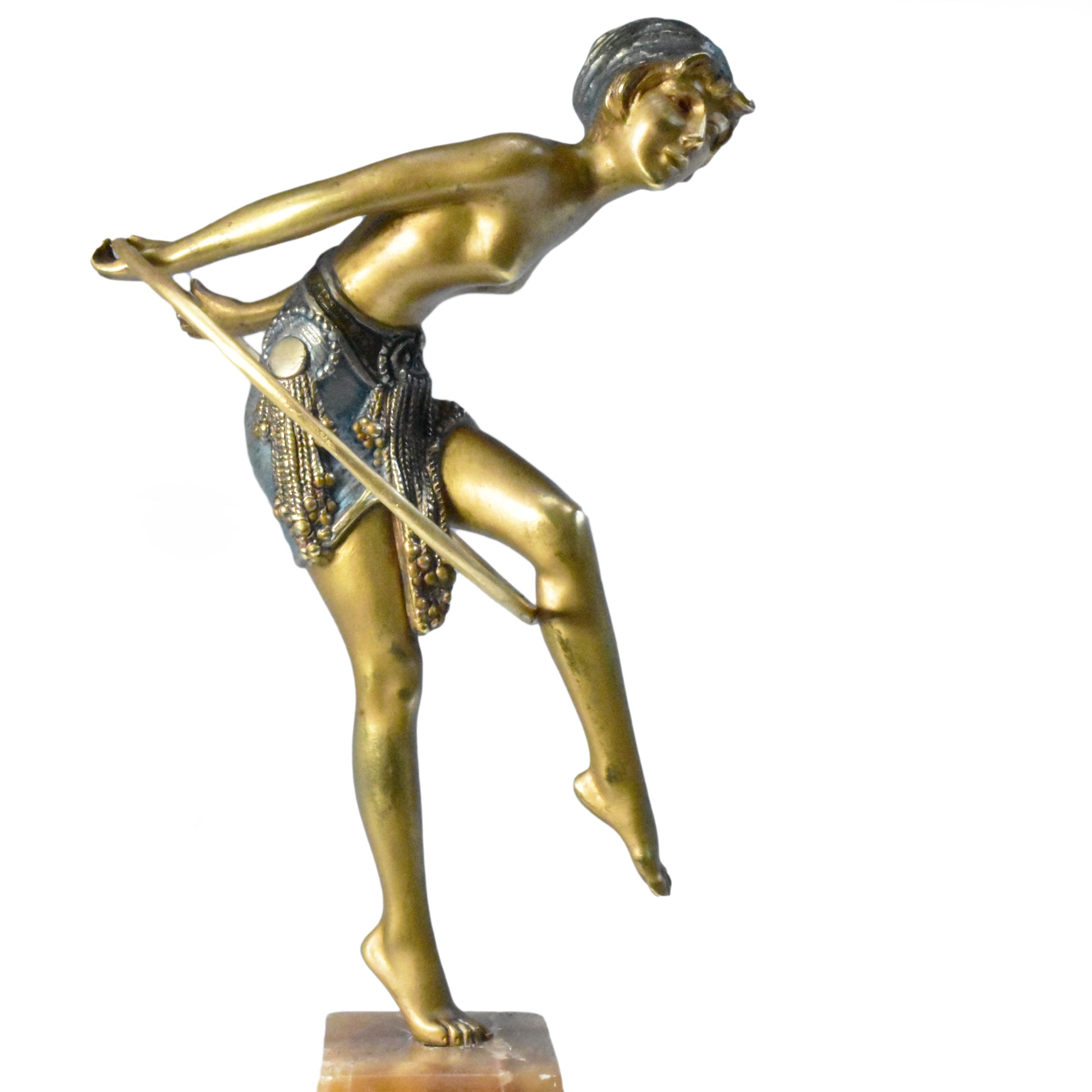 Wellicht van de beroemdste beeldhouwer uit de Franse Art deco periode; Demetre Chiparus is deze hoepel danseres. Deze kunstenaar kwam uit Roemenië maar werd in Parijs beroemd om zijn dansers en danseressen. Of het nu revue dansers, danser van het ballet Russe of gymnastische dansers waren, ze waren en zijn over de hele wereld populair. Deze uitvoering in brons is koud beschilderd, enstaat op een prachtig marmeren sokkeltje