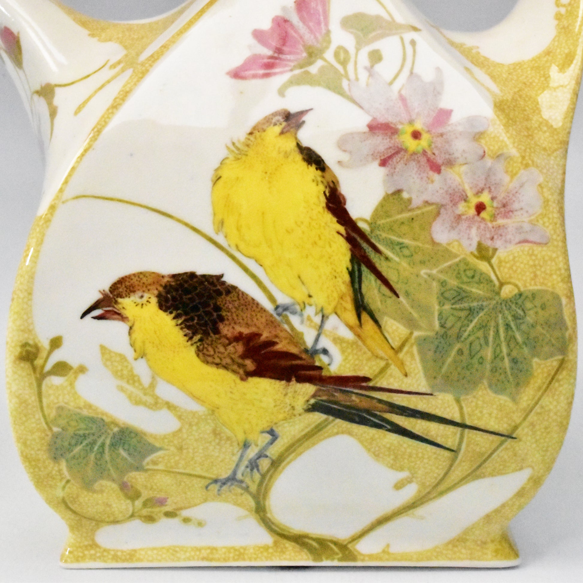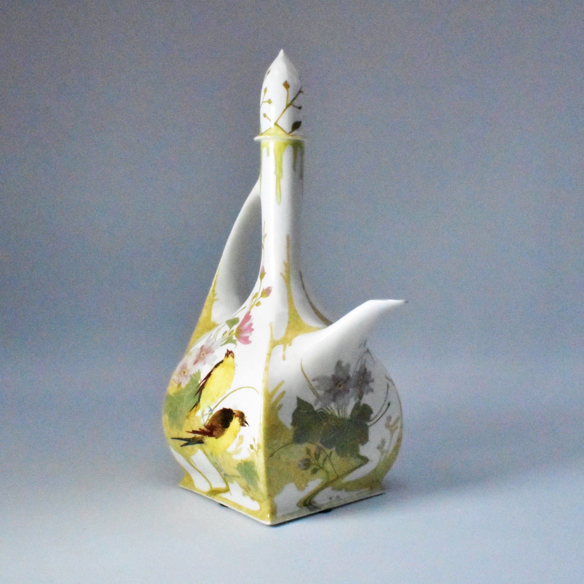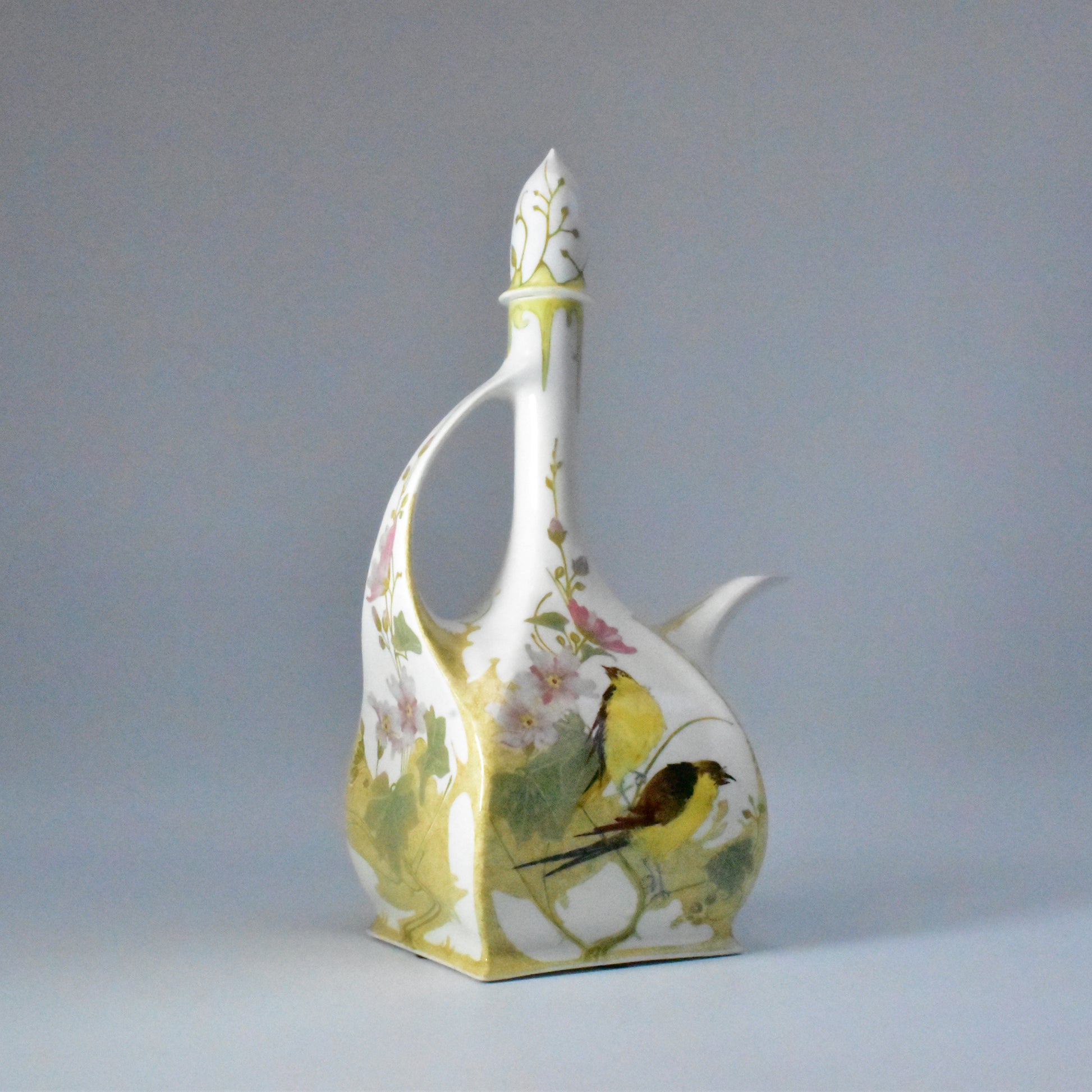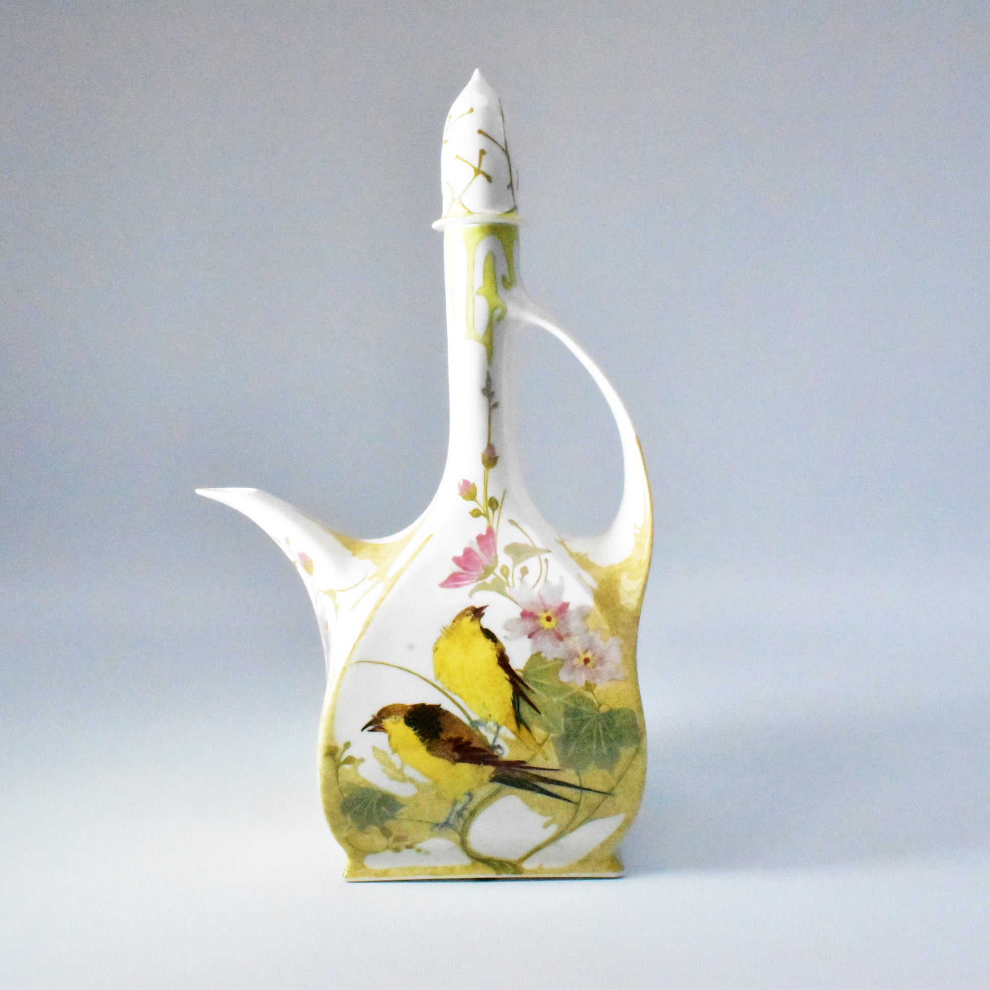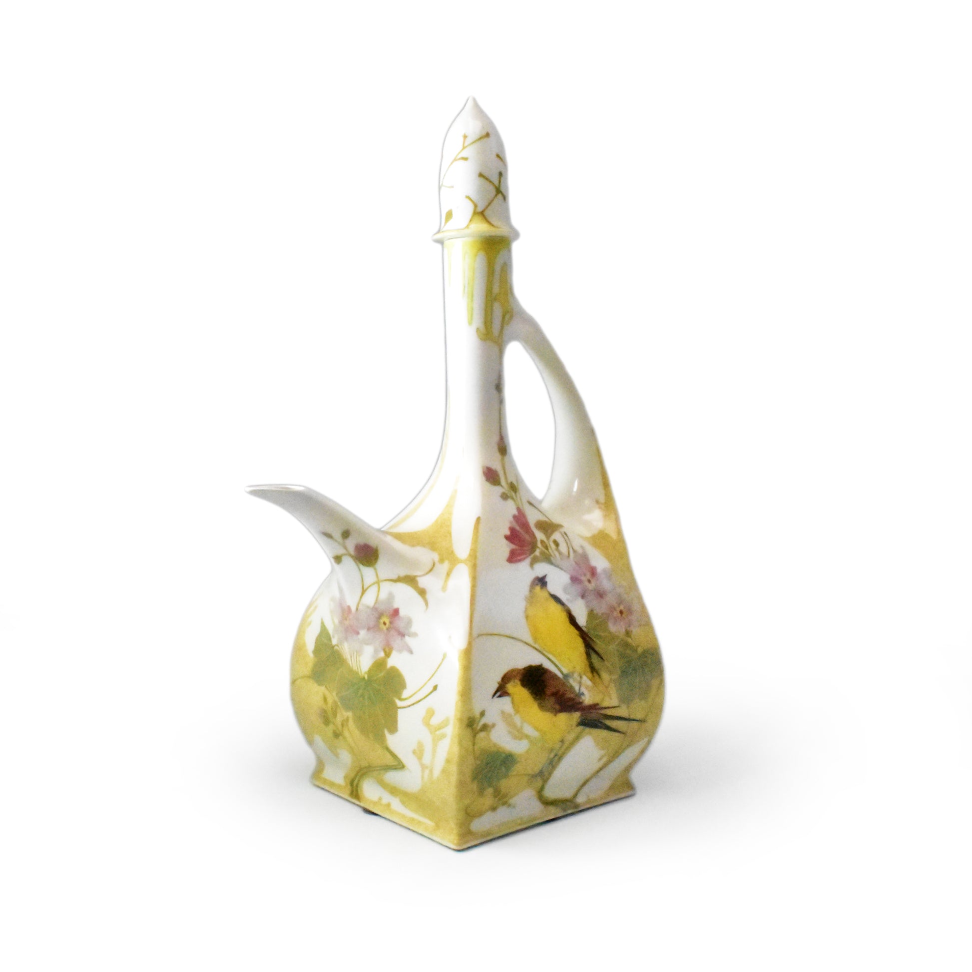 Aan beide zijden zien we een paartje vogels op een tak temidden van bloemen. Er is een restauratie aan de hals en aan het deel van de stop dat in de hals past. professionele onzichtbare restauratie. Prachtige art nouveau vormen, zowel in het model van de kan als in de prachtig geschilderde decoratie.