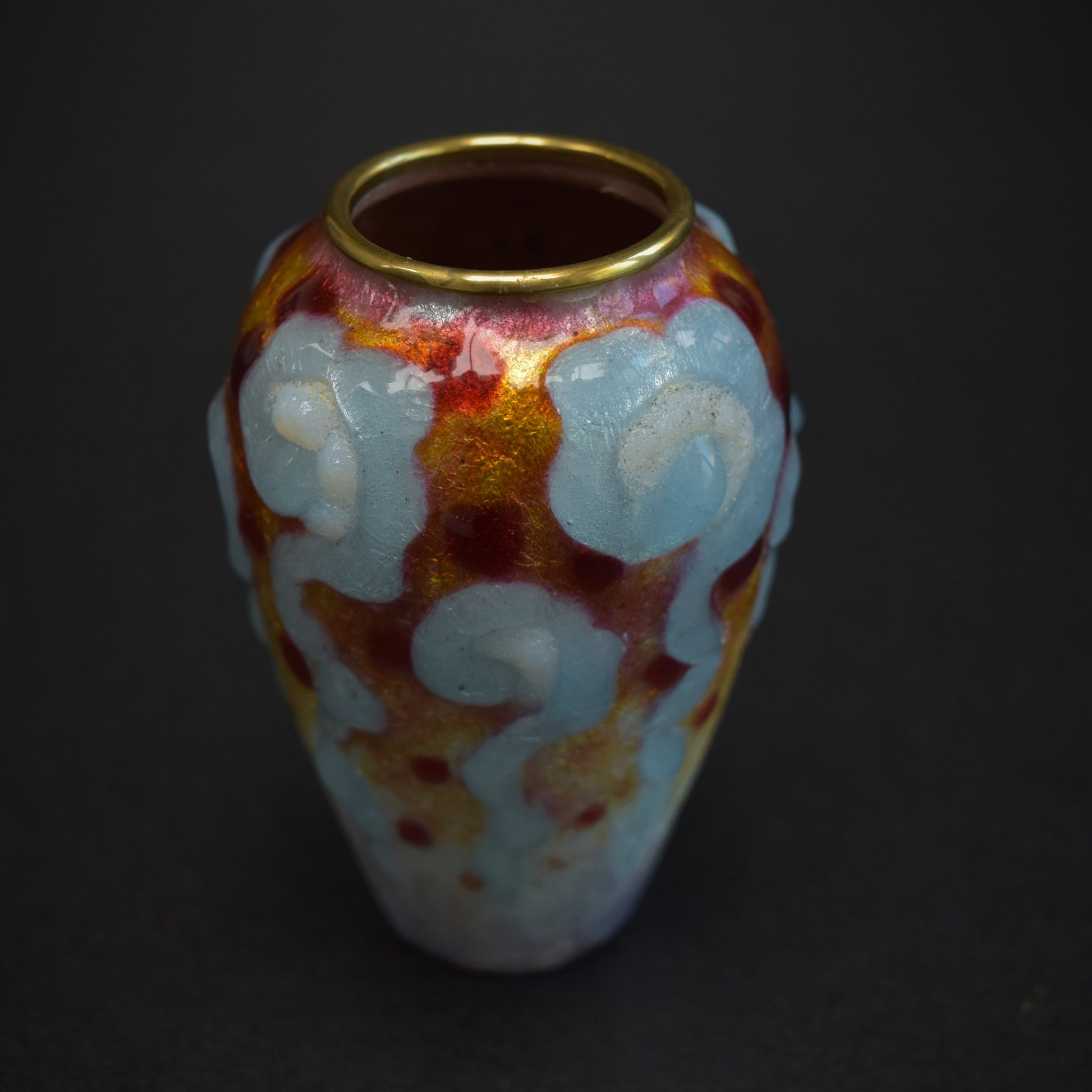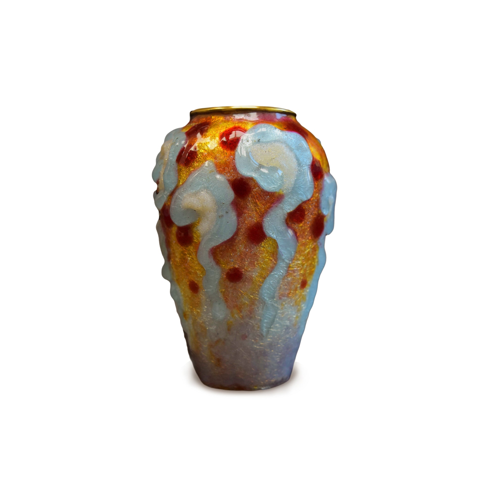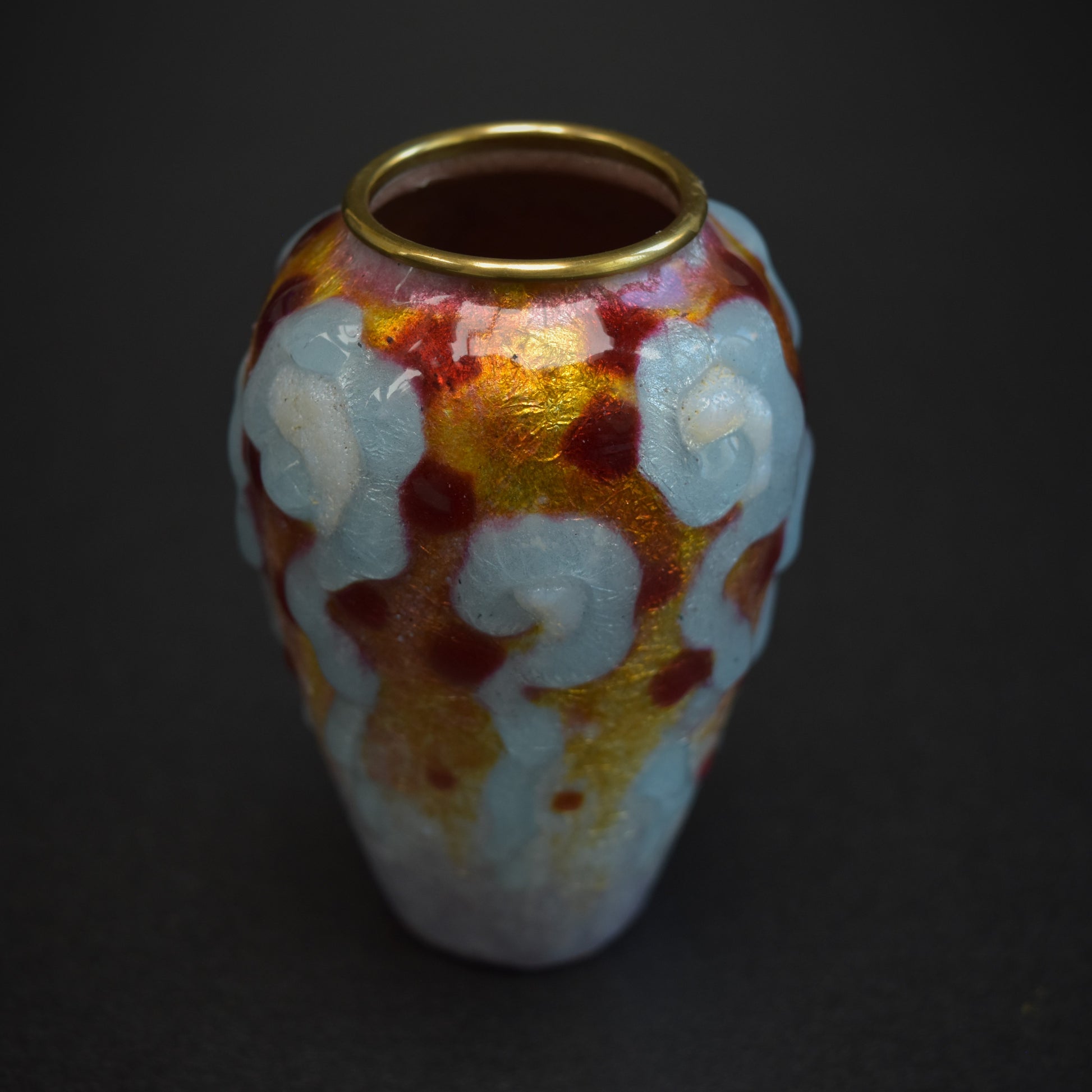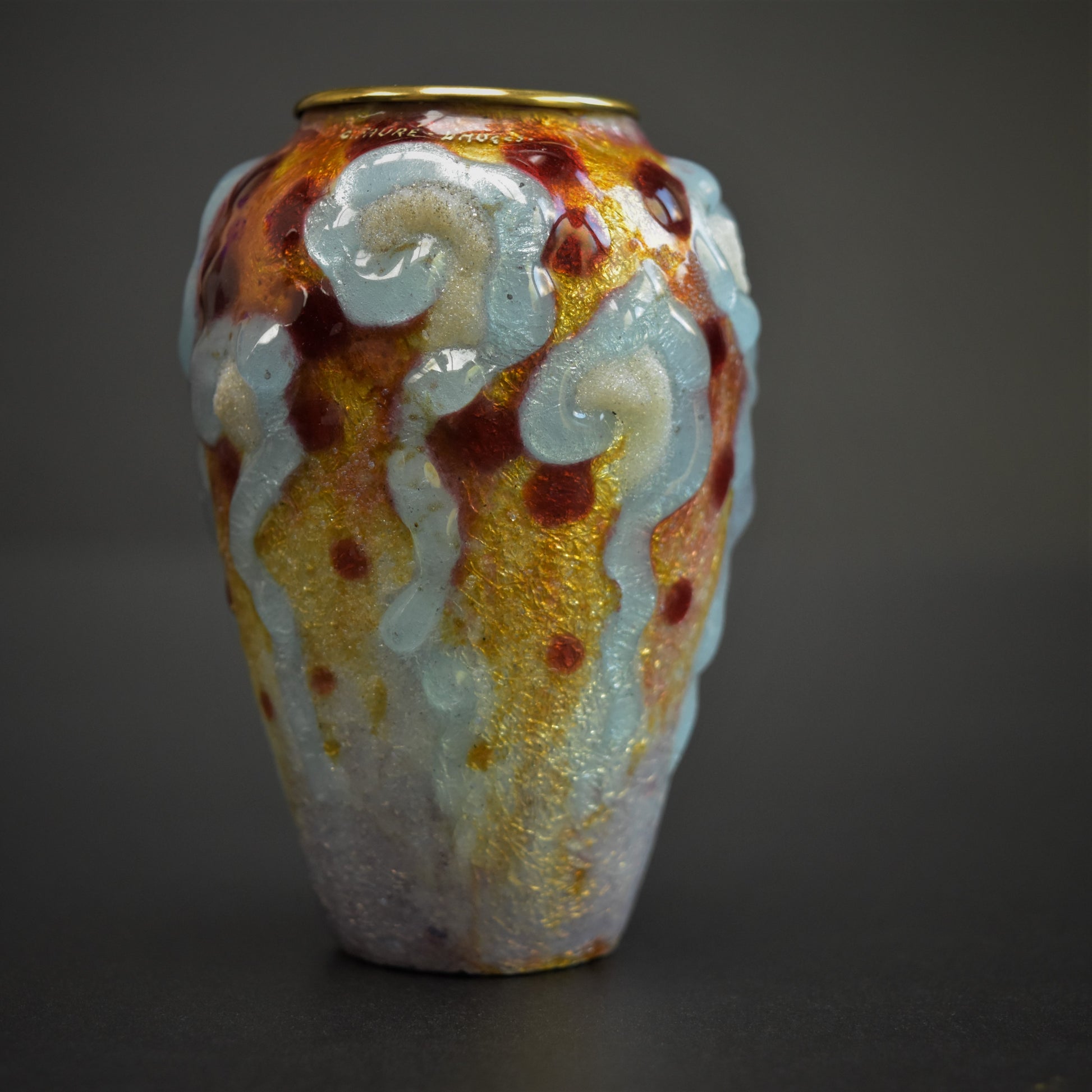 Zo klein als dit vaasje van Fauré is zo krachtig is de uitbarsting van vorm en kleur. Een eruptie in glasemaille op bladzilver.