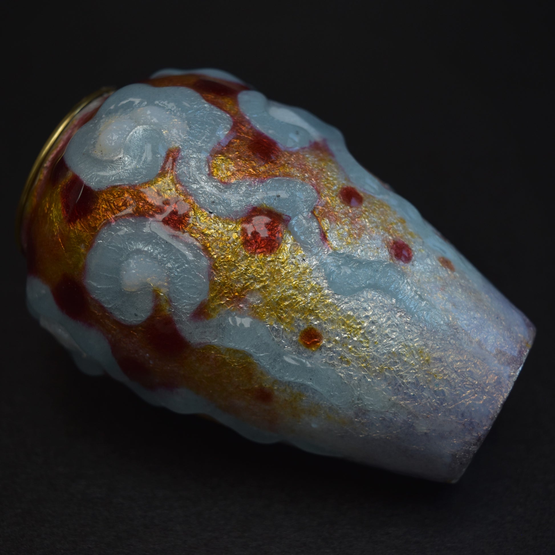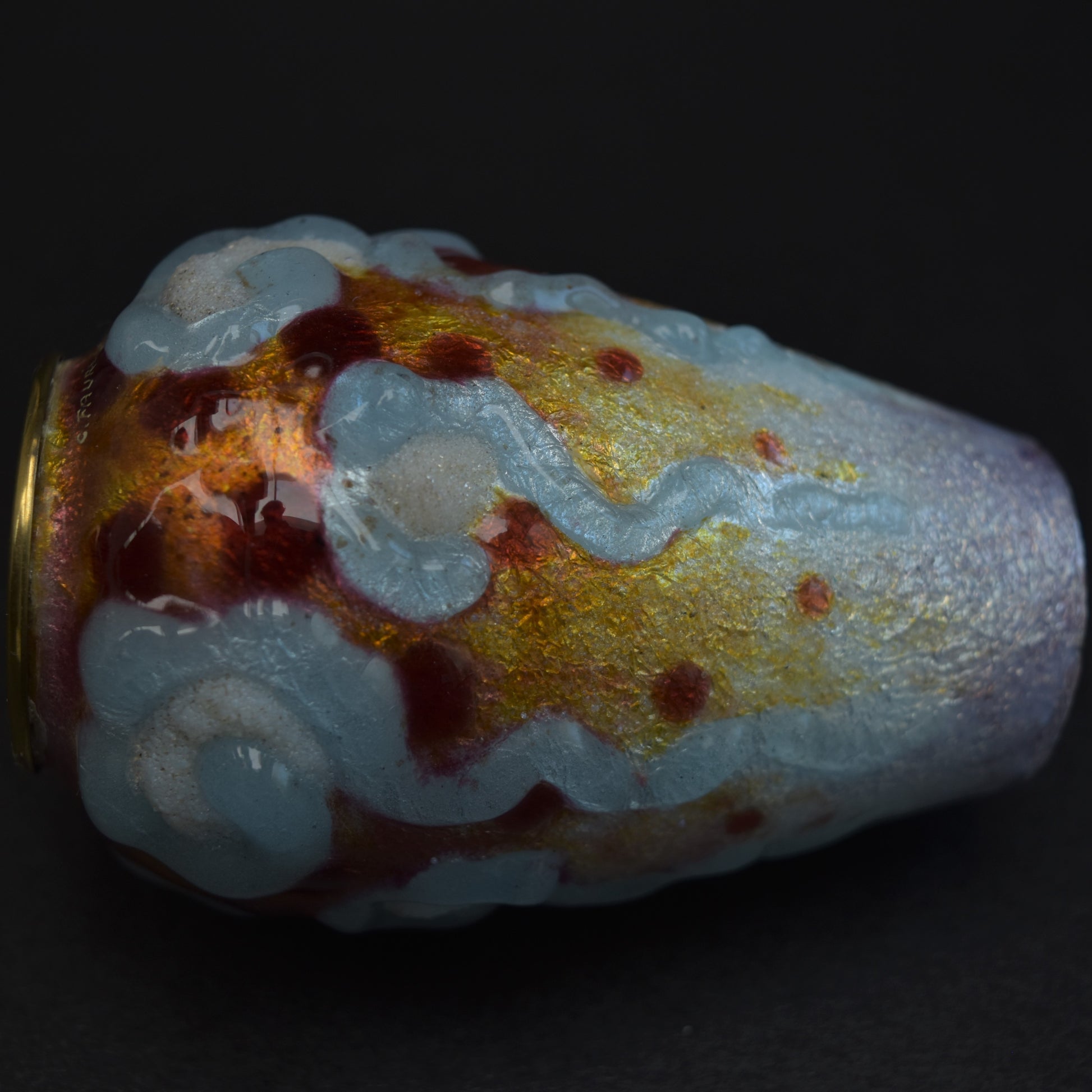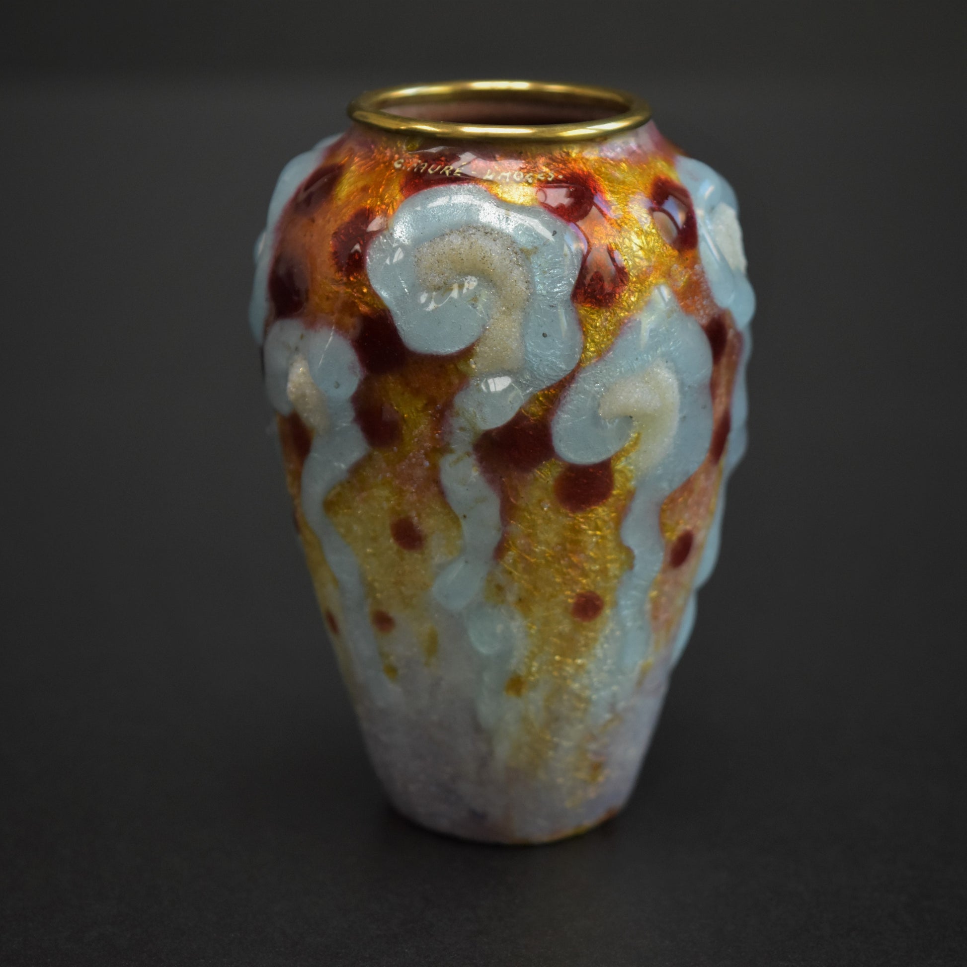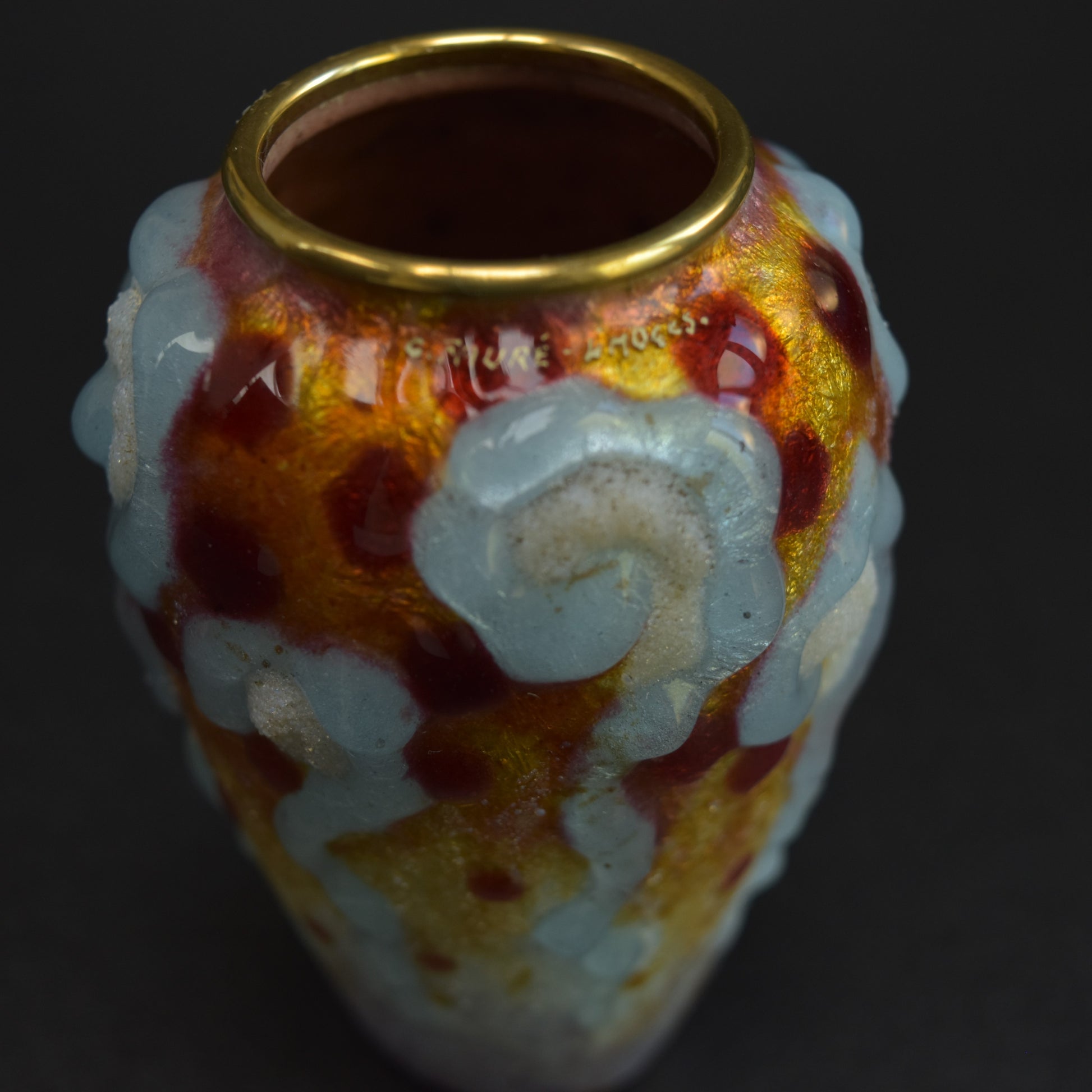 Zo klein als dit vaasje van Fauré is zo krachtig is de uitbarsting van vorm en kleur. Een eruptie in glasemaille op bladzilver.