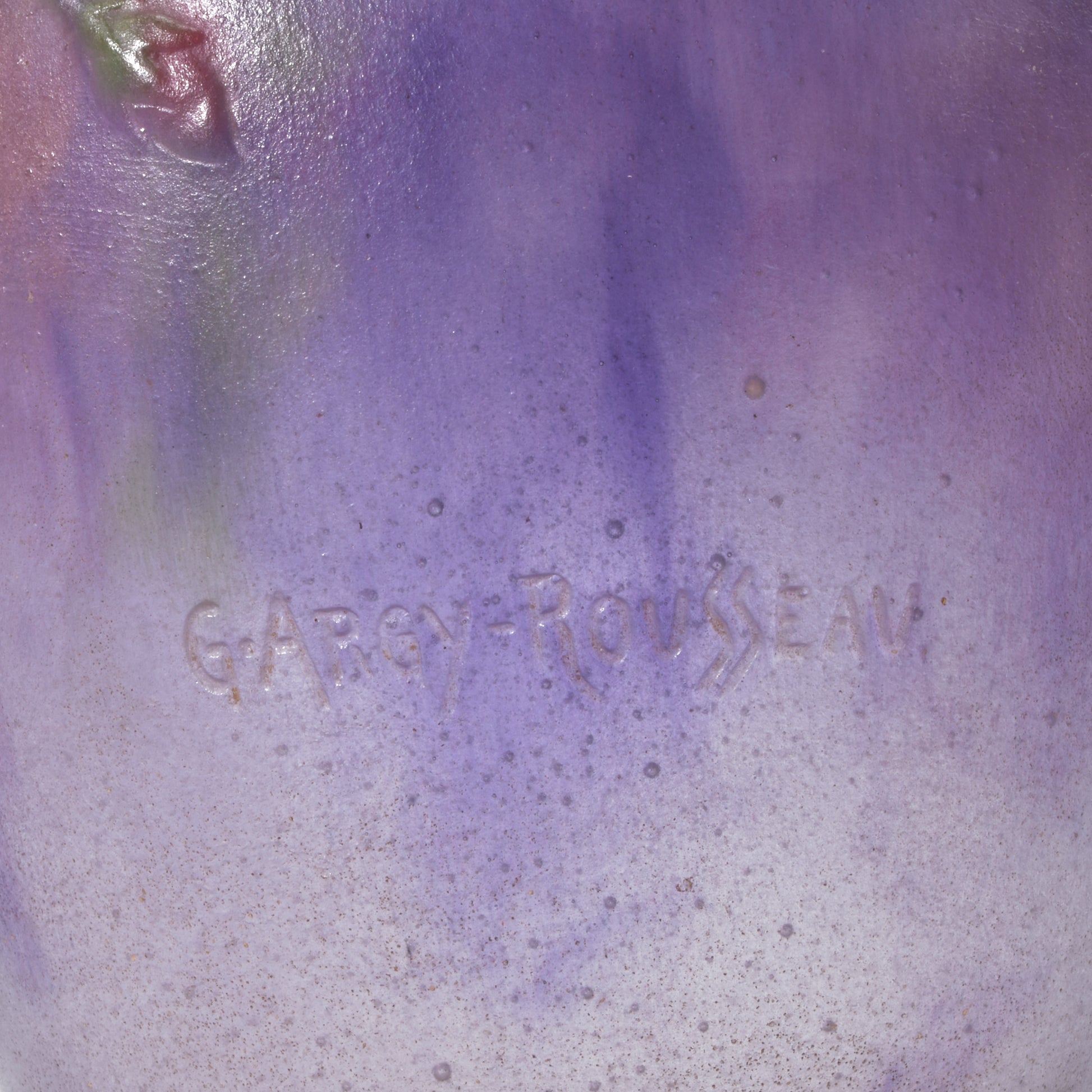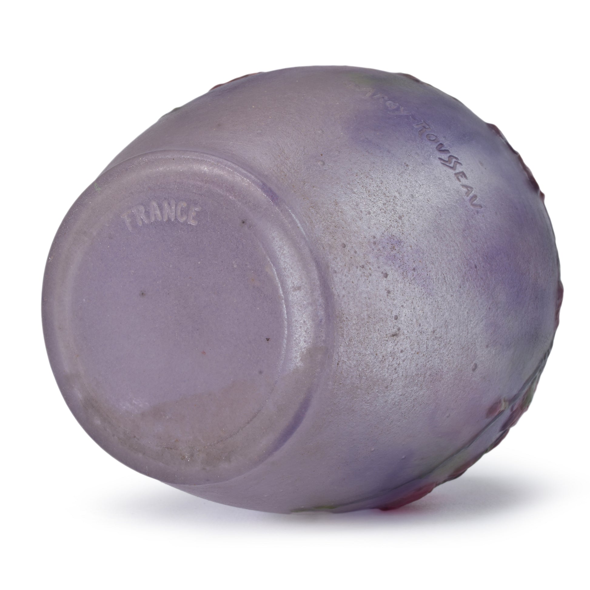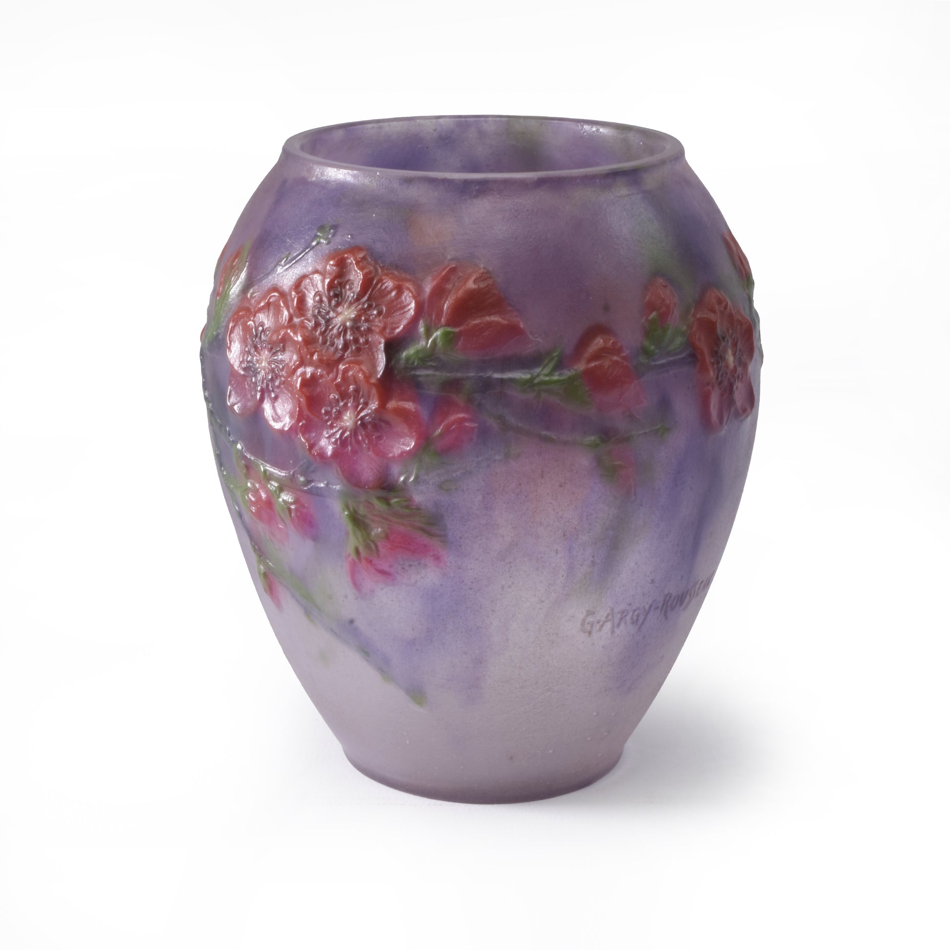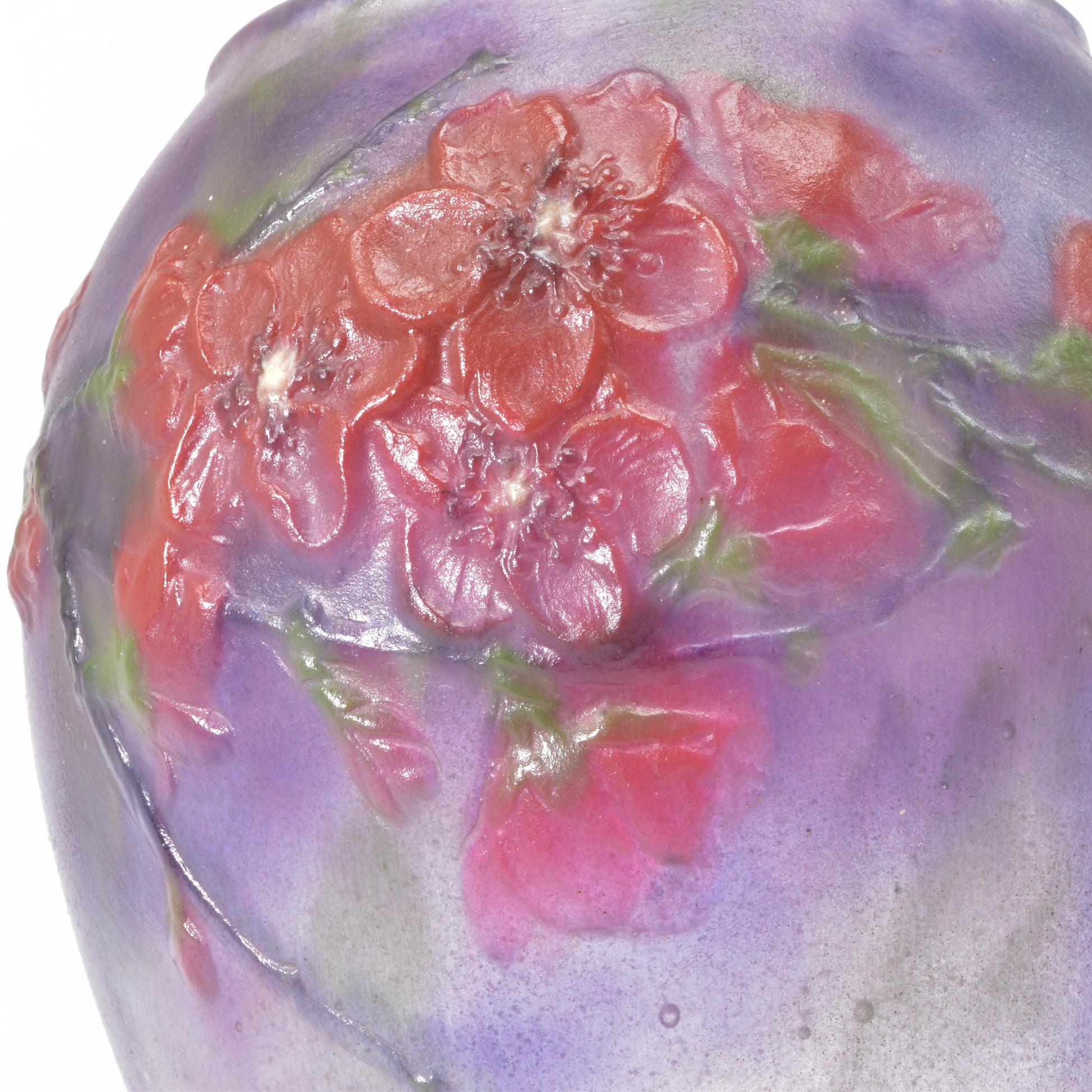 Pâte de verre vaas van Gabriël Argy Rousseau met een decor van Perzikbloesem. Dit exemplaar heeft een prachtige kleurstelling met violetten groen en rood.