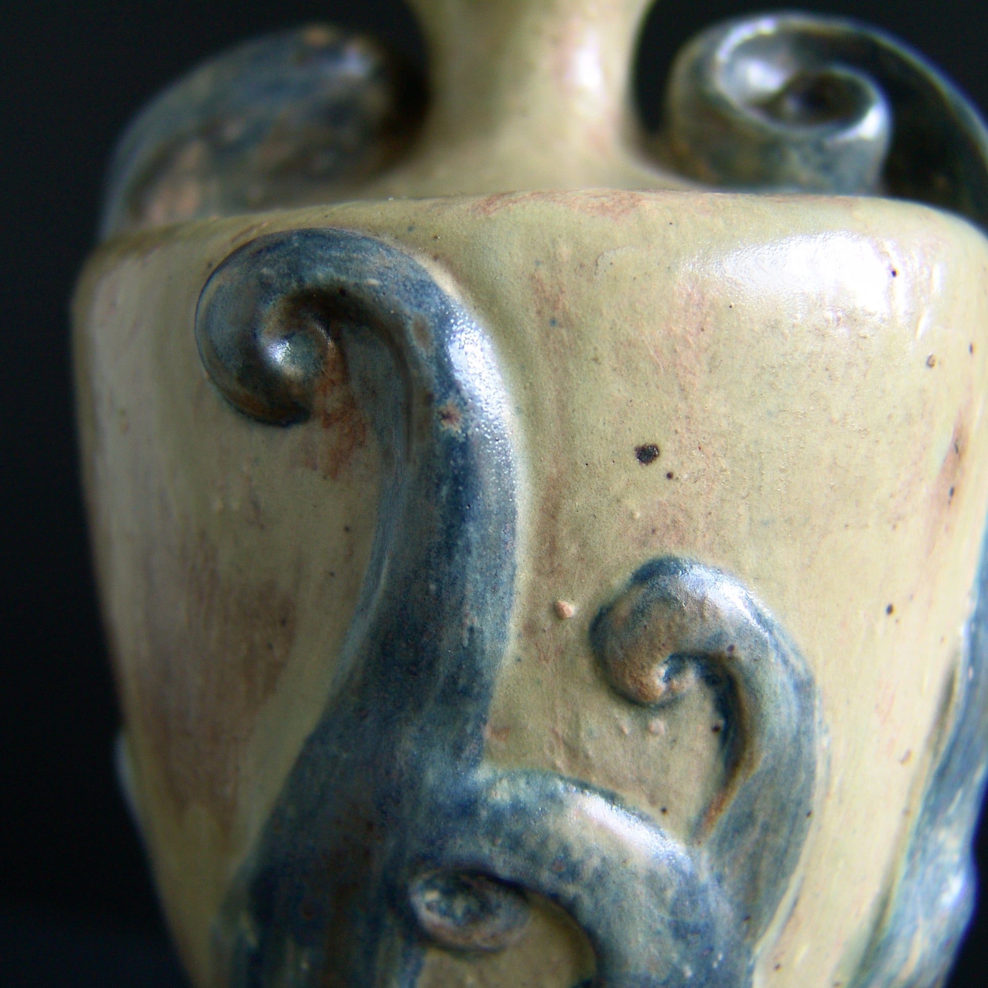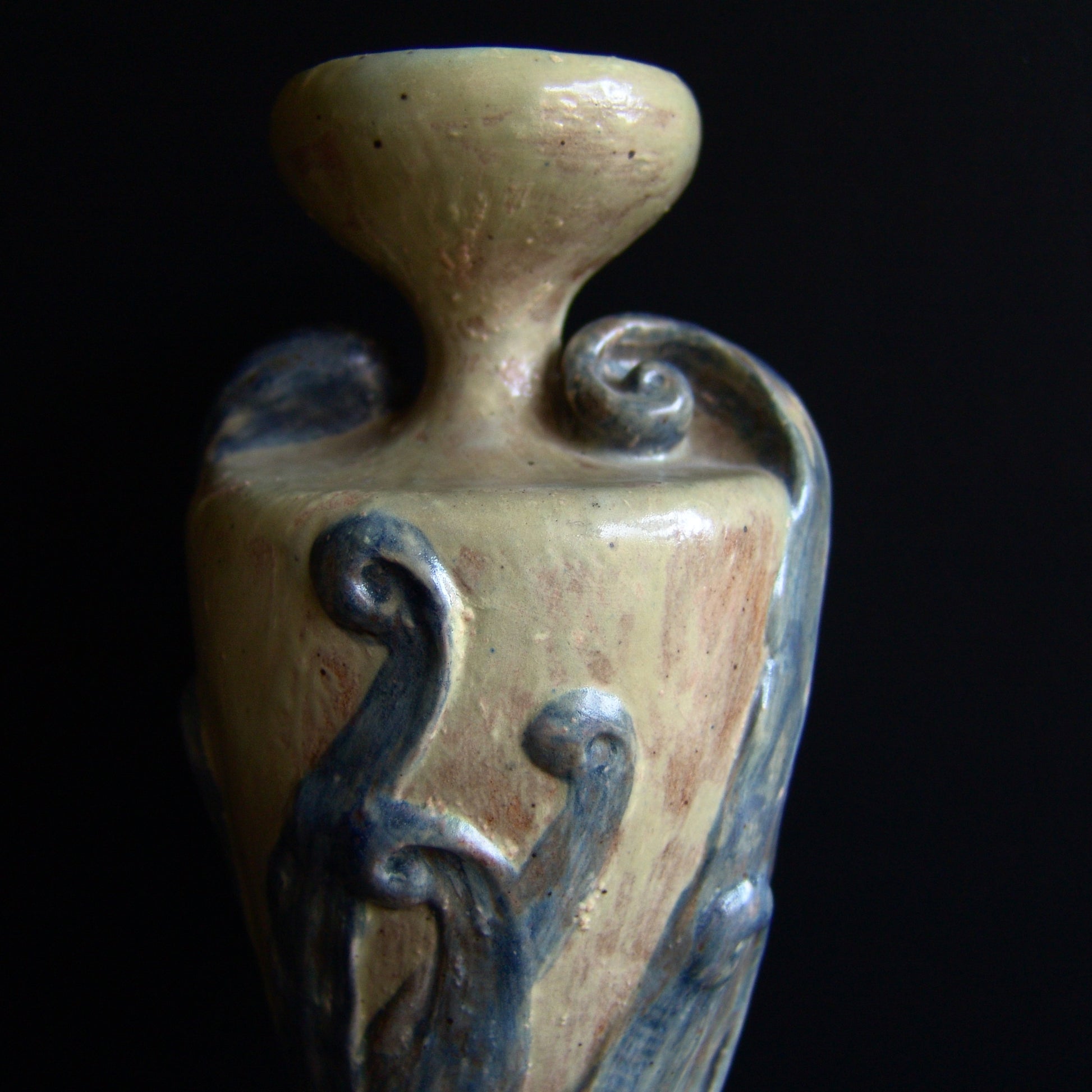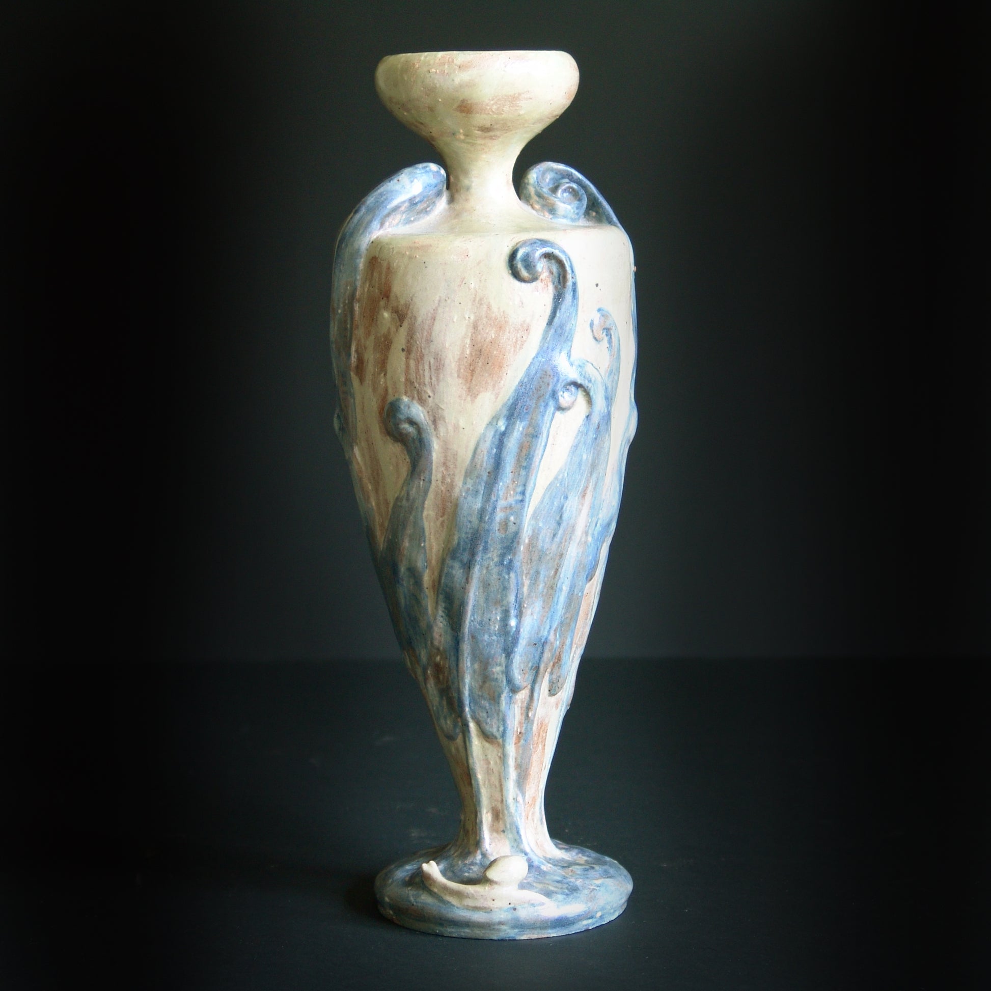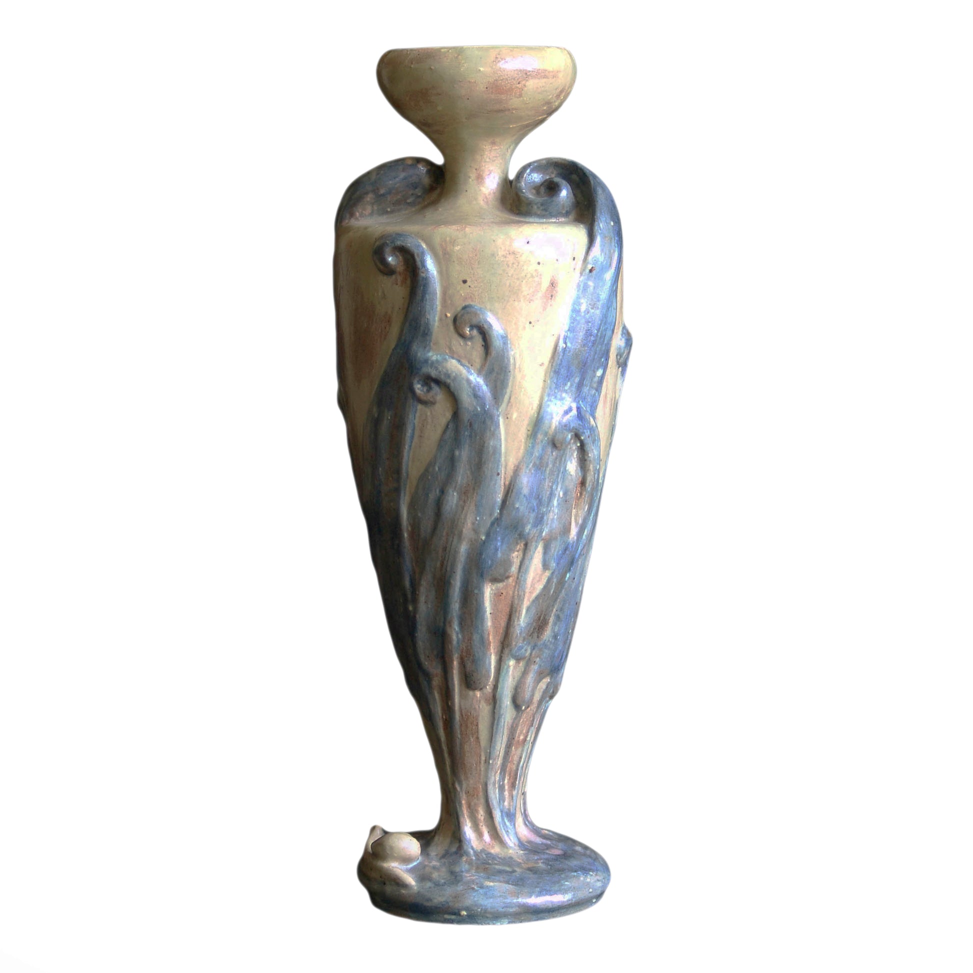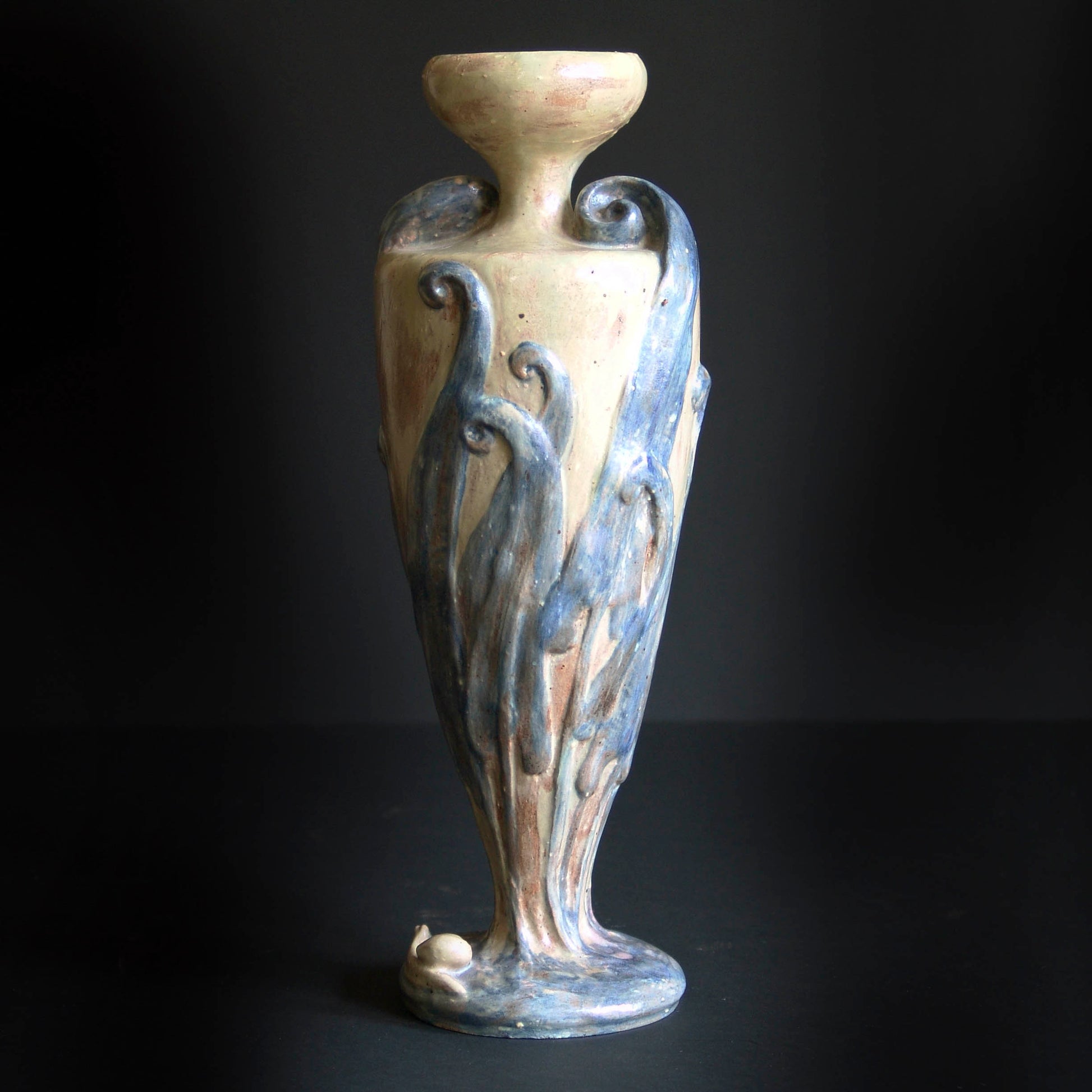 Zeldzame vaas van Louis Majorelle, uitgevoerd door Mougin in steengoed. De vaas heet Fougères, en we zien de bladeren van een tongvaren en op de voet van de vaas zit een slak met een slakkenhuis op zijn rug. We zien hier de liefde voor de natuur die zo voelbaar is in de Art nouveau van de Ecole de Nancy. De laatste foto stamt uit de originele catalogus van Majorelle, we zien hoe de vaas op een Majorelle tafeltje staat en hoe hij gebruikt wordt.