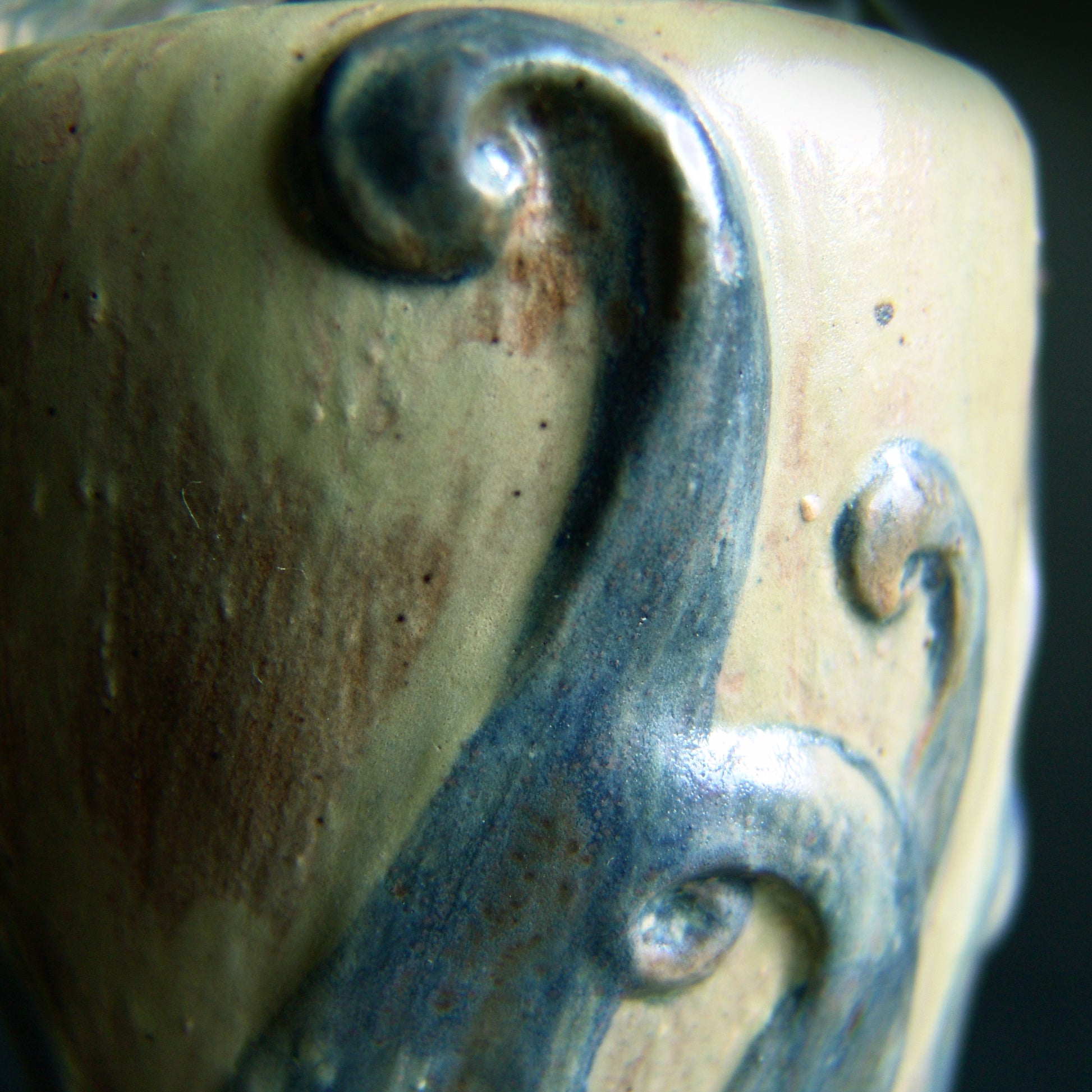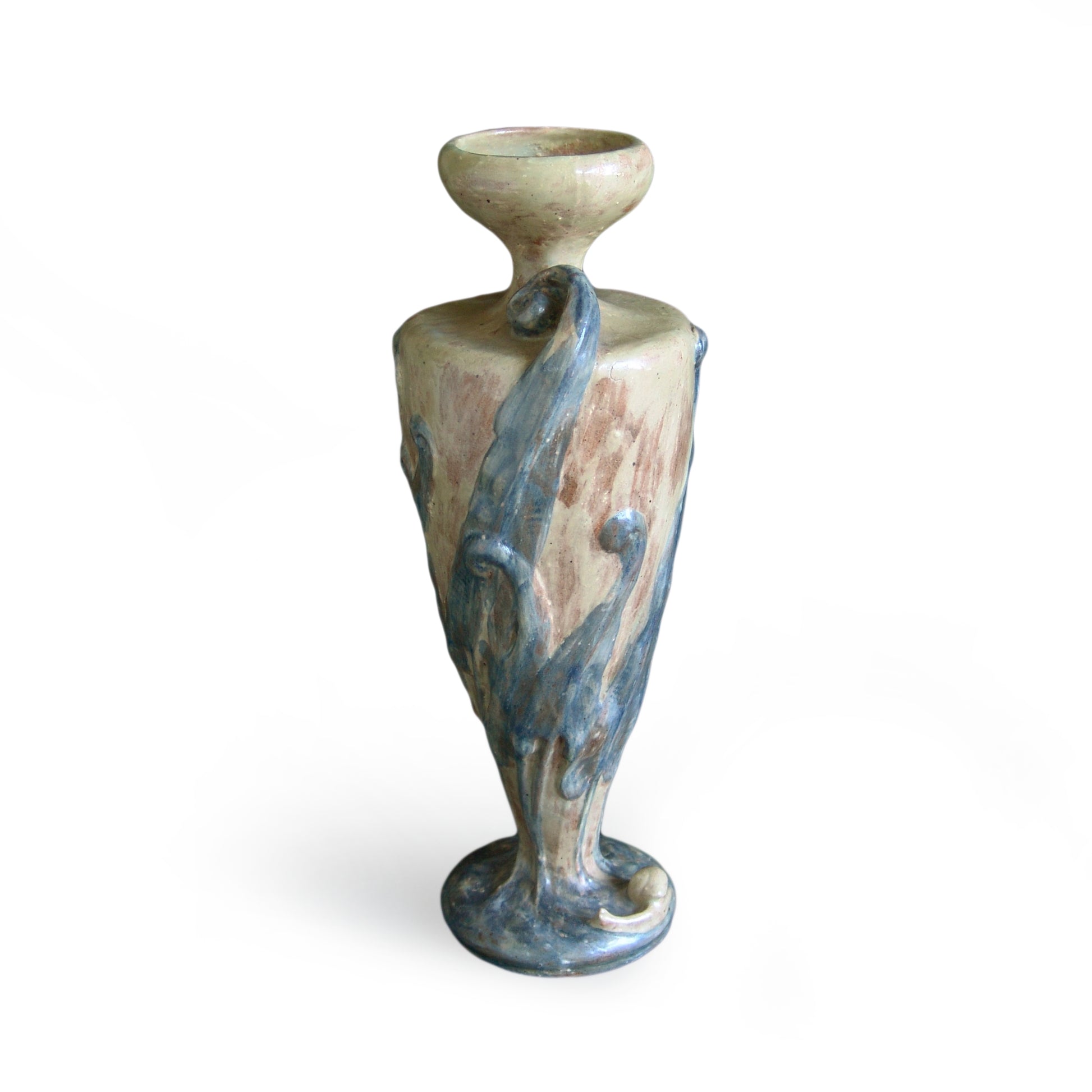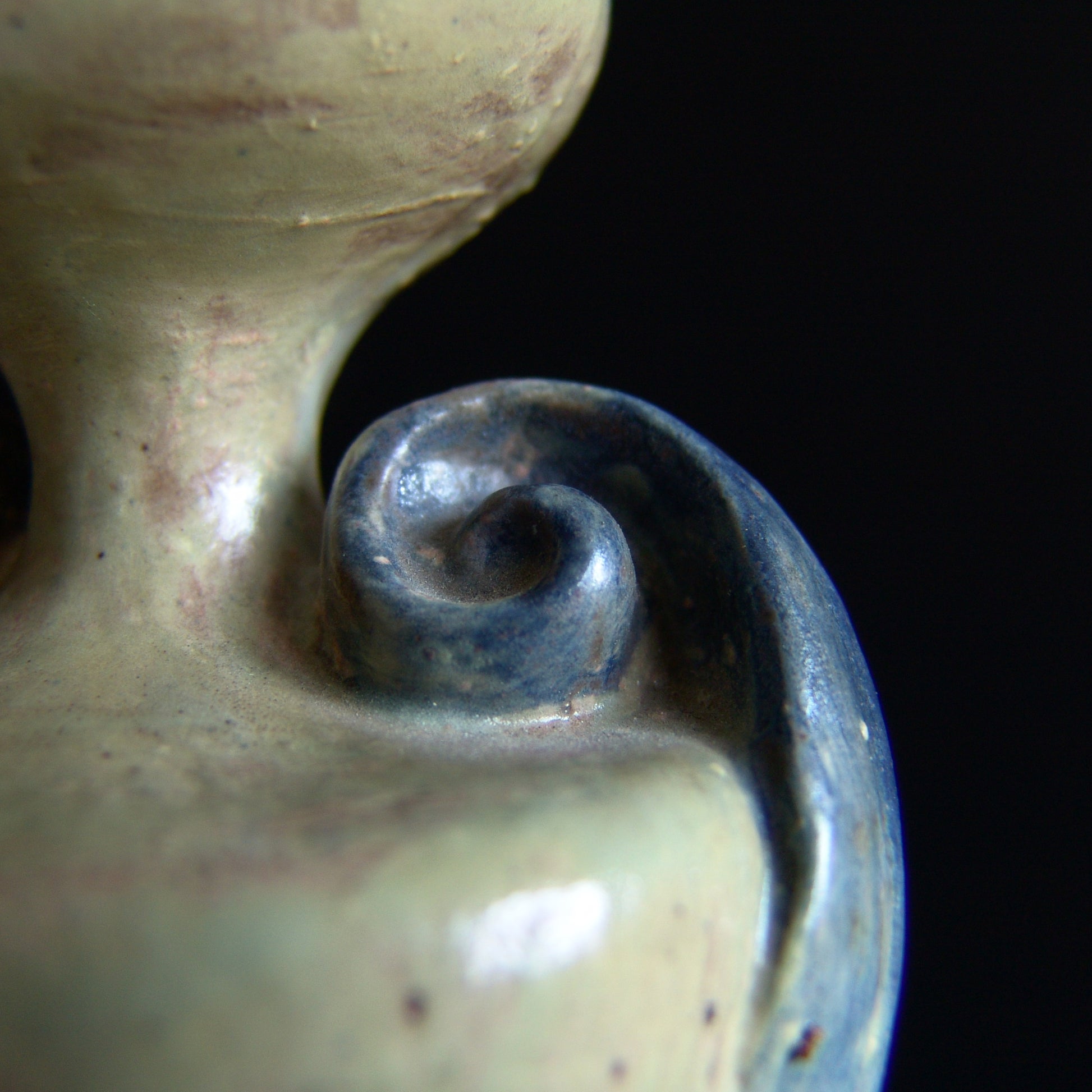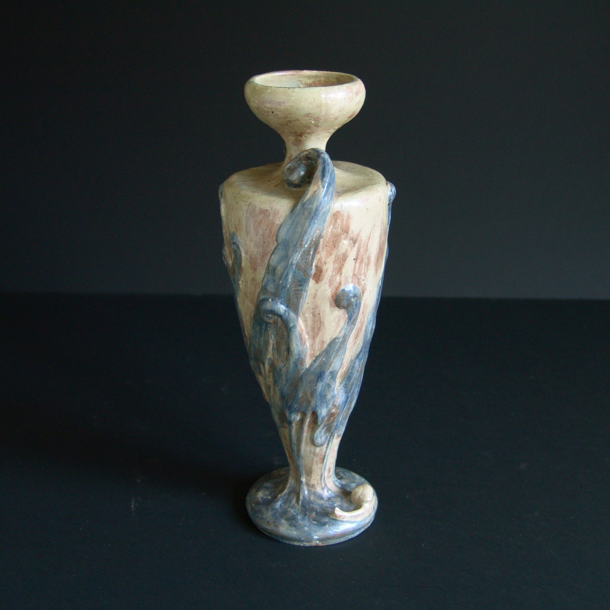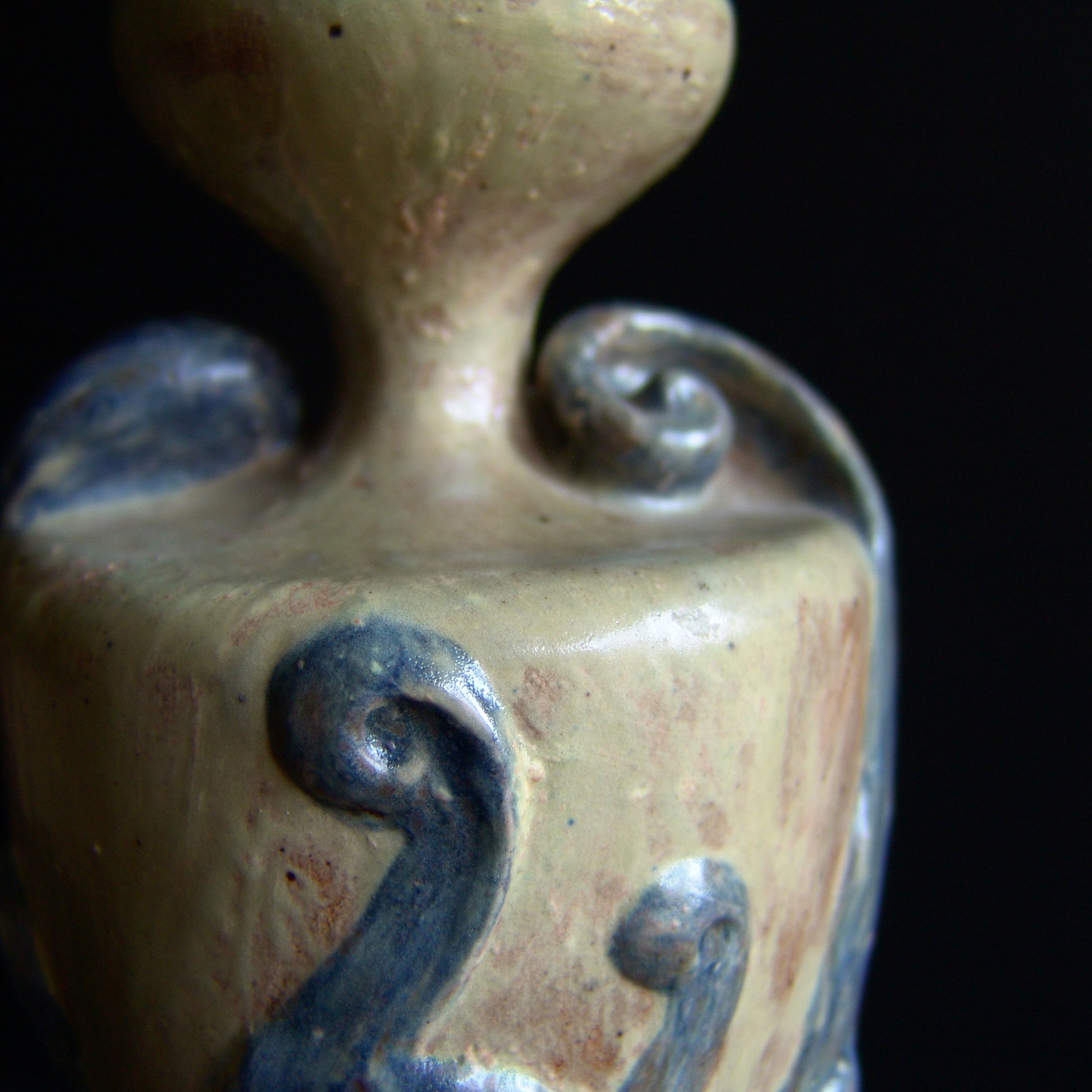 Zeldzame vaas van Louis Majorelle, uitgevoerd door Mougin in steengoed. De vaas heet Fougères, en we zien de bladeren van een tongvaren en op de voet van de vaas zit een slak met een slakkenhuis op zijn rug. We zien hier de liefde voor de natuur die zo voelbaar is in de Art nouveau van de Ecole de Nancy. De laatste foto stamt uit de originele catalogus van Majorelle, we zien hoe de vaas op een Majorelle tafeltje staat en hoe hij gebruikt wordt.