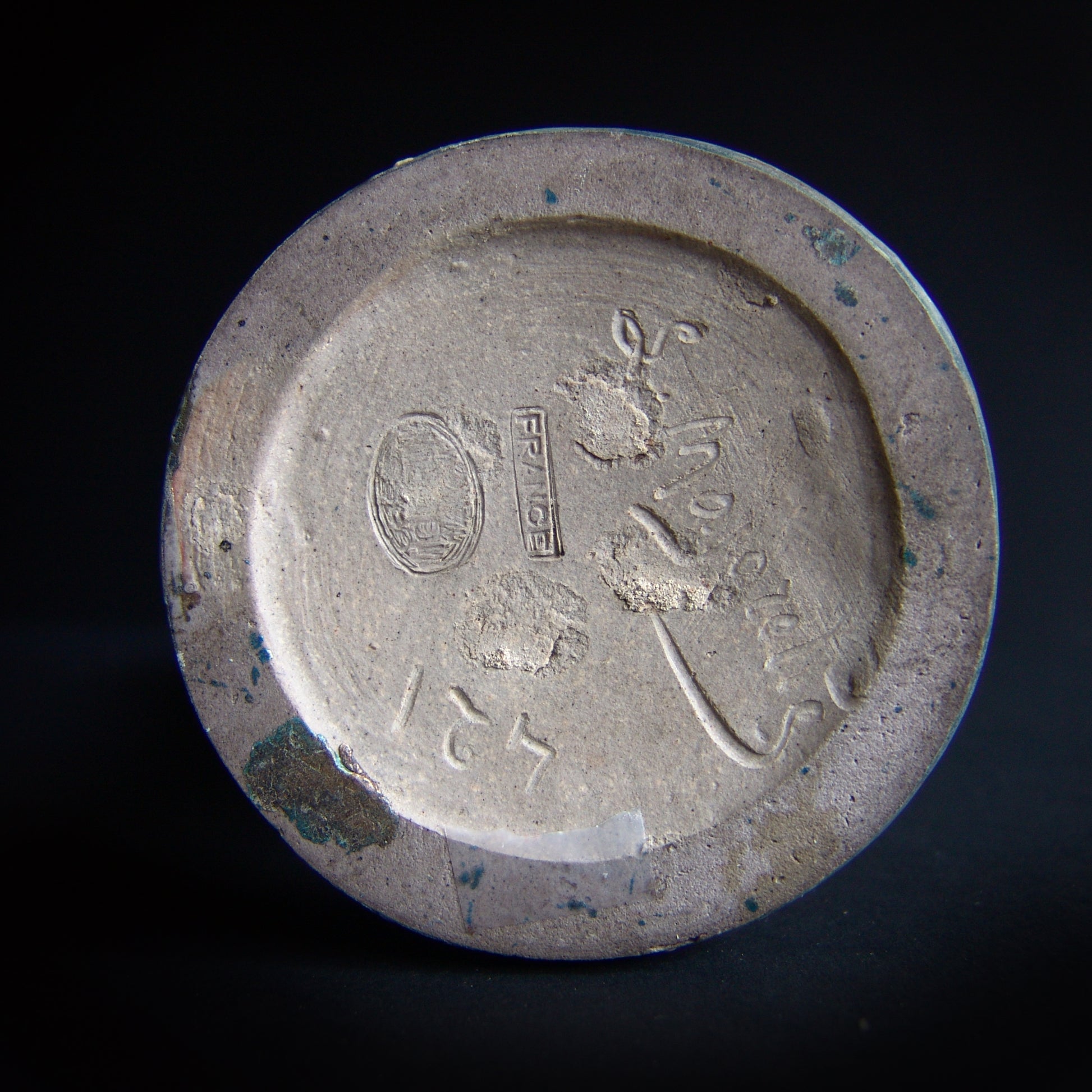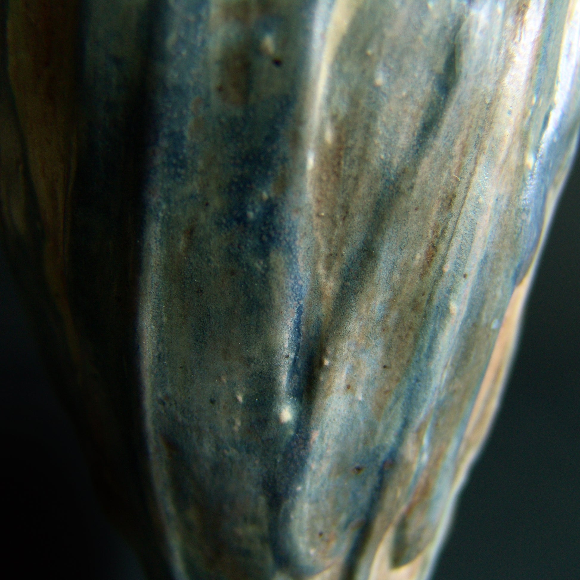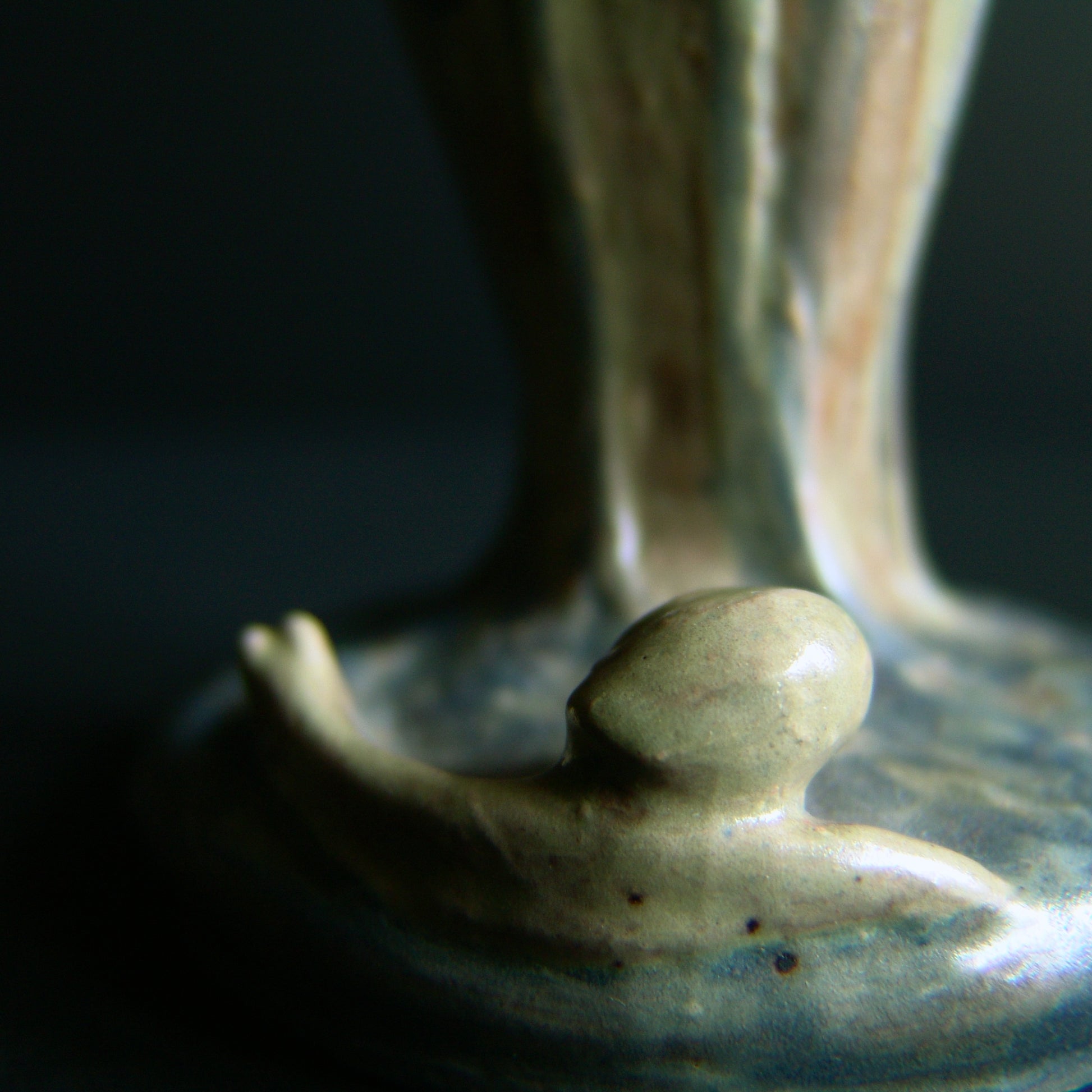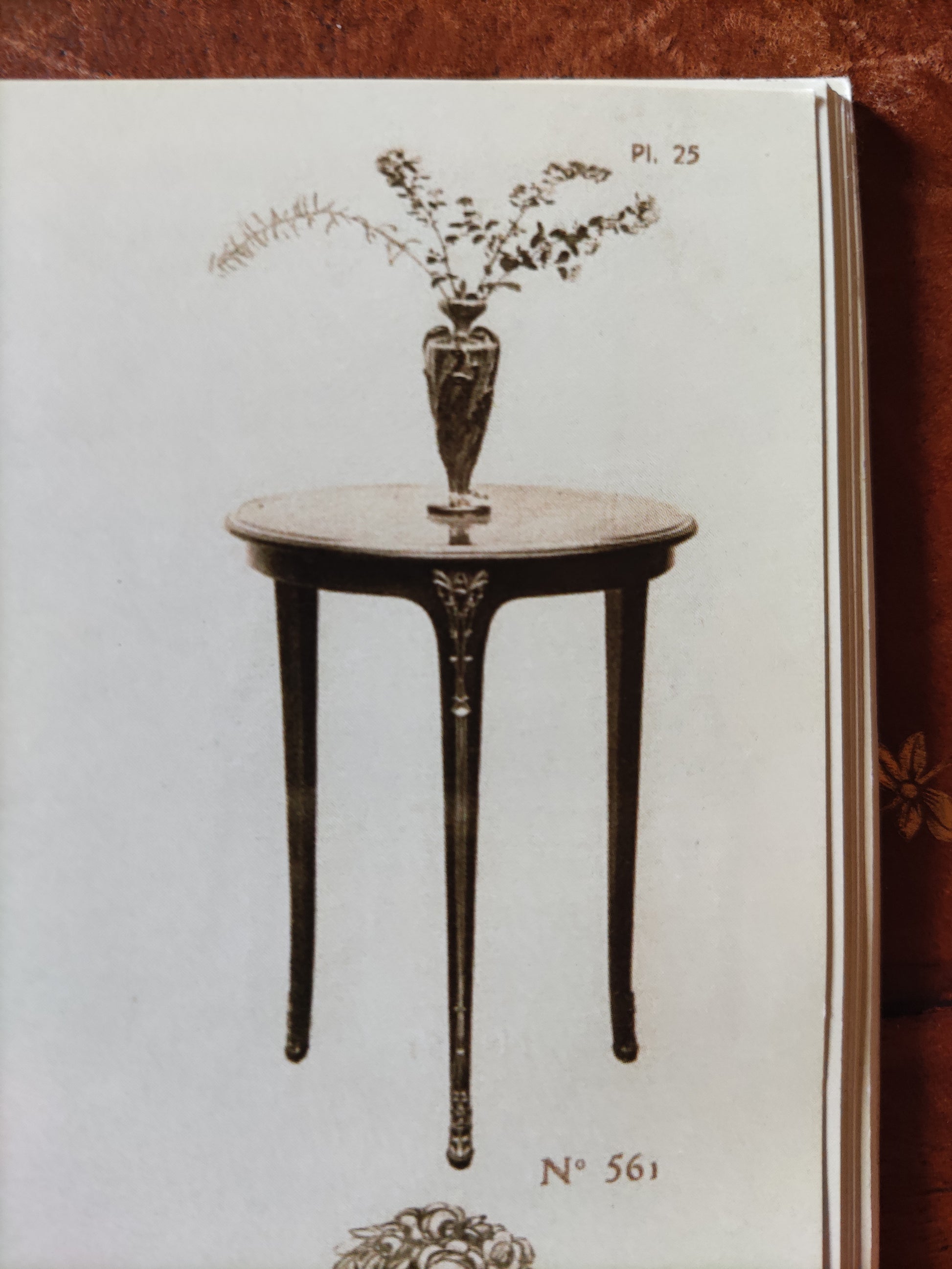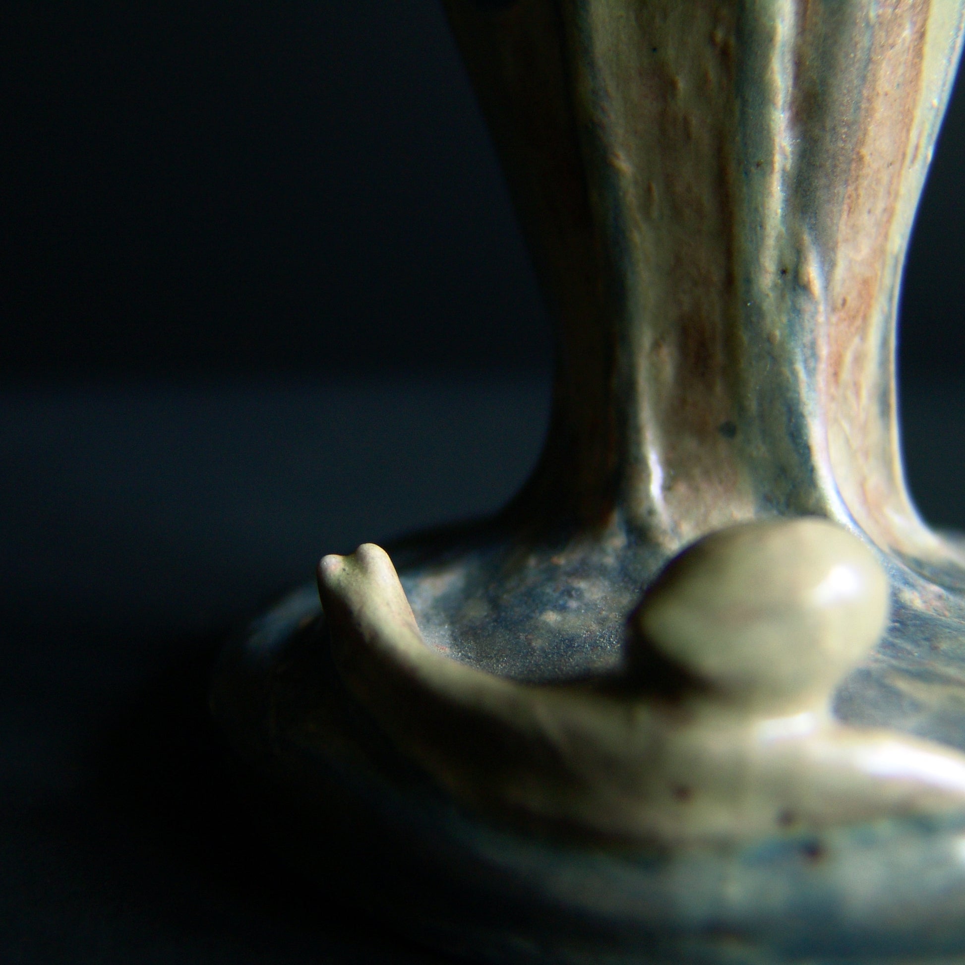Zeldzame vaas van Louis Majorelle, uitgevoerd door Mougin in steengoed. De vaas heet Fougères, en we zien de bladeren van een tongvaren en op de voet van de vaas zit een slak met een slakkenhuis op zijn rug. We zien hier de liefde voor de natuur die zo voelbaar is in de Art nouveau van de Ecole de Nancy. De laatste foto stamt uit de originele catalogus van Majorelle, we zien hoe de vaas op een Majorelle tafeltje staat en hoe hij gebruikt wordt.