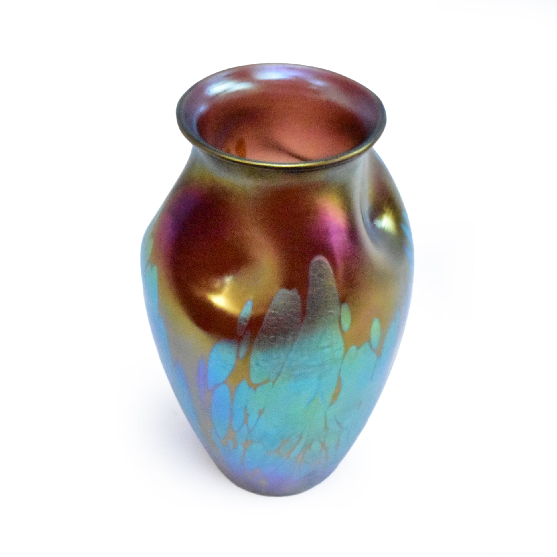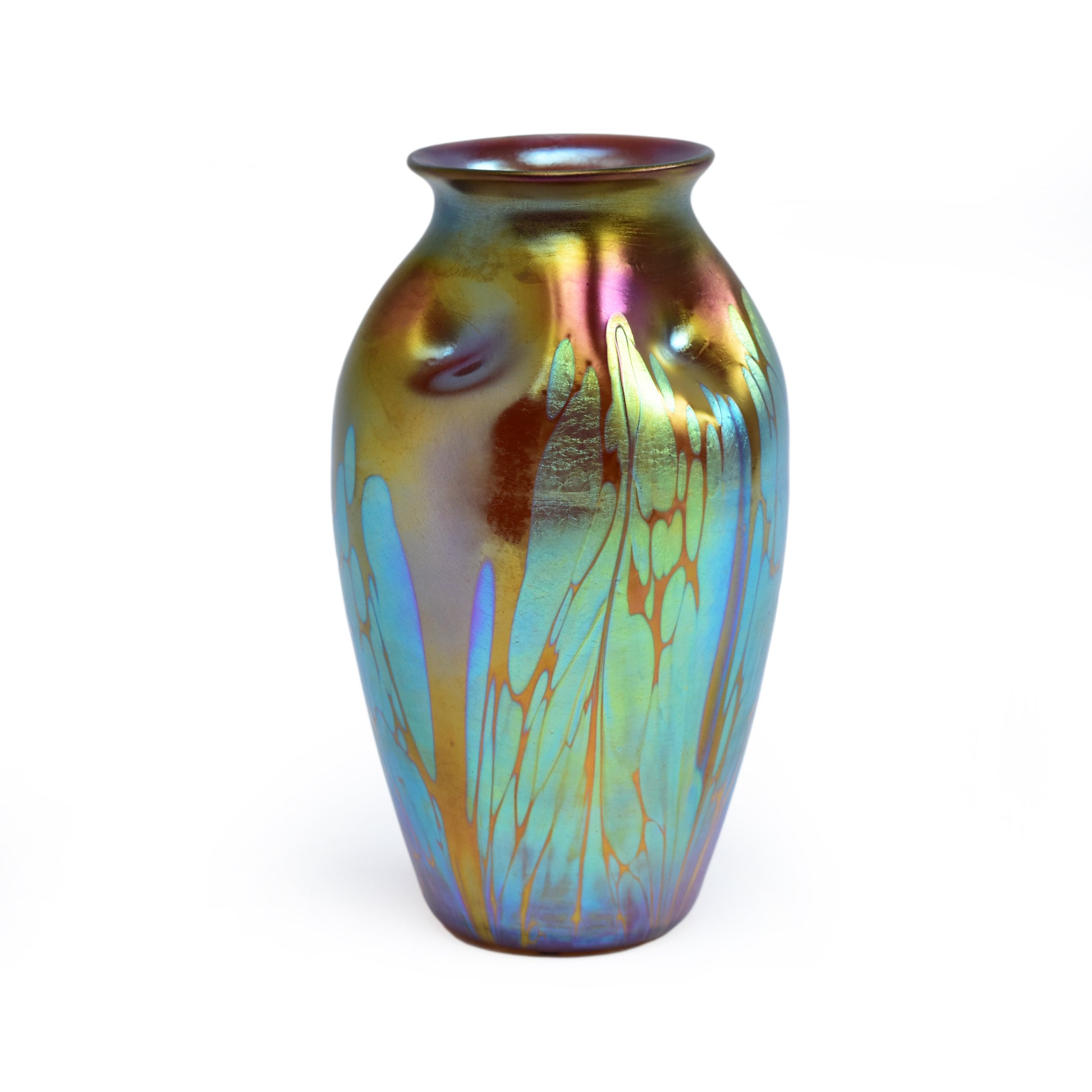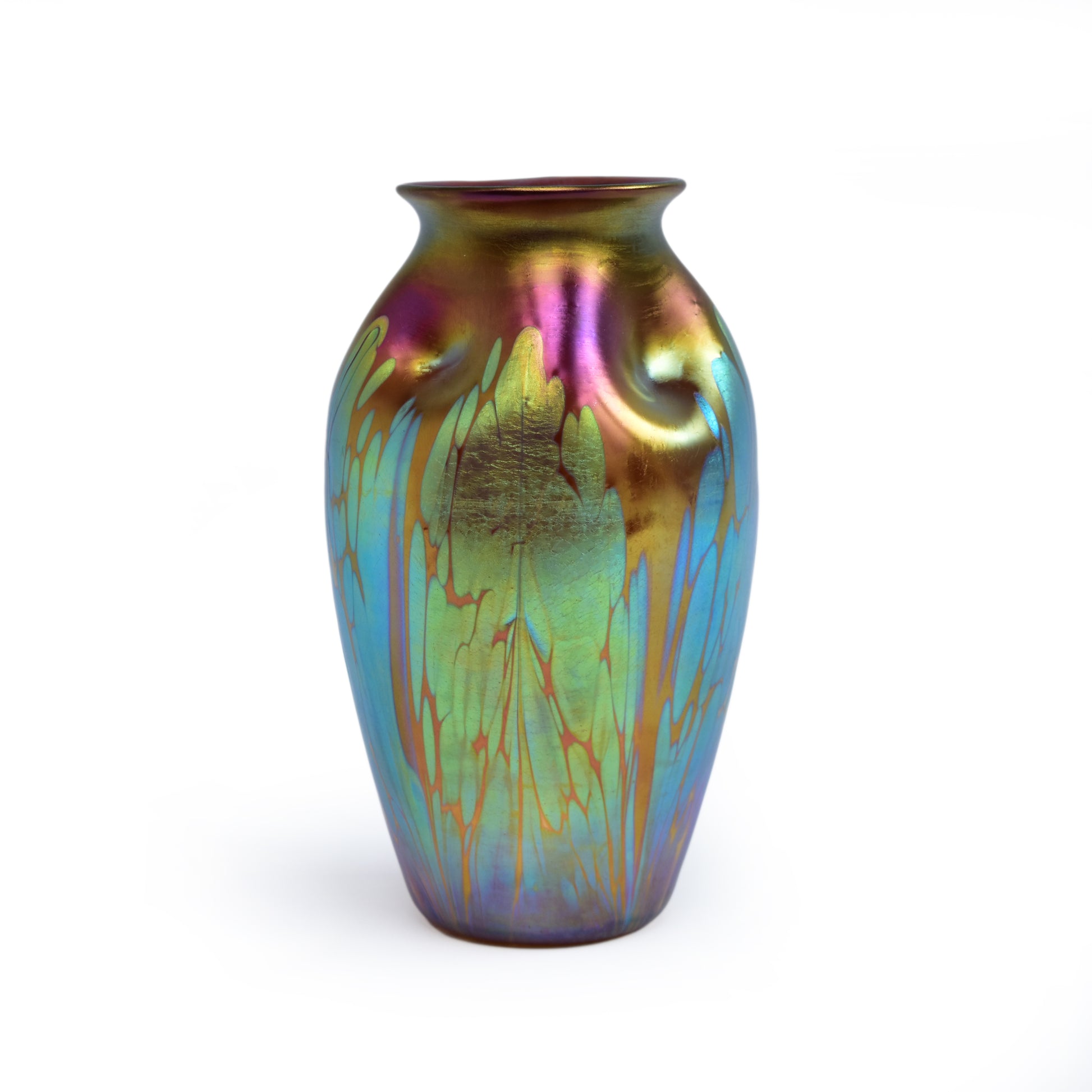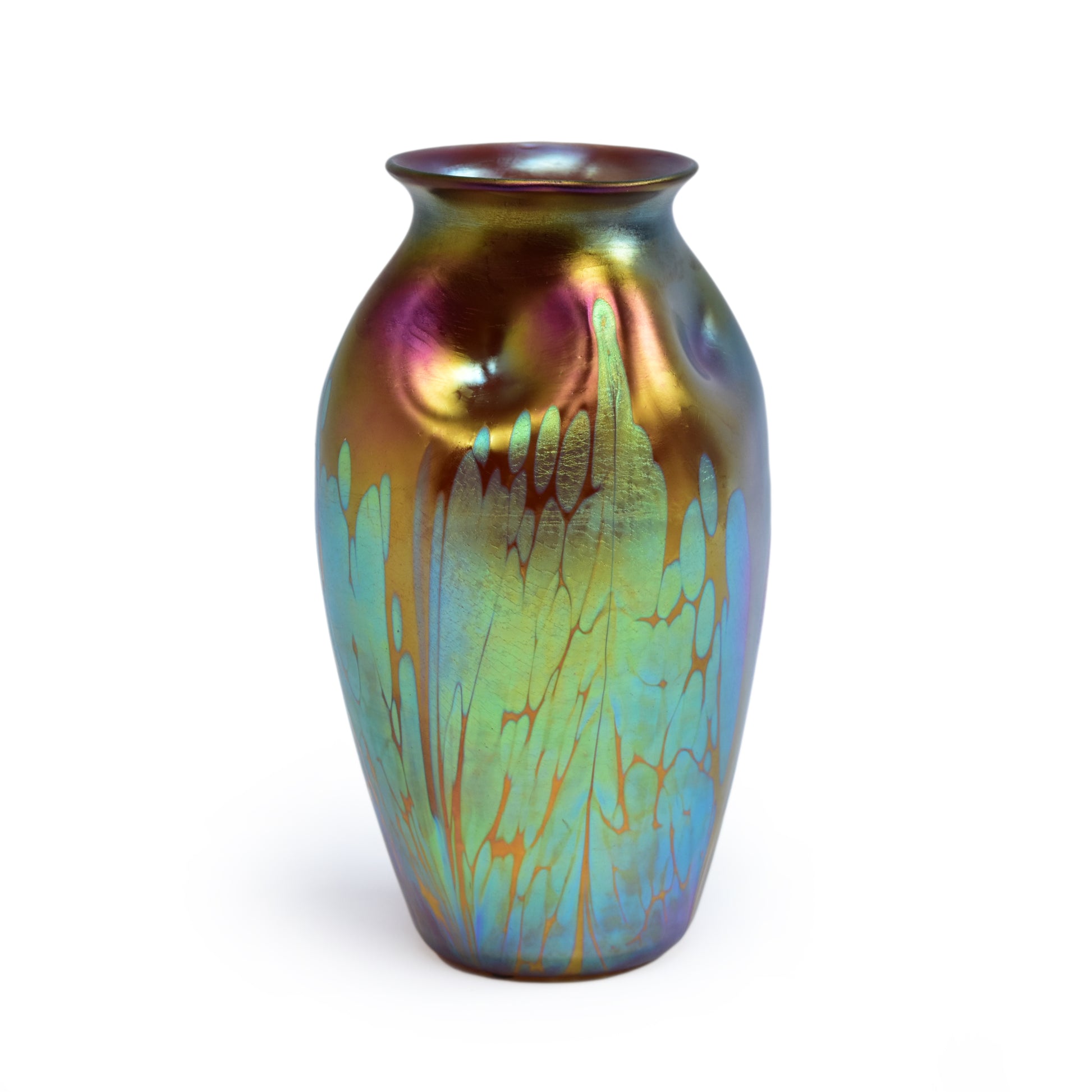 De iriserende kleuren van het Loetz glas waren bijzonder aantrekkelijk rond 1900. De decors werden meestal niet geschilderd of gedetailleerd aangebracht. De kunst lag bij het verwerken van de verschillende glassoorten en oxides tijdens het blazen van de vaas. Een proces dat alleen met het grootste vakmanschap en ervaring tot een succes kon worden gebracht. Een goed voorbeeld van de kracht van deze expertise zien we hier in deze vaas met Medici decor. De grondkleur van deze vaas is Kastaniën verlaufend. een warme kleur die de zilveroxide fel iriserende vlekken nog beter uit laten komen. De kleuren van dit exemplaar zijn zeer sterk en betoverend goed gelukt.