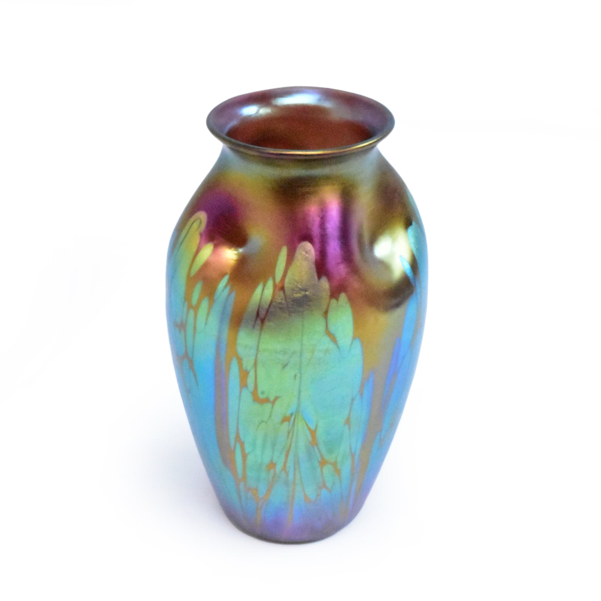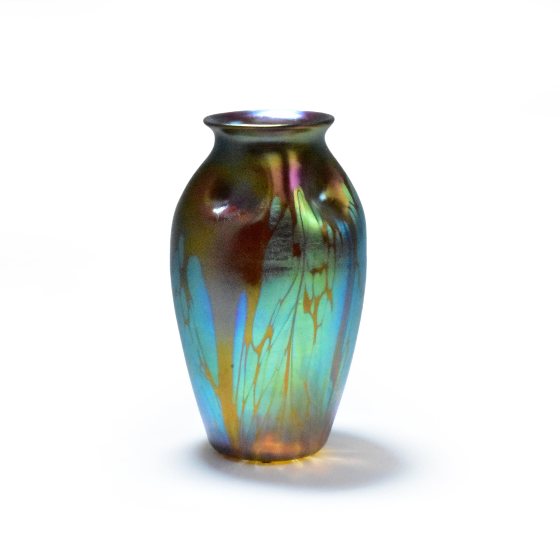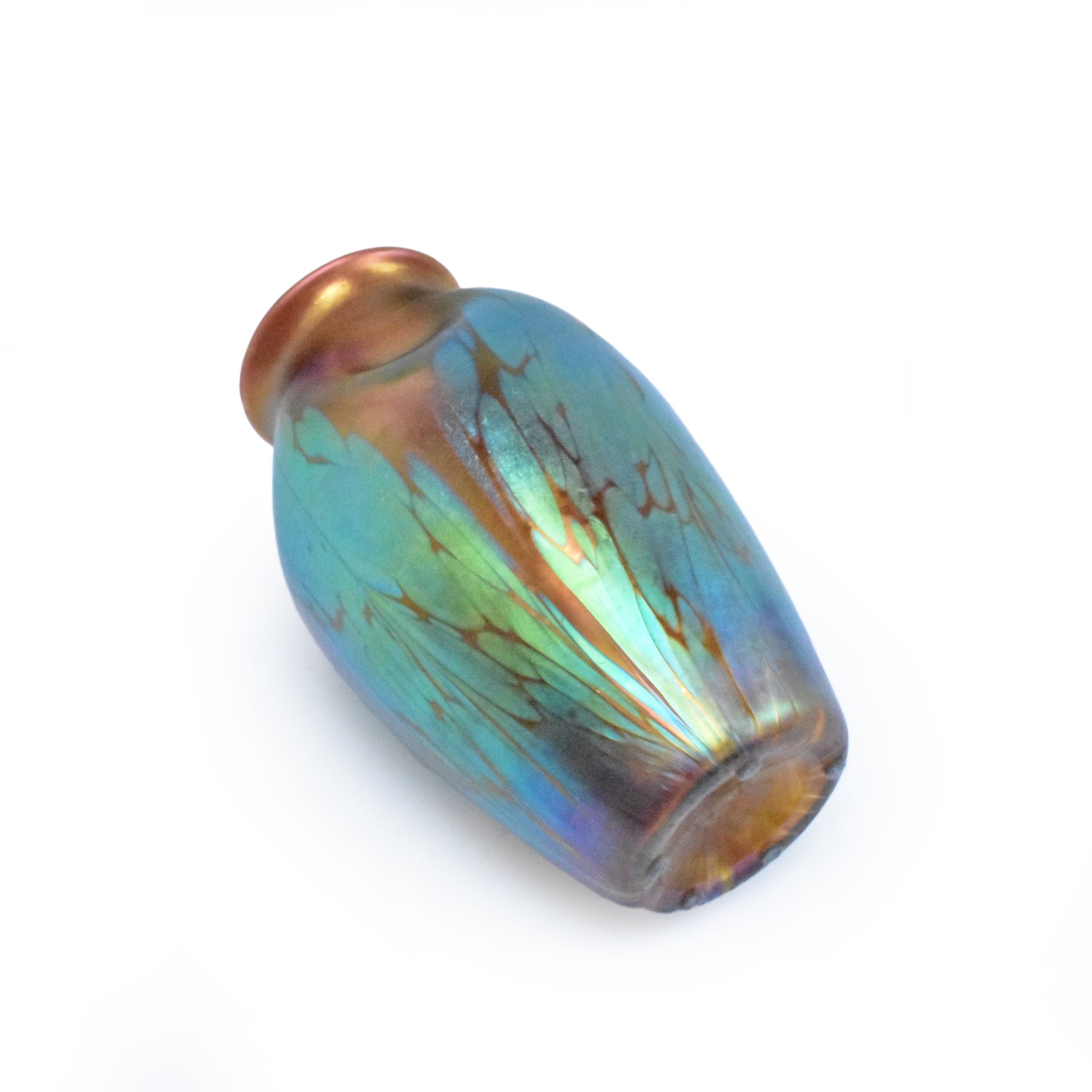 De iriserende kleuren van het Loetz glas waren bijzonder aantrekkelijk rond 1900. De decors werden meestal niet geschilderd of gedetailleerd aangebracht. De kunst lag bij het verwerken van de verschillende glassoorten en oxides tijdens het blazen van de vaas. Een proces dat alleen met het grootste vakmanschap en ervaring tot een succes kon worden gebracht. Een goed voorbeeld van de kracht van deze expertise zien we hier in deze vaas met Medici decor. De grondkleur van deze vaas is Kastaniën verlaufend. een warme kleur die de zilveroxide fel iriserende vlekken nog beter uit laten komen. De kleuren van dit exemplaar zijn zeer sterk en betoverend goed gelukt.