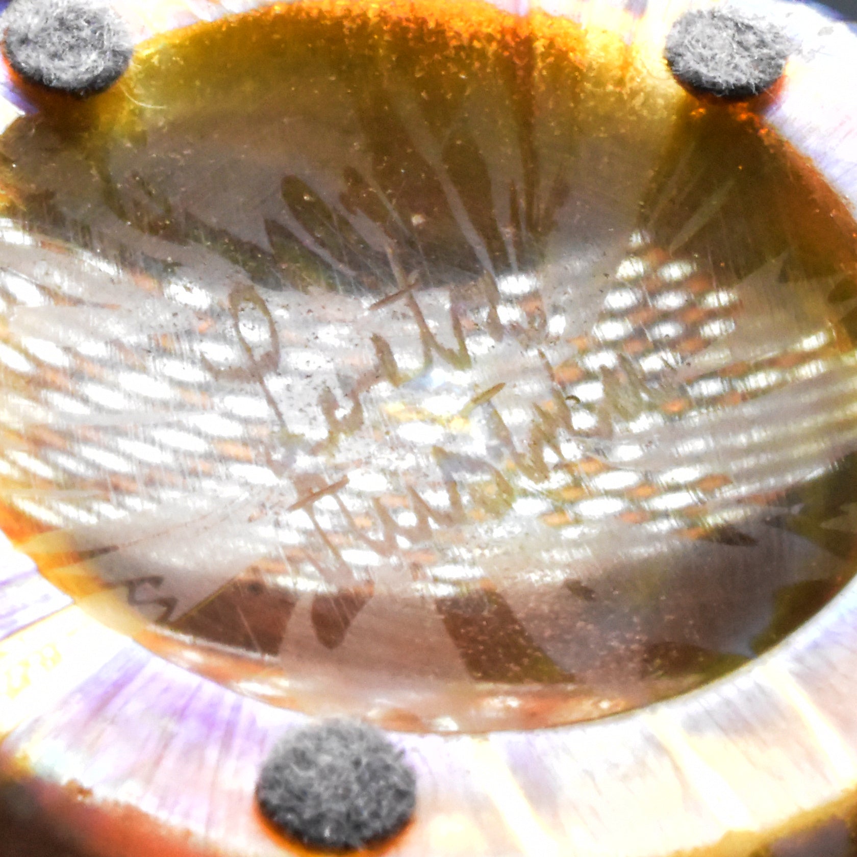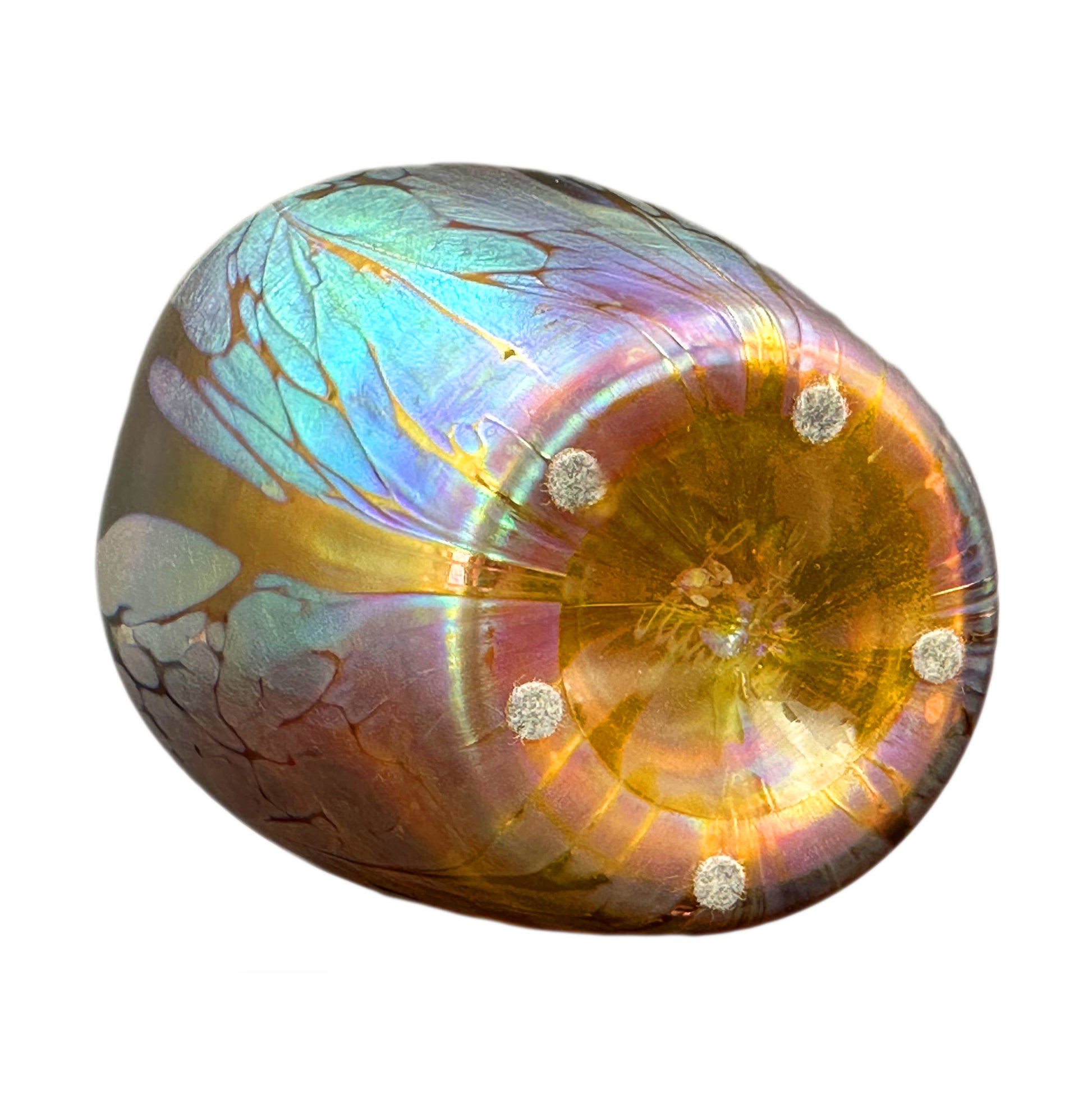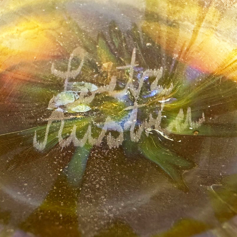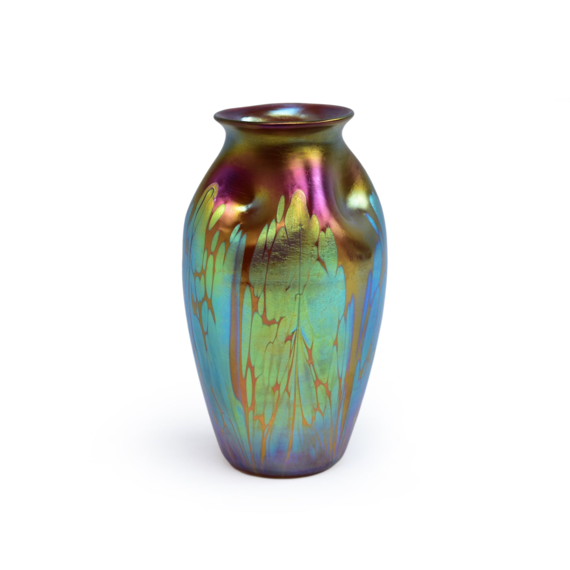 De iriserende kleuren van het Loetz glas waren bijzonder aantrekkelijk rond 1900. De decors werden meestal niet geschilderd of gedetailleerd aangebracht. De kunst lag bij het verwerken van de verschillende glassoorten en oxides tijdens het blazen van de vaas. Een proces dat alleen met het grootste vakmanschap en ervaring tot een succes kon worden gebracht. Een goed voorbeeld van de kracht van deze expertise zien we hier in deze vaas met Medici decor. De grondkleur van deze vaas is Kastaniën verlaufend. een warme kleur die de zilveroxide fel iriserende vlekken nog beter uit laten komen. De kleuren van dit exemplaar zijn zeer sterk en betoverend goed gelukt.