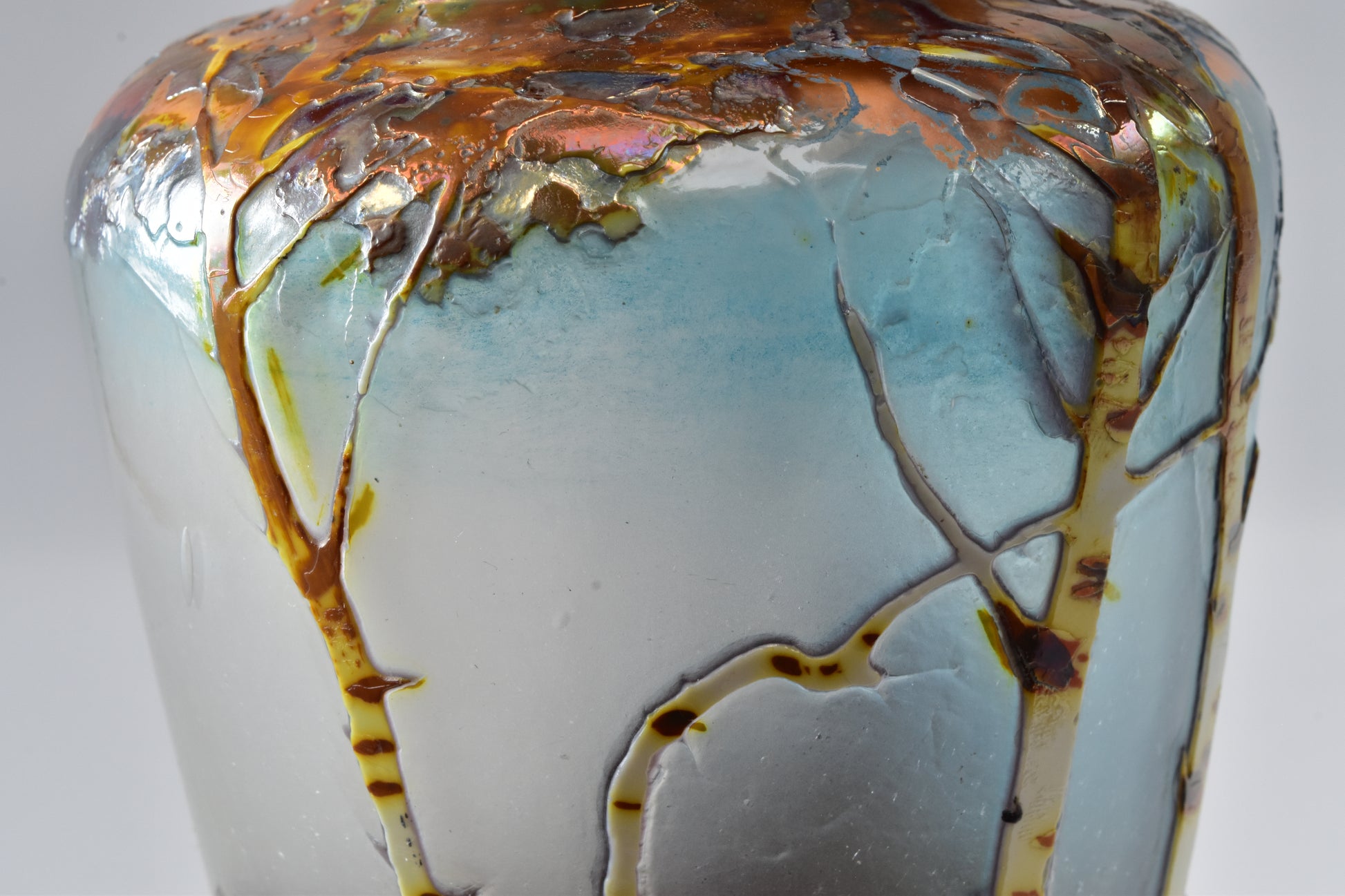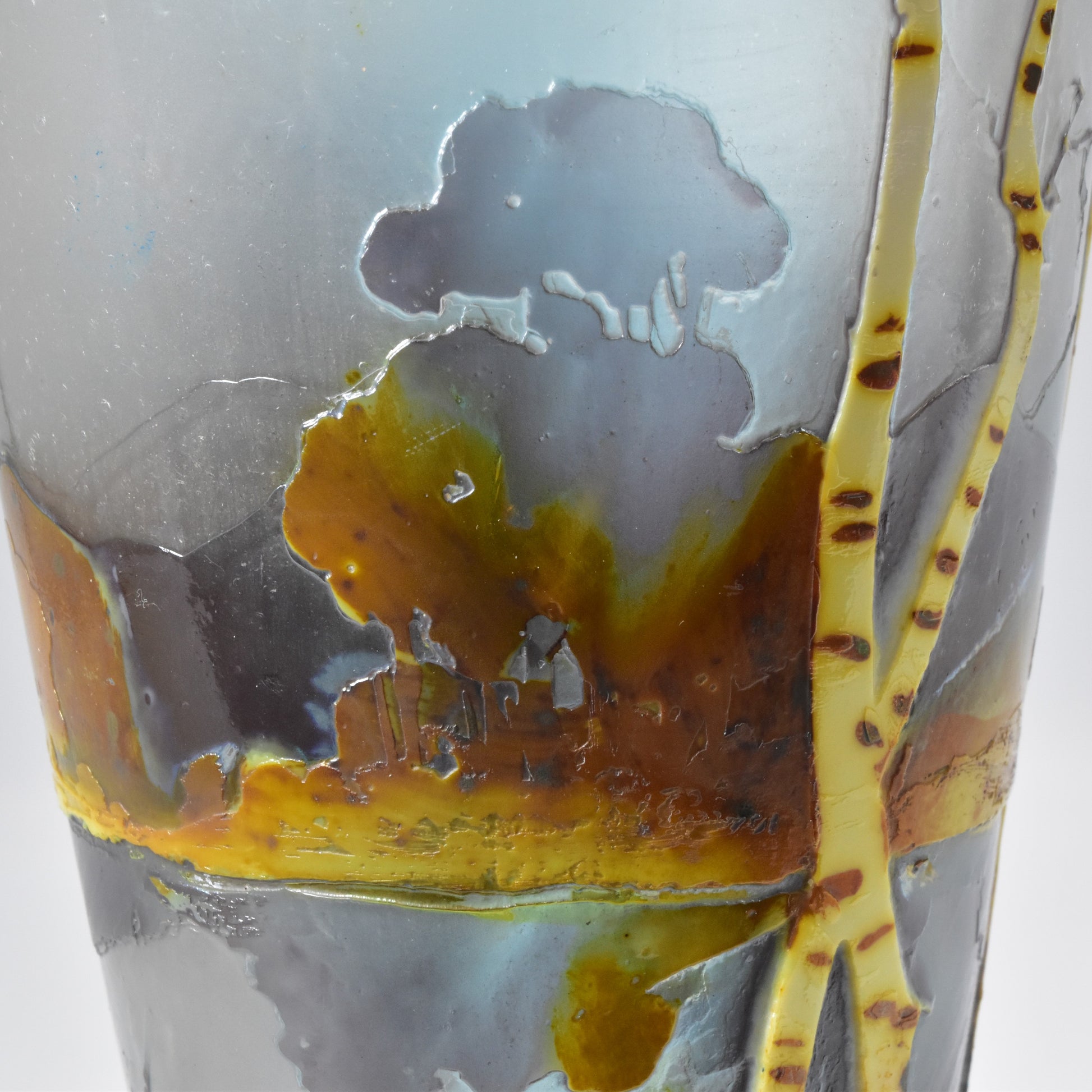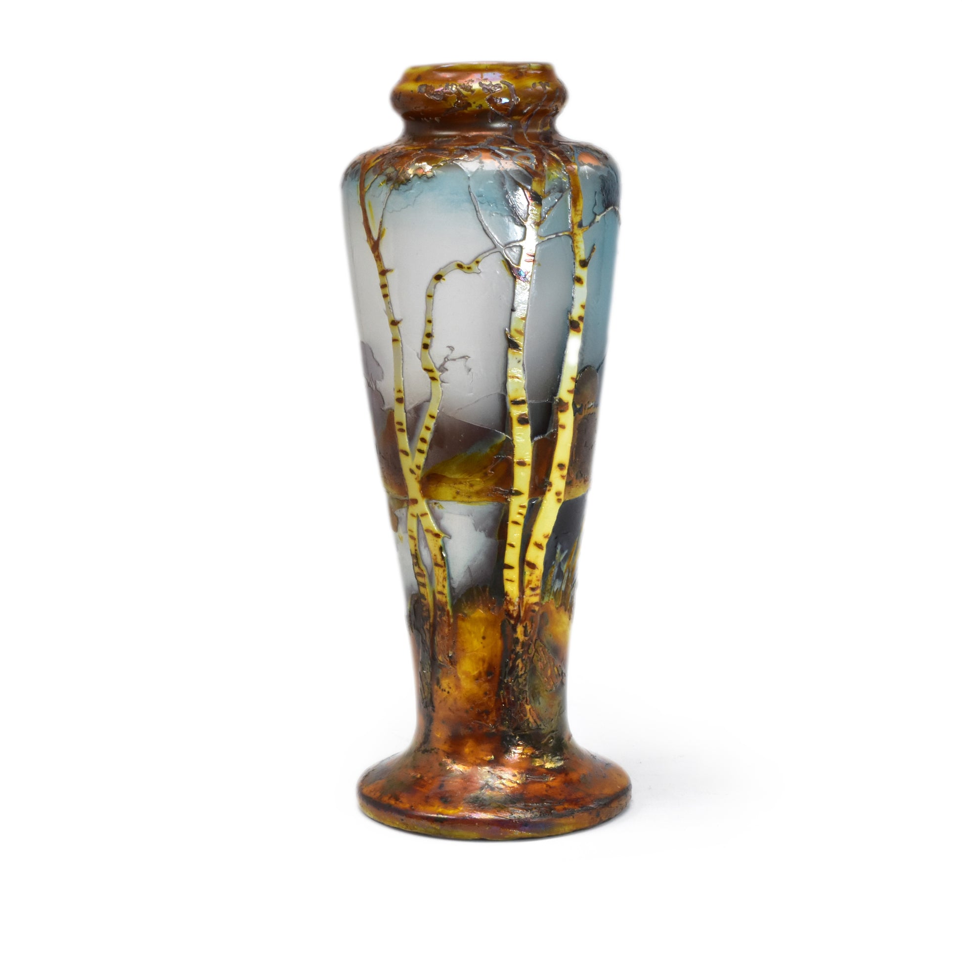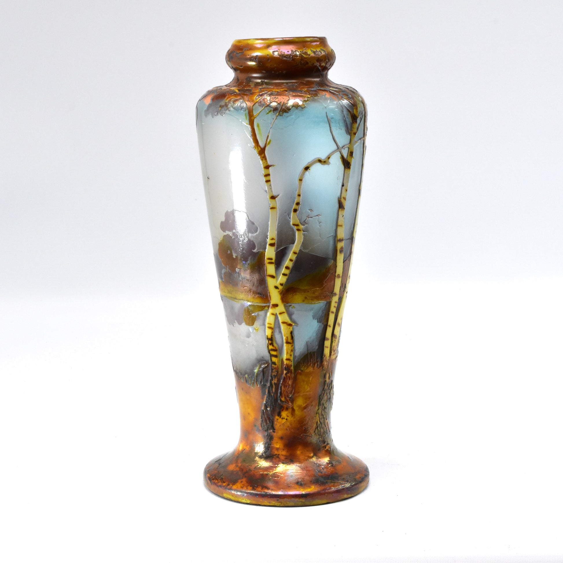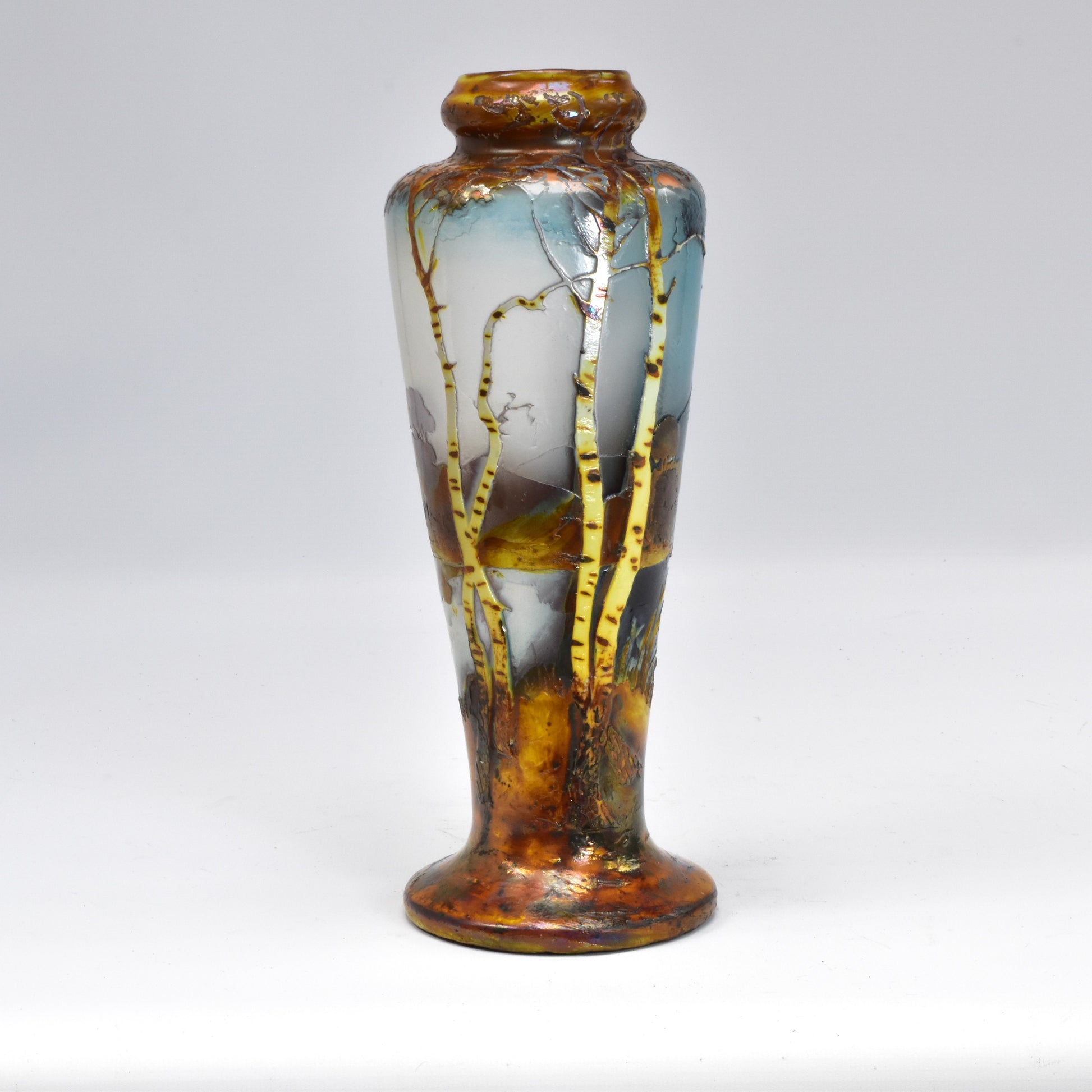 Deze vaas van Muller Frères laat de bijzondere techniek en het hoge artistieke niveau van de gebroeders Désiré en Eugène Muller zien. Naast de fluogravure techniek zien we ook emaille en reductie-schildering technieken. De basis is helder glas met daarover een laag transparant pruisischblauw glas. Door de subtiele manier van etsen bereikten ze ook kleurverloop in de blauwe glaslaag. Daarover bevindt zich een opaak witte glaslaag die vervolgens geemailleerd en reductie geschilderd is waardoor de koper en zilver oxiden een parelmoer achtige reflectie geven. In de verte zien we bergen. Op de achtergrond een meer en op de voorgrond berkenbomen in de herfst. het ritme van de bomen en de prachtige kleuren passen perfect bij de vorm van de vaas.