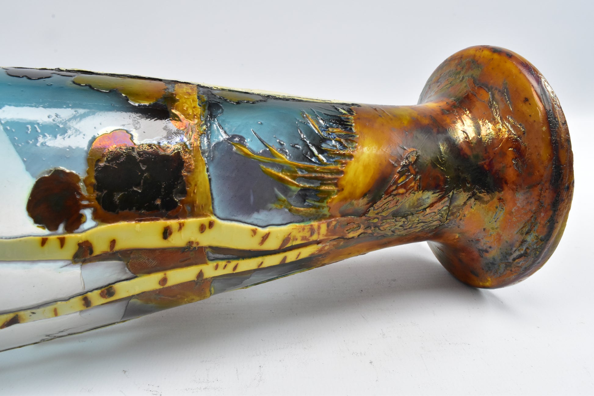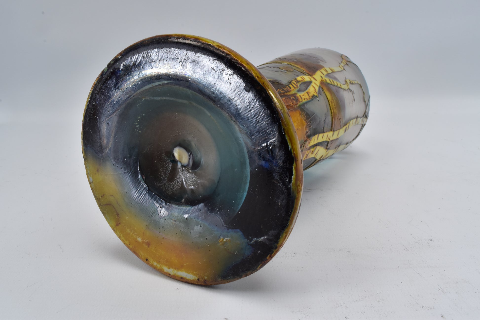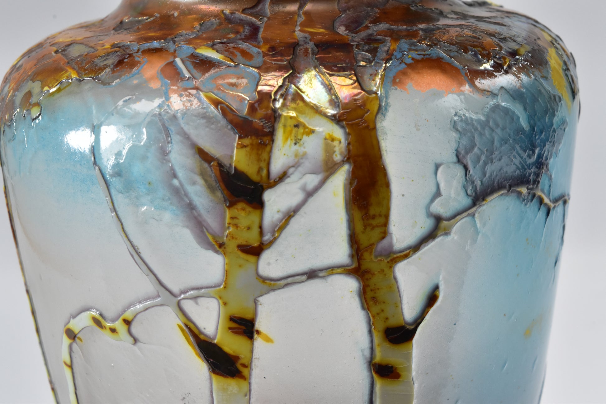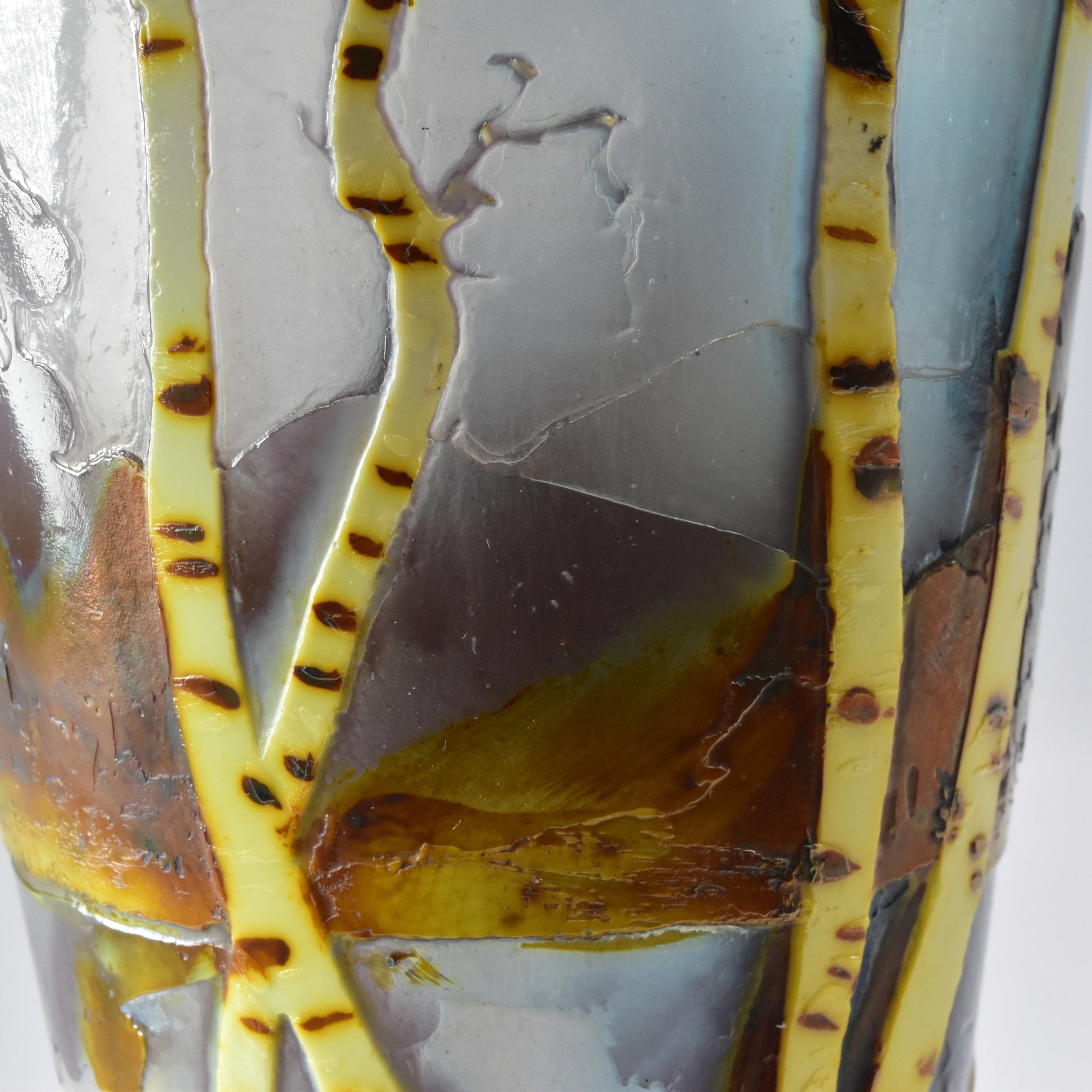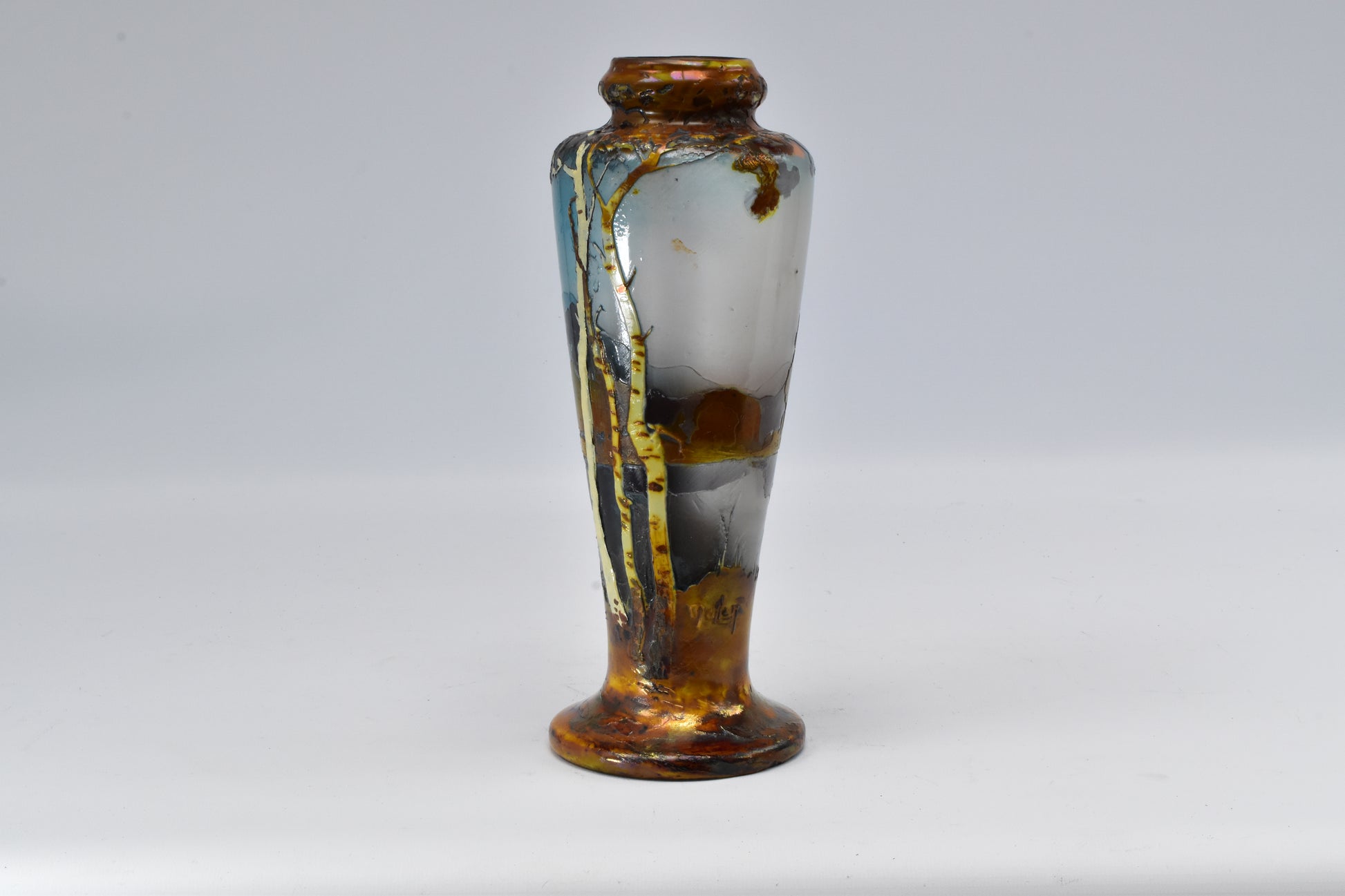 Deze vaas van Muller Frères laat de bijzondere techniek en het hoge artistieke niveau van de gebroeders Désiré en Eugène Muller zien. Naast de fluogravure techniek zien we ook emaille en reductie-schildering technieken. De basis is helder glas met daarover een laag transparant pruisischblauw glas. Door de subtiele manier van etsen bereikten ze ook kleurverloop in de blauwe glaslaag. Daarover bevindt zich een opaak witte glaslaag die vervolgens geemailleerd en reductie geschilderd is waardoor de koper en zilver oxiden een parelmoer achtige reflectie geven. In de verte zien we bergen. Op de achtergrond een meer en op de voorgrond berkenbomen in de herfst. het ritme van de bomen en de prachtige kleuren passen perfect bij de vorm van de vaas.
