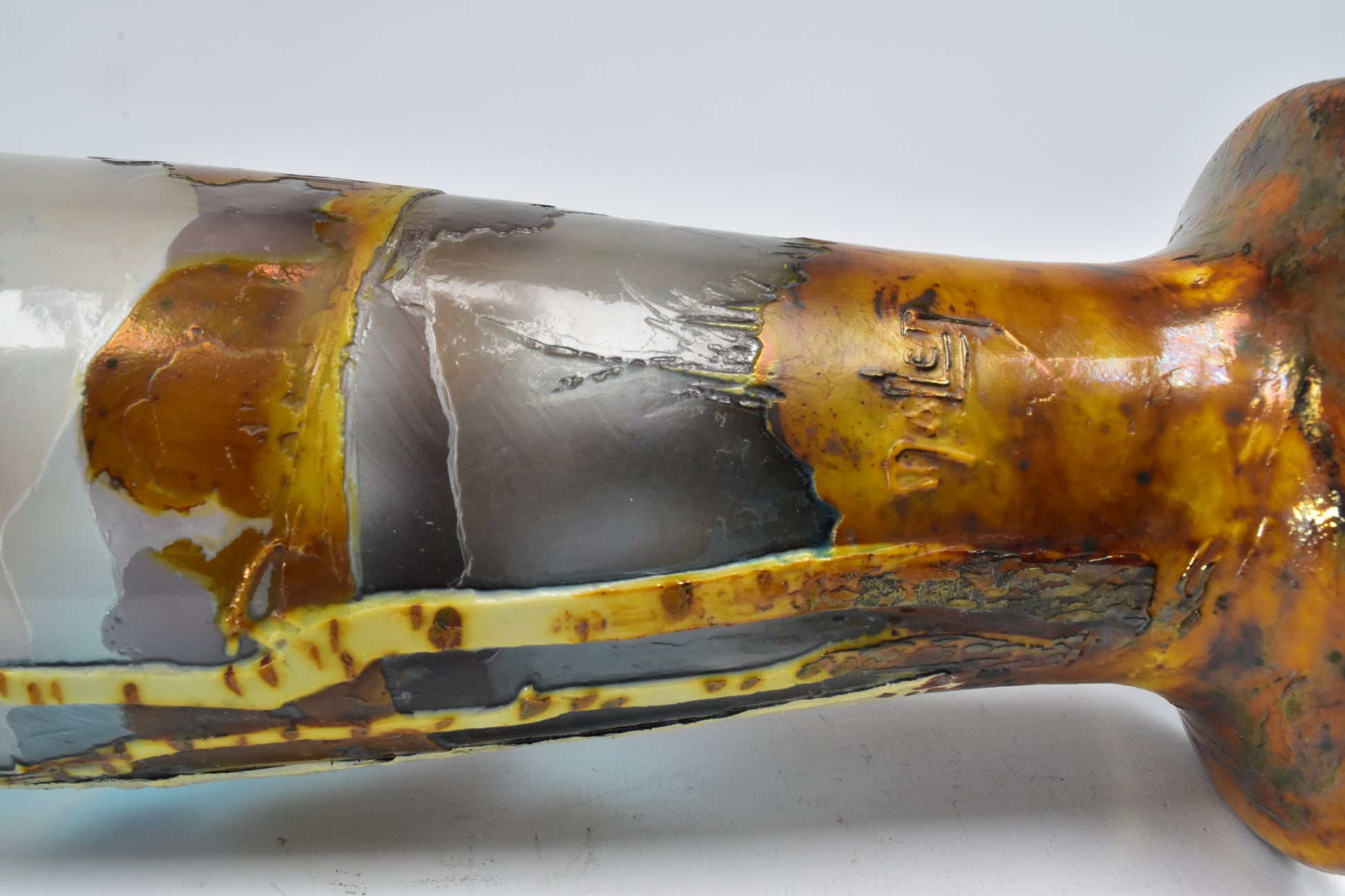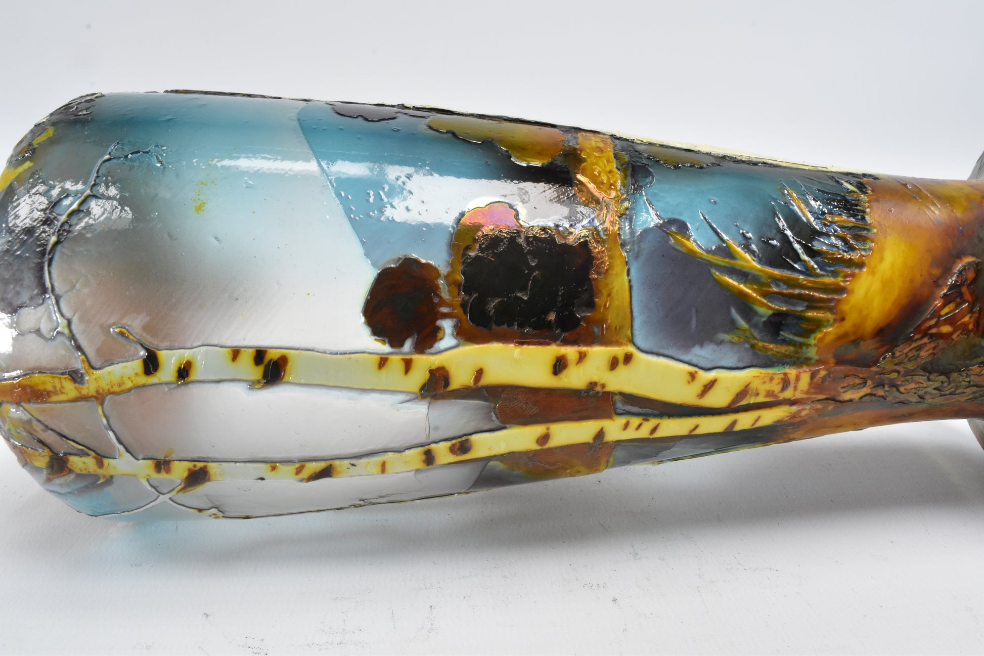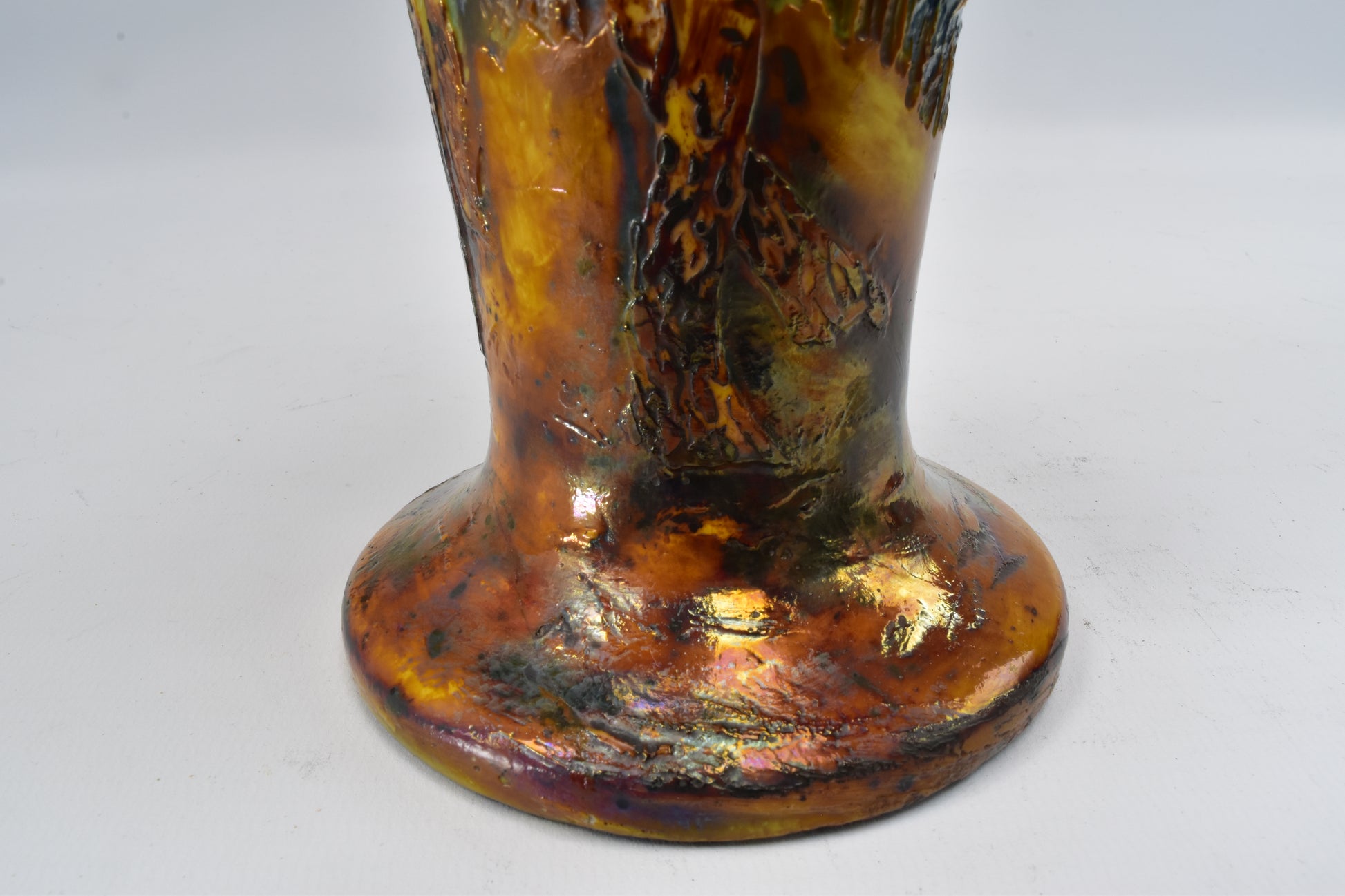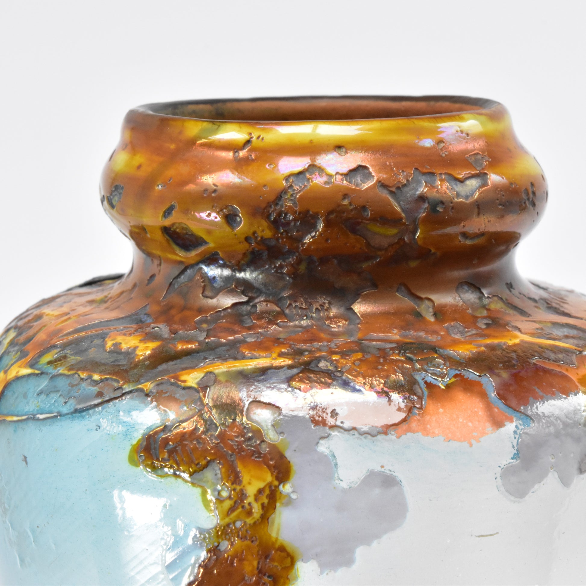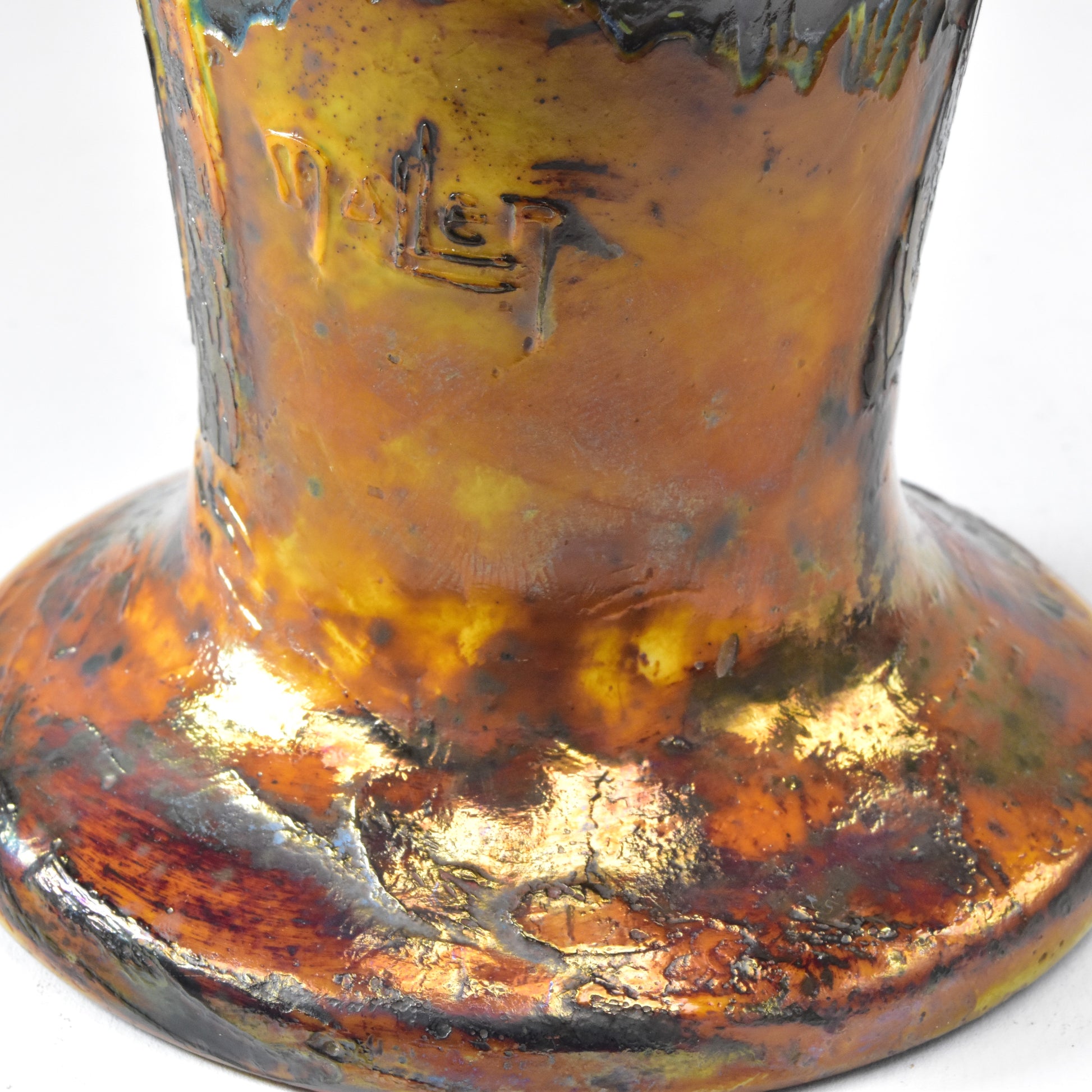Deze vaas van Muller Frères laat de bijzondere techniek en het hoge artistieke niveau van de gebroeders Désiré en Eugène Muller zien. Naast de fluogravure techniek zien we ook emaille en reductie-schildering technieken. De basis is helder glas met daarover een laag transparant pruisischblauw glas. Door de subtiele manier van etsen bereikten ze ook kleurverloop in de blauwe glaslaag. Daarover bevindt zich een opaak witte glaslaag die vervolgens geemailleerd en reductie geschilderd is waardoor de koper en zilver oxiden een parelmoer achtige reflectie geven. In de verte zien we bergen. Op de achtergrond een meer en op de voorgrond berkenbomen in de herfst. het ritme van de bomen en de prachtige kleuren passen perfect bij de vorm van de vaas.
