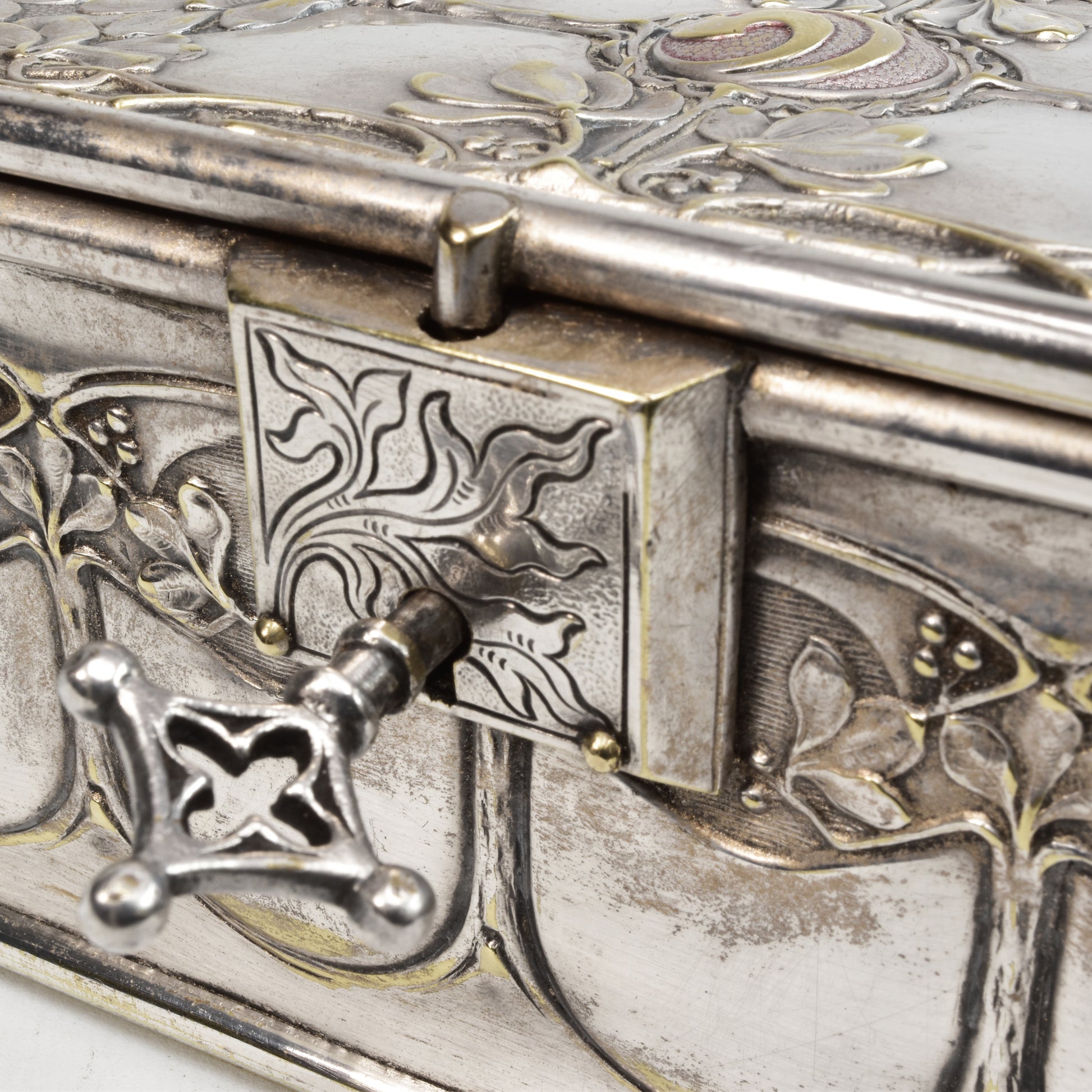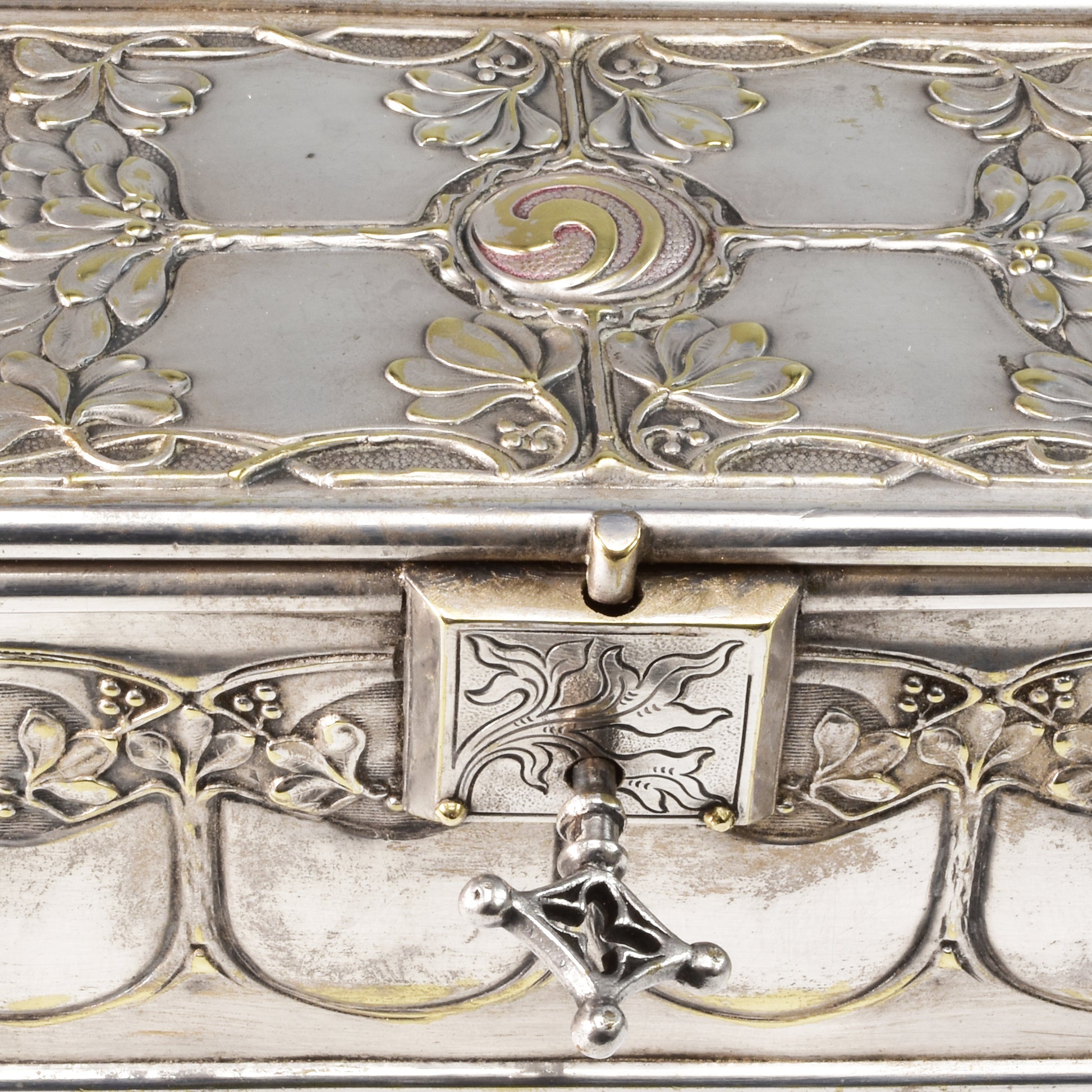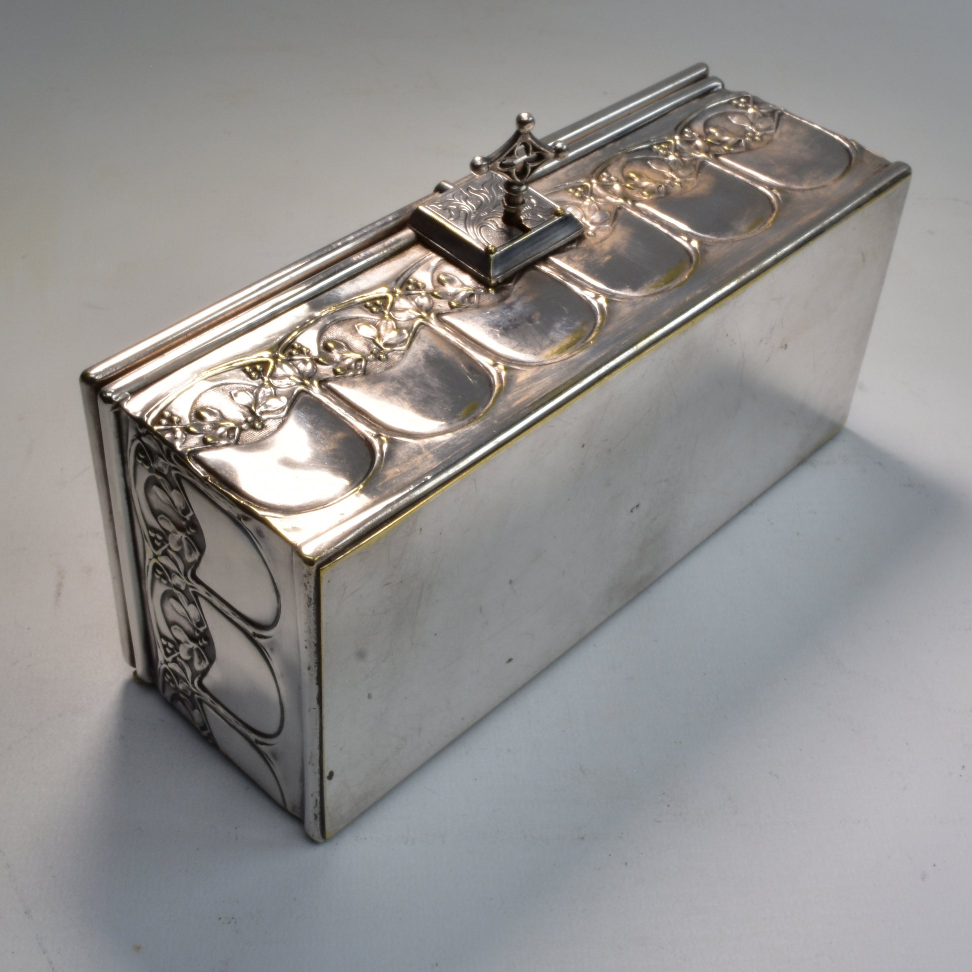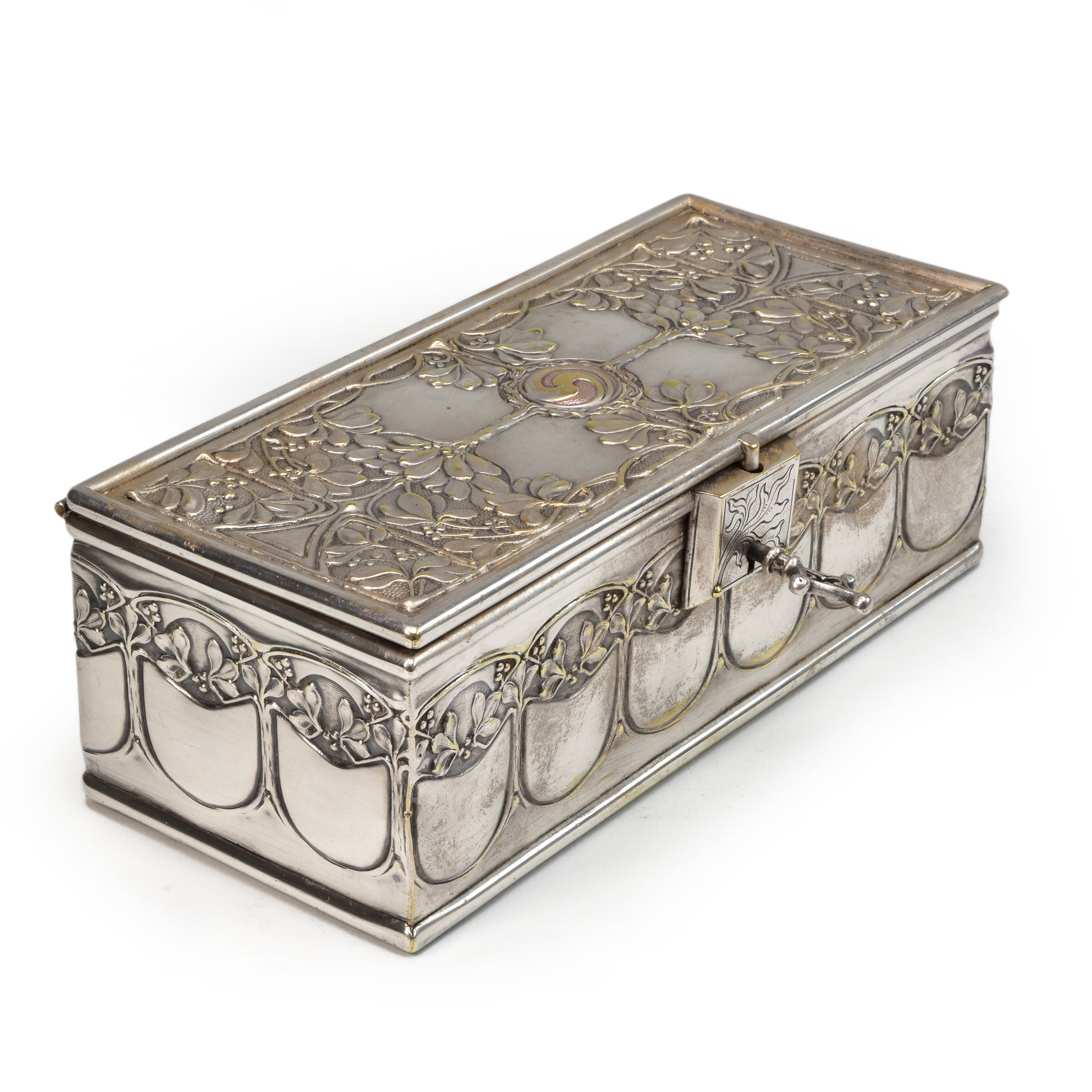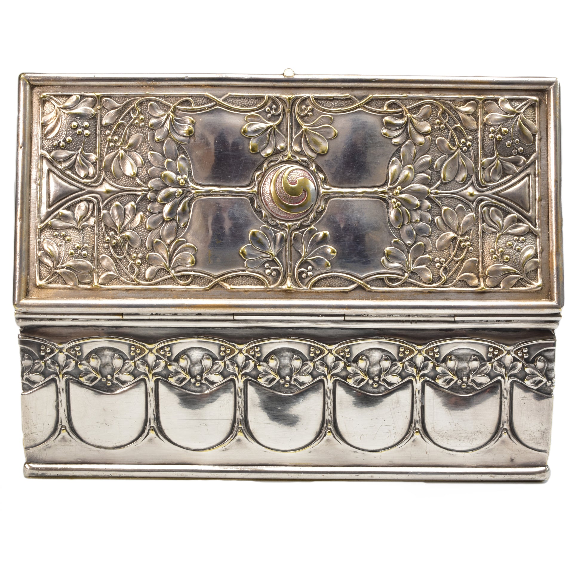 Verzilverd messing met houten binnenkant. Gemerkt R.S. Met originele sleutel. Verfijnde art nouveau vormgeving met olijftakken en vruchten. De olijftak staat voor vrede, verzoening en hoop. Het aanbieden van een olijftak is een verzoenend gebaar. De symboliek is al erg oud, de olijfboom groeit langzaam en heeft rust en tijd nodig om te bloeien. Waar veel olijfbomen groeien is dus kennelijk lange tijd vrede.