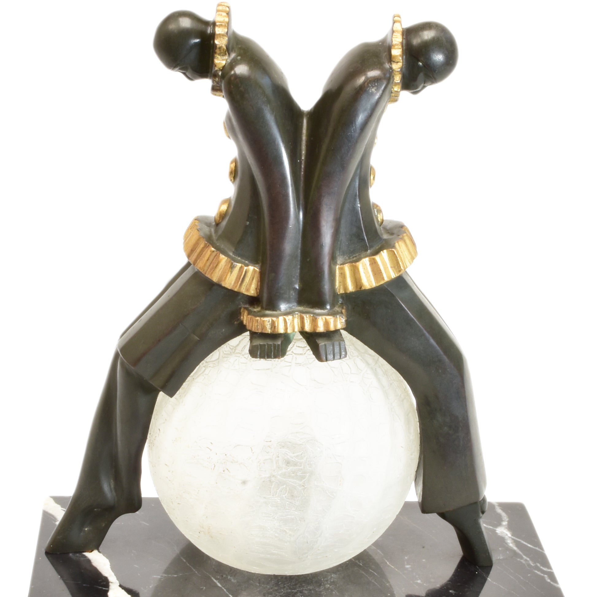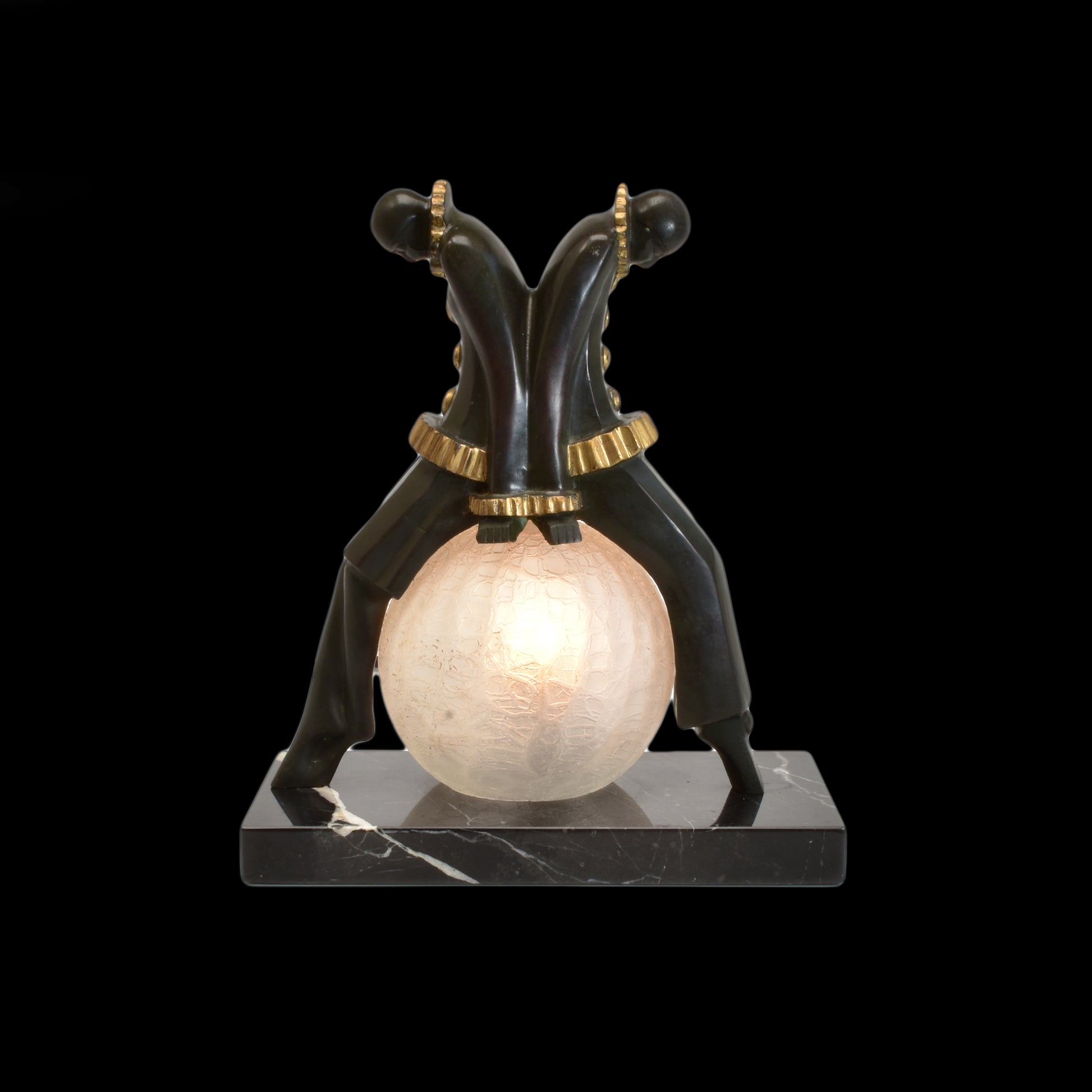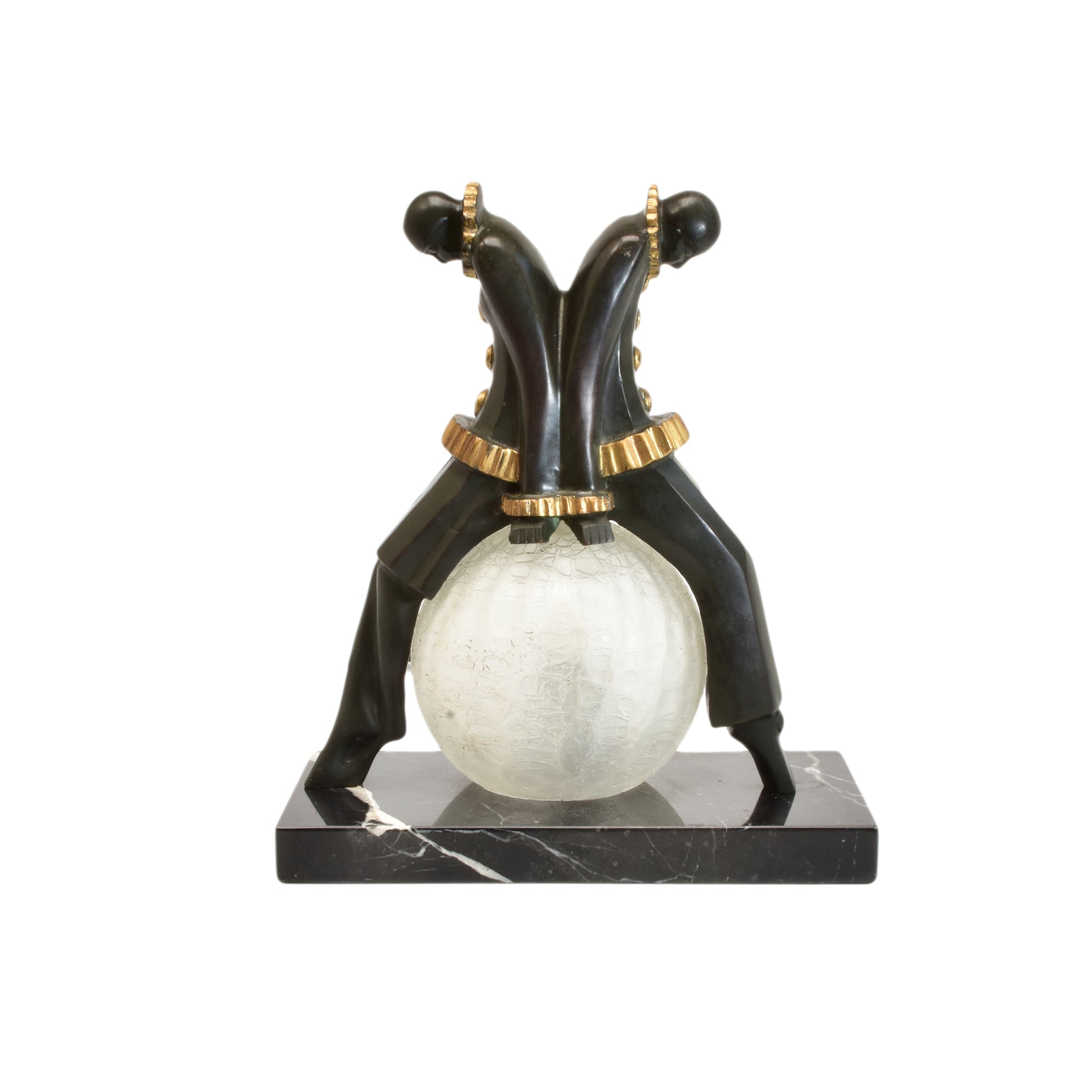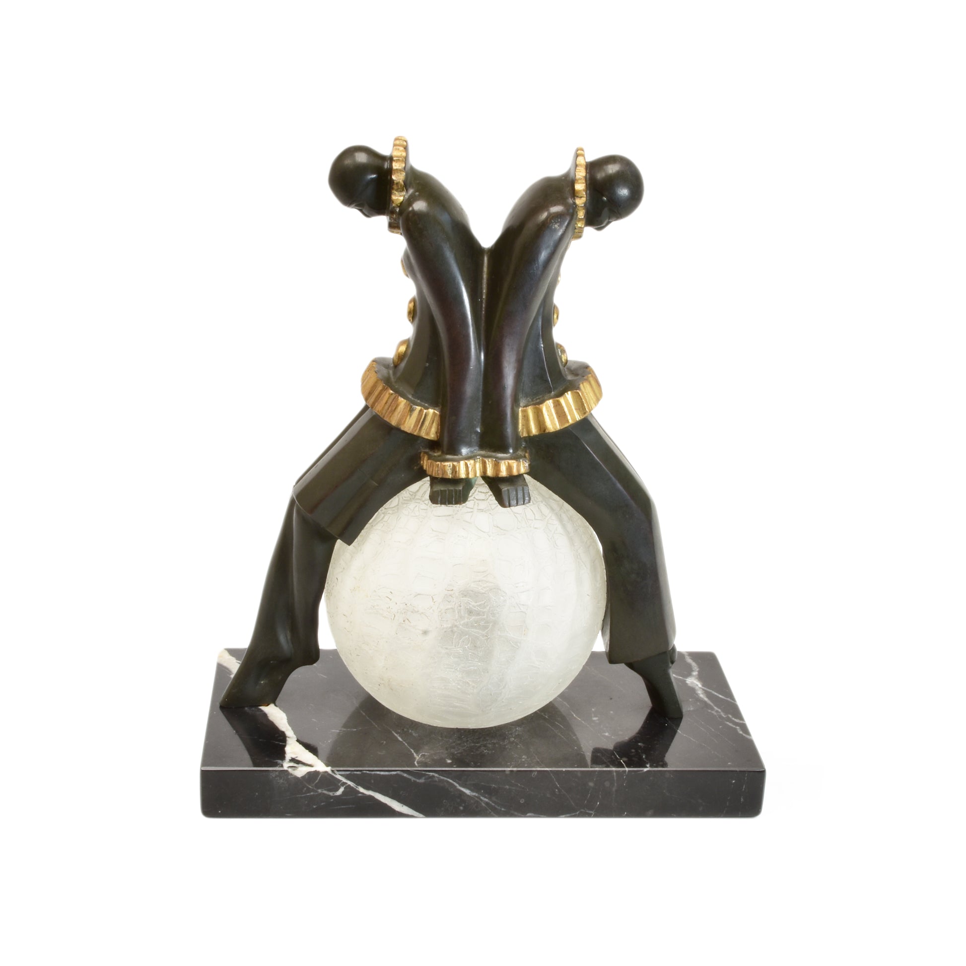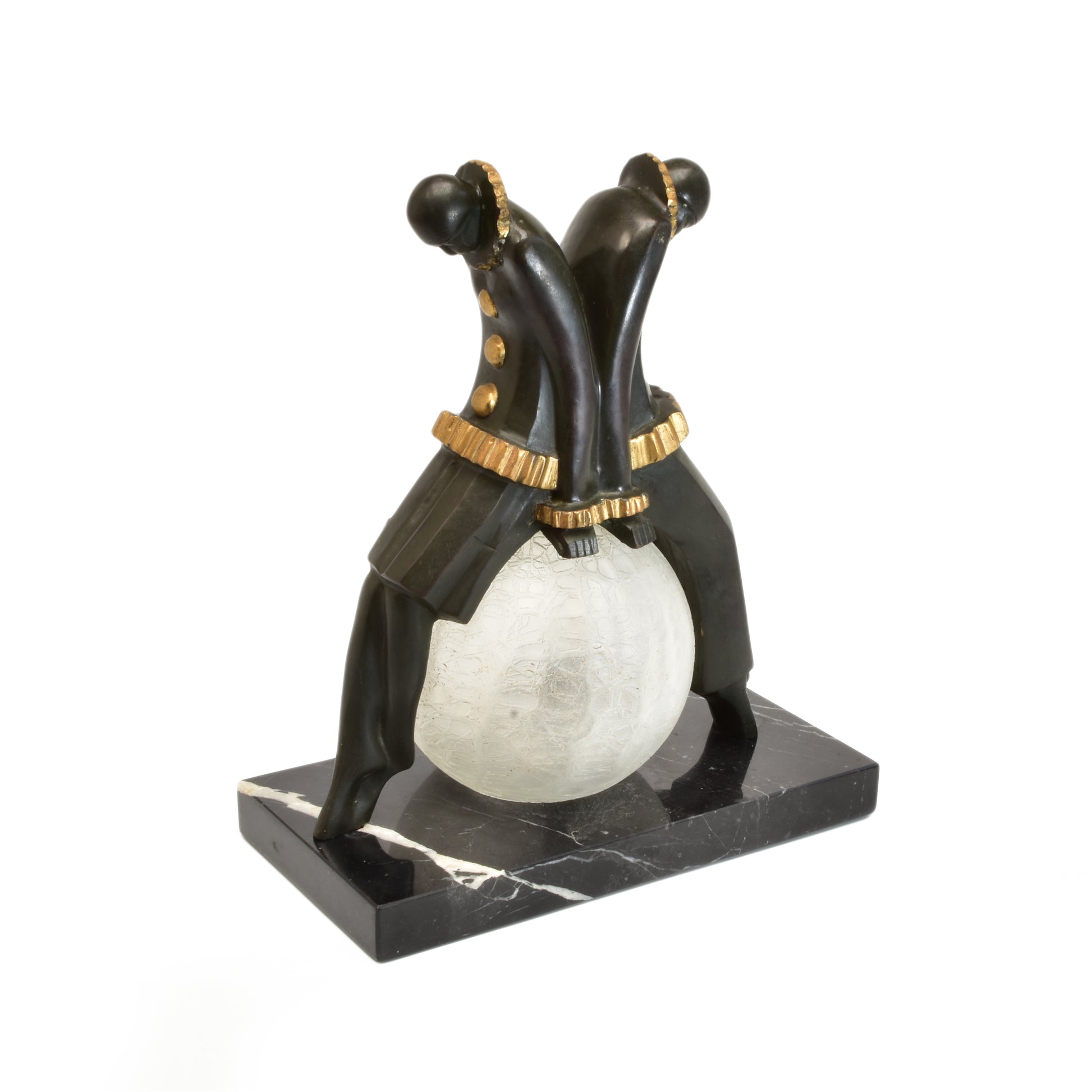 Art deco lamp van EXE. Dit exemplaar is niet gesigneerd, soms zijn ze dat wel. Door de ruggelingse plaatsing van twee bijna identieke figuren op een bol ontstaat een abstracte vorm, typisch voor de Art Deco. Bij nader toezien blijkt de ene figuur een tikje groter te zijn met een lange broek, en de ander ietsje kleiner met een rokje; het zijn de figuren uit de commedia dell'Arte; Arlechino en Colombina.