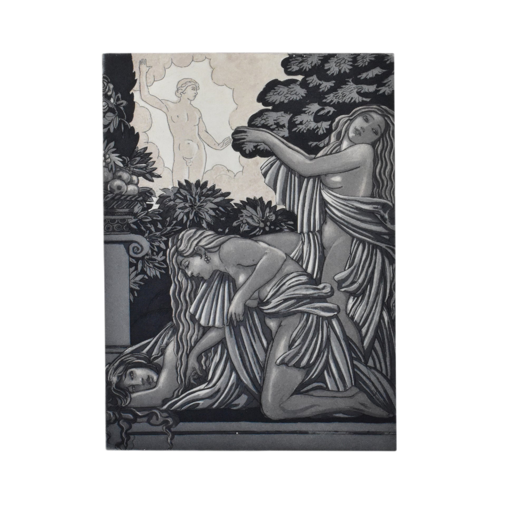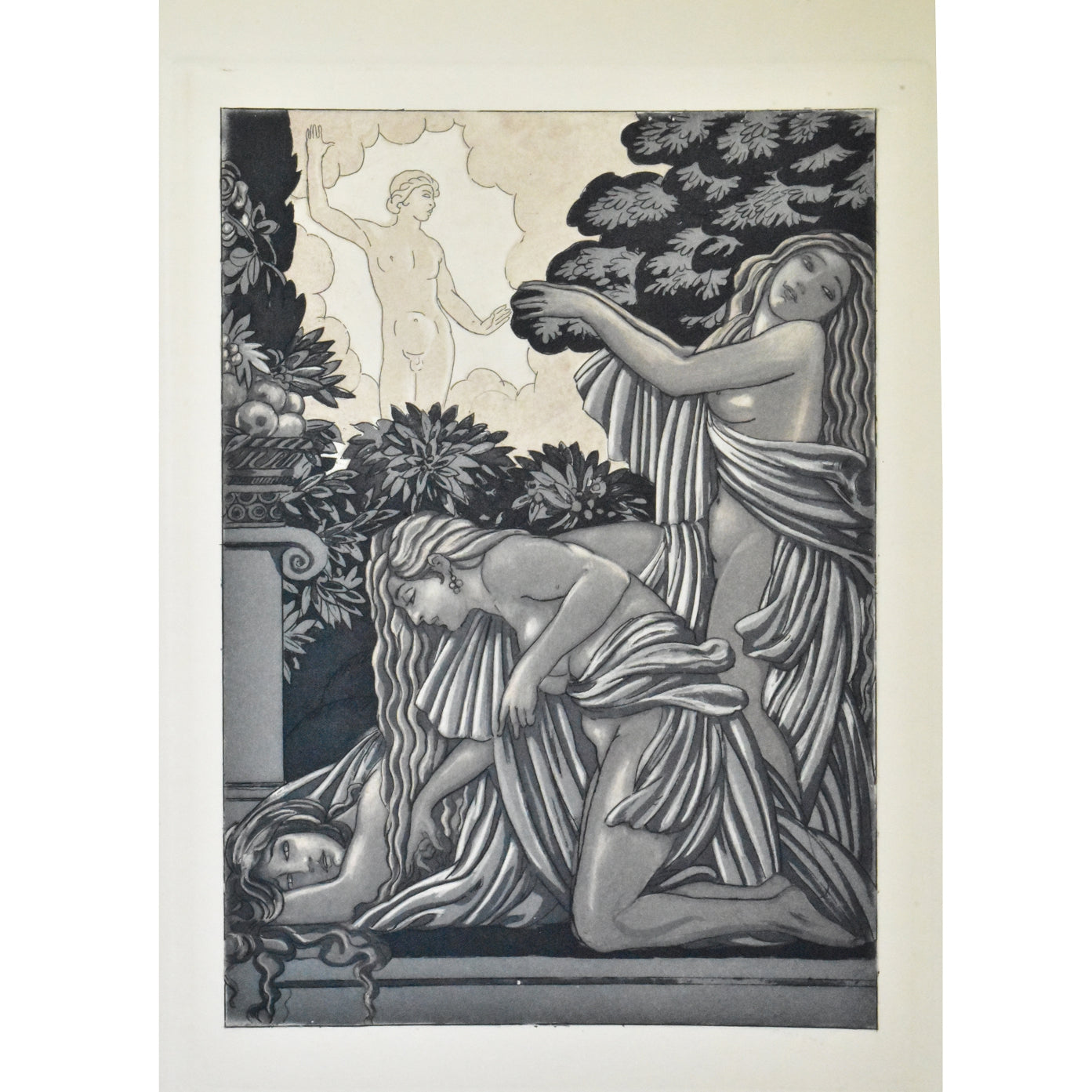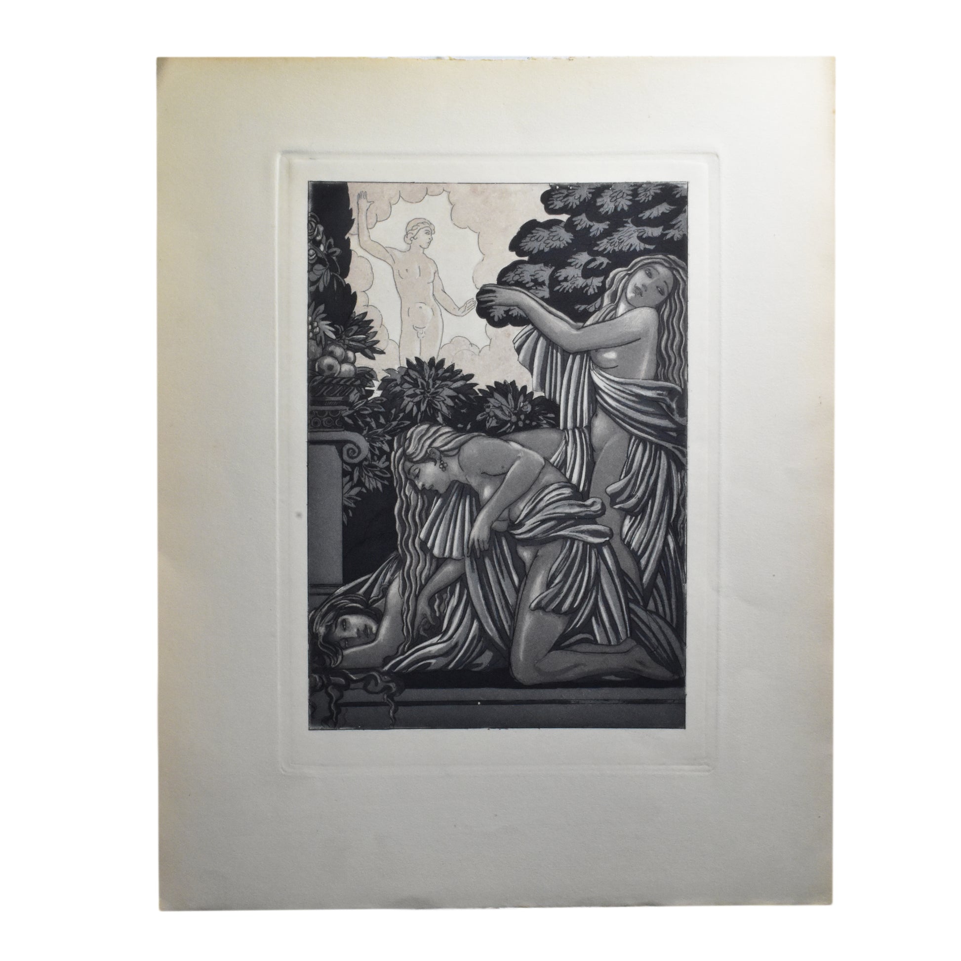 Ets in kleur uit 1928 ondertekend met potlood door Maurice de Becque voor "Sonnica de Courtisane" van Vincente Blasco-Ibanez. De Becque is in de illustratieve kunsten een van de belangrijkste vertegenwoordigers van de Art deco stijl. Afmetingen: 17,9 x 12,4 cm (afbeelding), 28 x 22,4 cm (blad). Ingelijst in een goudkleurige houten lijst,( niet op de foto)