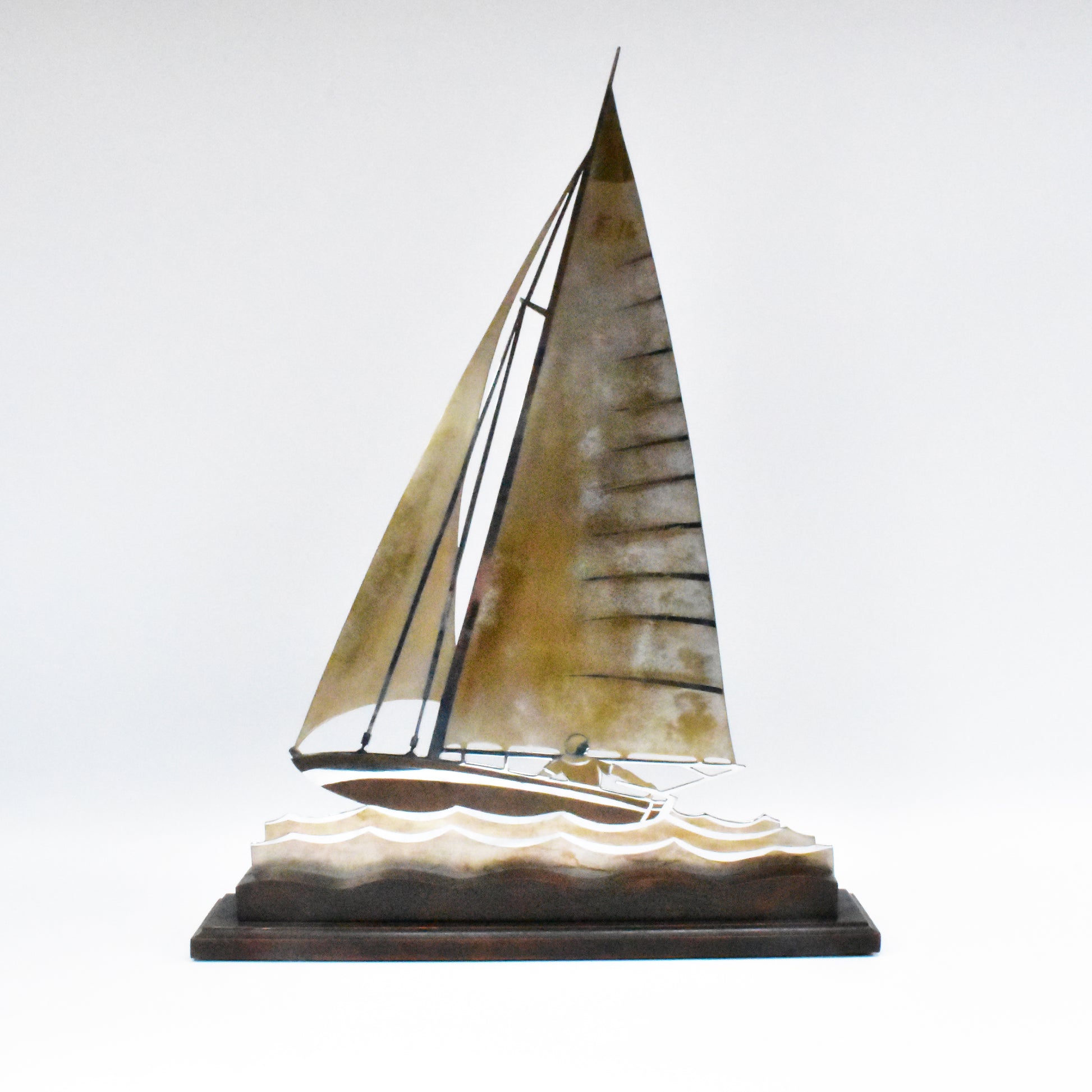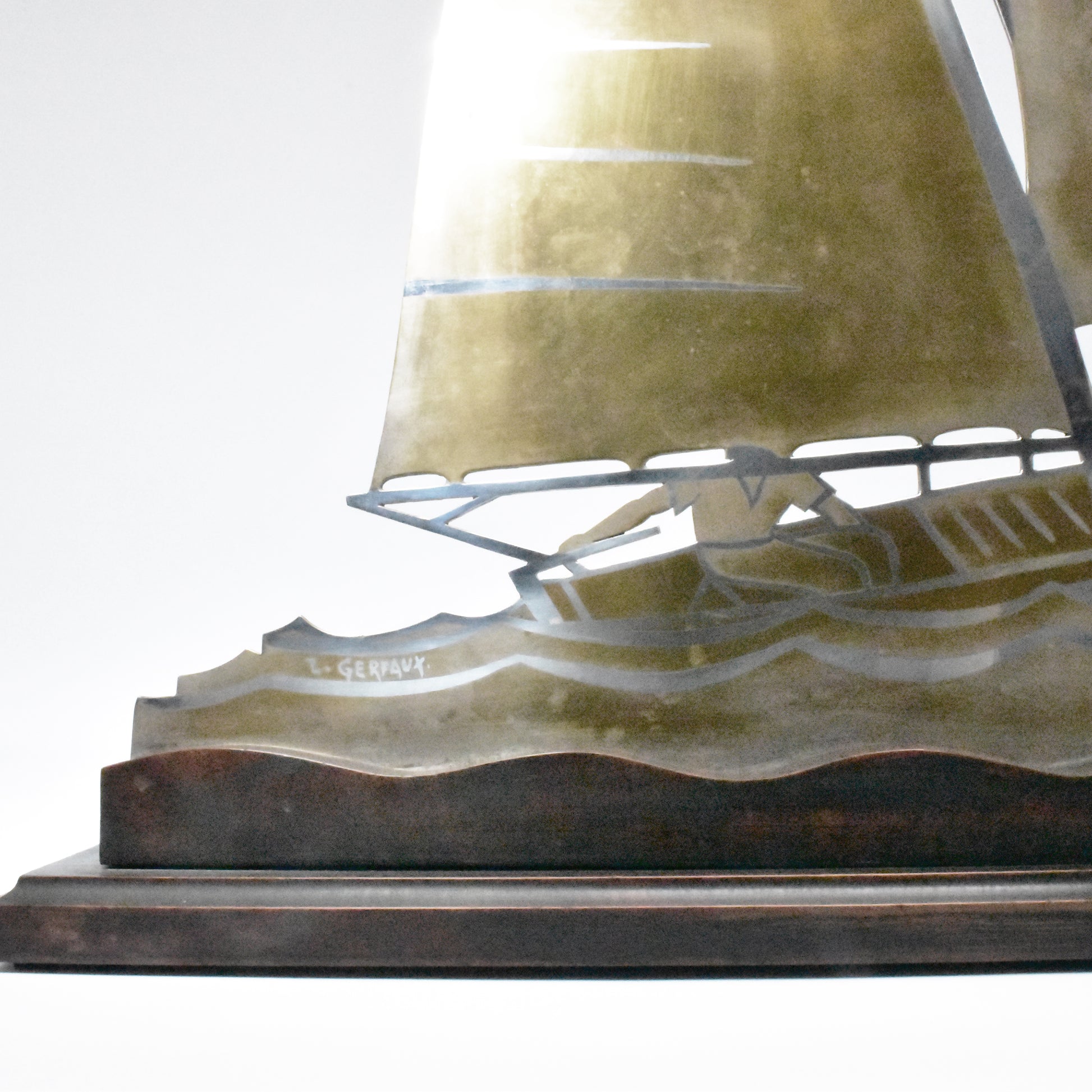 Deze art deco zeilboot is gemaakt in Dinanderie techniek. Een ambachtelijke techniek die vernoemd is naar de koperen ketelmakers van Dinant. Er zijn verschillende metaalsoorten ingelegd en samen glad gepolijst. De snelheid van deze boot en de strakke lijnen van de zeilen en de golven geven dit beeld echt vaart.